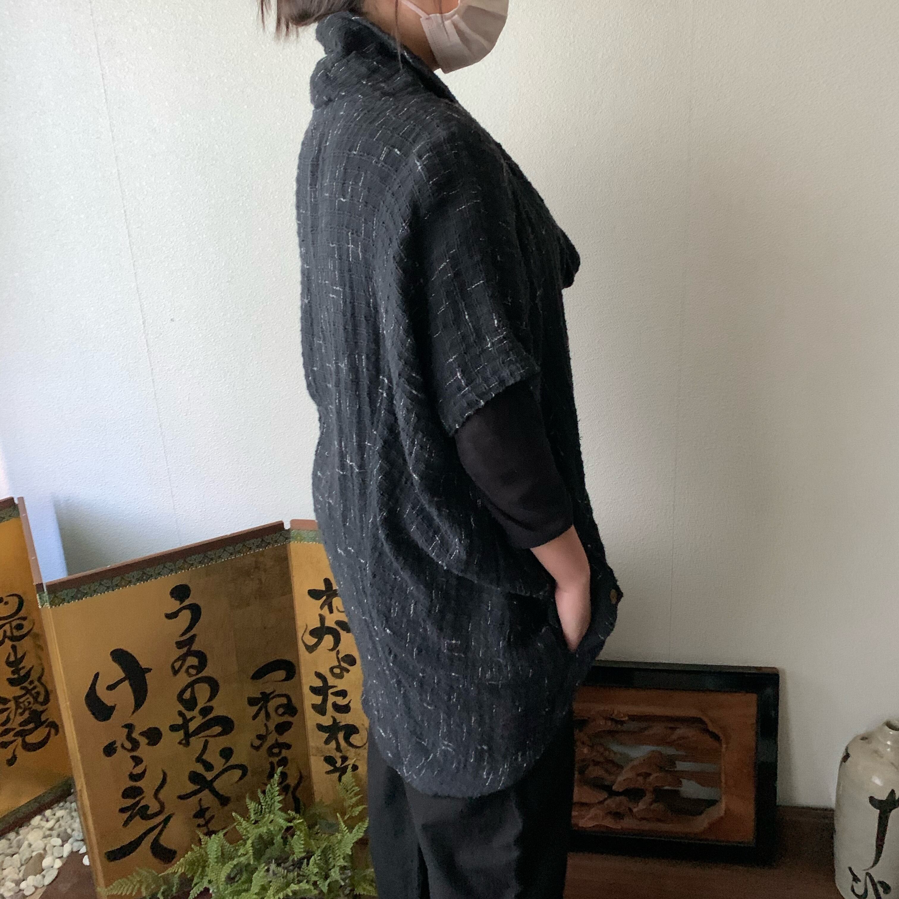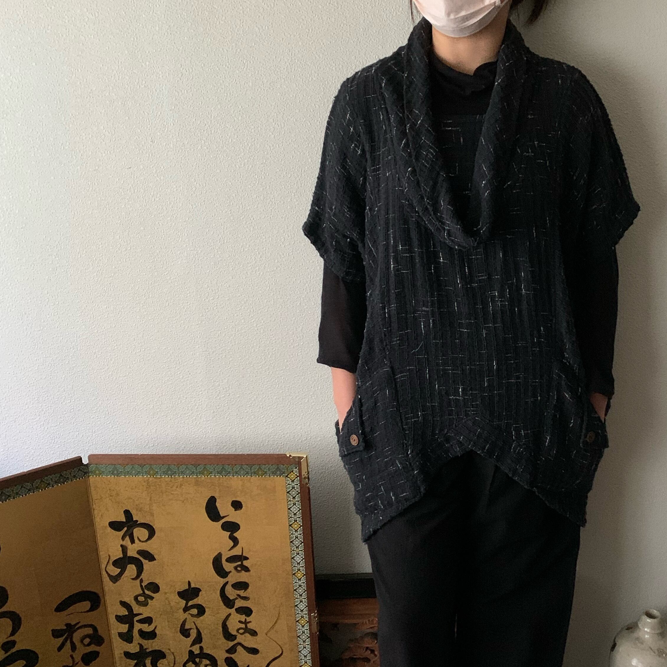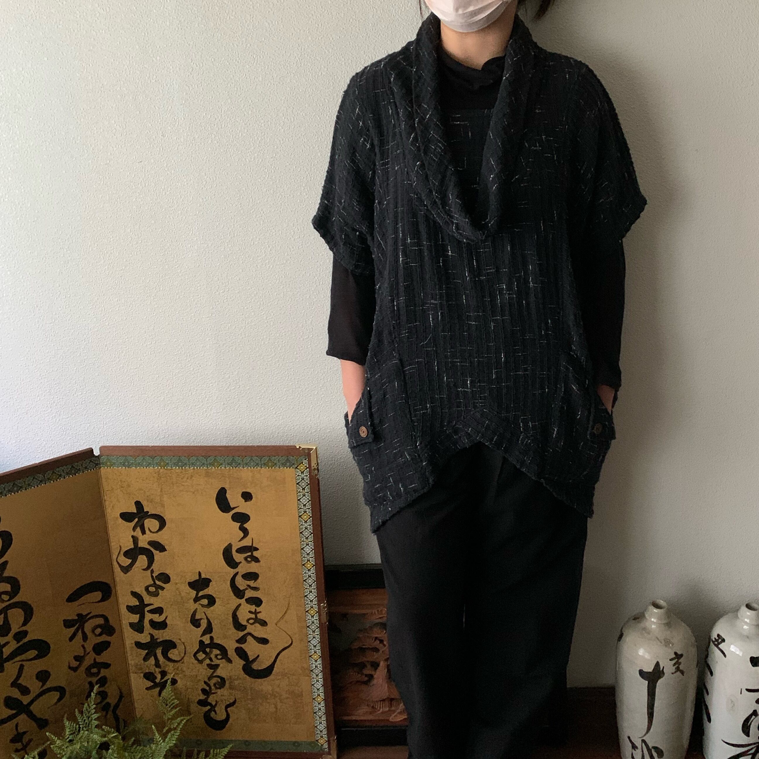 贅沢に織り向きを切替えたコクーンシルエットの手織綿チュニックブラウス 細身な方からふくよかな方まで 黒絣