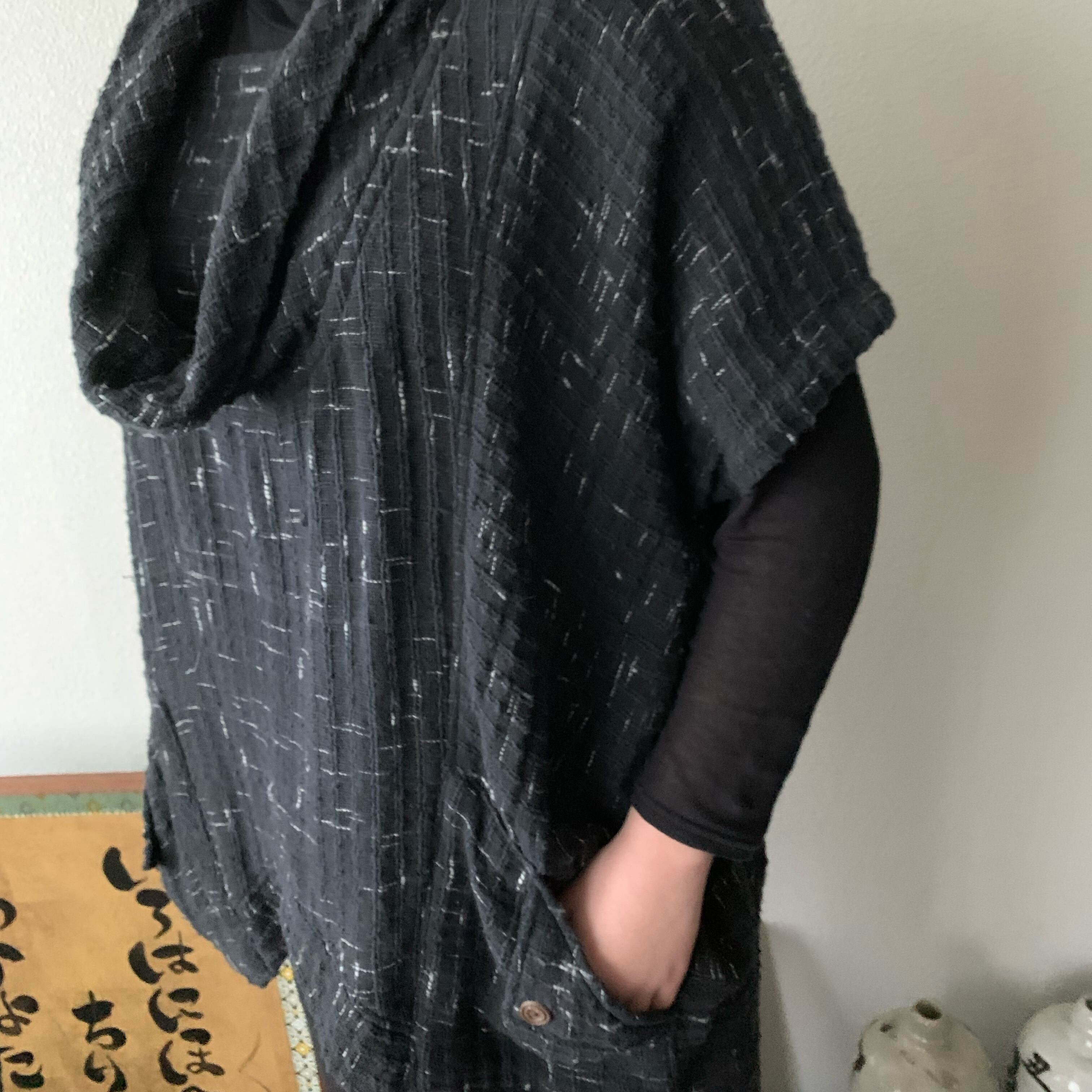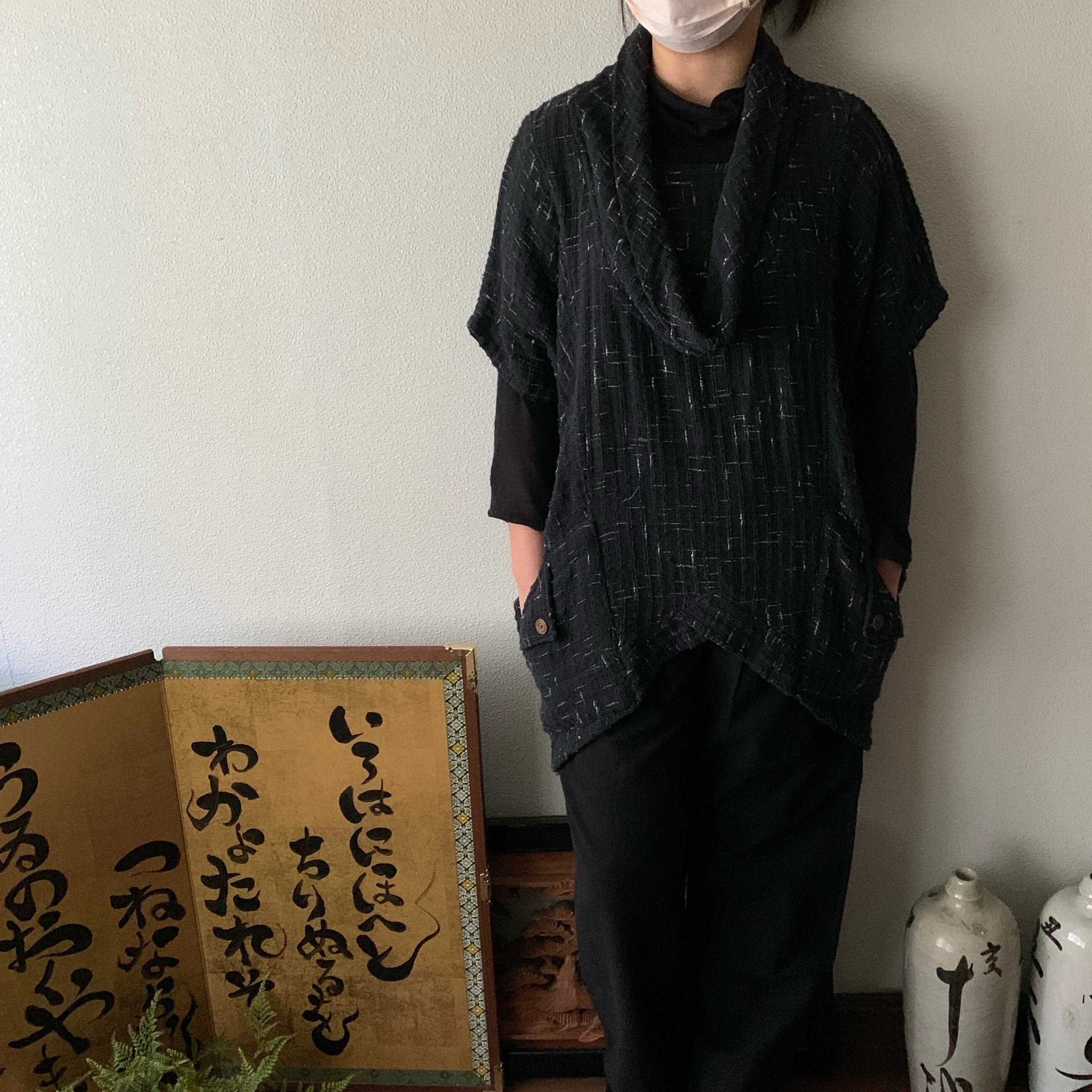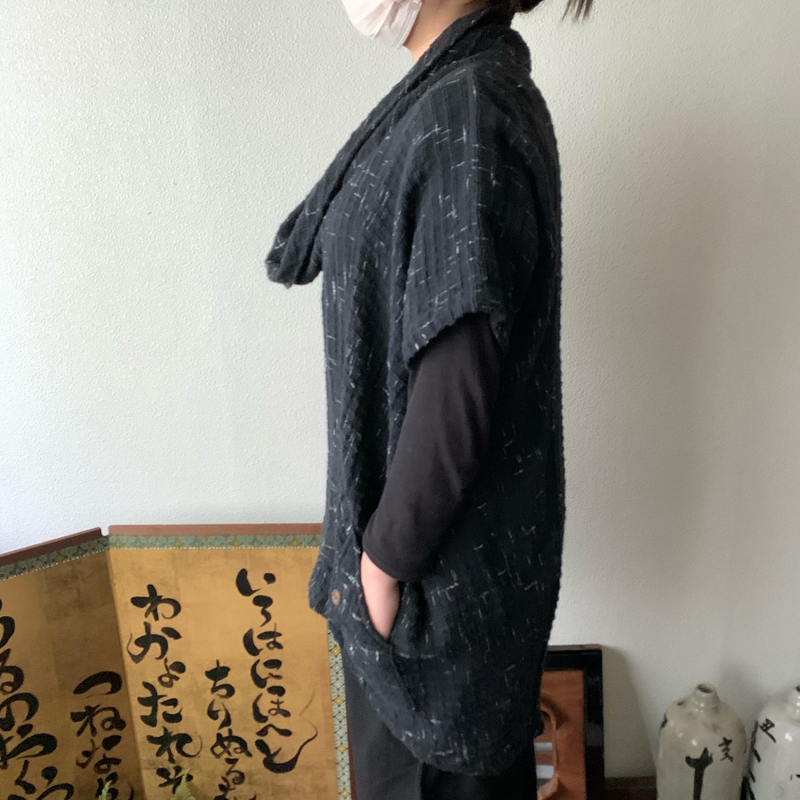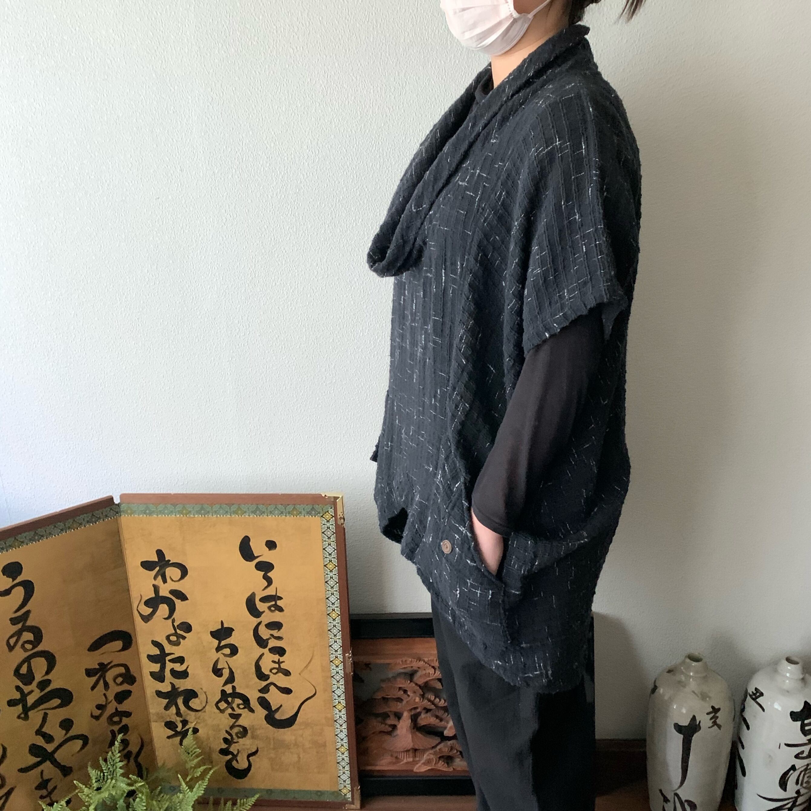 贅沢に織り向きを切替えたコクーンシルエットの手織綿チュニックブラウス 細身な方からふくよかな方まで 黒絣
