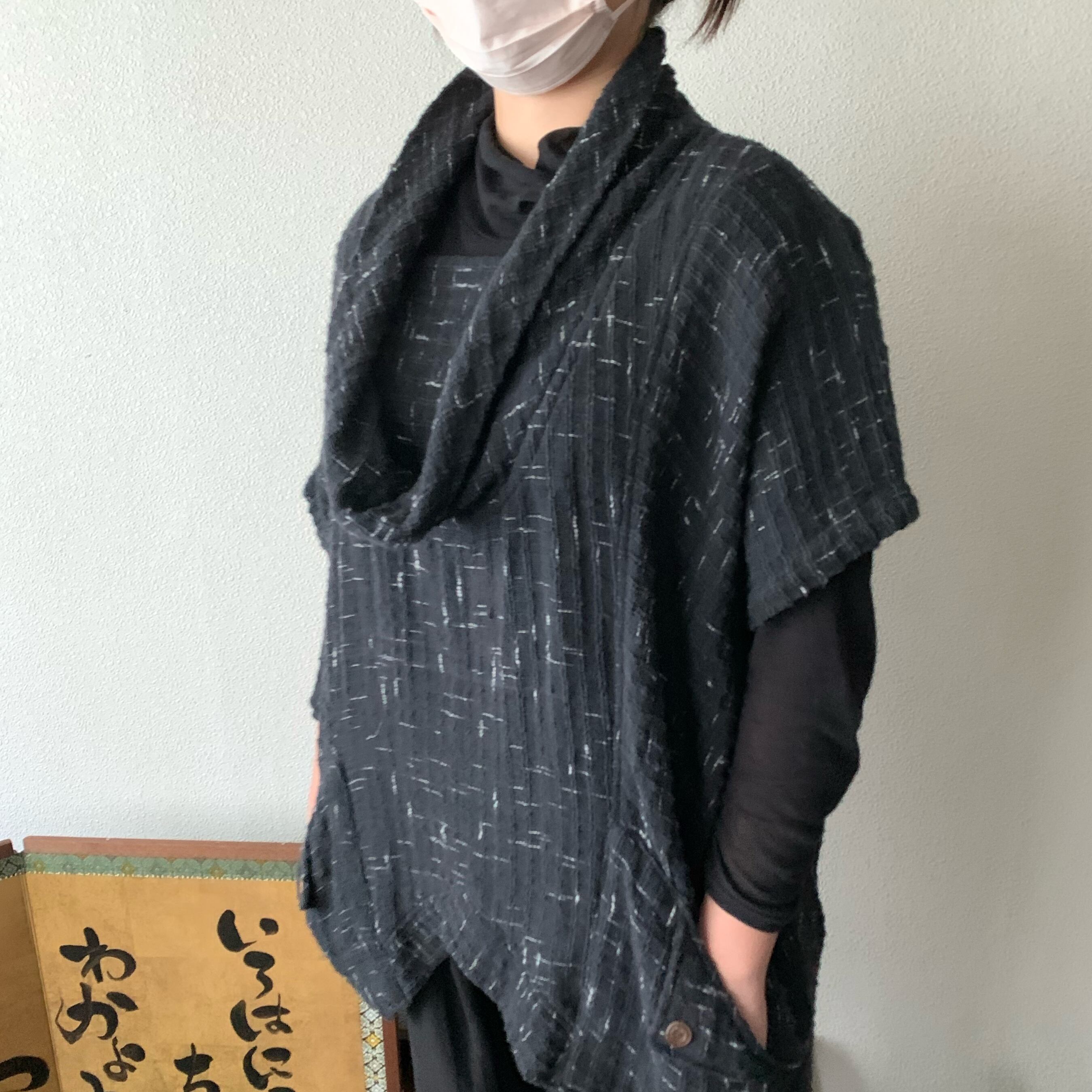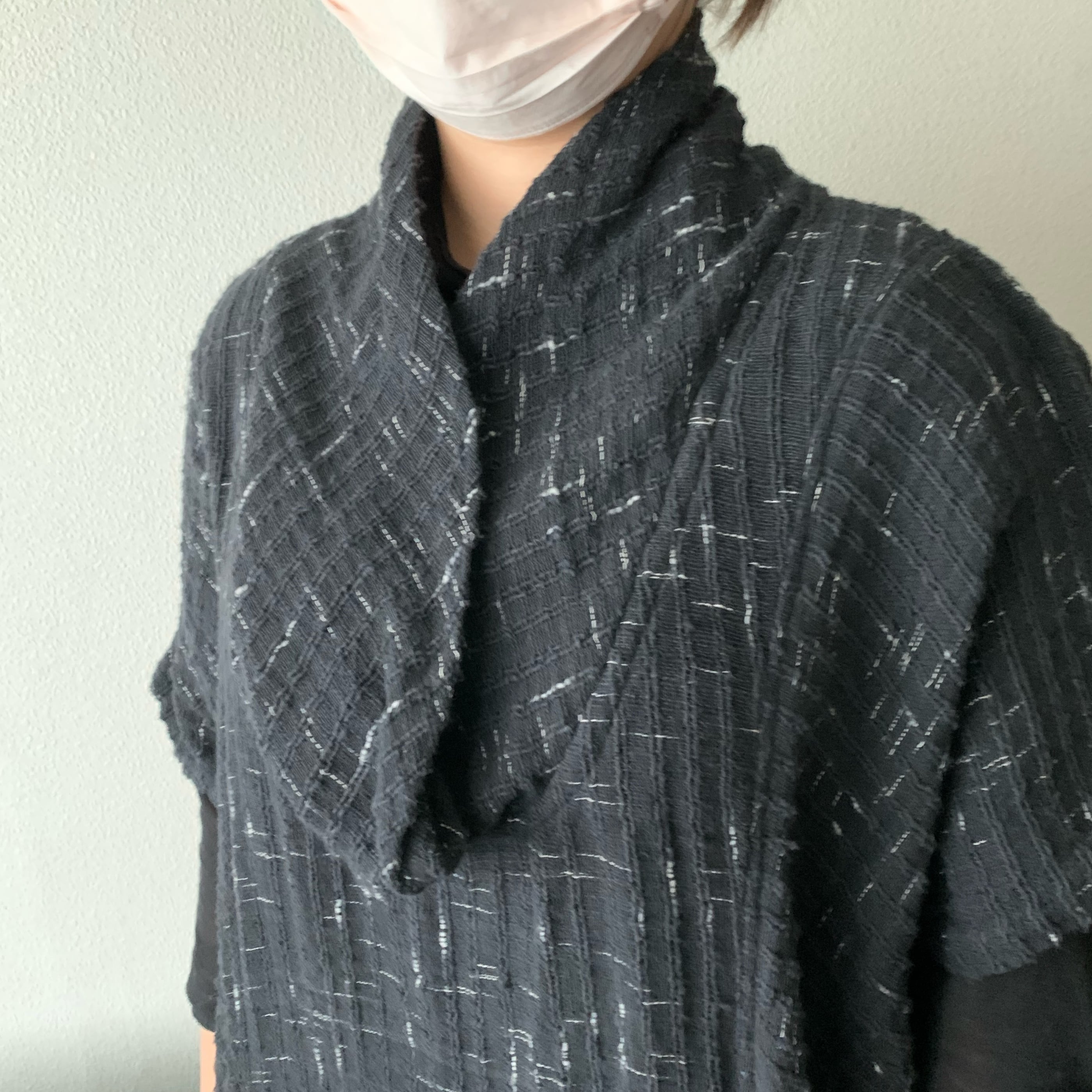 前ネック部分の内側にさらに布をつけることで一枚でザクっと着ていただけることが可能になりますし、大きめのネックにしているので折りたたんで襟のようにしたり、ブローチをつけたりしても楽しめます。