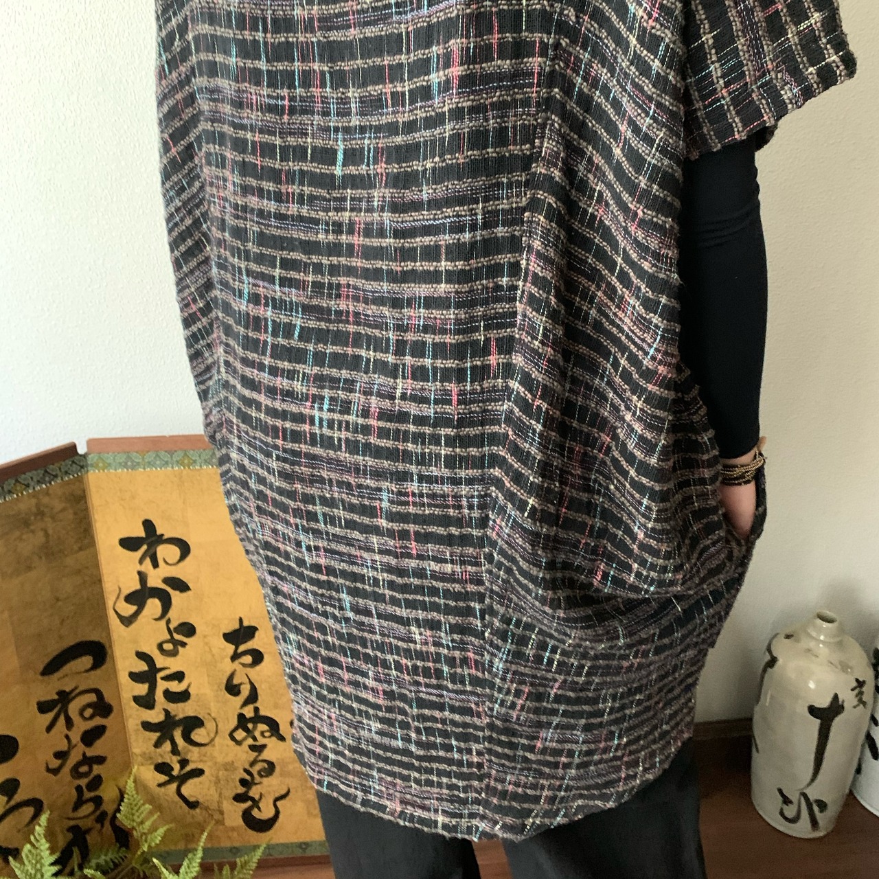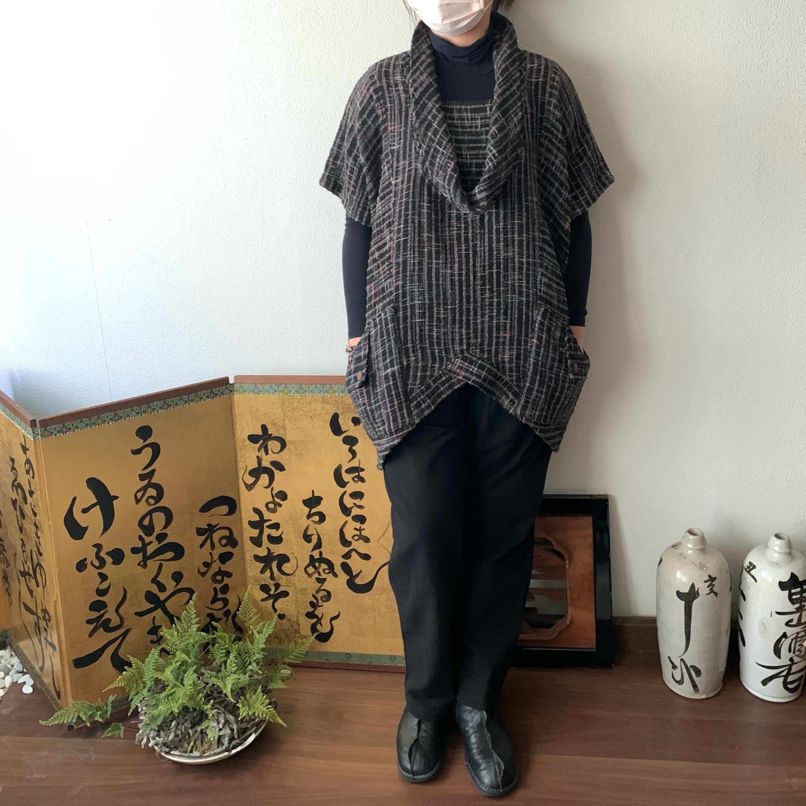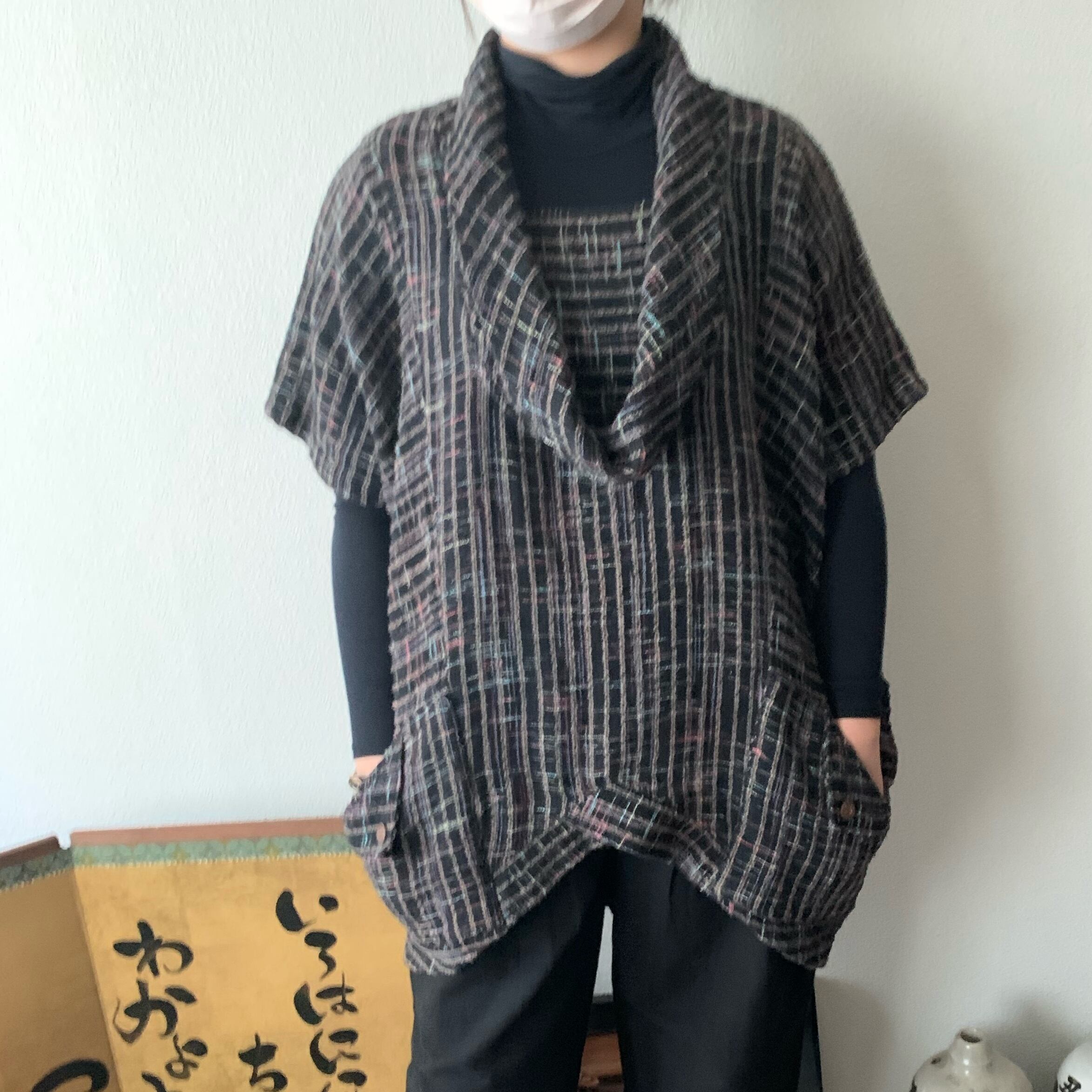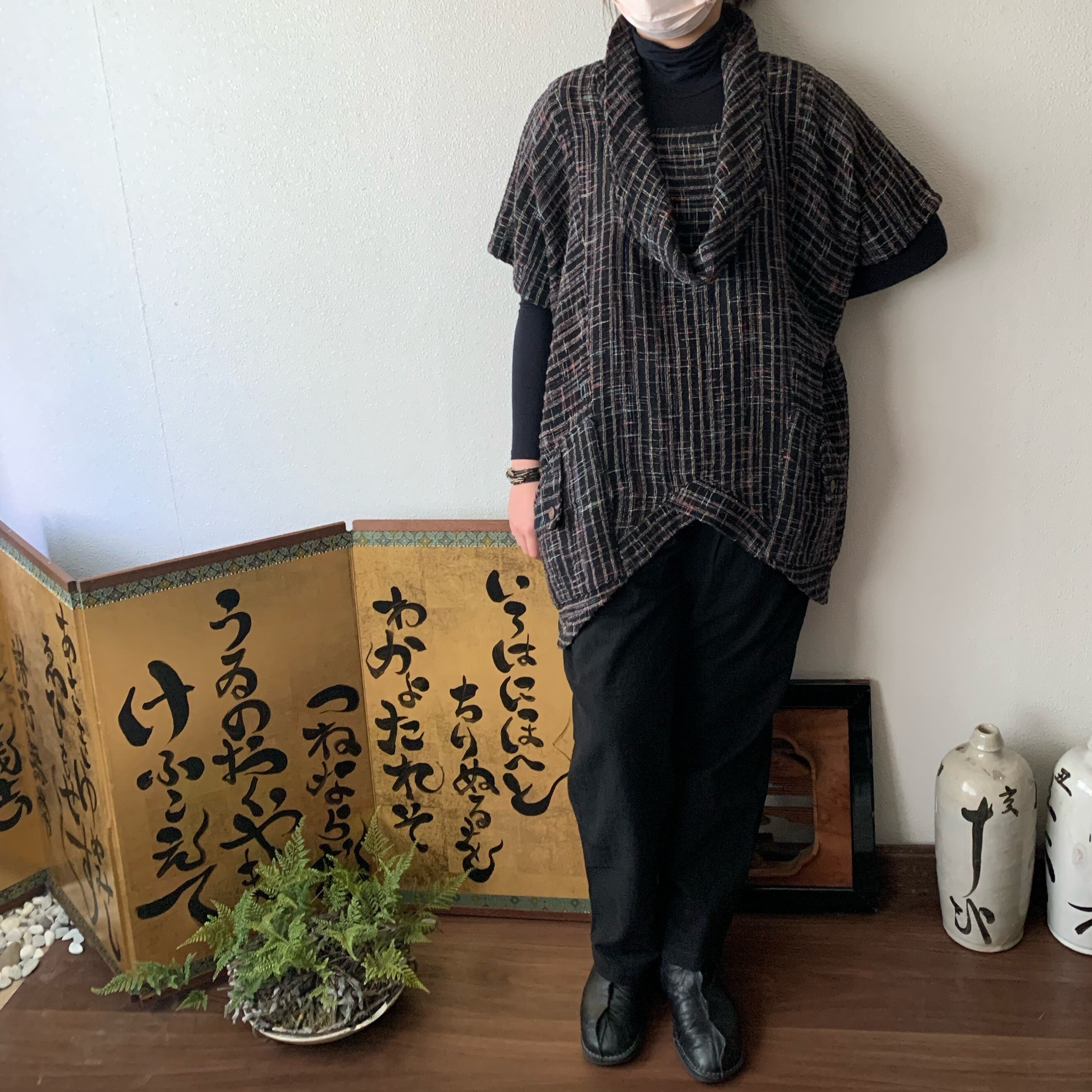 贅沢に織り向きを切替えたコクーンシルエットの手織綿チュニックブラウス 細身な方からふくよかな方まで 黒地紫絣