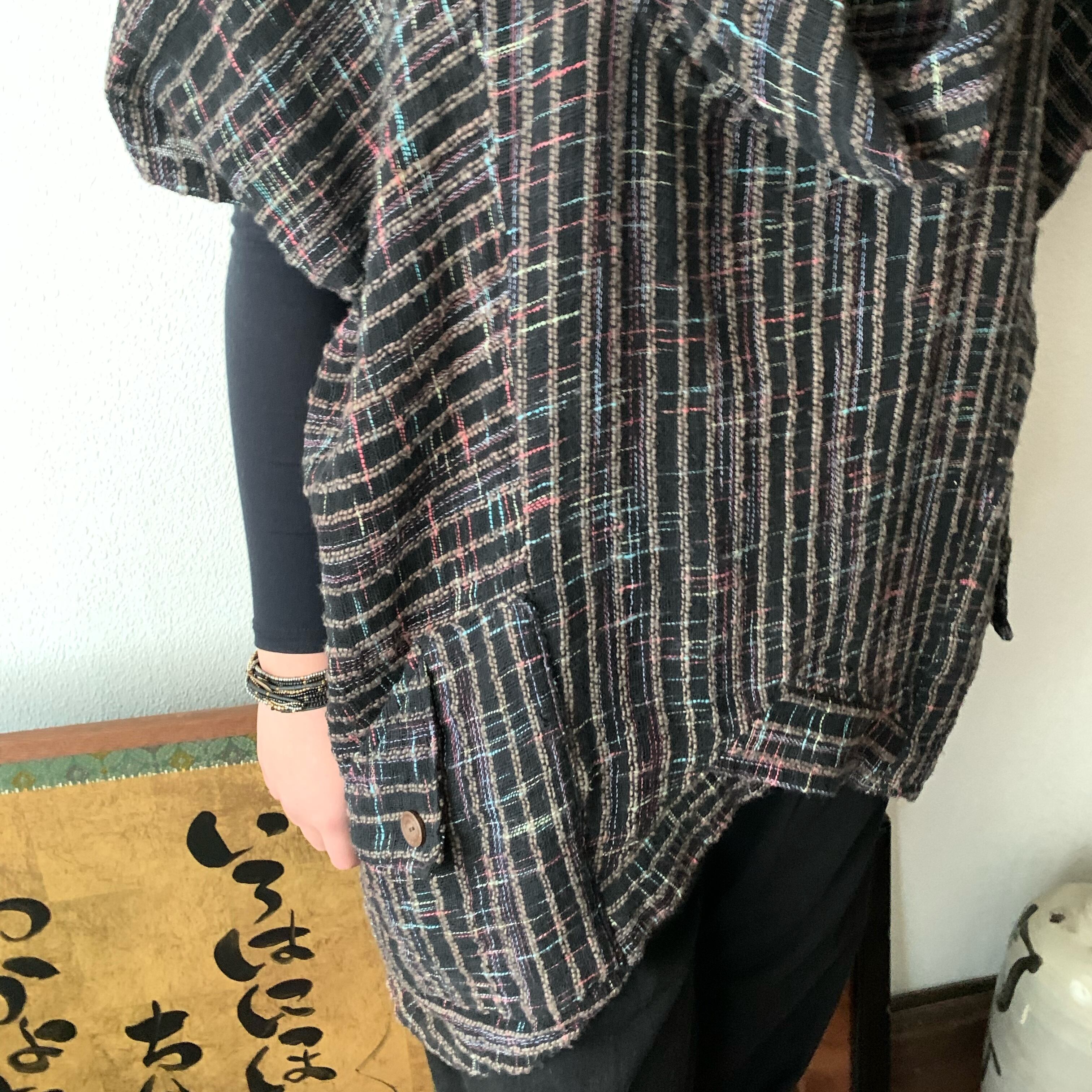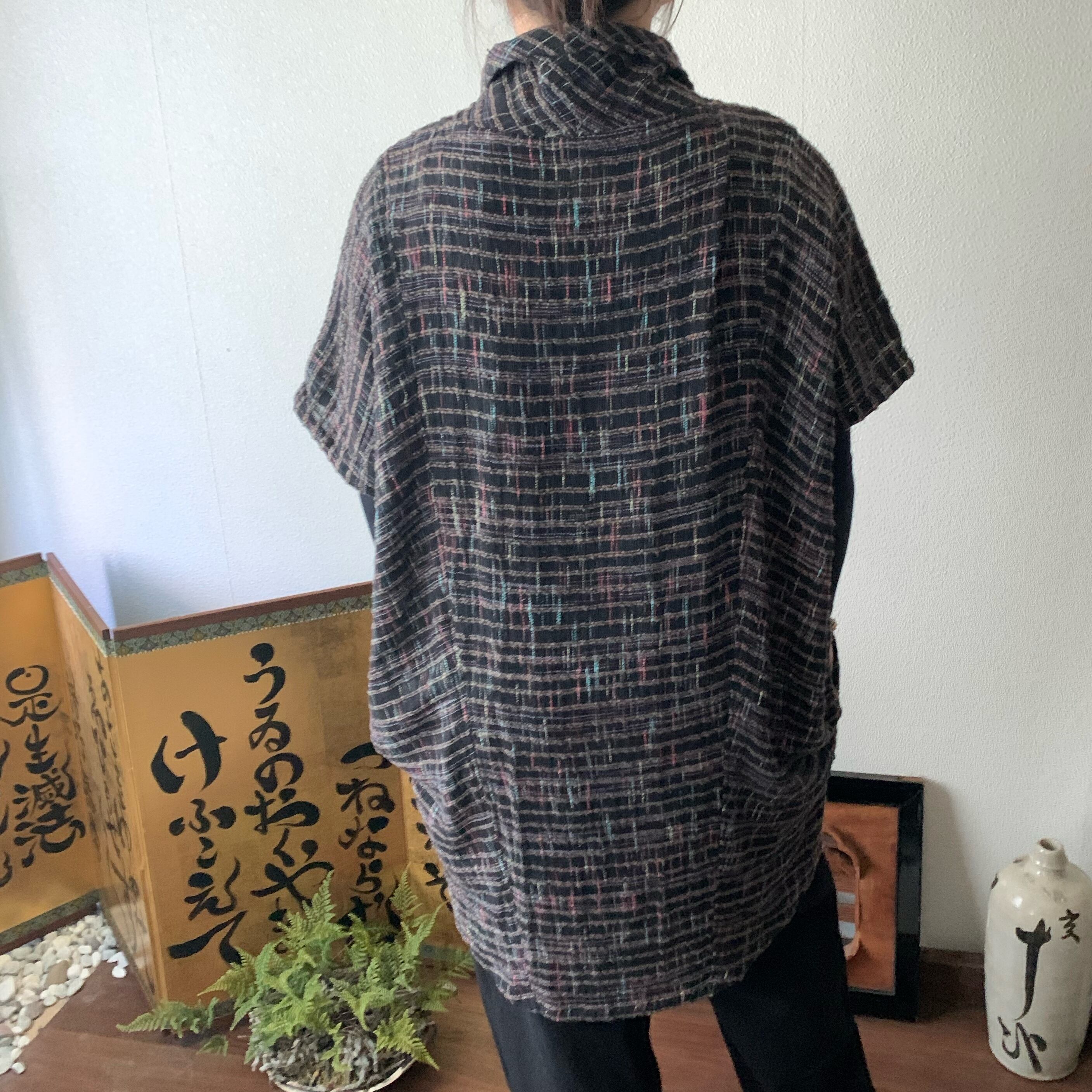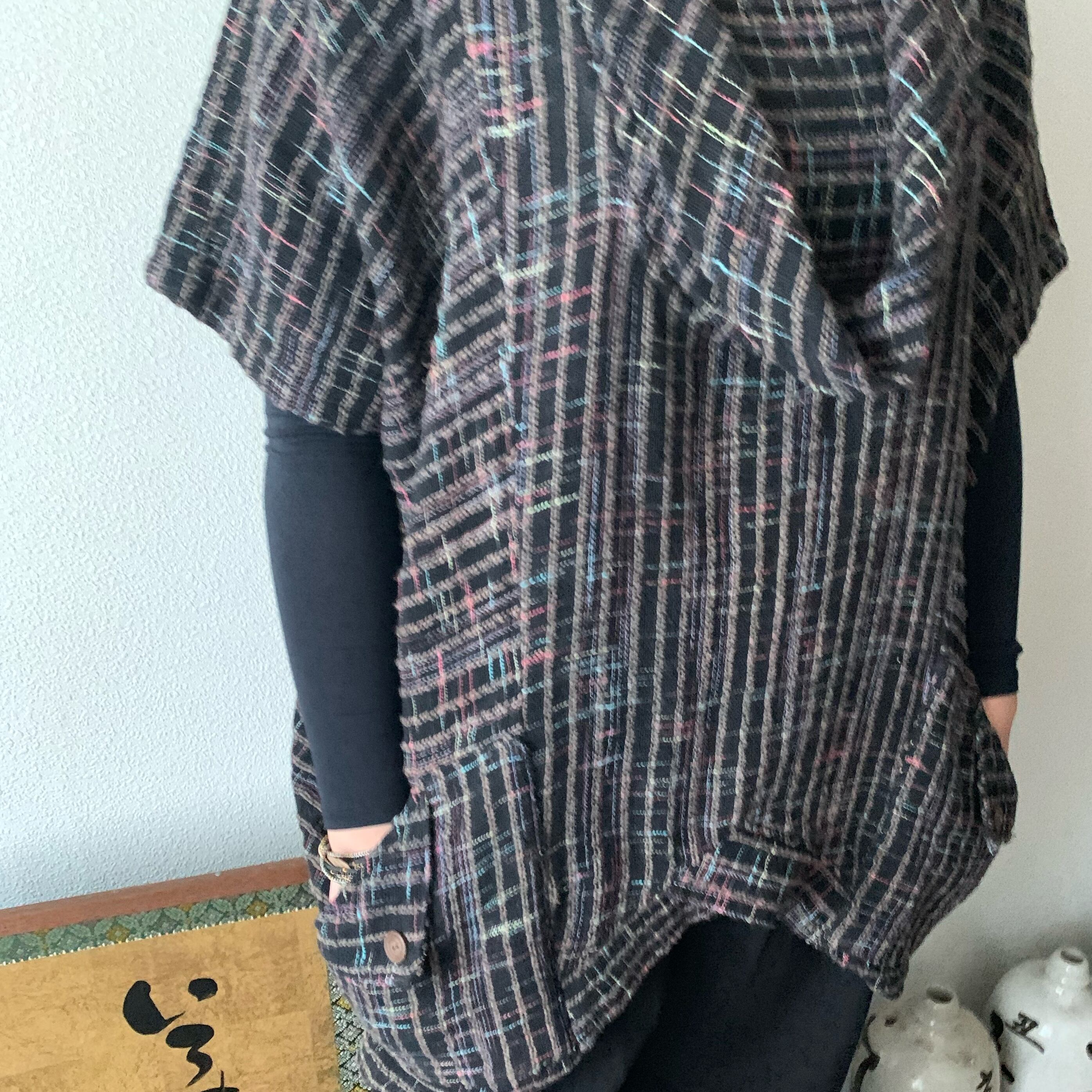 贅沢に織り向きを切替えたコクーンシルエットの手織綿チュニックブラウス 細身な方からふくよかな方まで 黒地紫絣