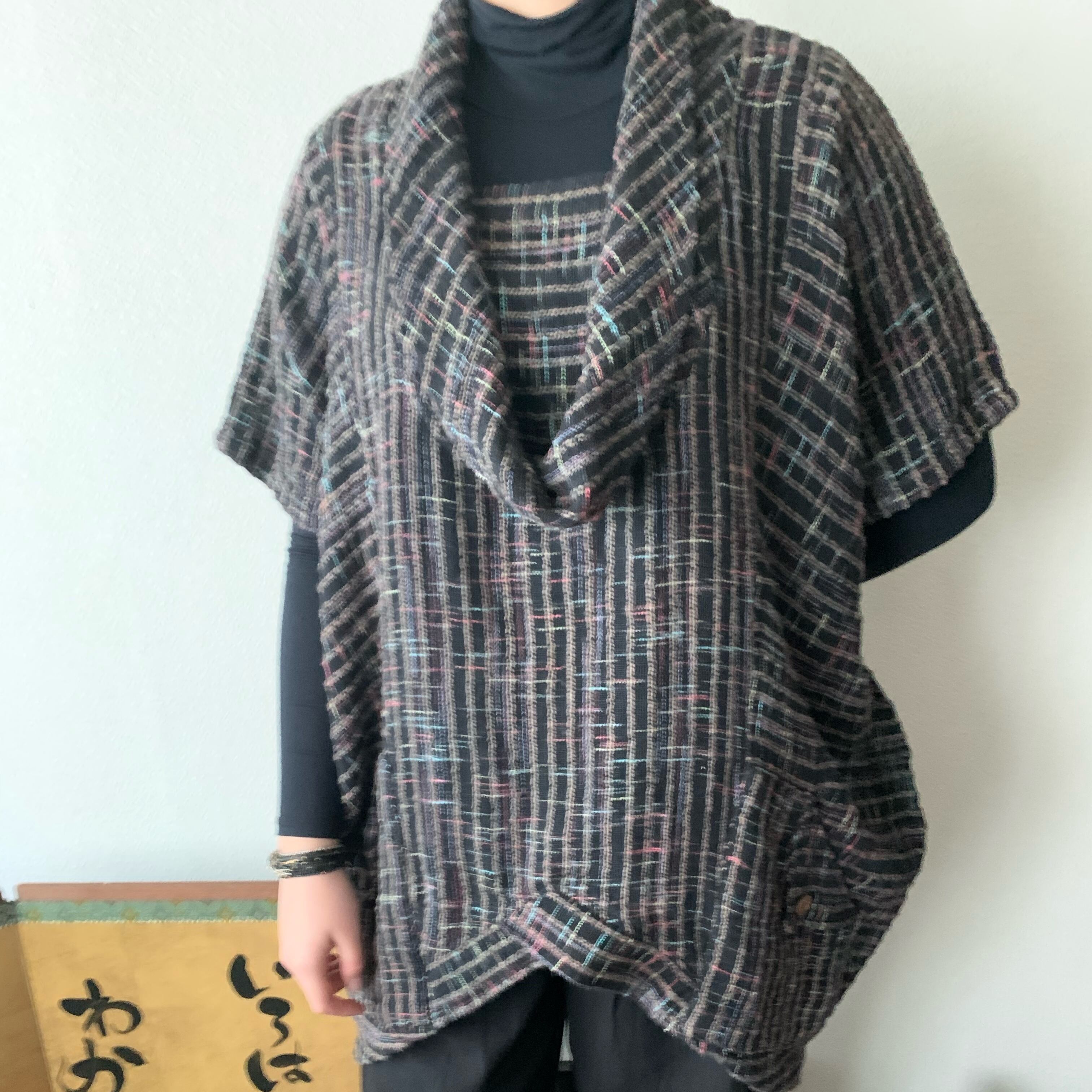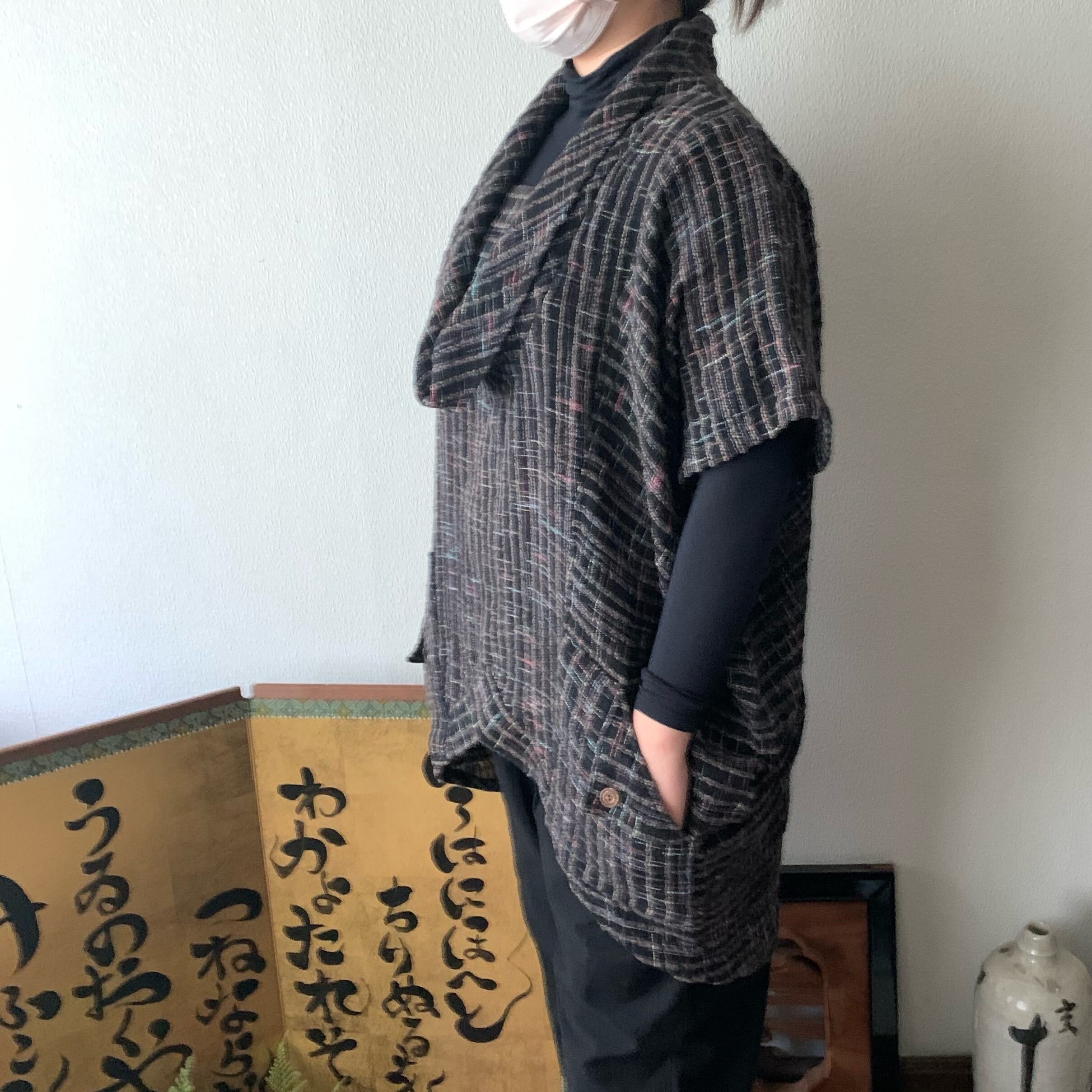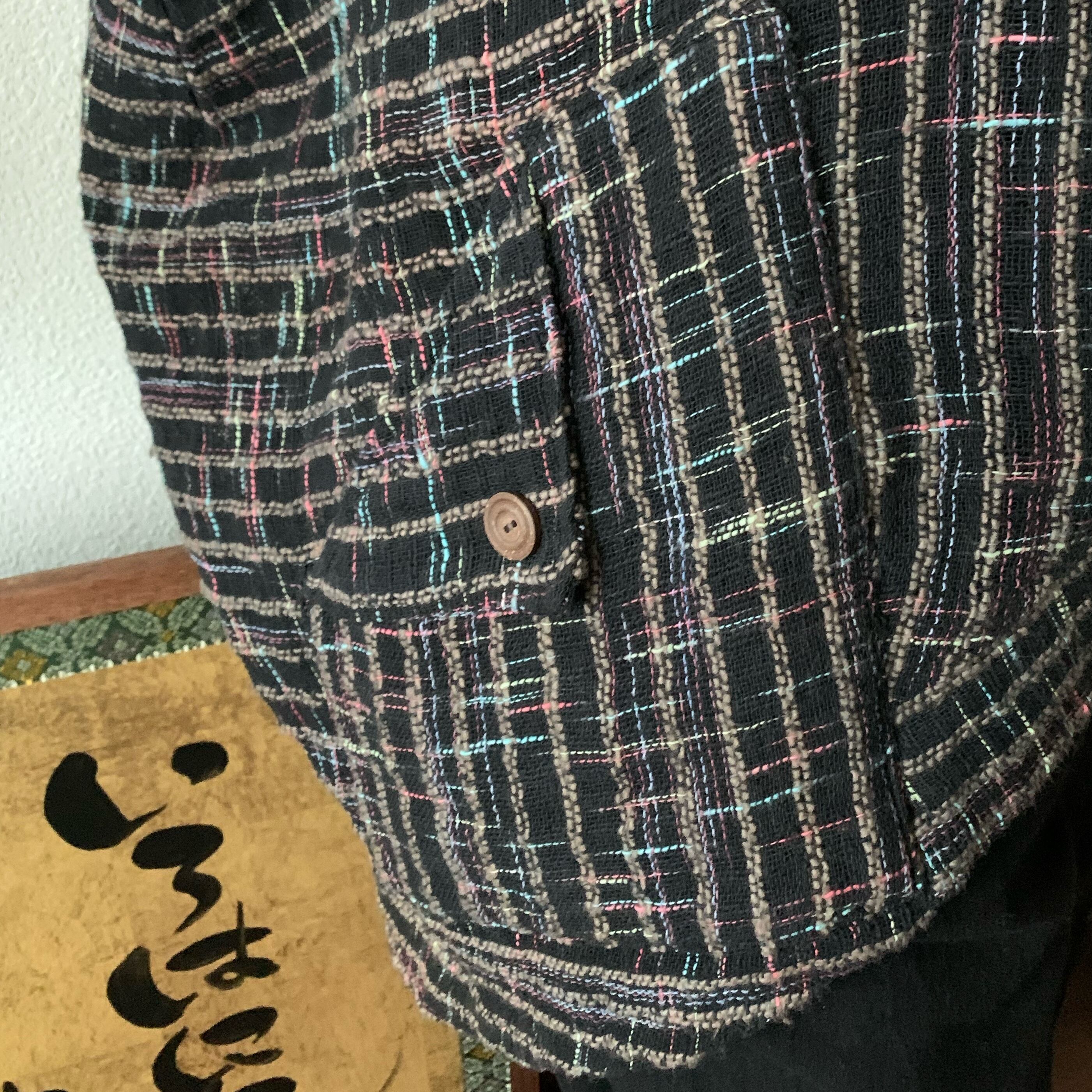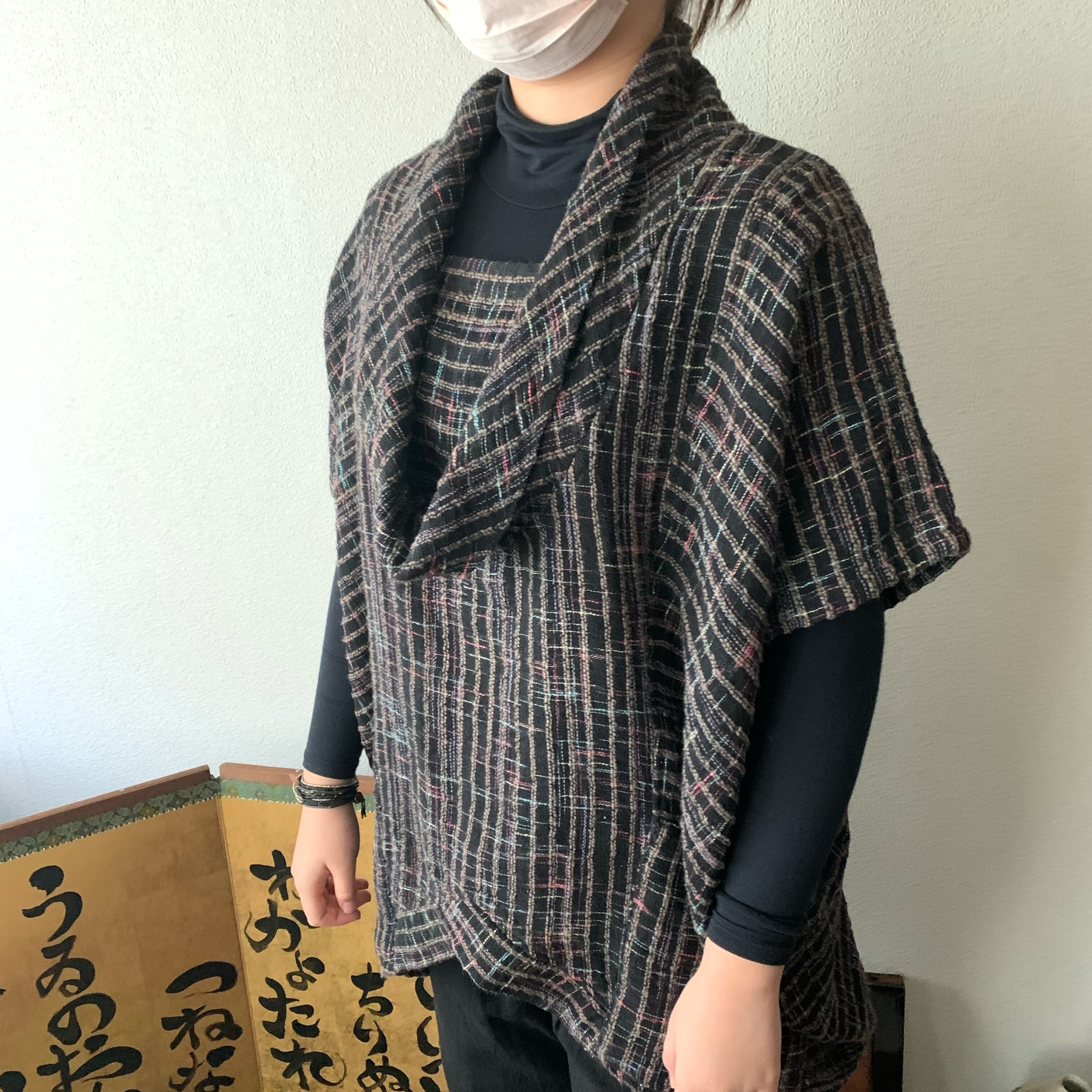 贅沢に織り向きを切替えたコクーンシルエットの手織綿チュニックブラウス 細身な方からふくよかな方まで 黒地紫絣