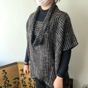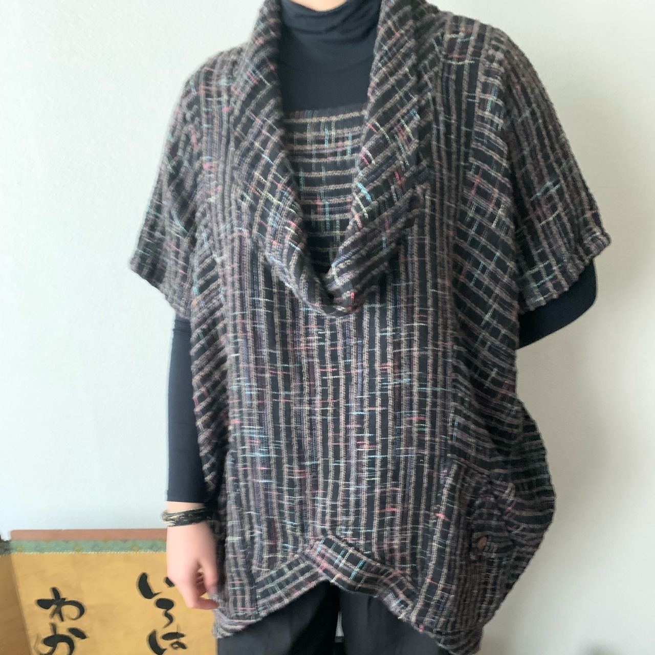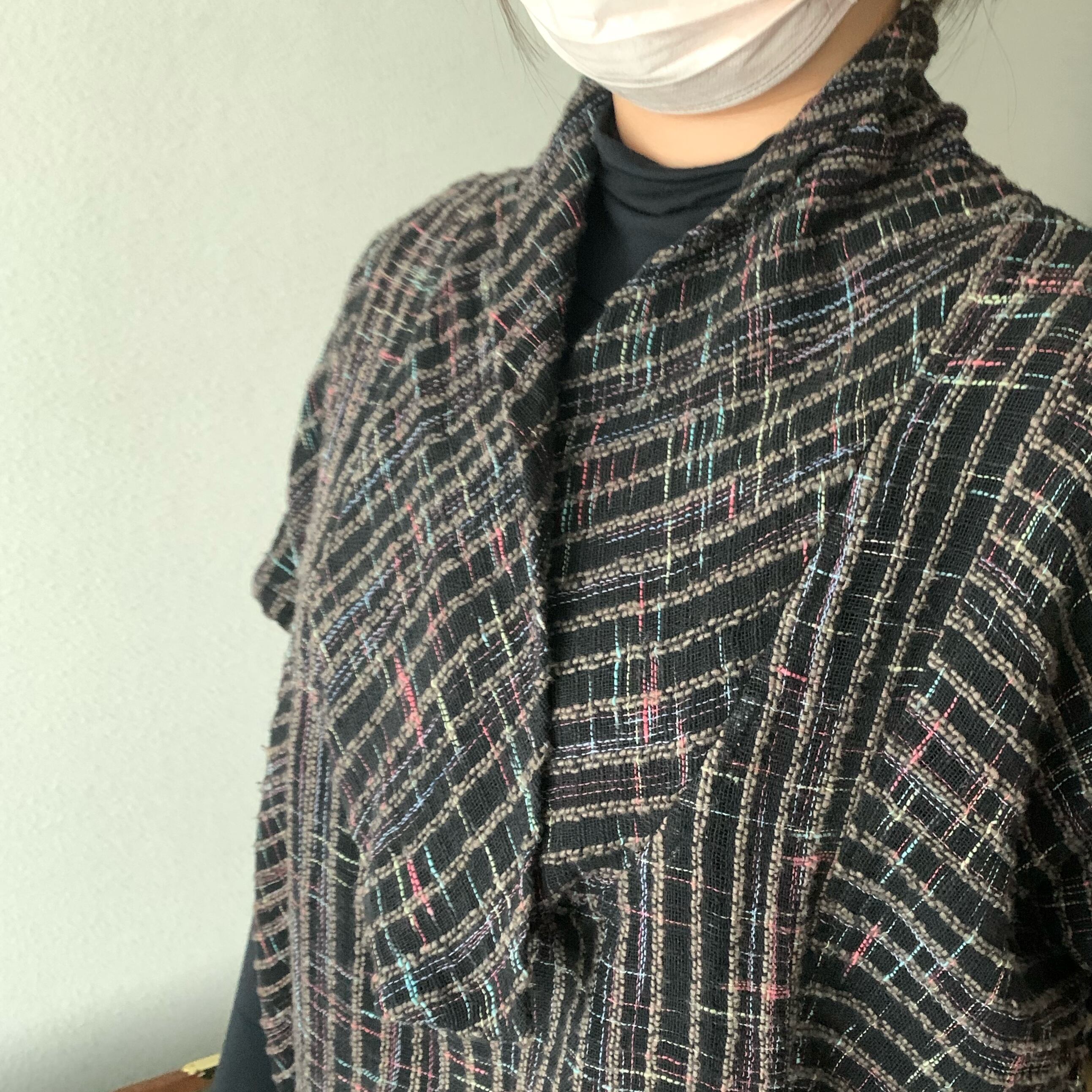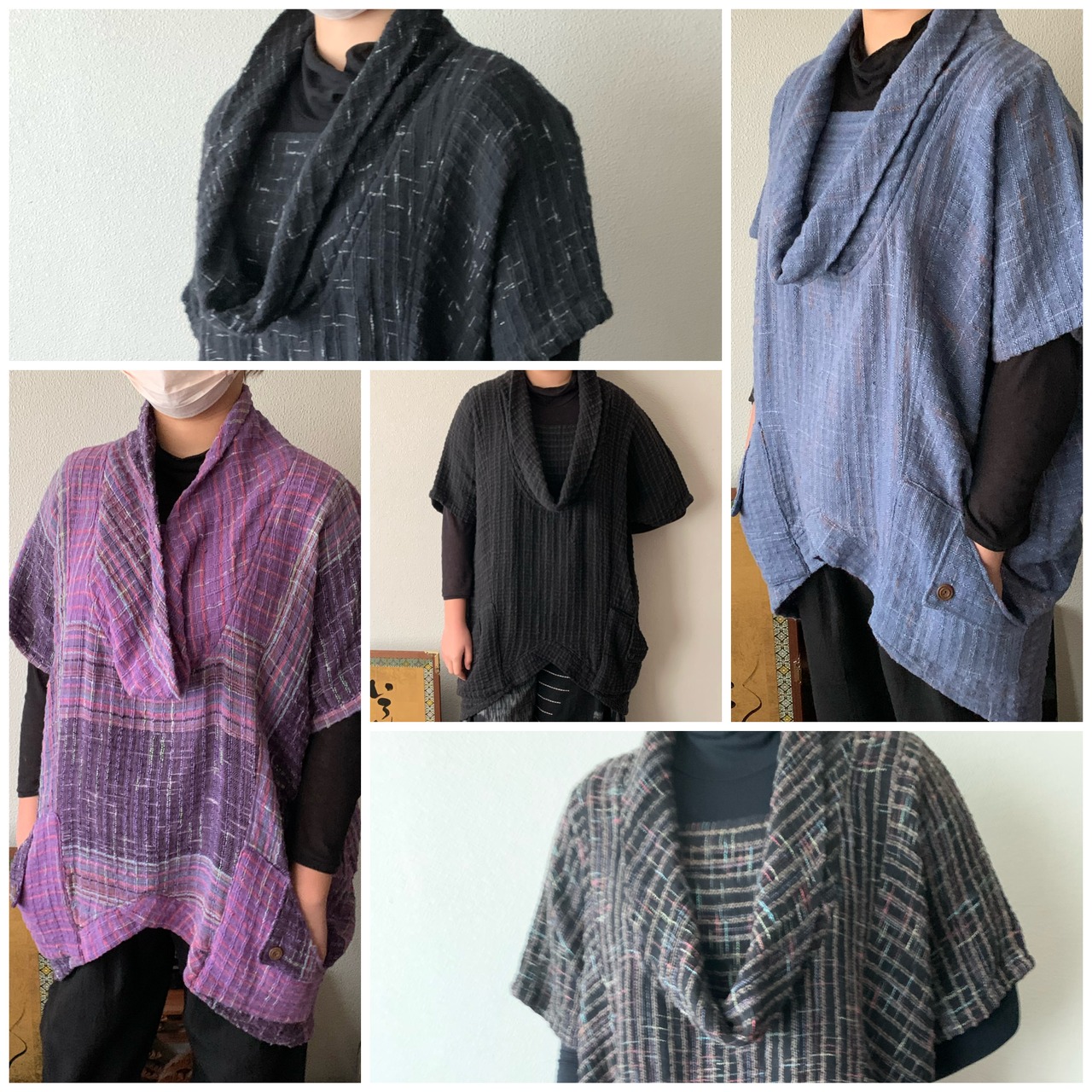前ネック部分の内側にさらに布をつけることで一枚でザクっと着ていただけることが可能になりますし、大きめのネックにしているので折りたたんで襟のようにしたり、ブローチをつけたりしても楽しめます。