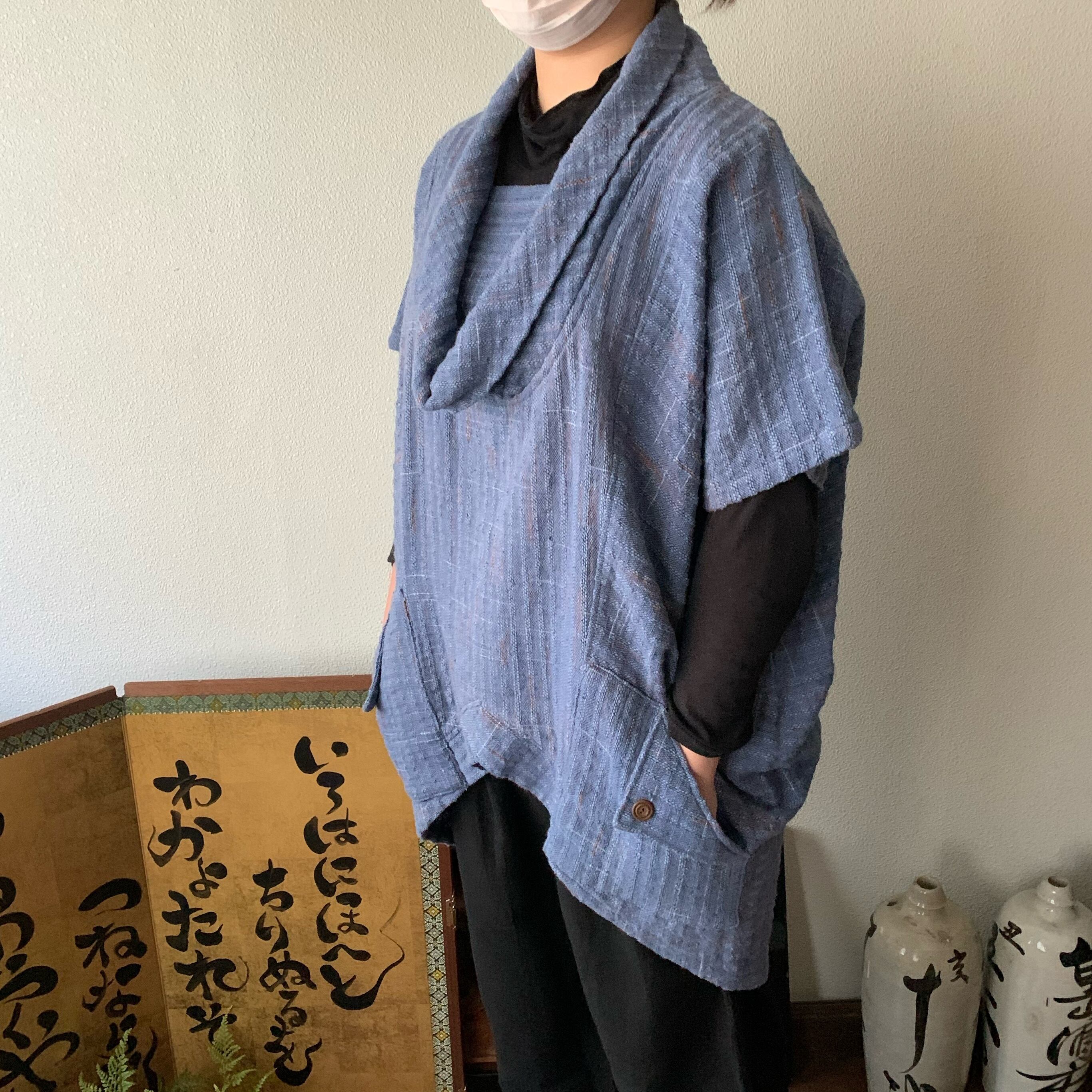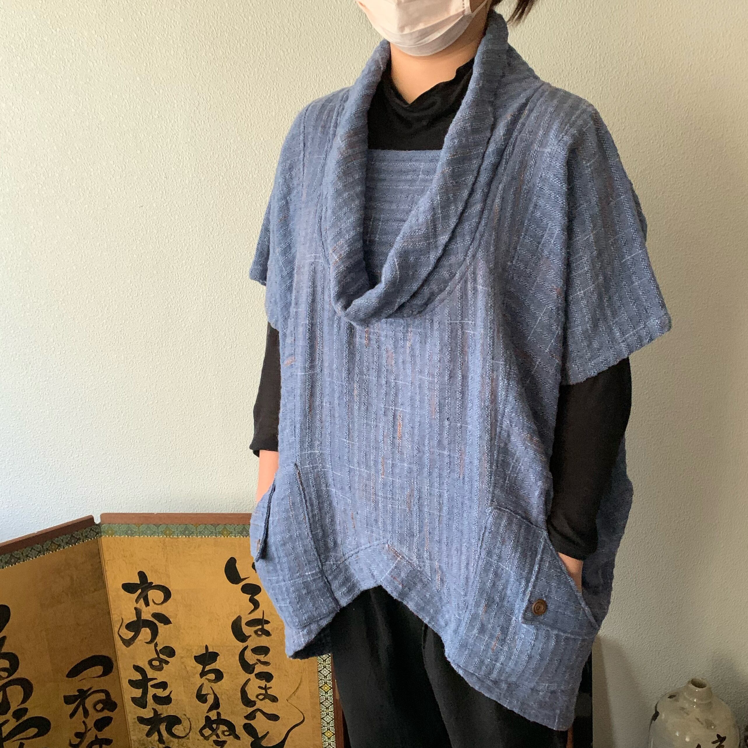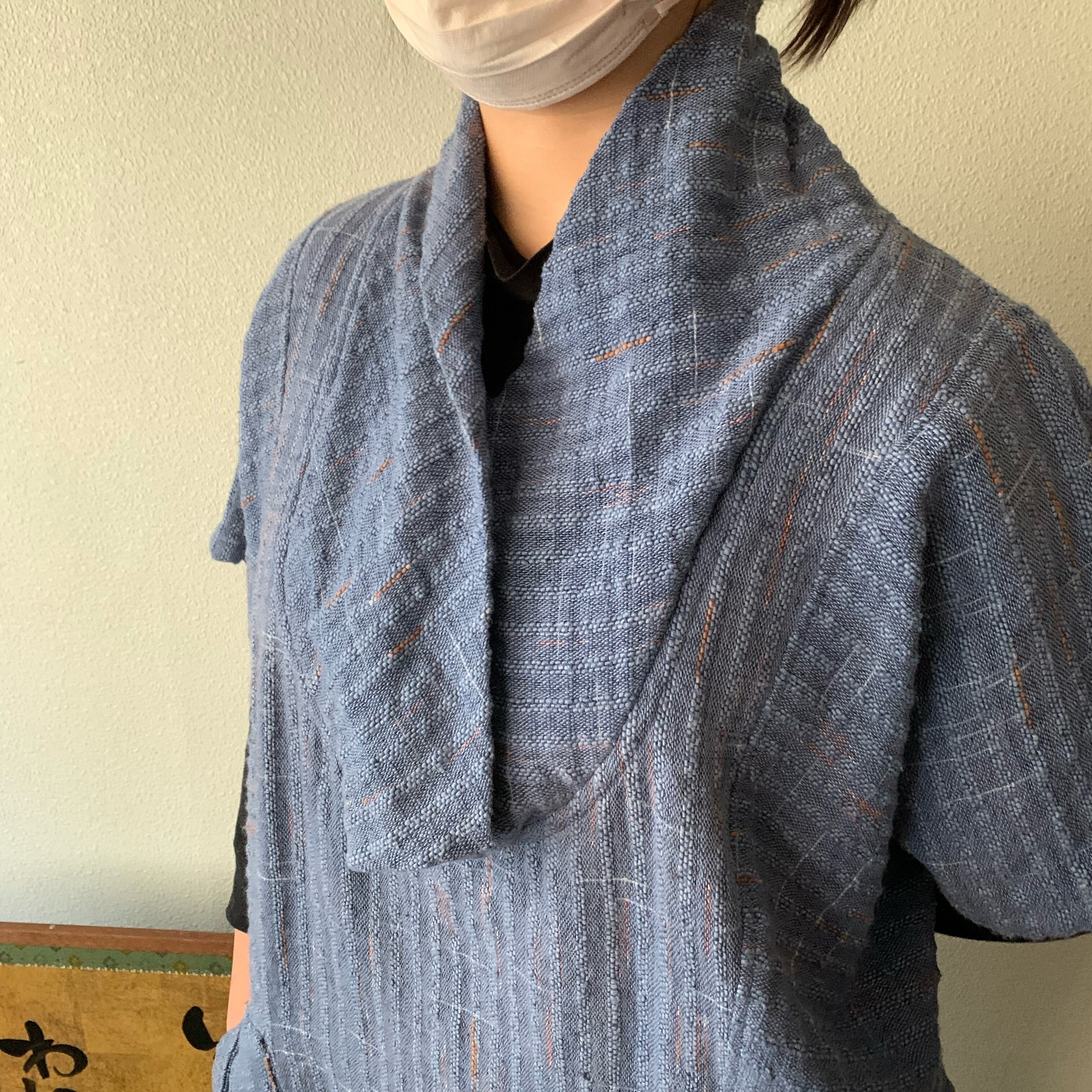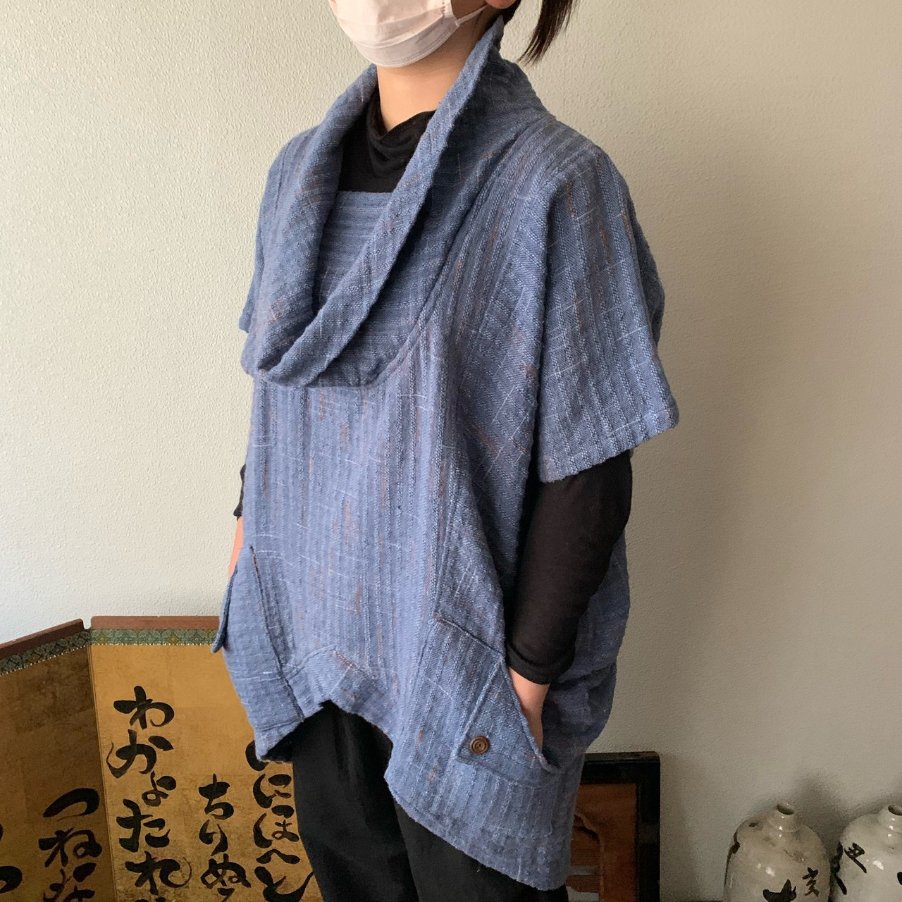 前ネック部分の内側にさらに布をつけることで一枚でザクっと着ていただけることが可能になりますし、大きめのネックにしているので折りたたんで襟のようにしたり、ブローチをつけたりしても楽しめます。