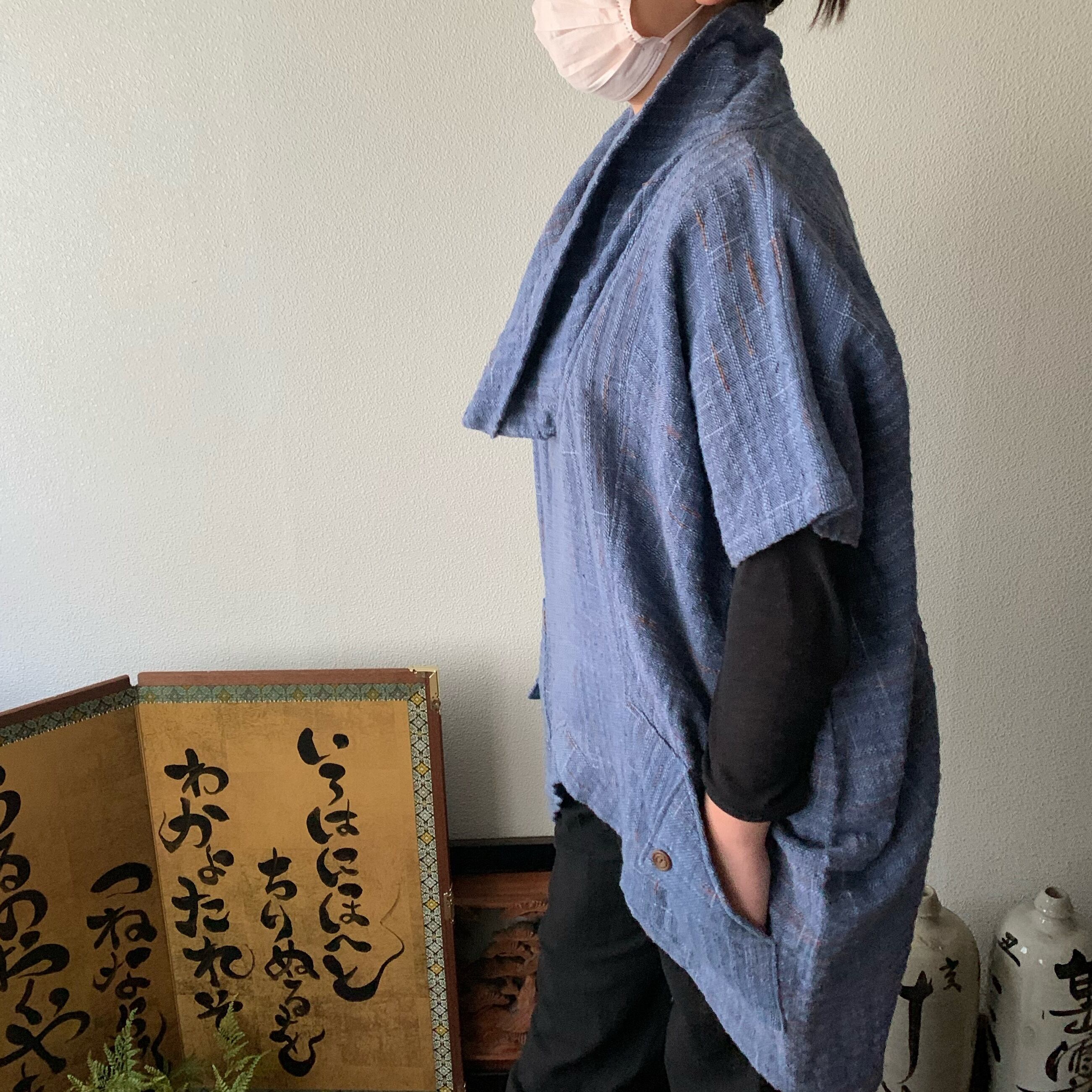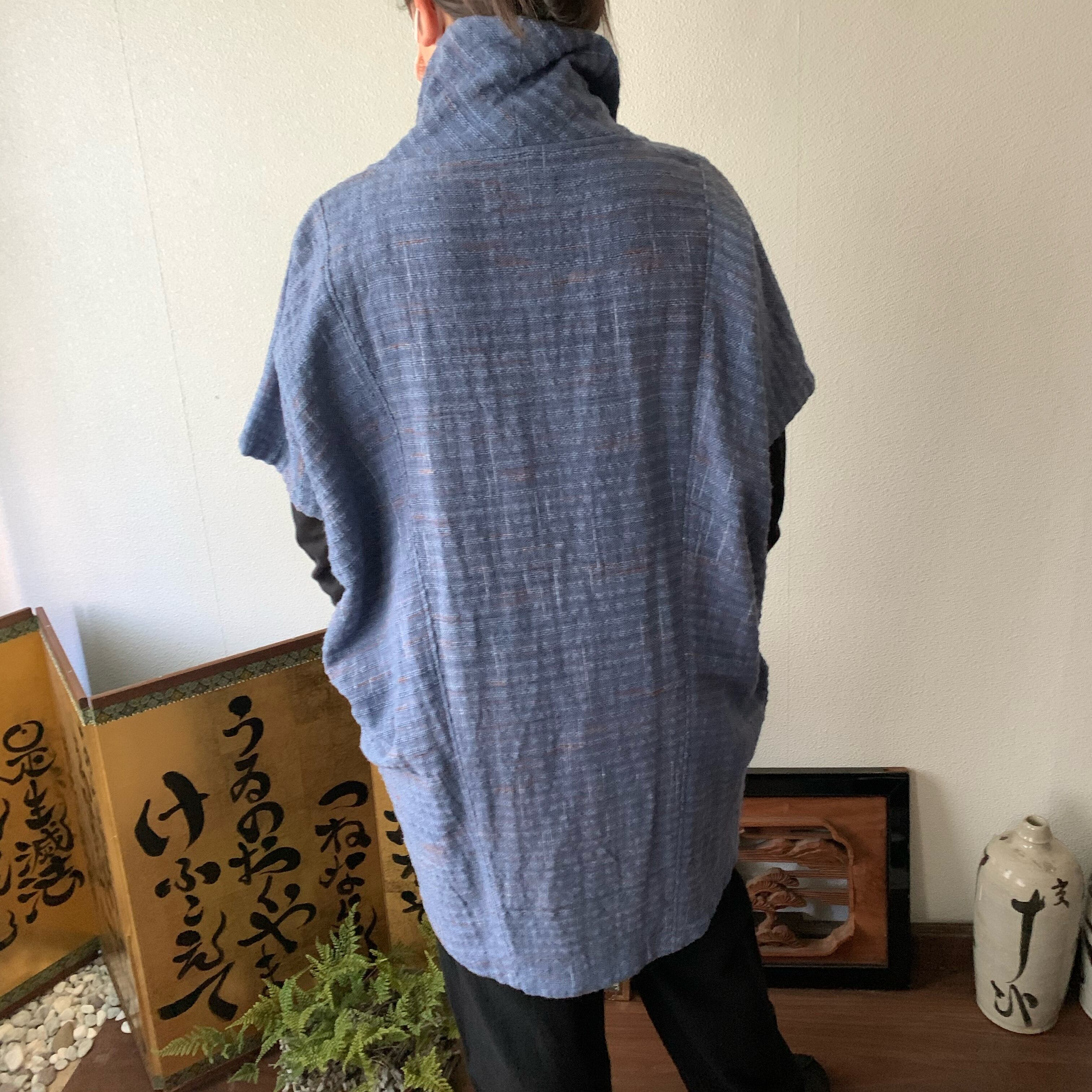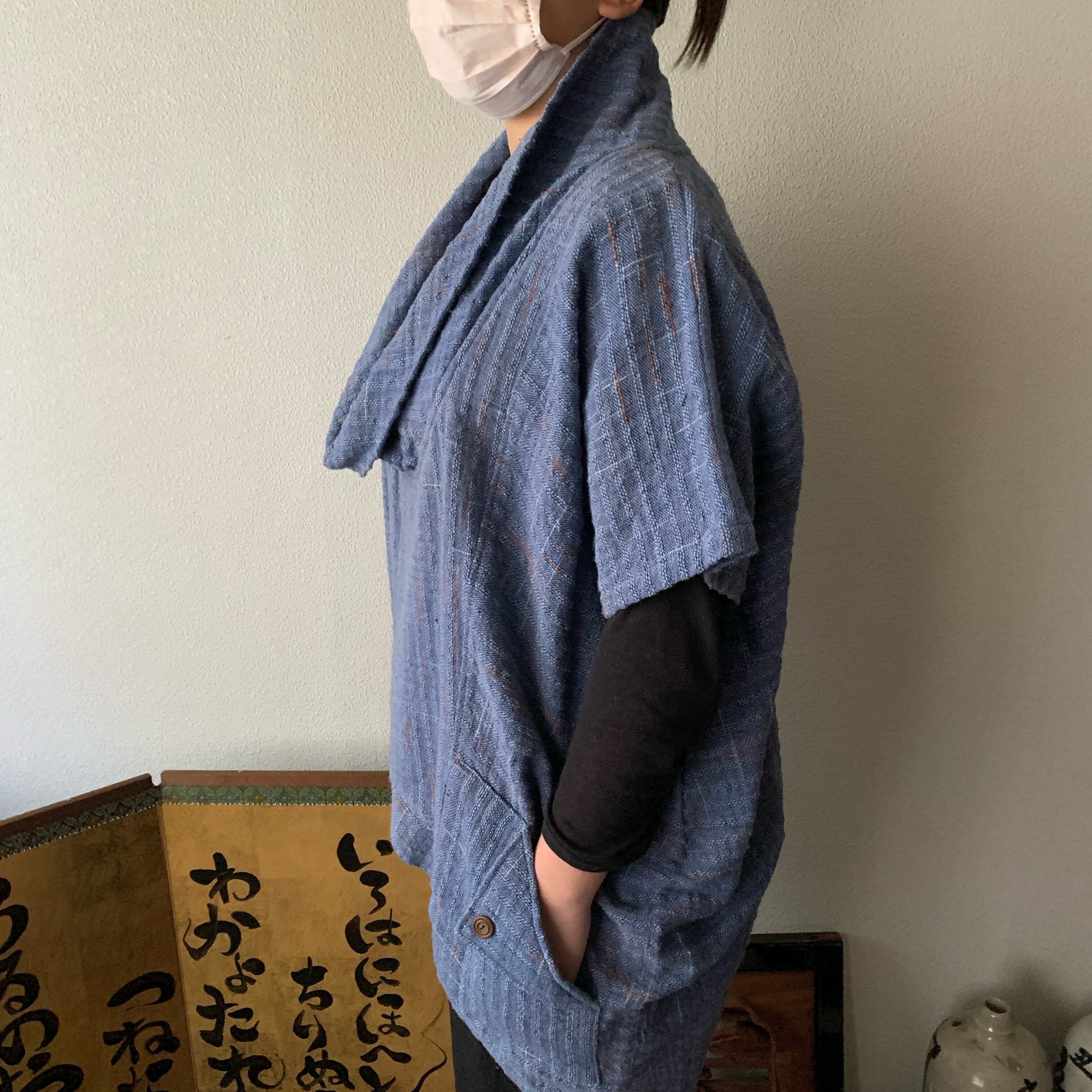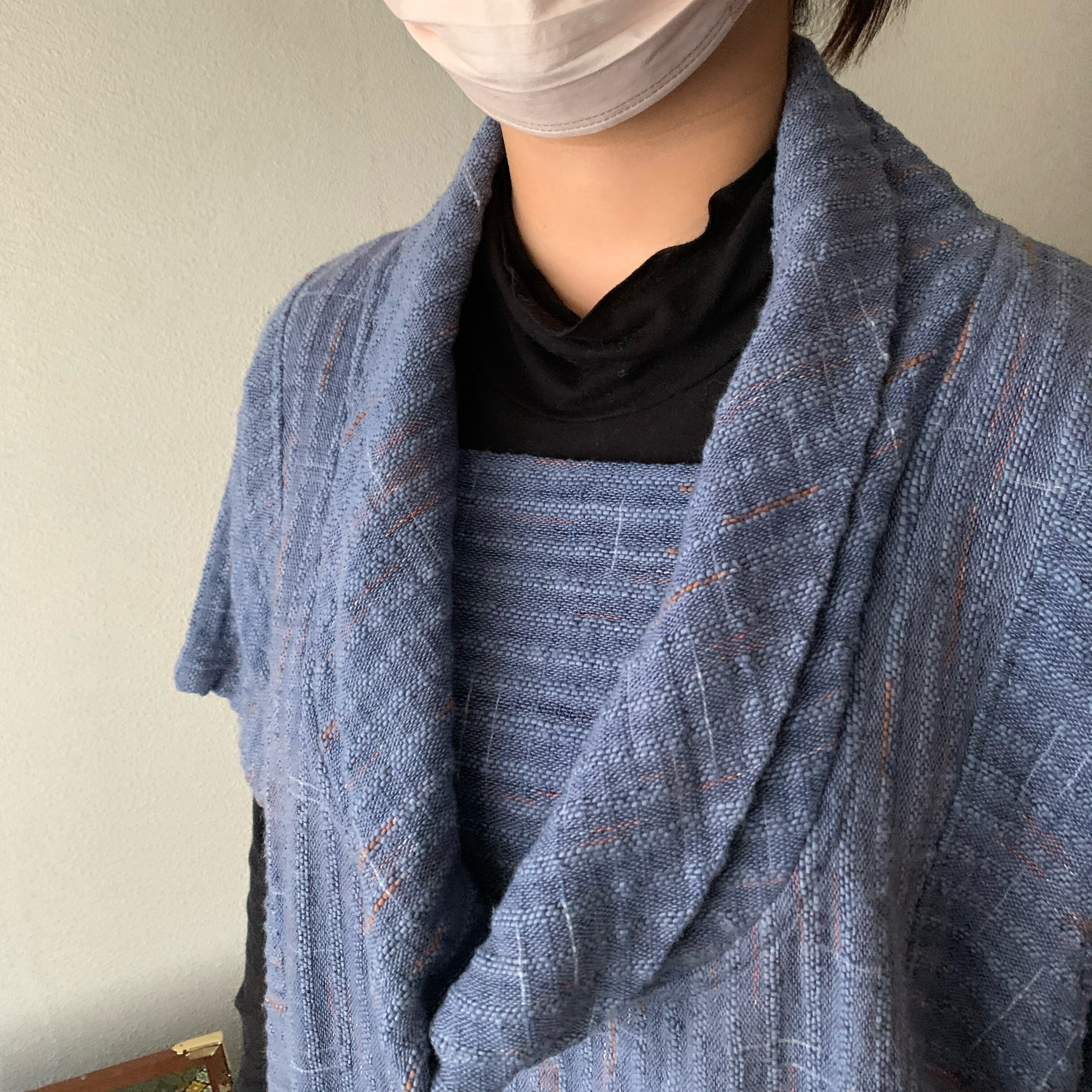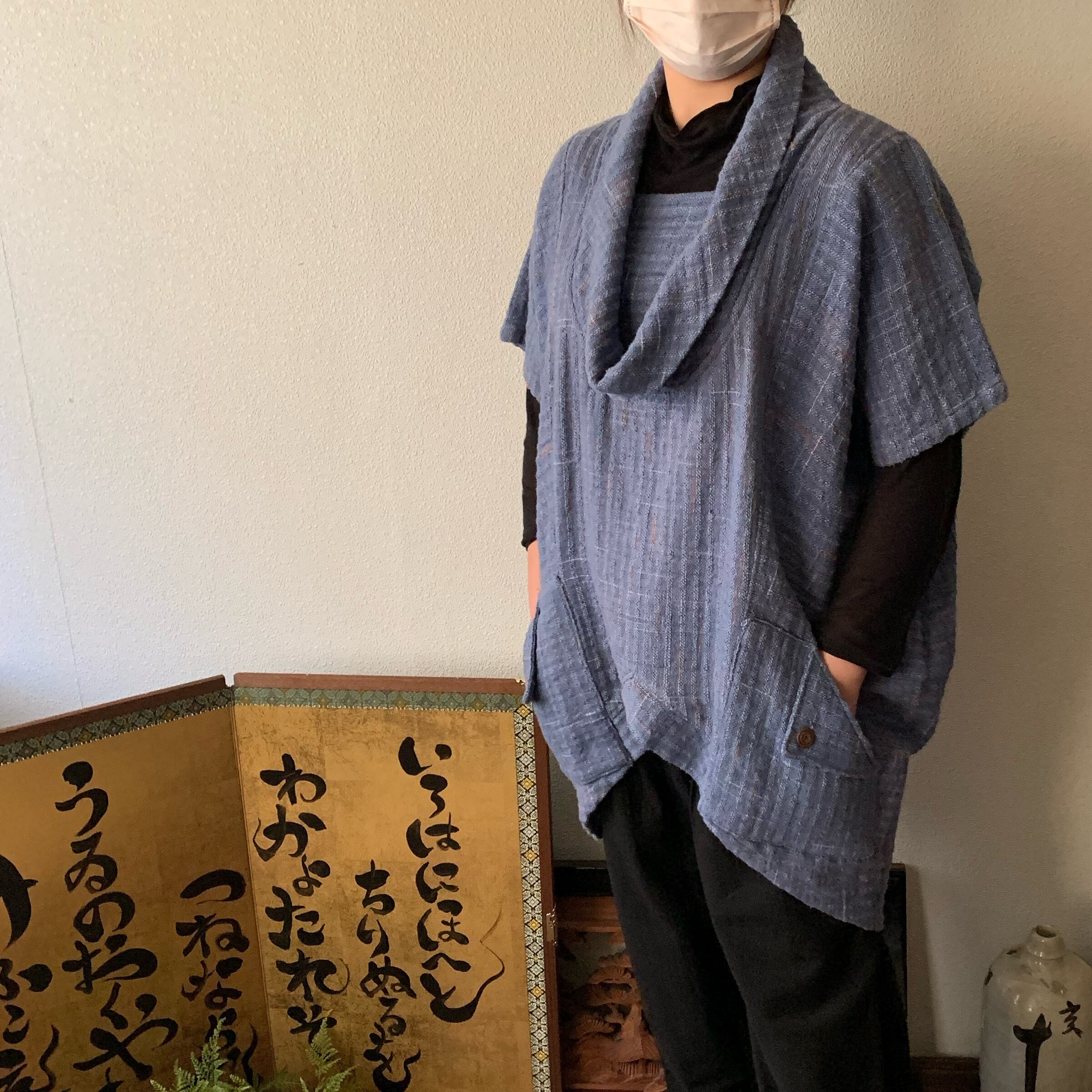 前ネック部分の内側にさらに布をつけることで一枚でザクっと着ていただけることが可能になりますし、大きめのネックにしているので折りたたんで襟のようにしたり、ブローチをつけたりしても楽しめます。