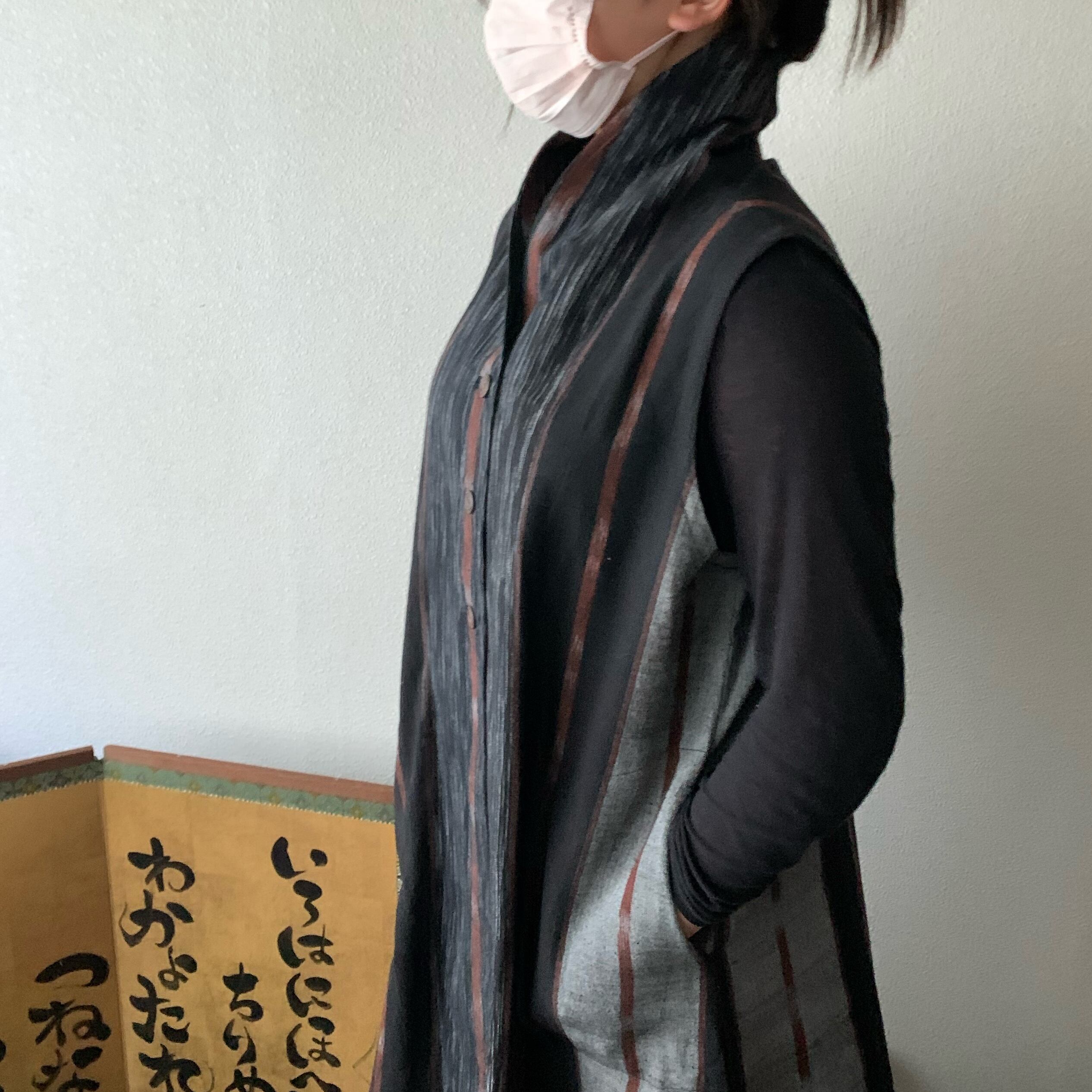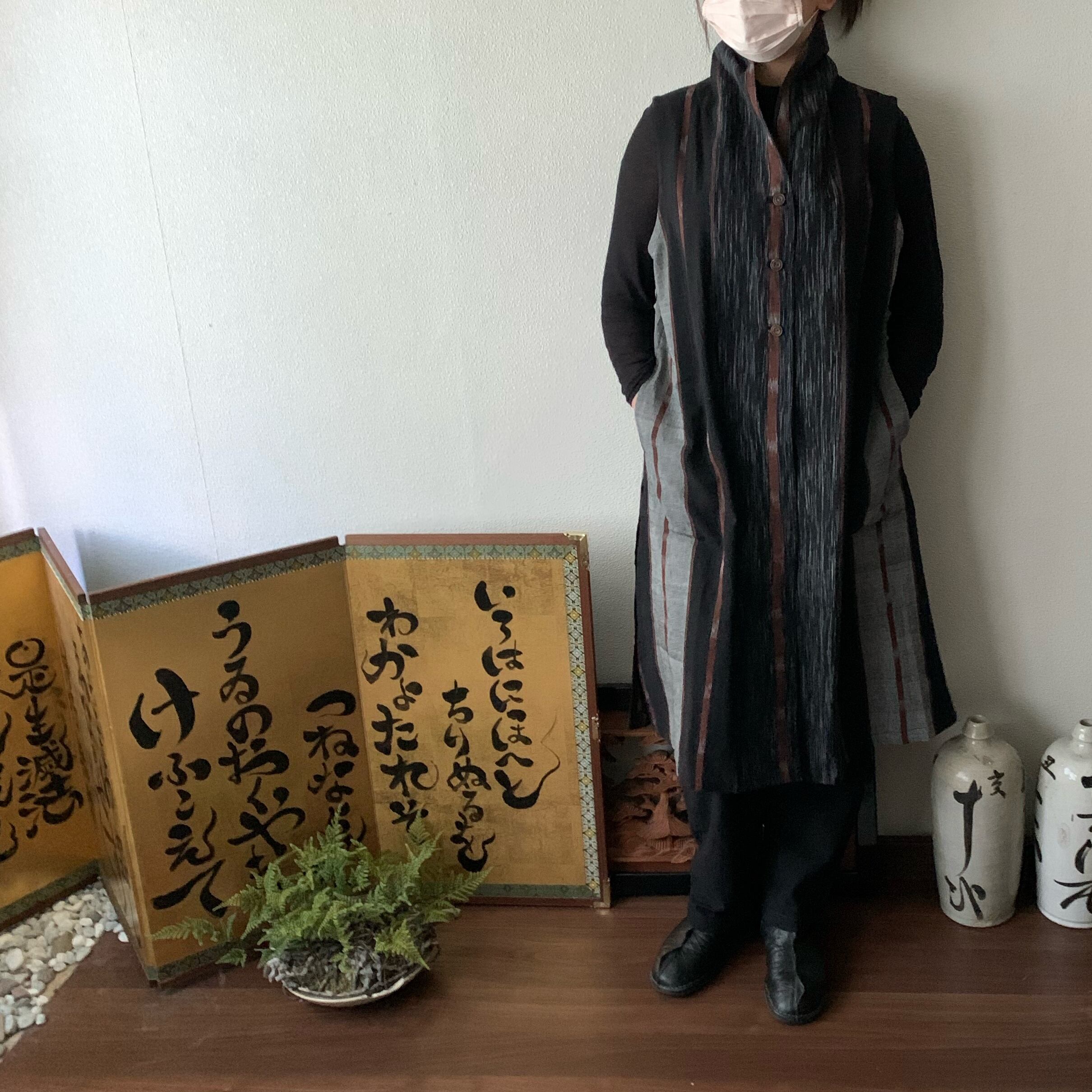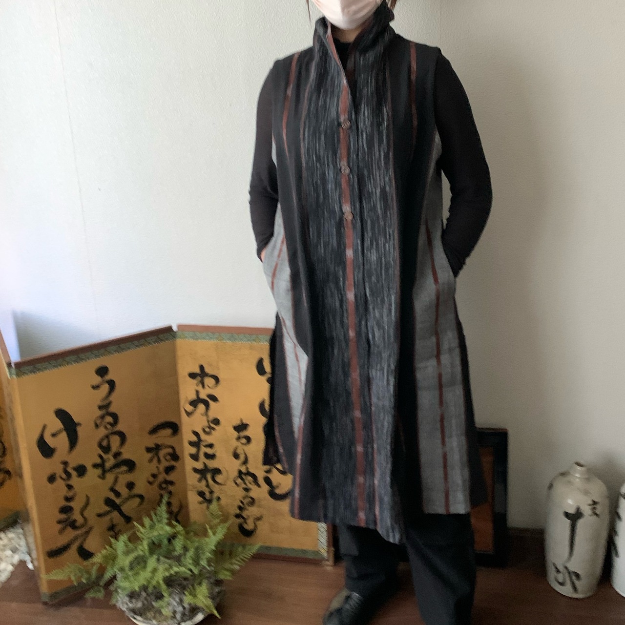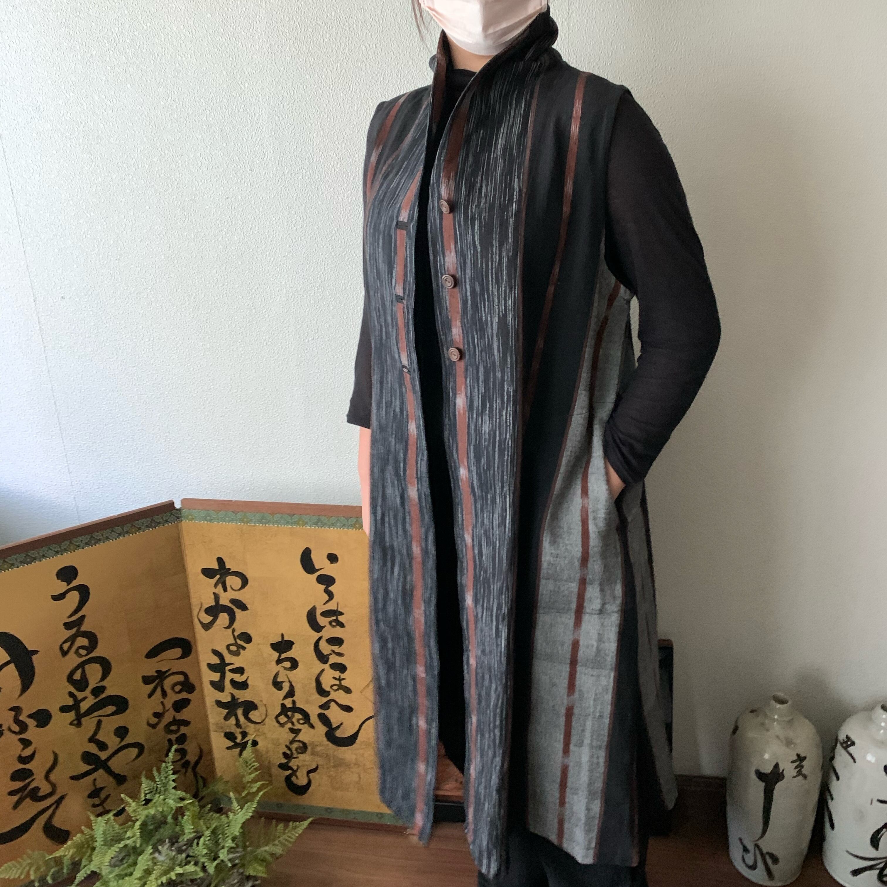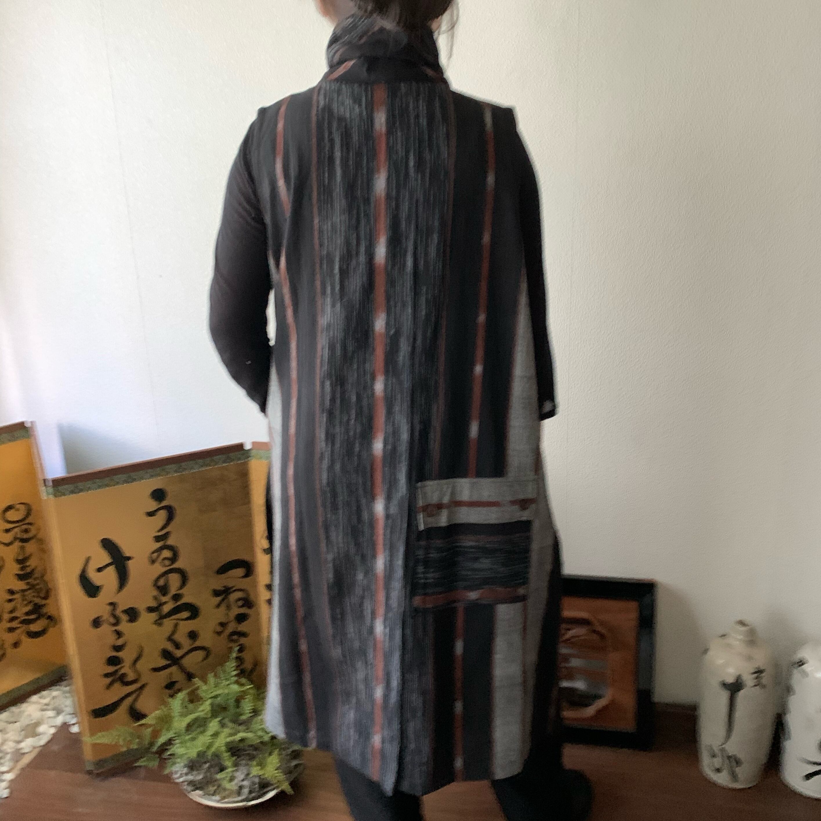 ハイカラーと深めスリット、一枚で決まる手織綿ロングベスト 後身頃も裾ポケットと縦に走るタックでかっこよく 黒絣茶ライン