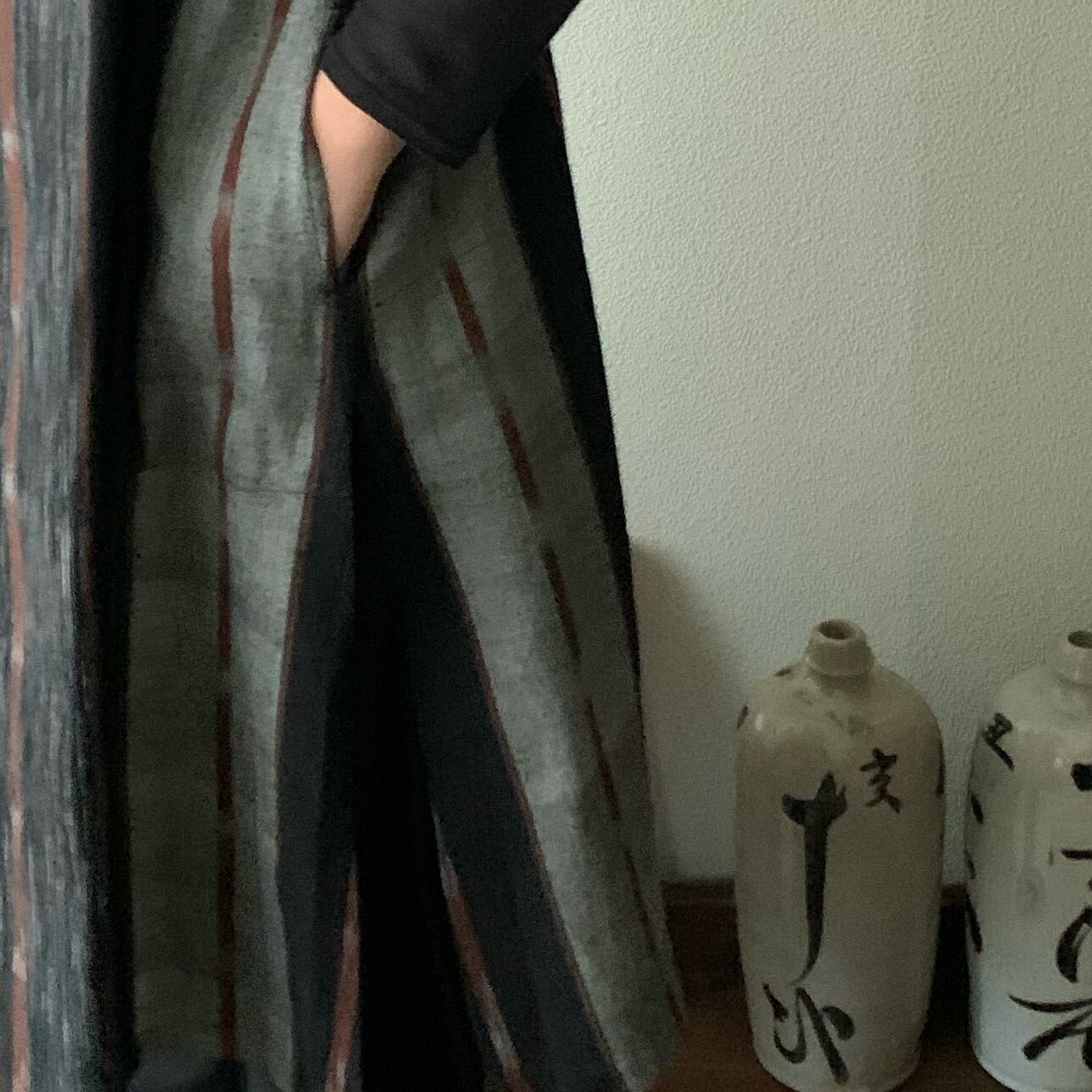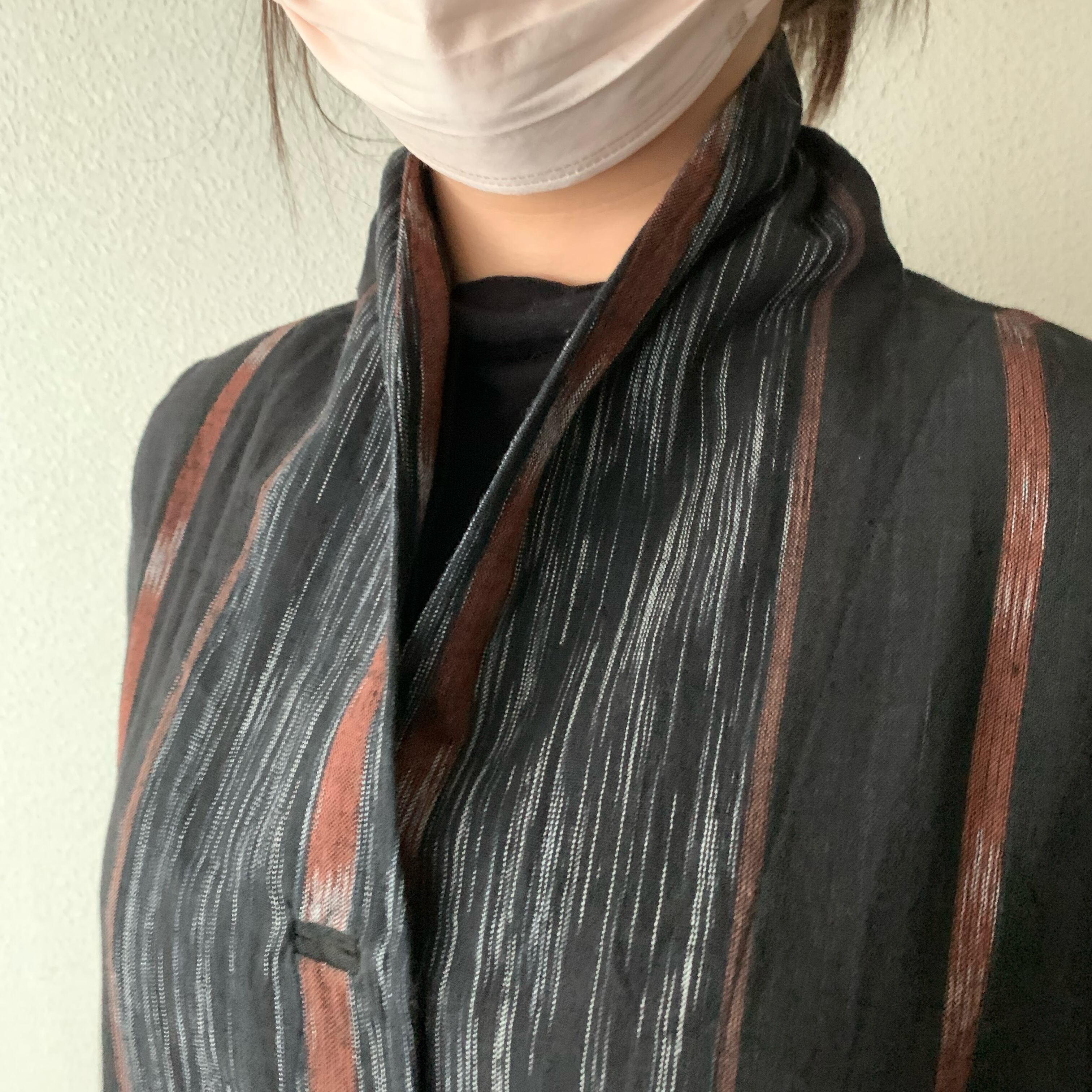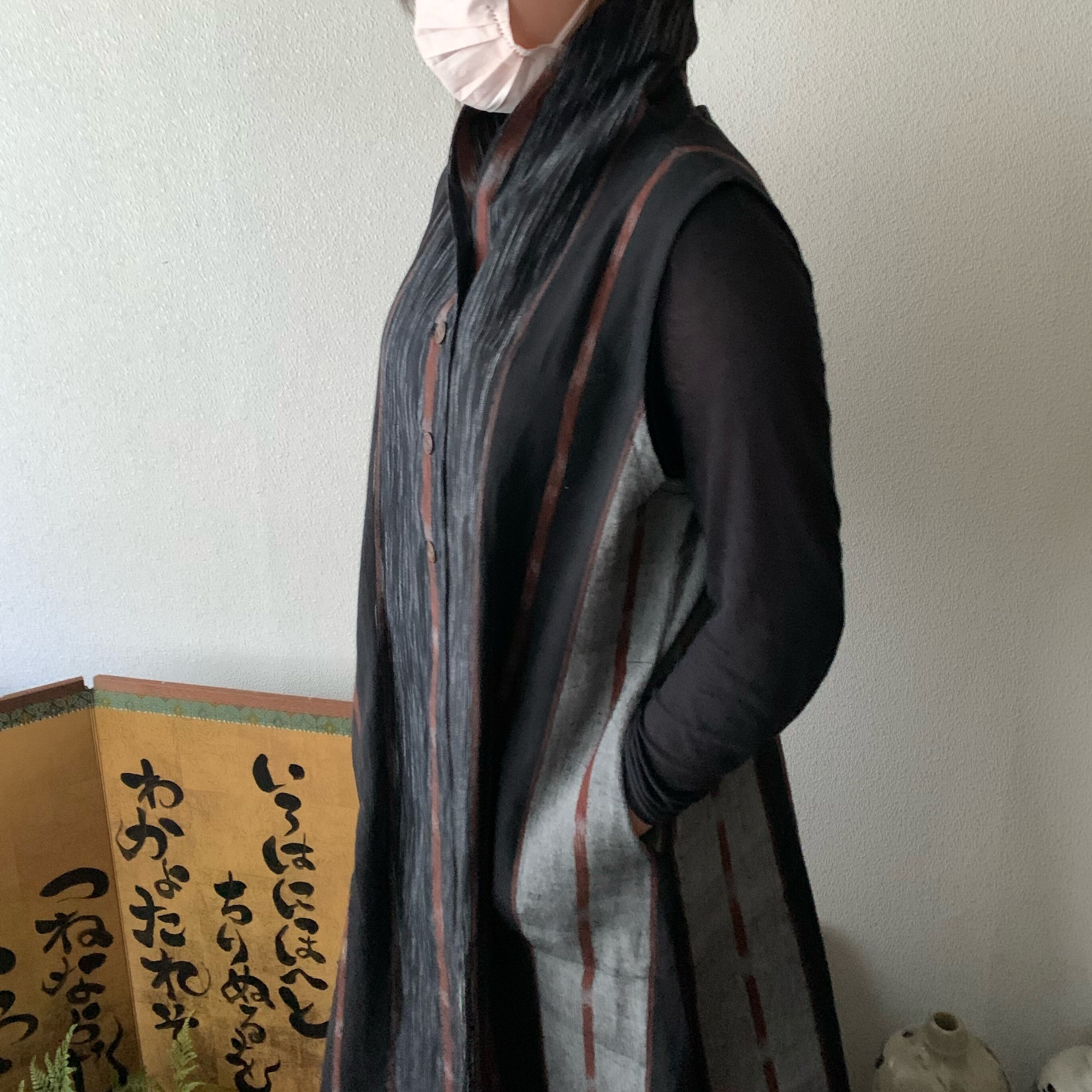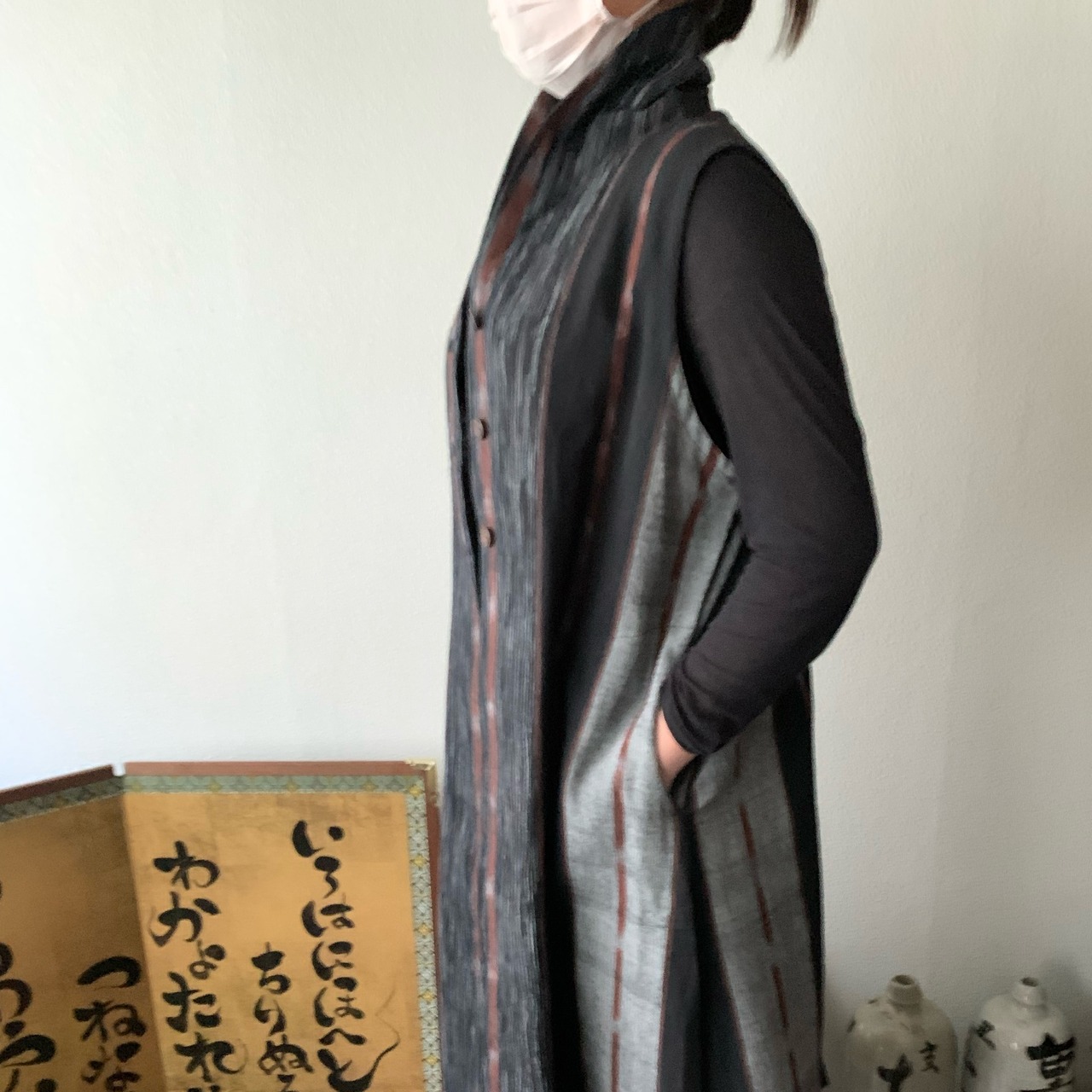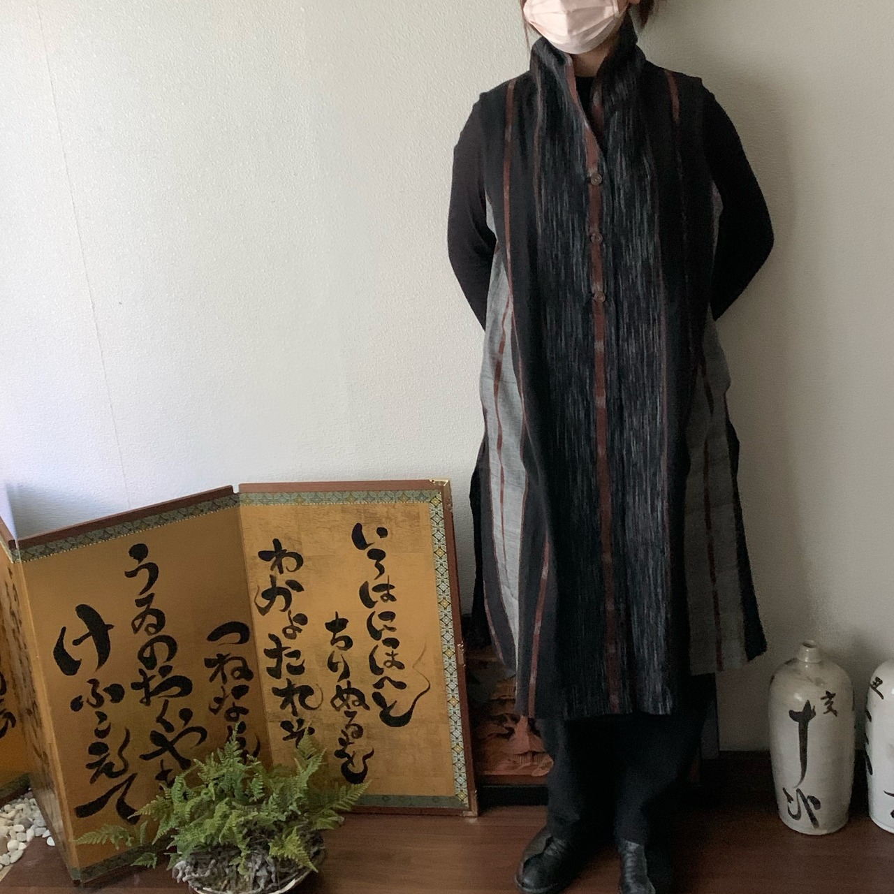 ハイカラーと深めスリット、一枚で決まる手織綿ロングベスト 後身頃も裾ポケットと縦に走るタックでかっこよく 黒絣茶ライン