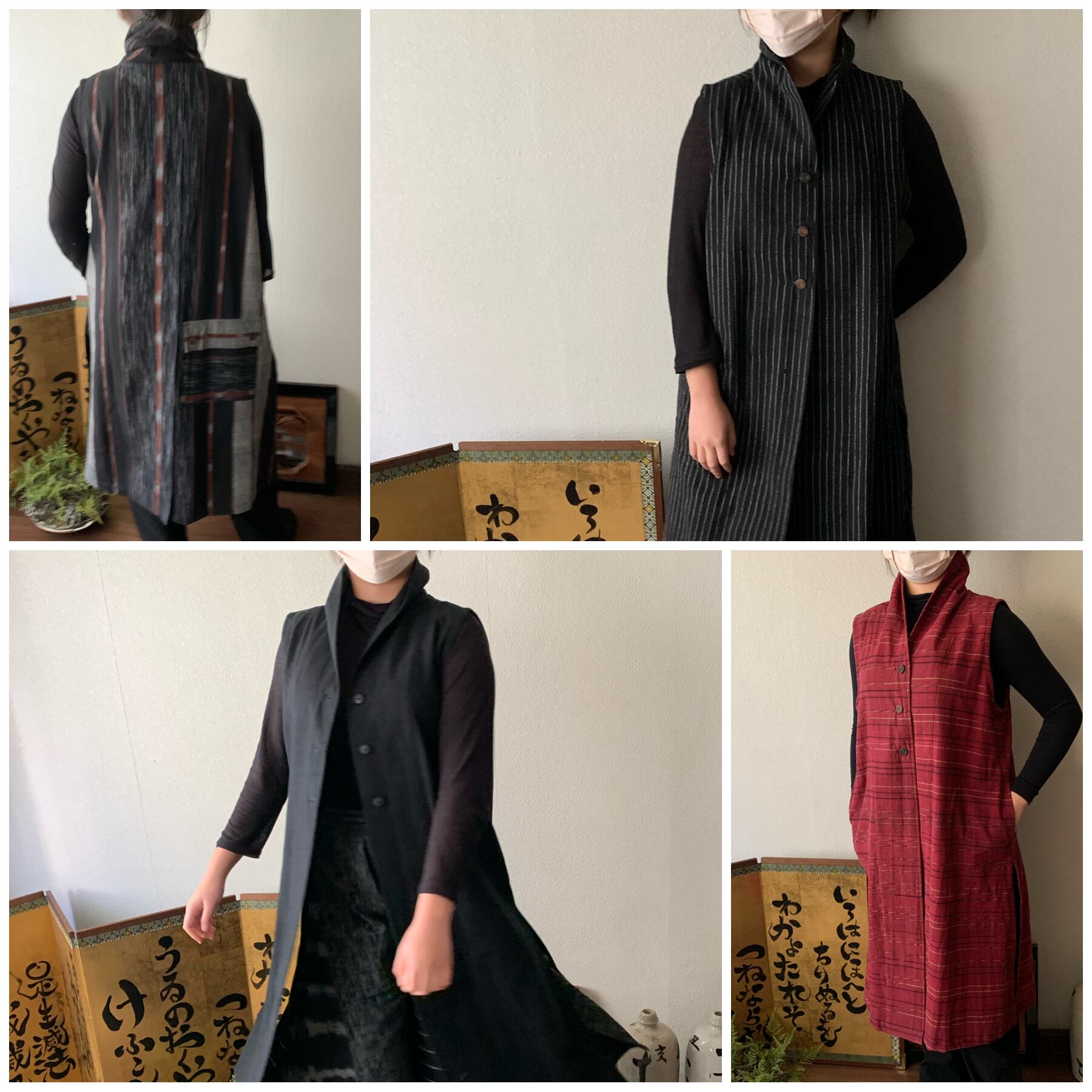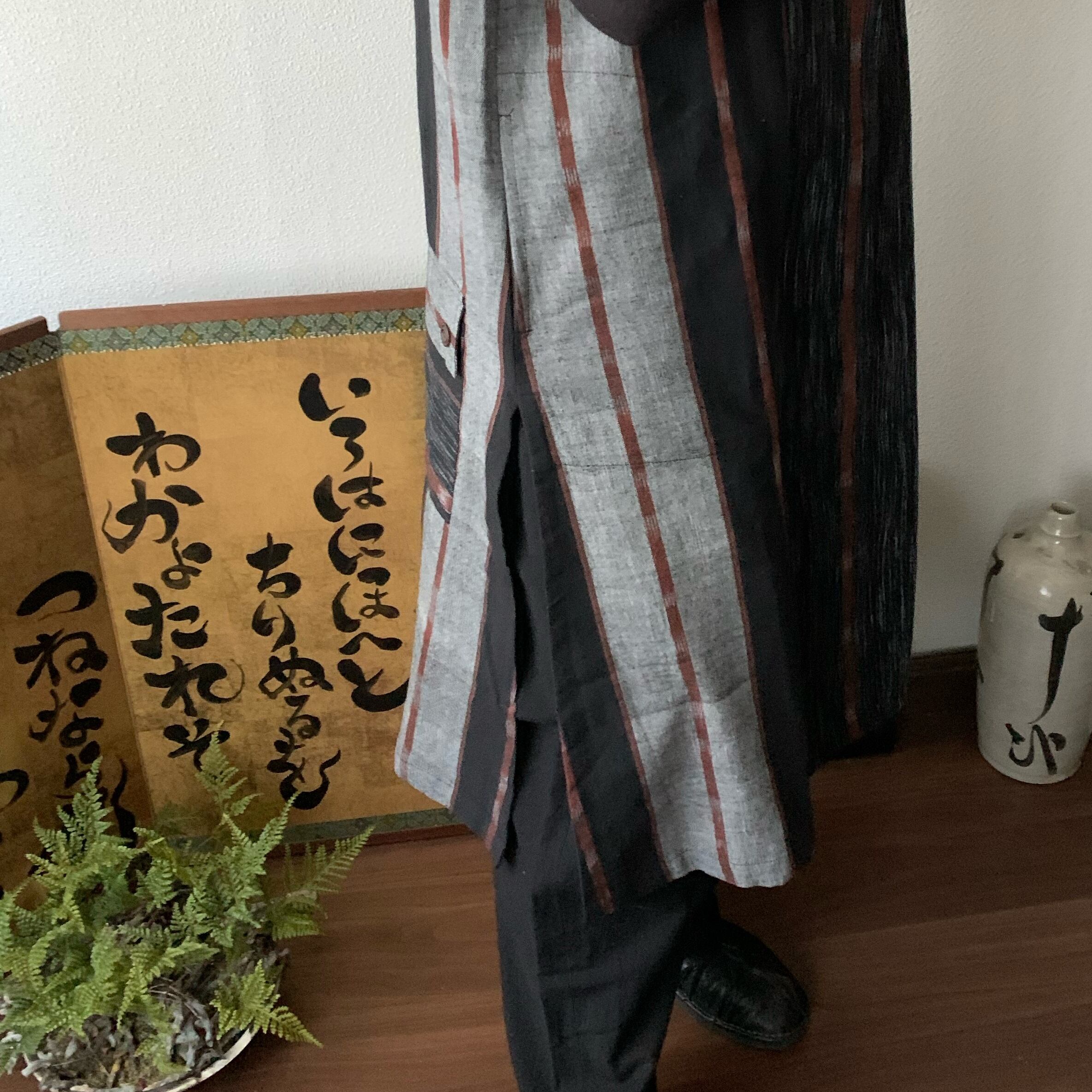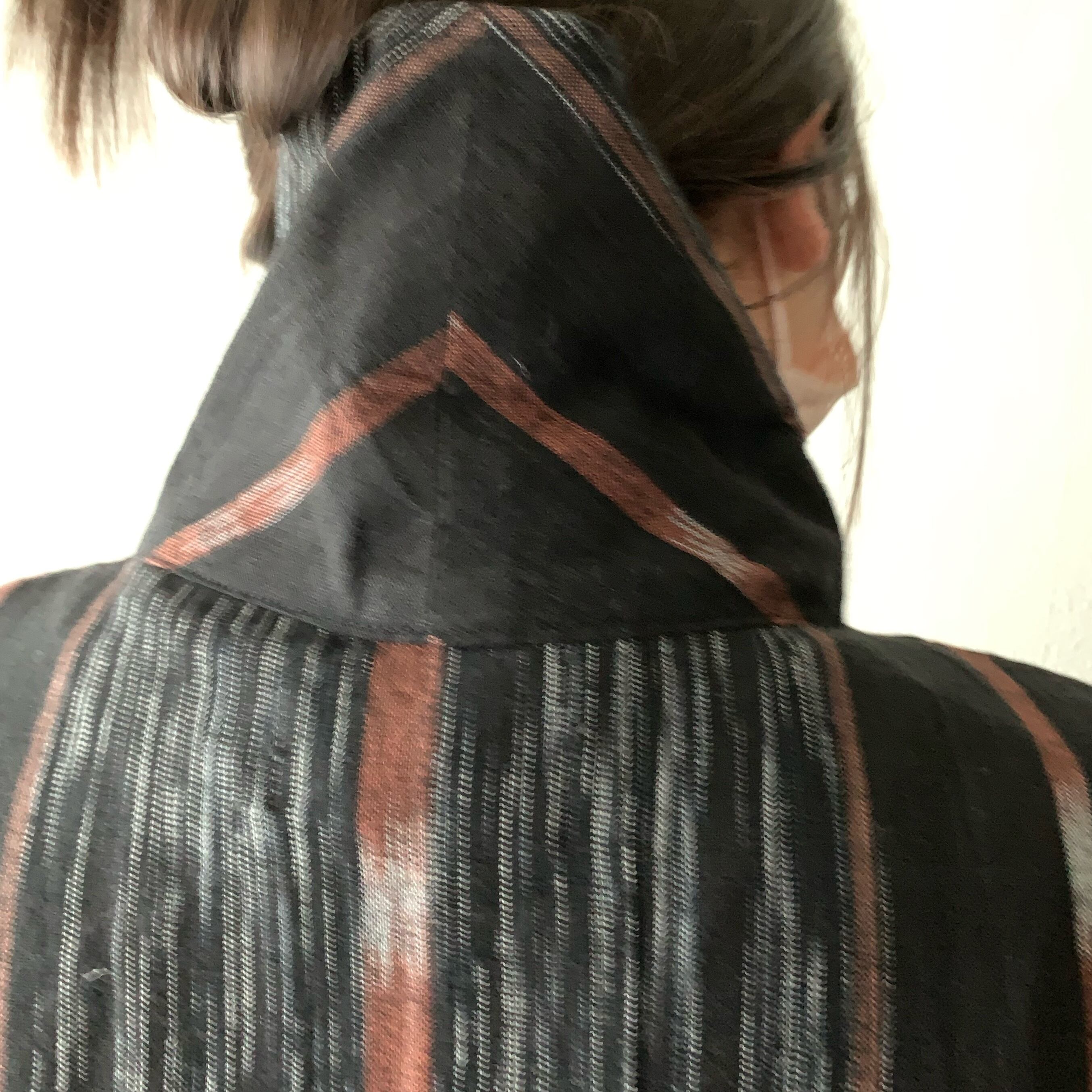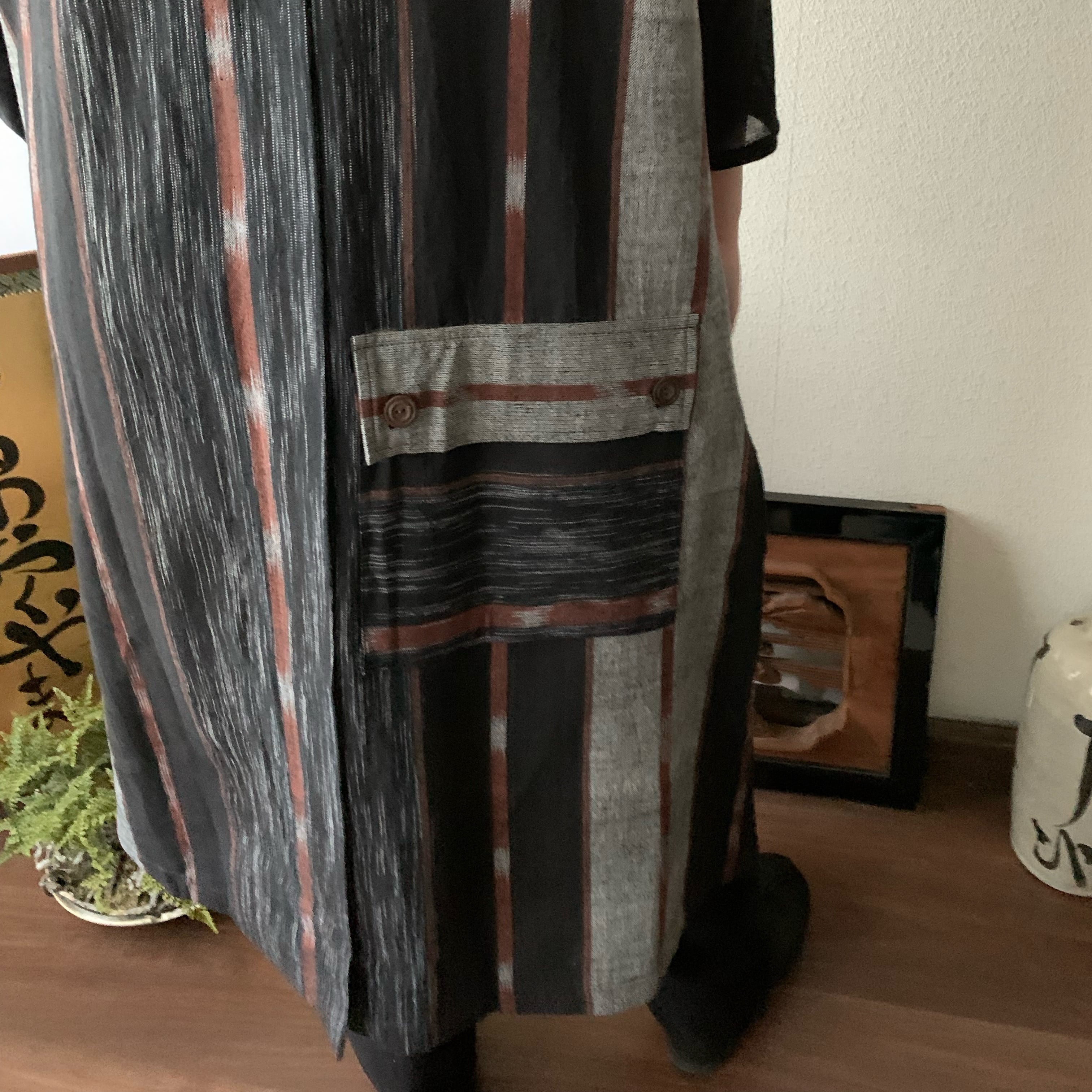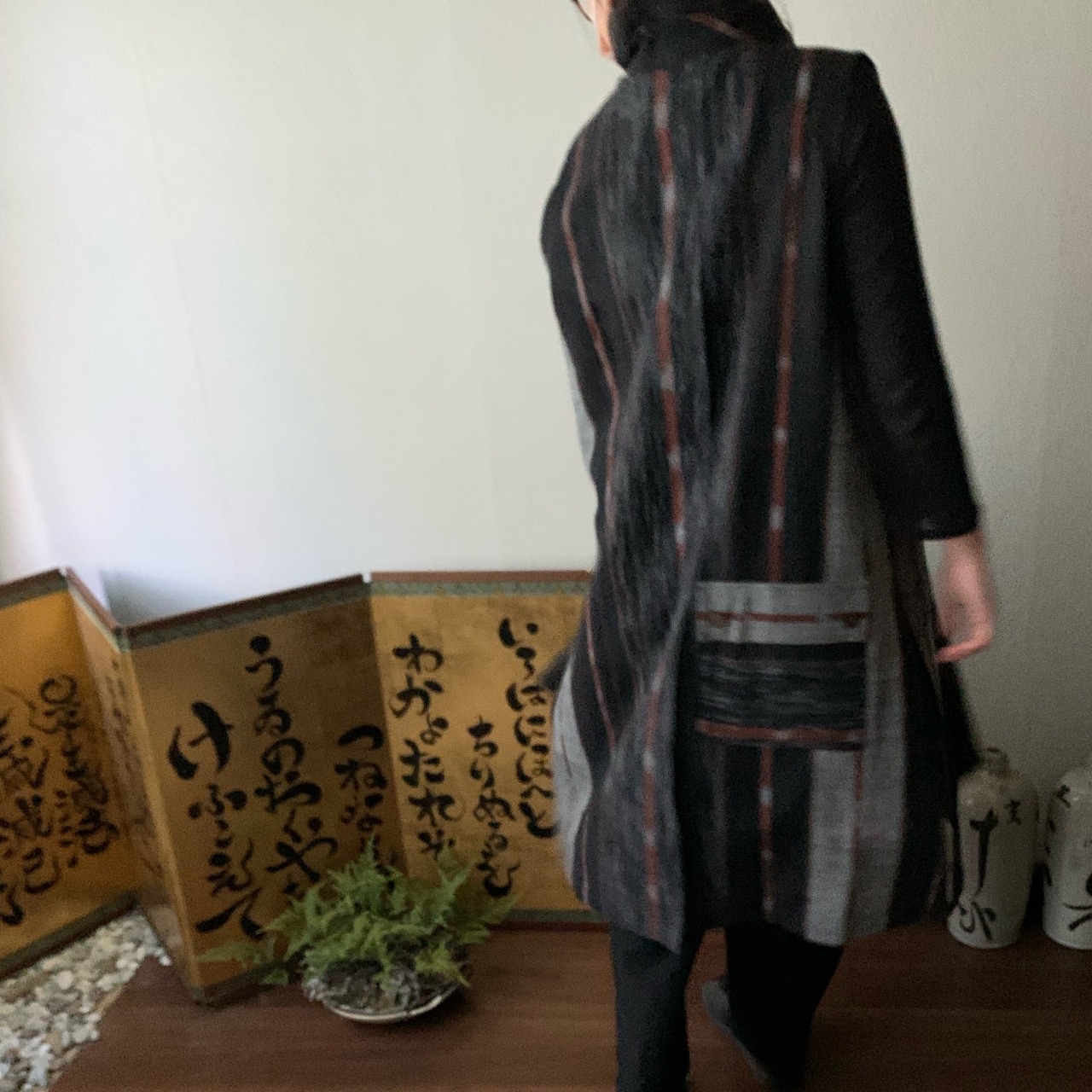 ハイカラーと深めスリット、一枚で決まる手織綿ロングベスト 後身頃も裾ポケットと縦に走るタックでかっこよく 黒絣茶ライン