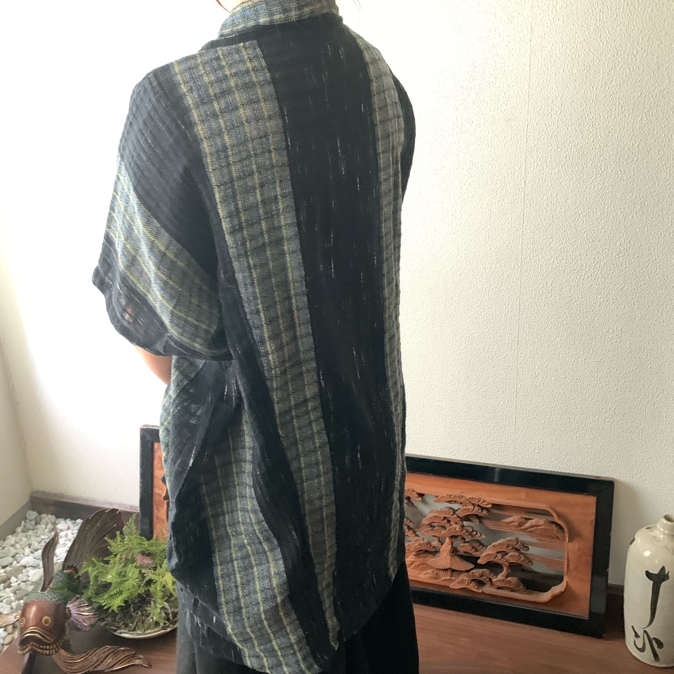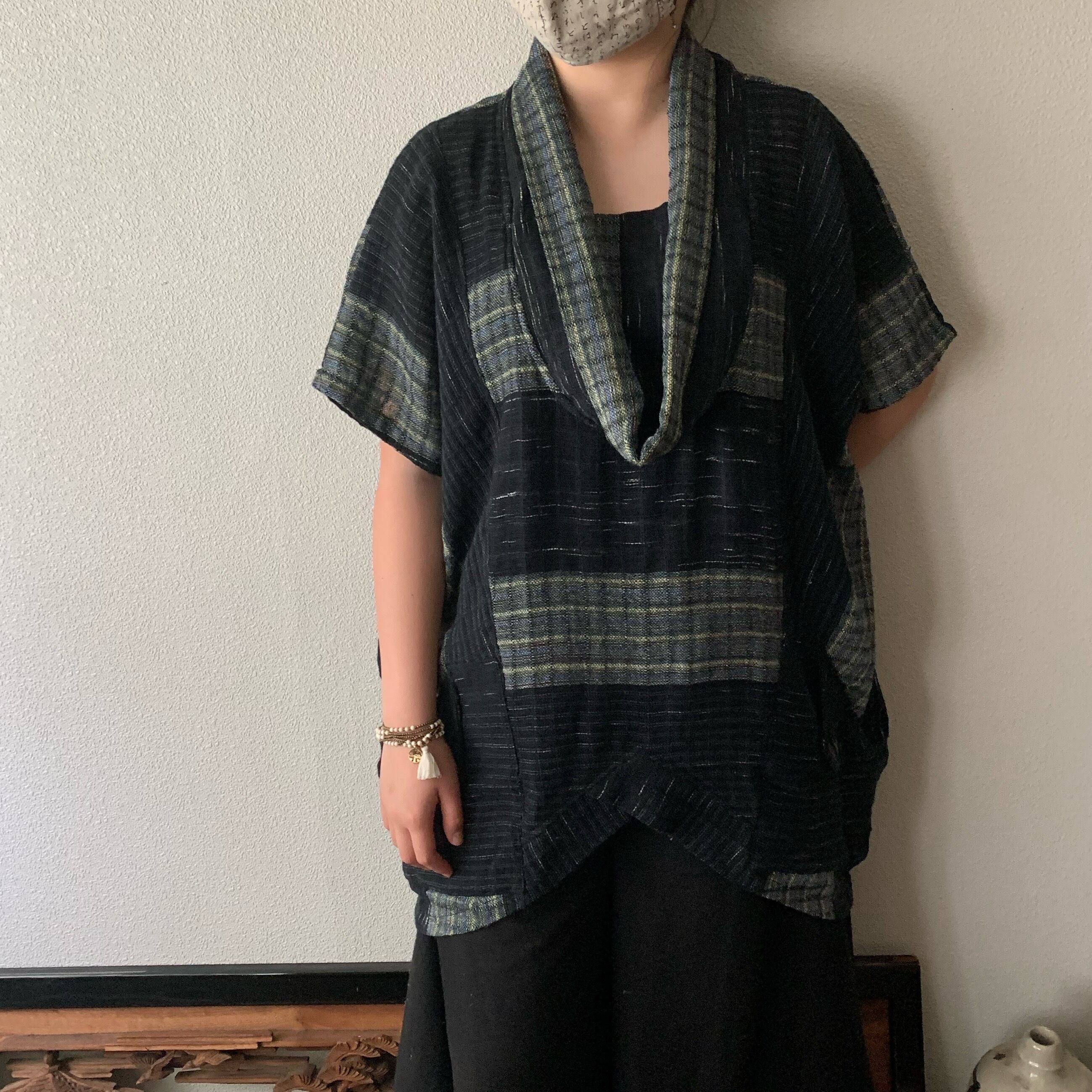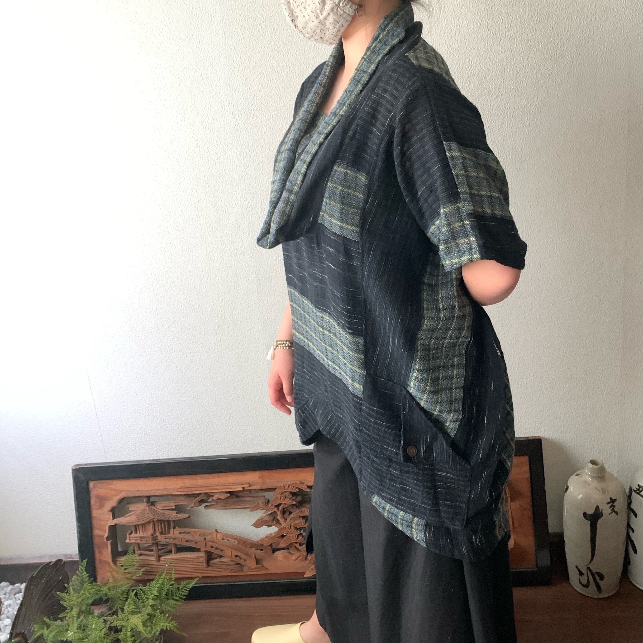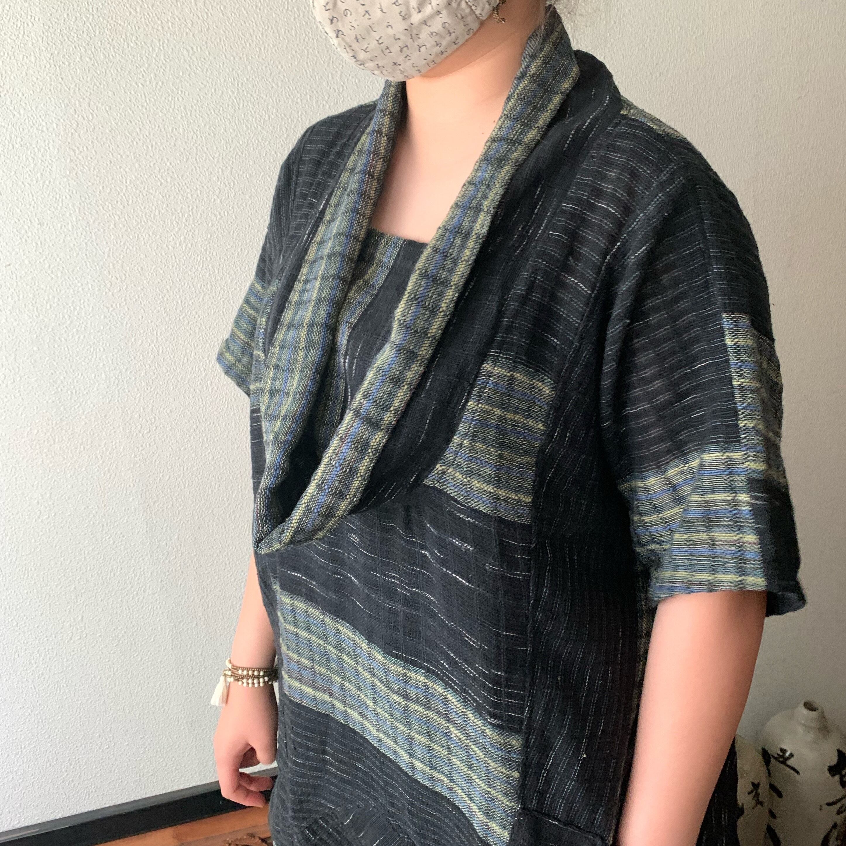 贅沢に織り向きを切替えたコクーンシルエットの手織綿チュニックブラウス 細身な方からふくよかな方まで 黒グレイ絣