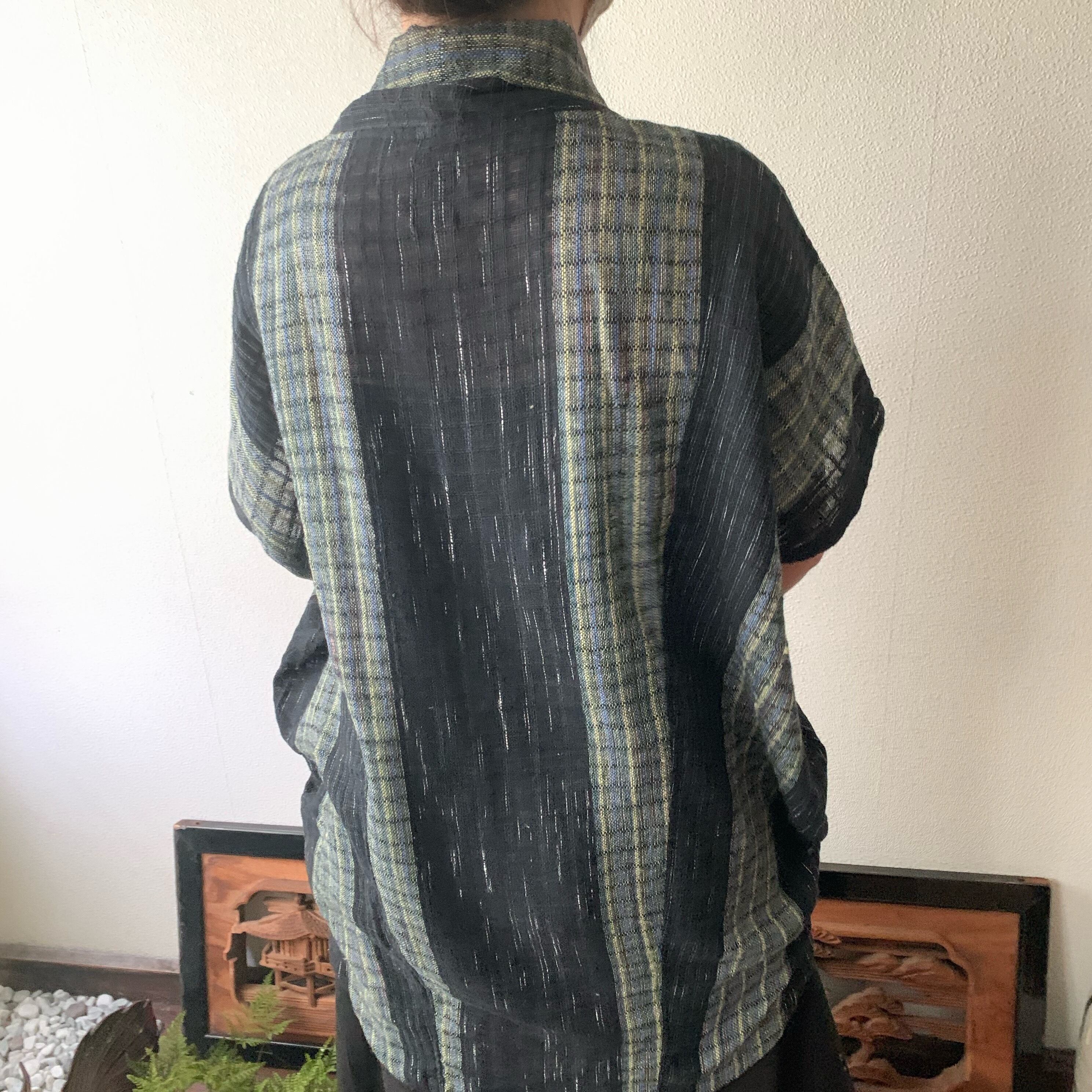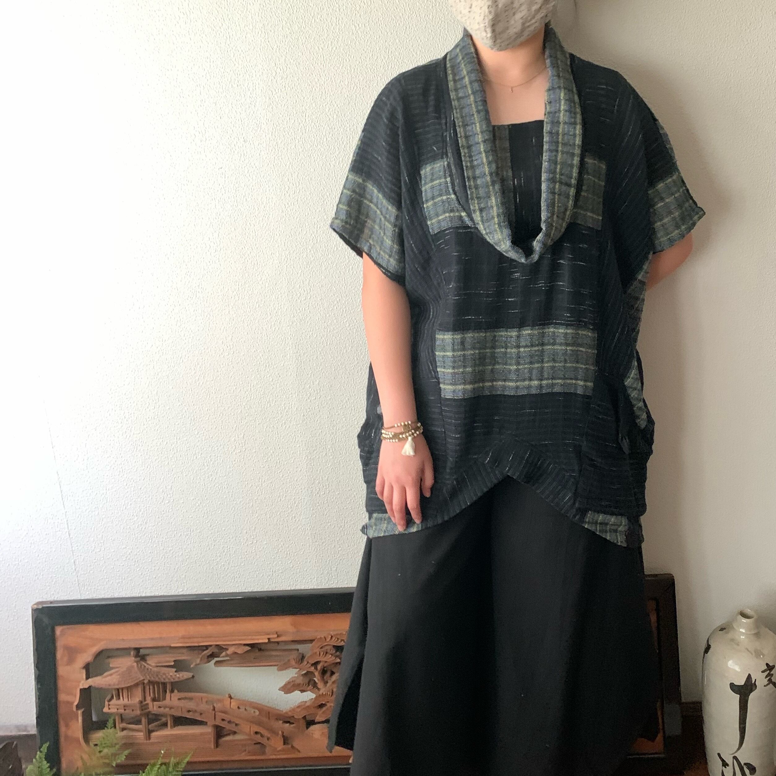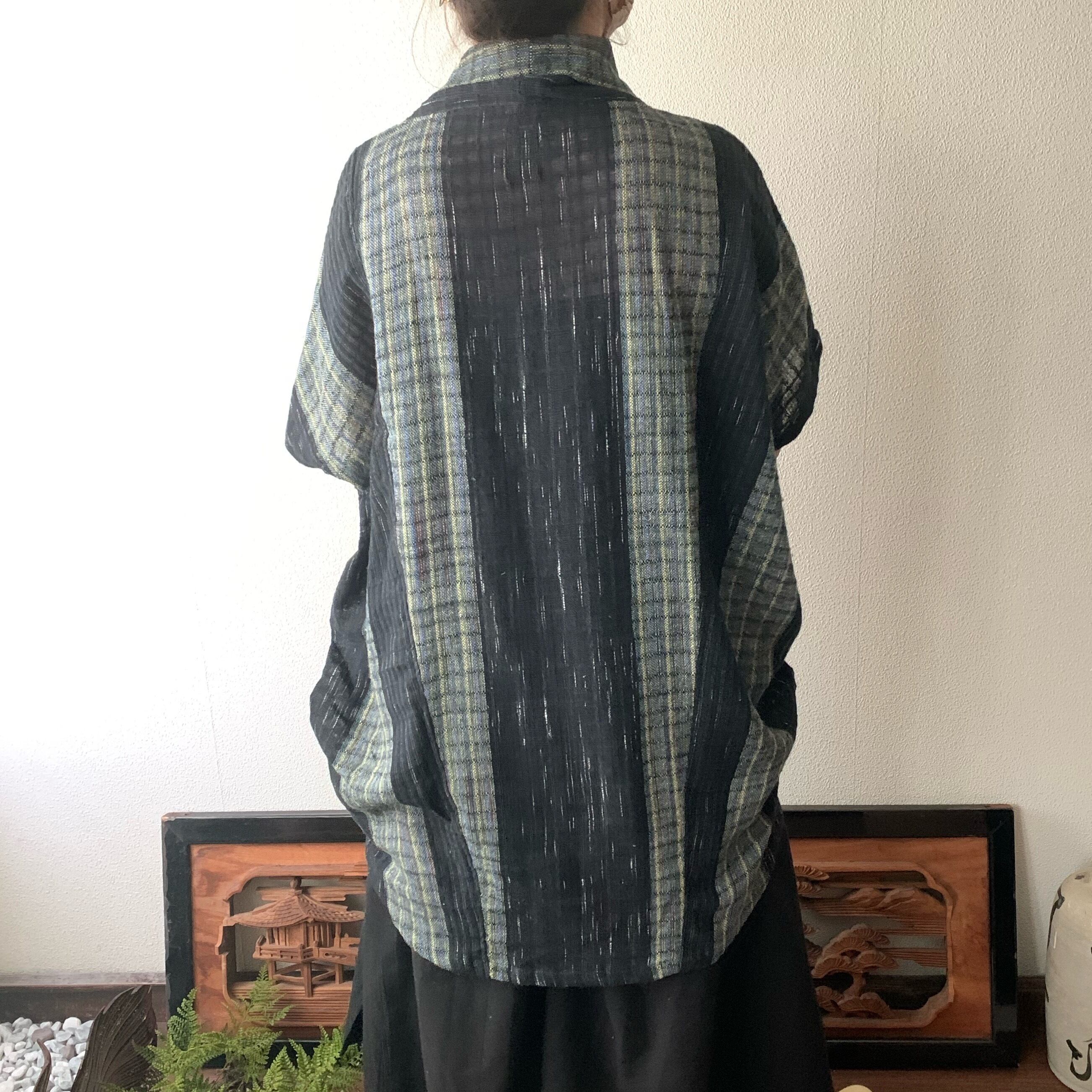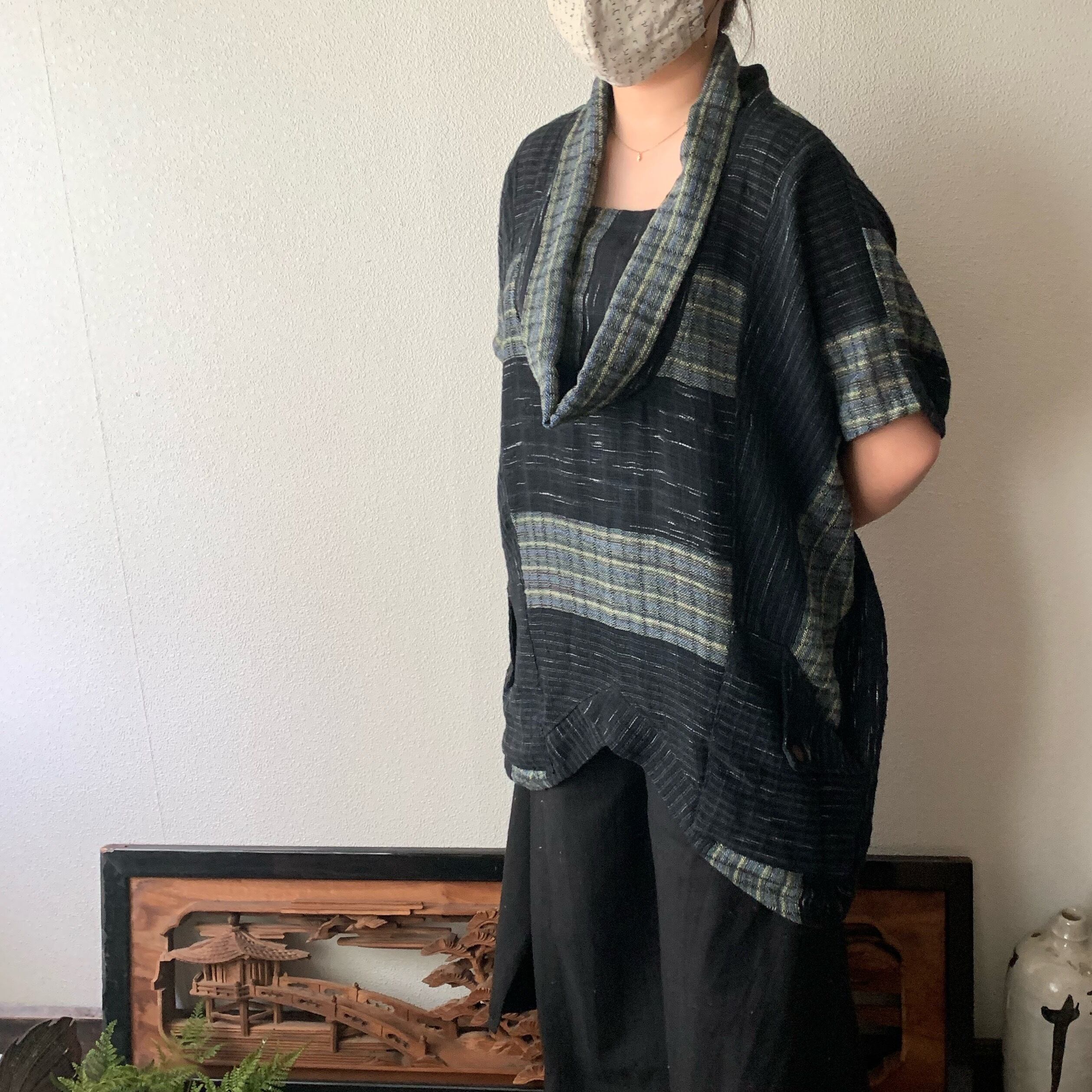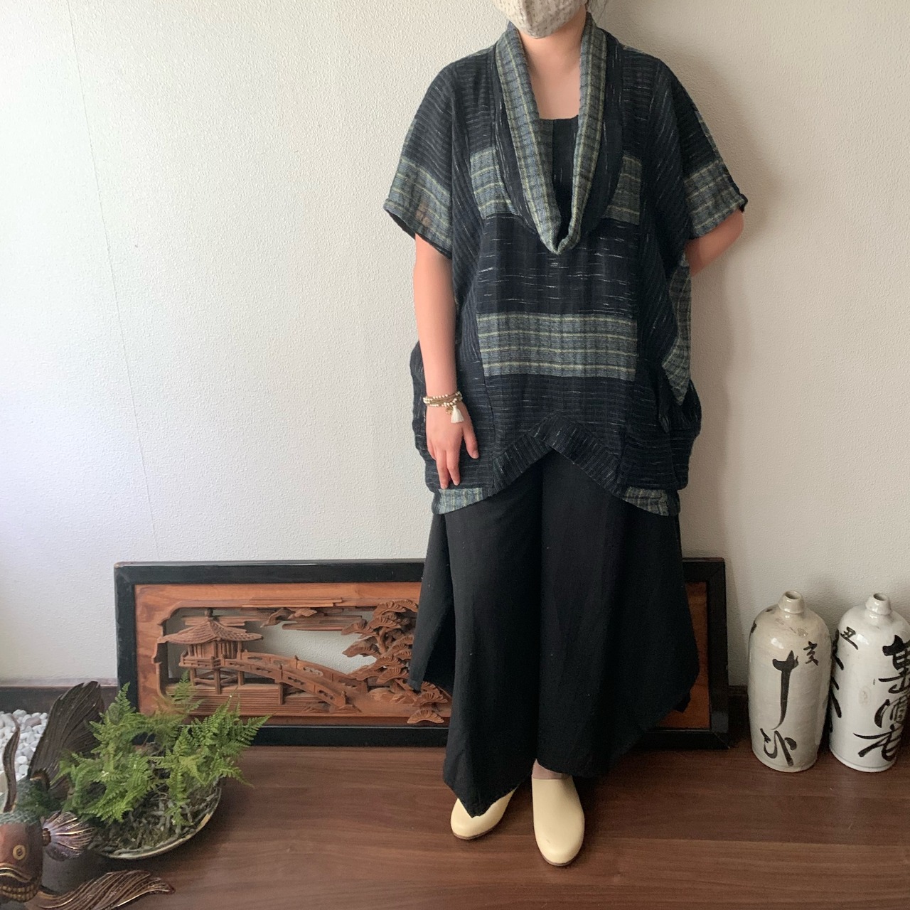 贅沢に織り向きを切替えたコクーンシルエットの手織綿チュニックブラウス 細身な方からふくよかな方まで 黒グレイ絣