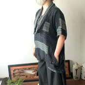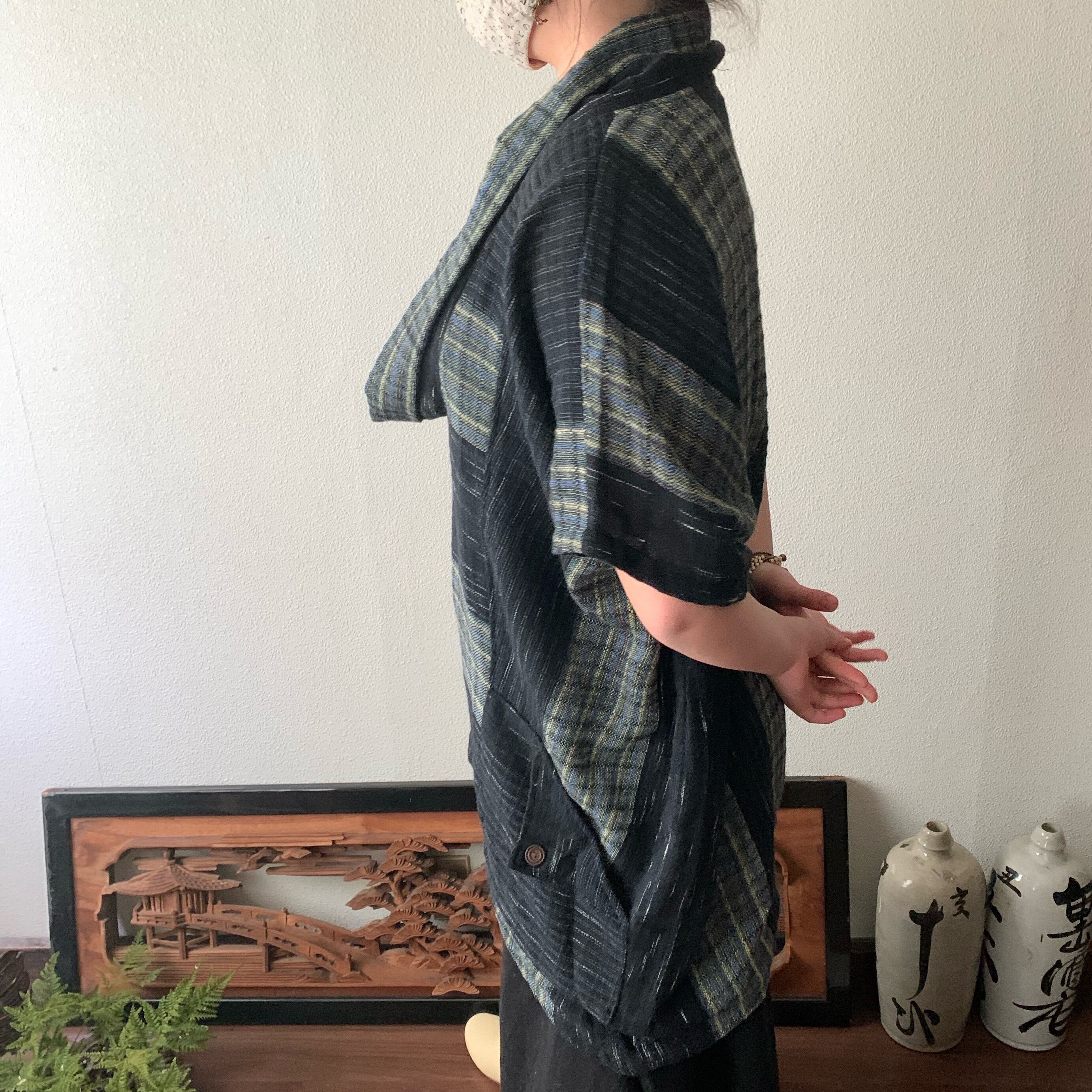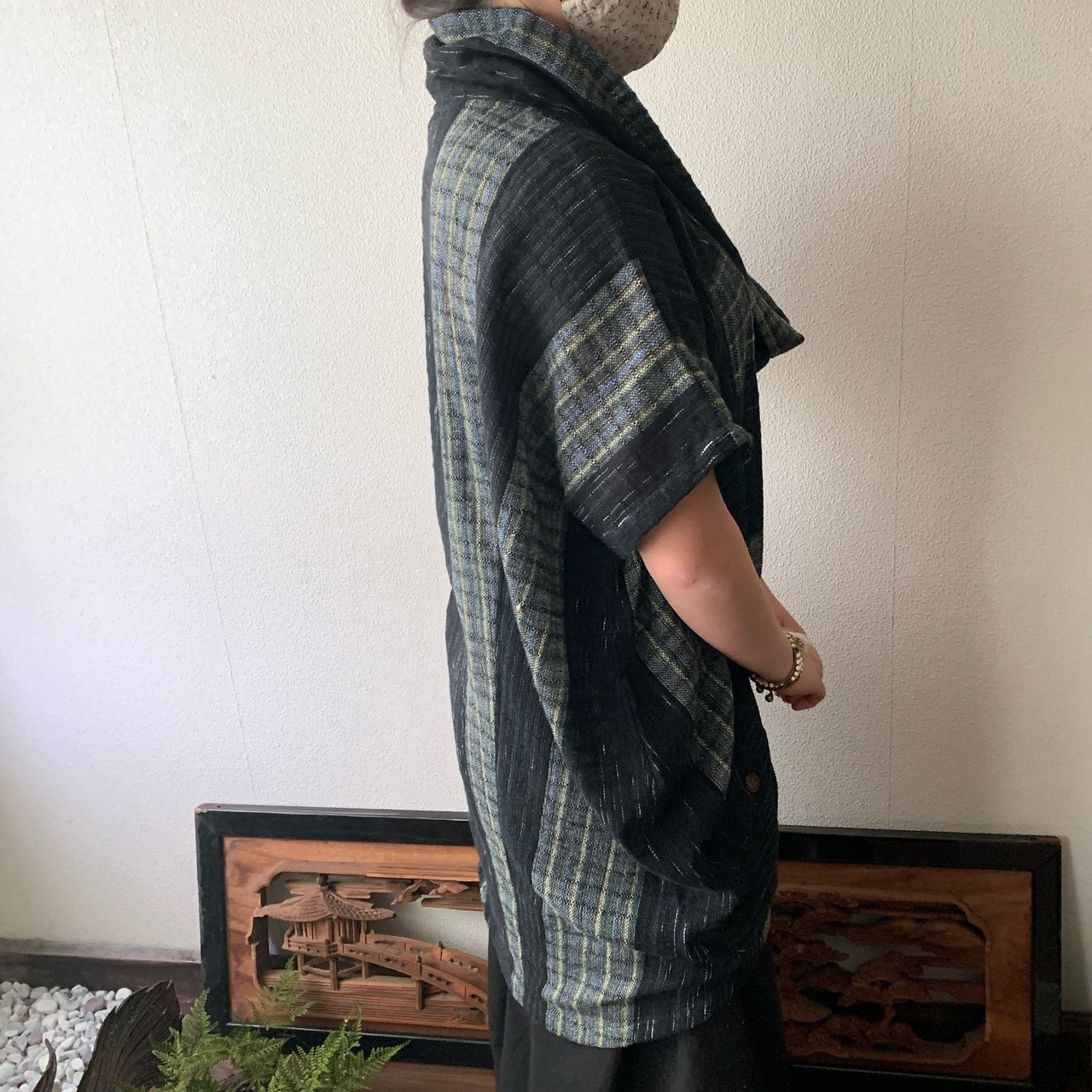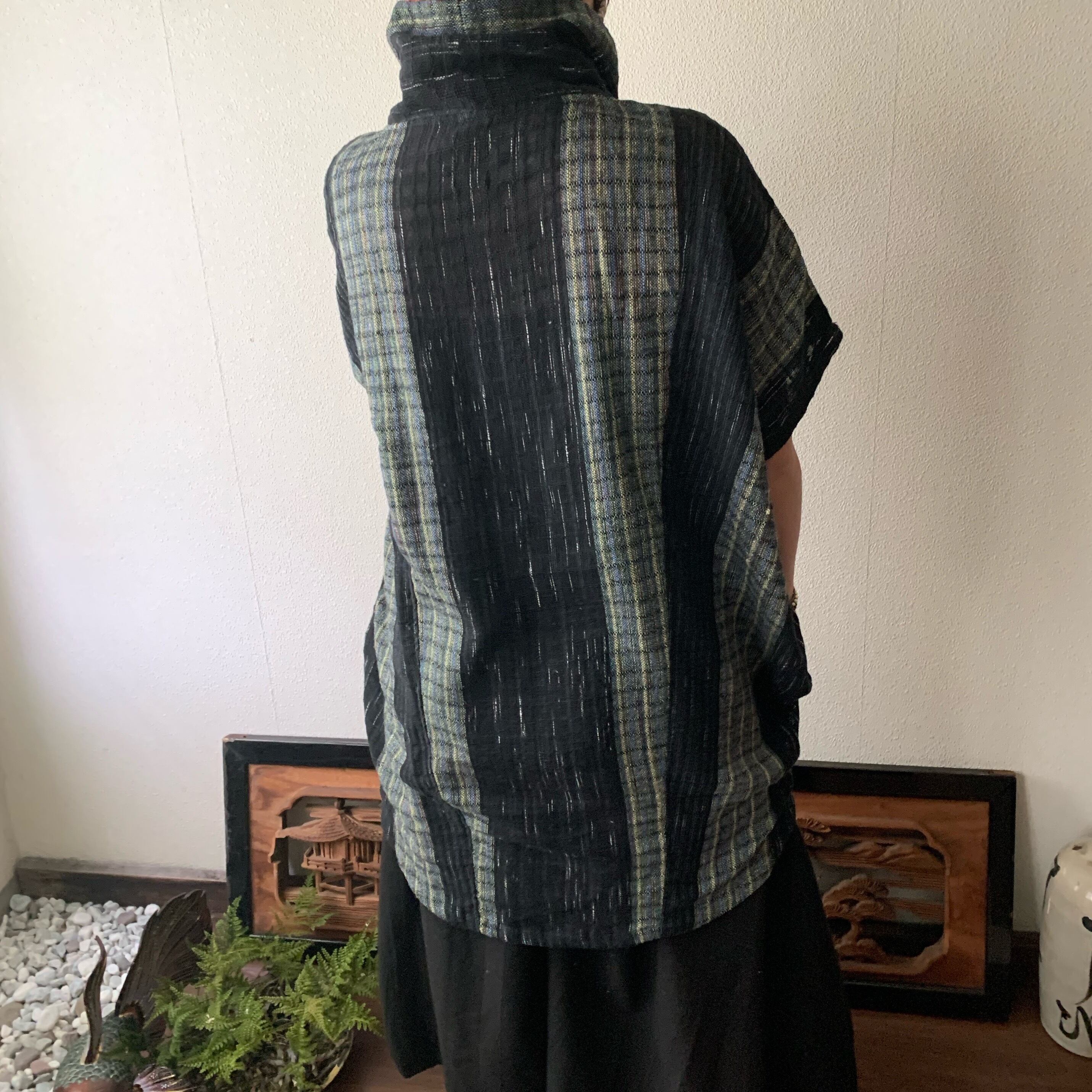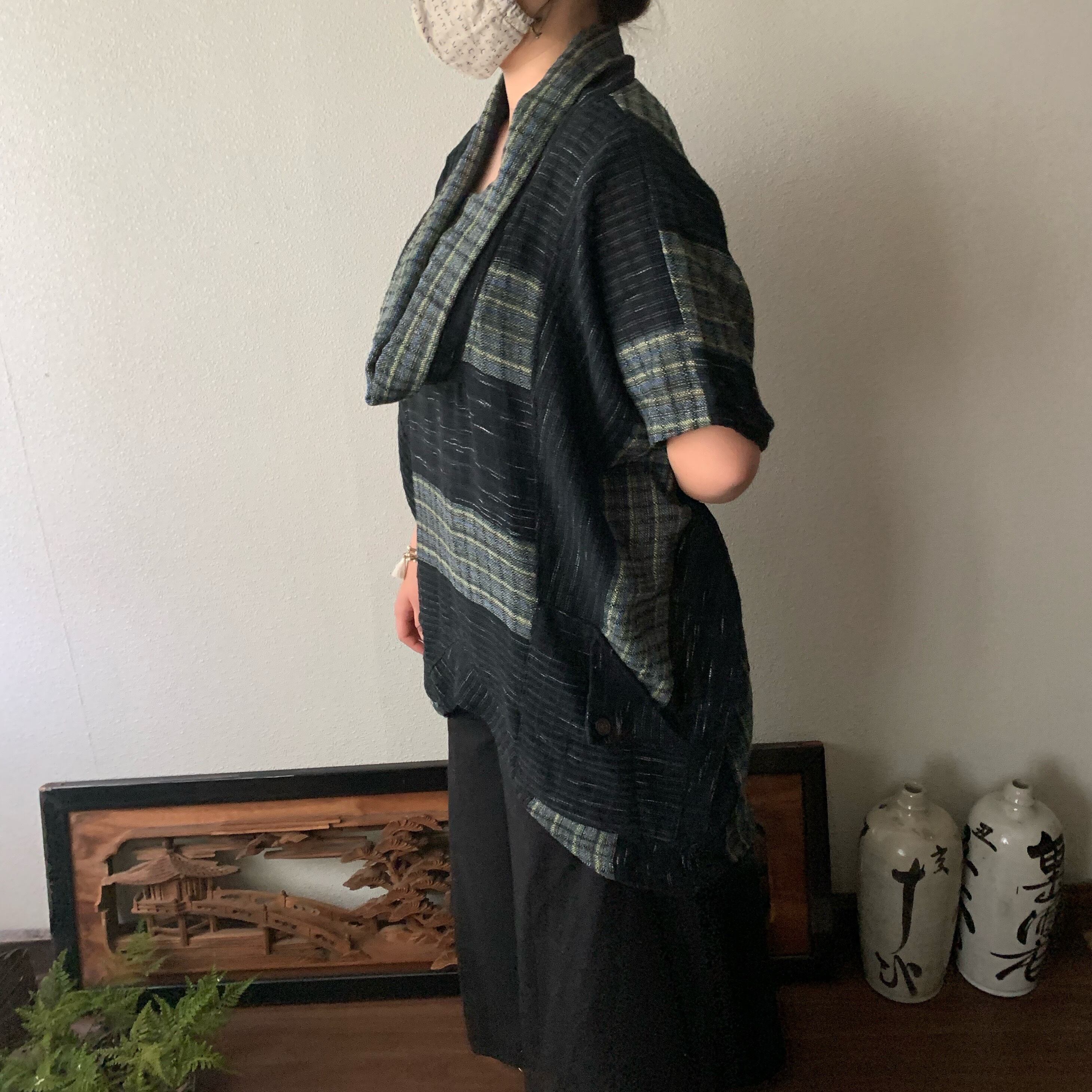 贅沢に織り向きを切替えたコクーンシルエットの手織綿チュニックブラウス 細身な方からふくよかな方まで 黒グレイ絣