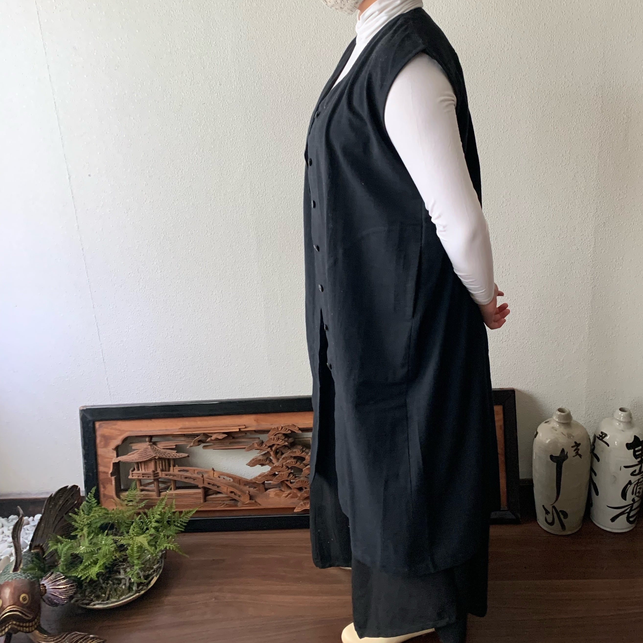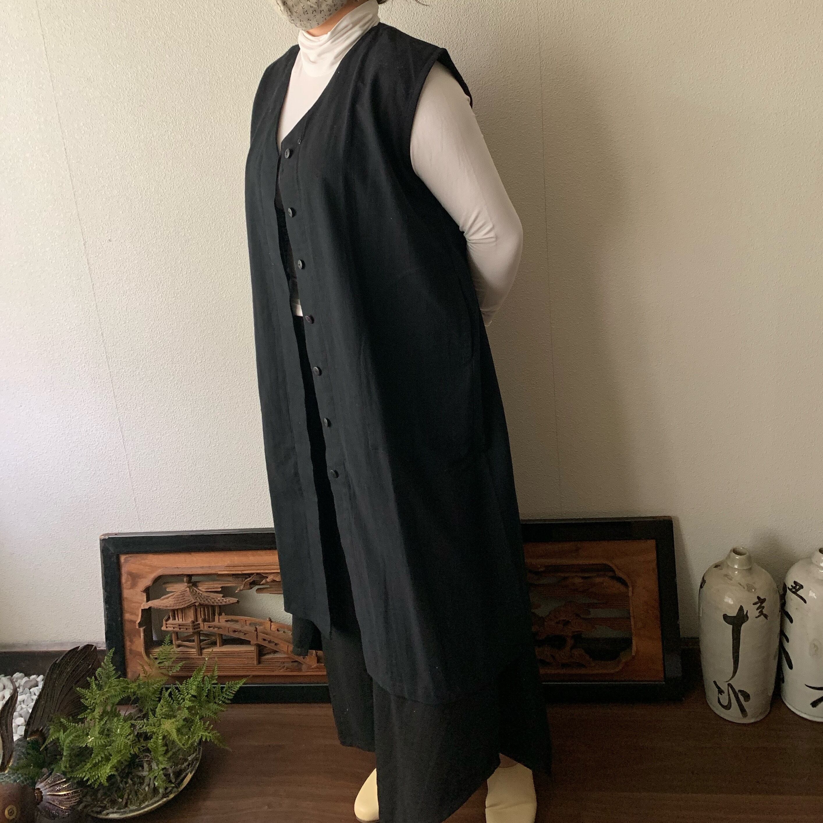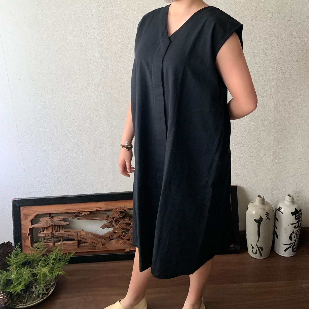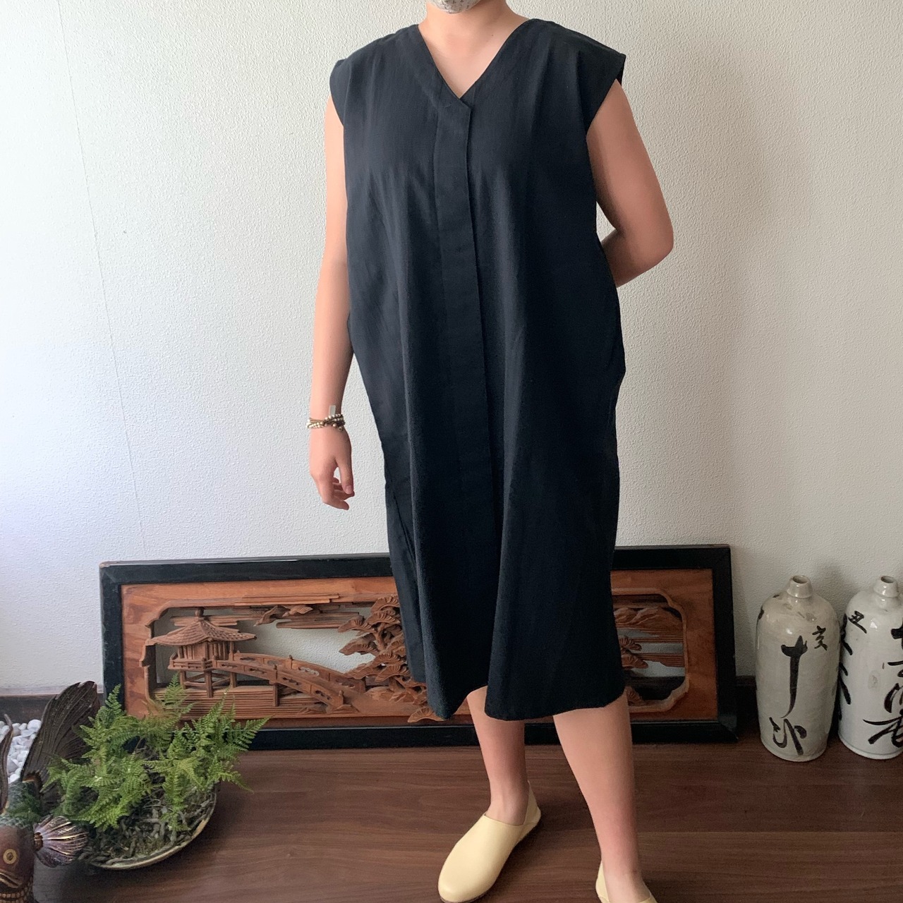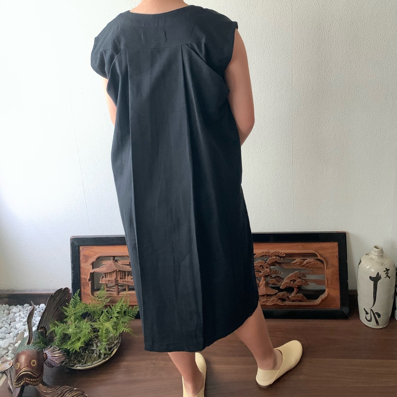 閉じても開けてもかっこいい手織り綿ワンピース シンプルVネックだけど背面タックで遊ぶ 黒無地