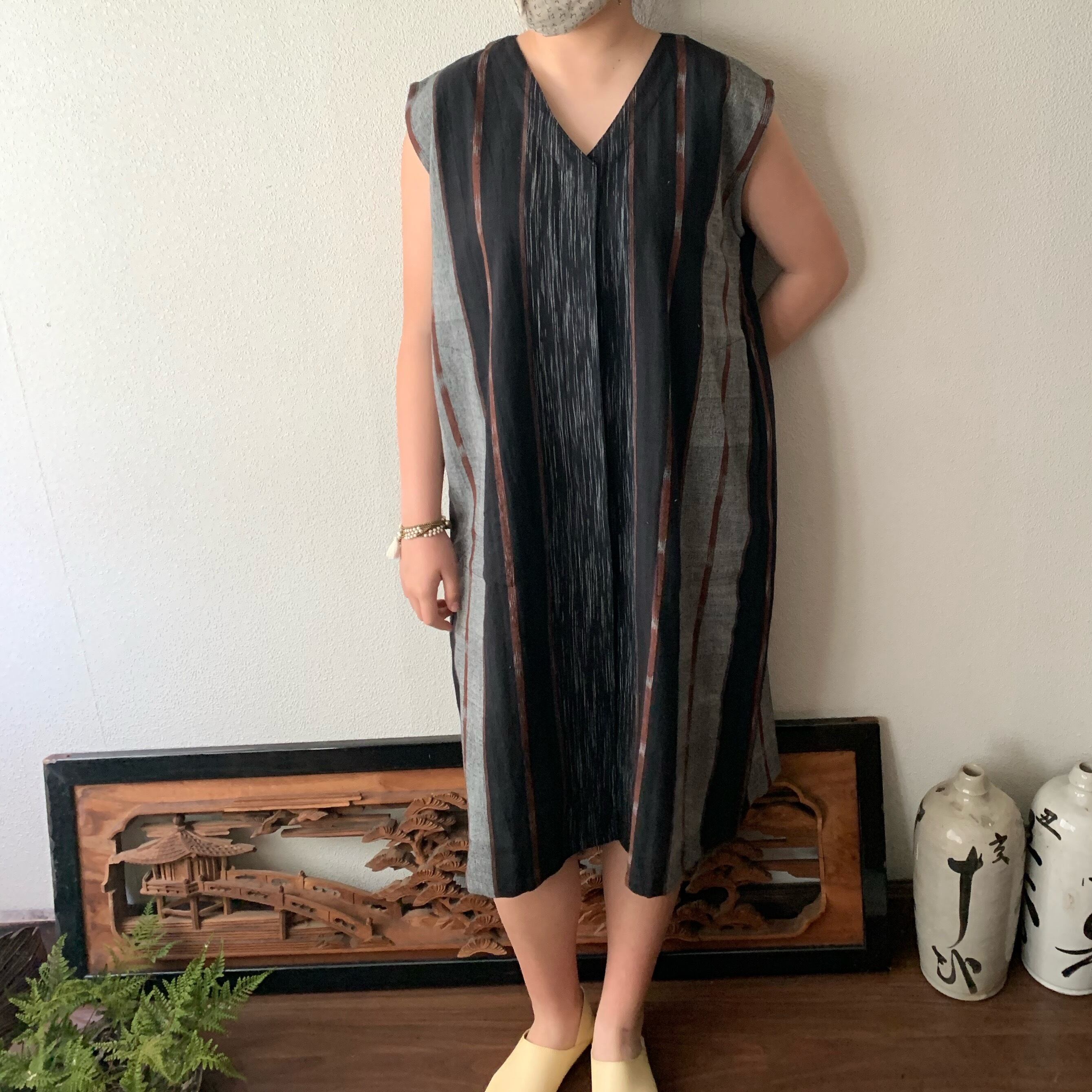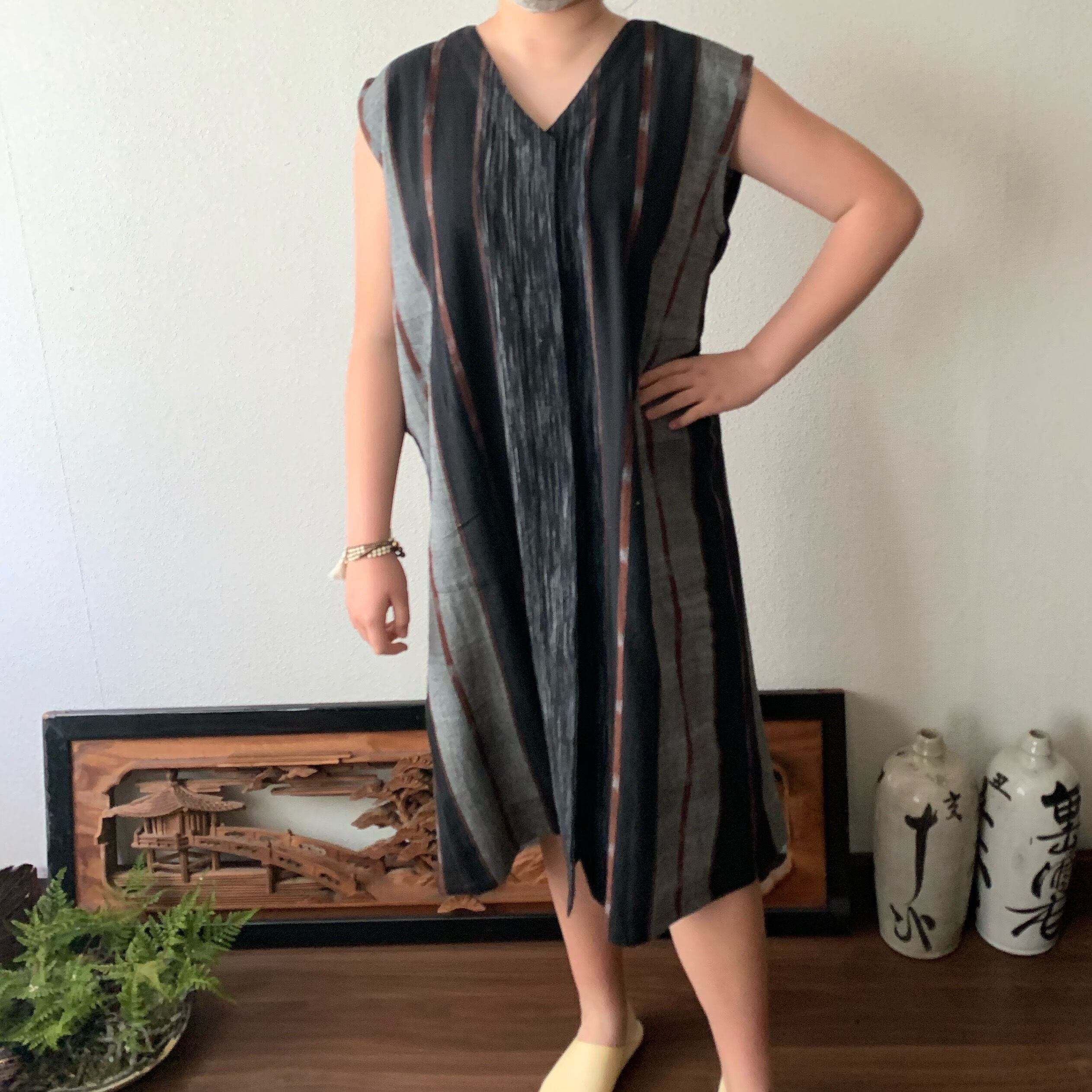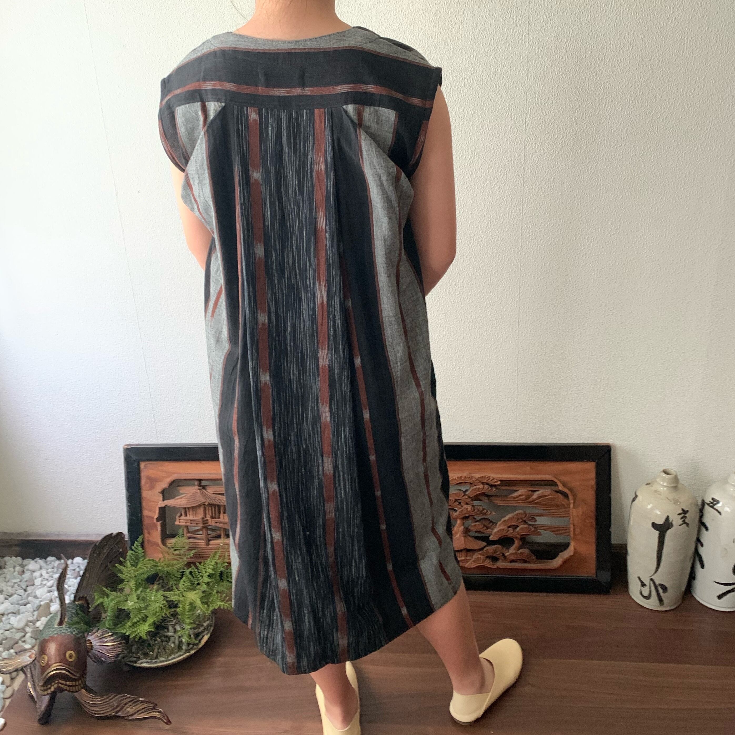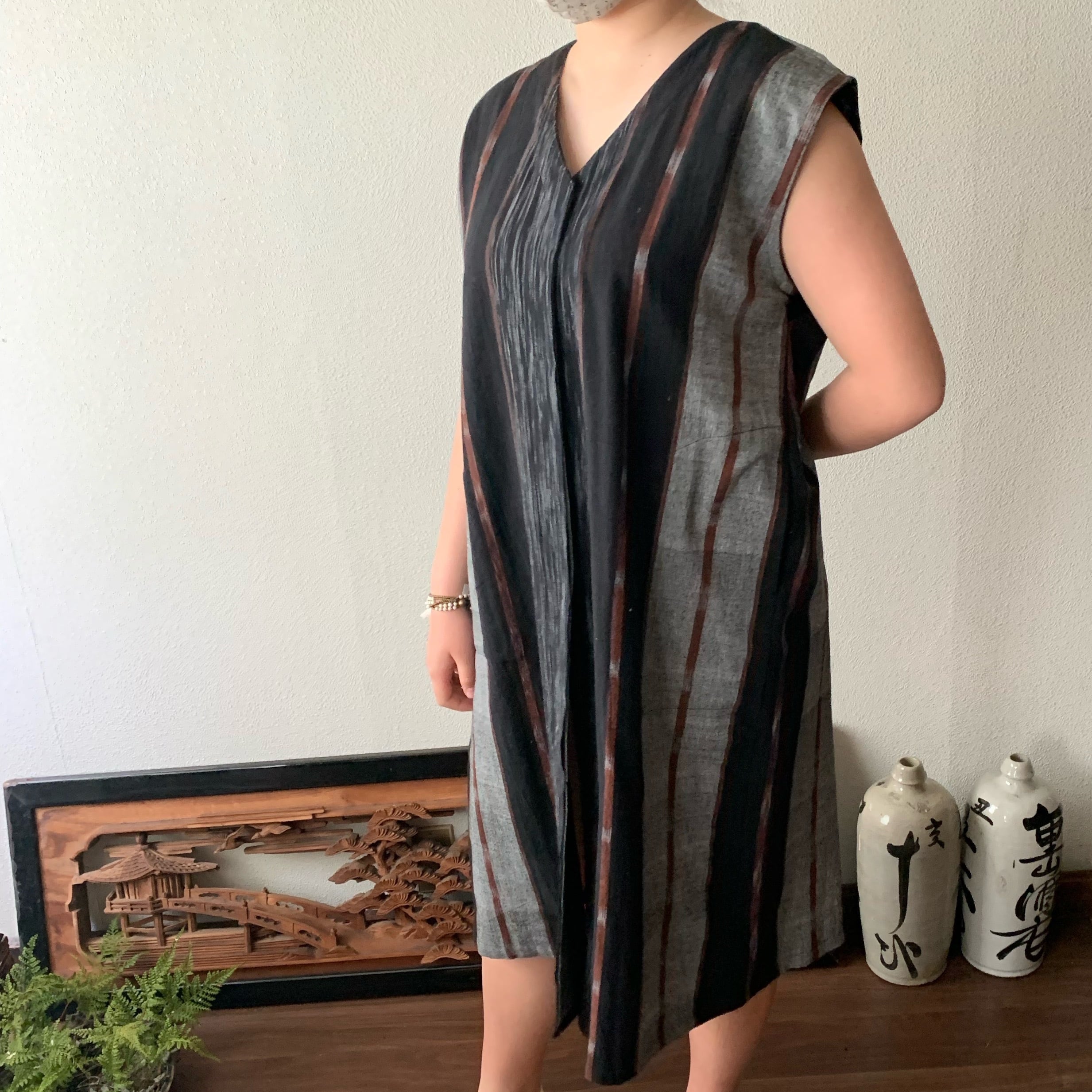 閉じても開けてもかっこいい手織り綿ワンピース シンプルVネックだけど背面タックで遊ぶ 黒茶絣