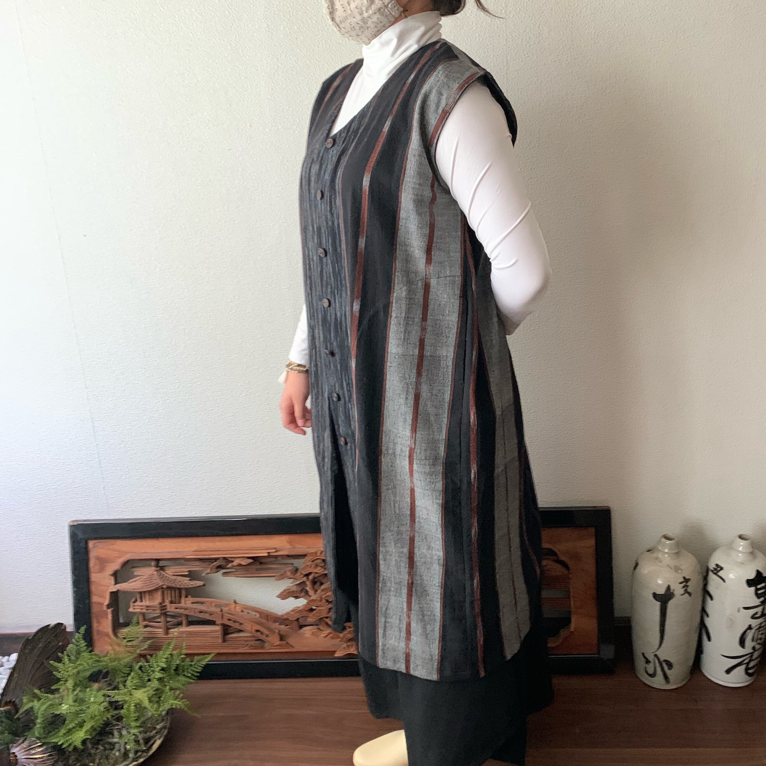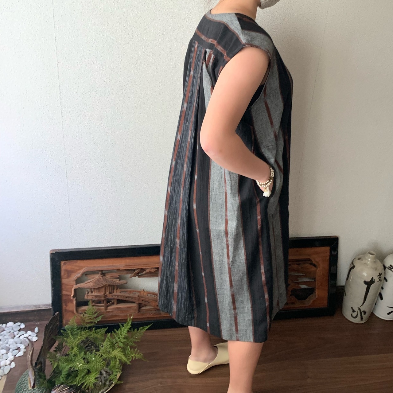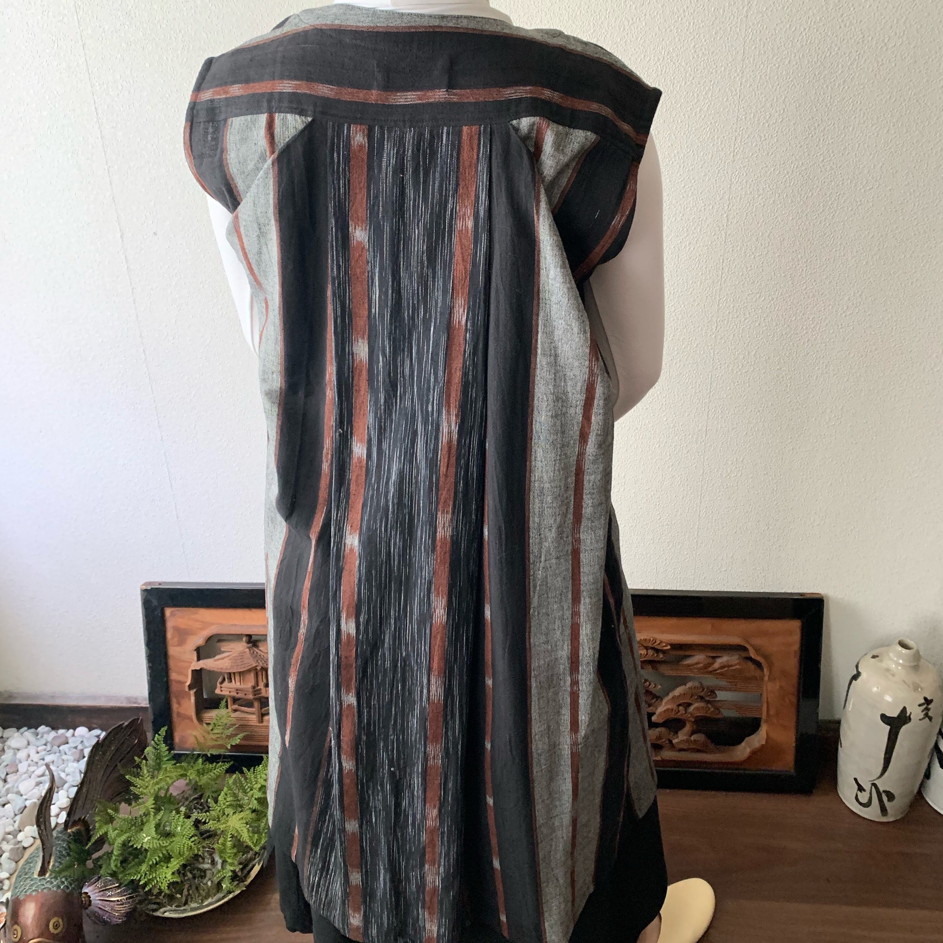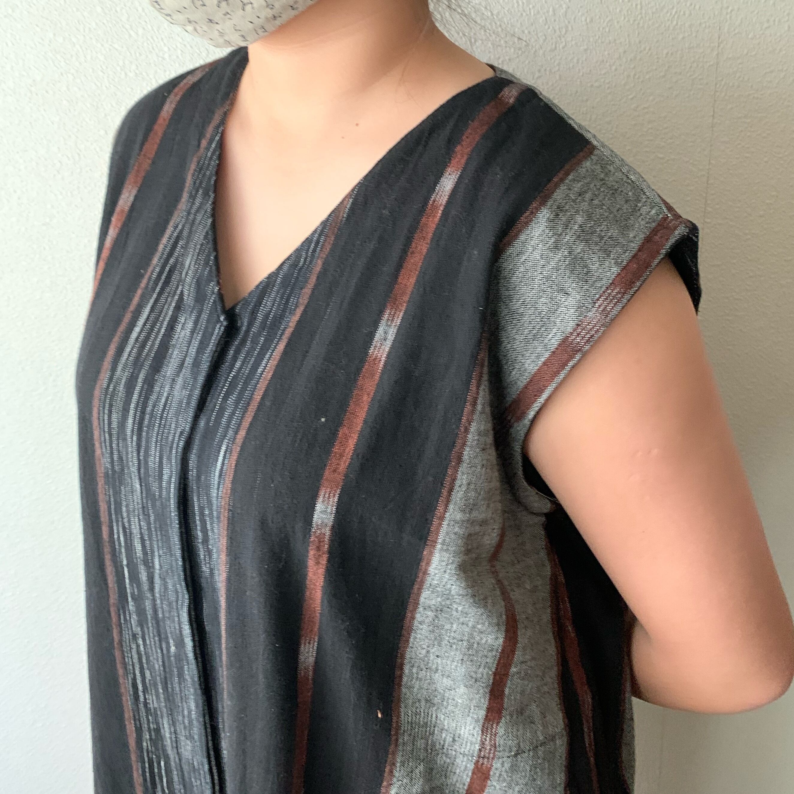 閉じても開けてもかっこいい手織り綿ワンピース シンプルVネックだけど背面タックで遊ぶ 黒茶絣