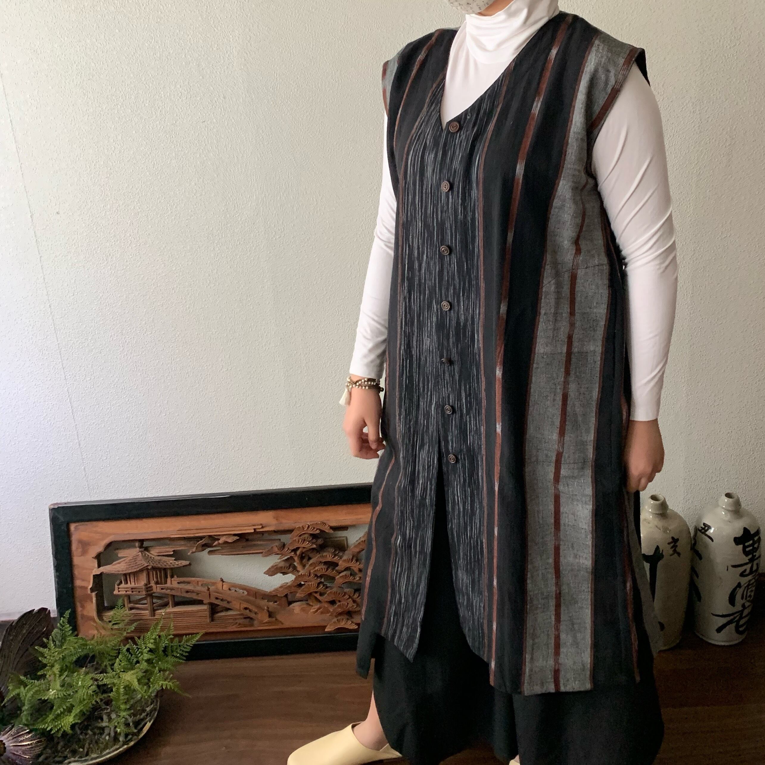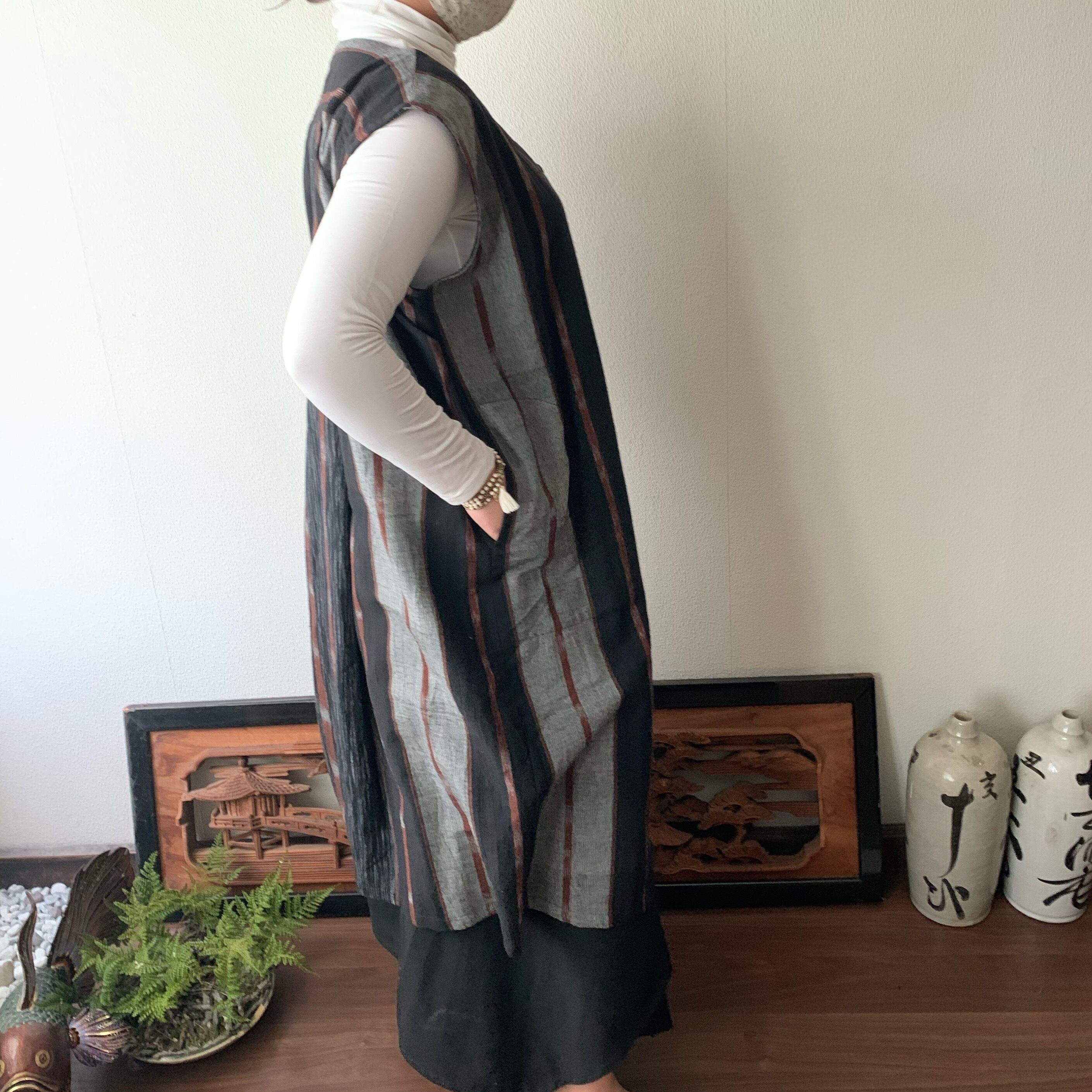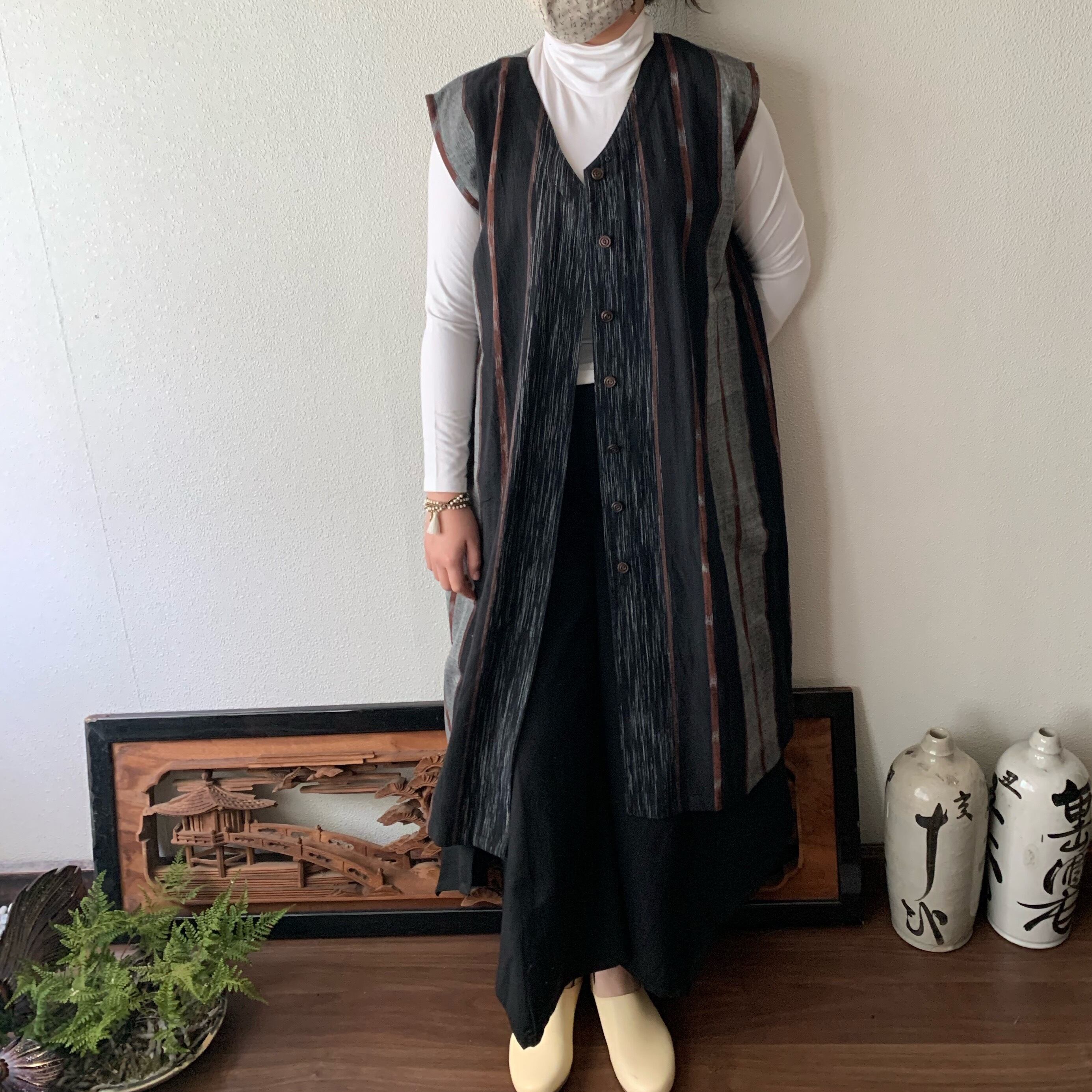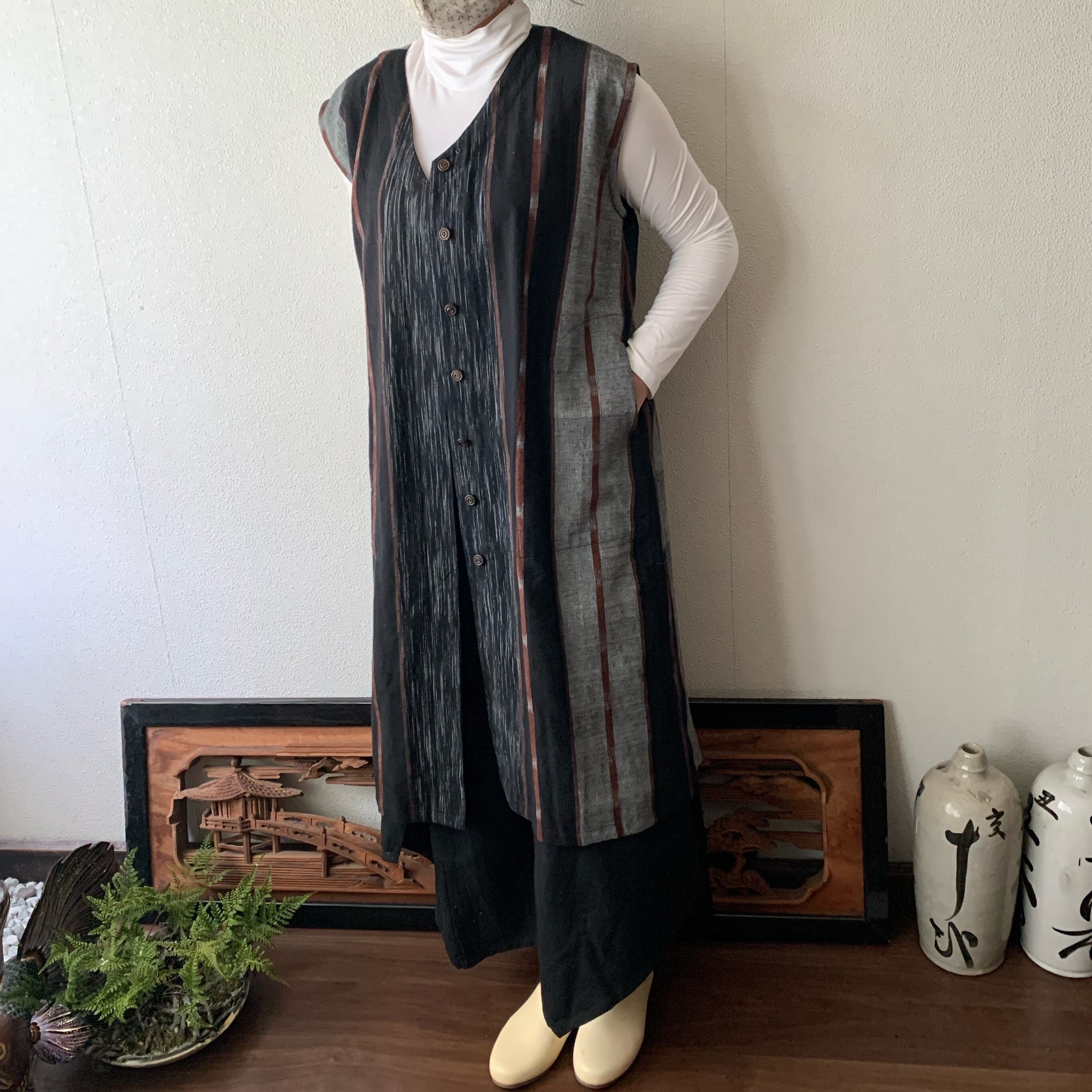 閉じても開けてもかっこいい手織り綿ワンピース シンプルVネックだけど背面タックで遊ぶ 黒茶絣