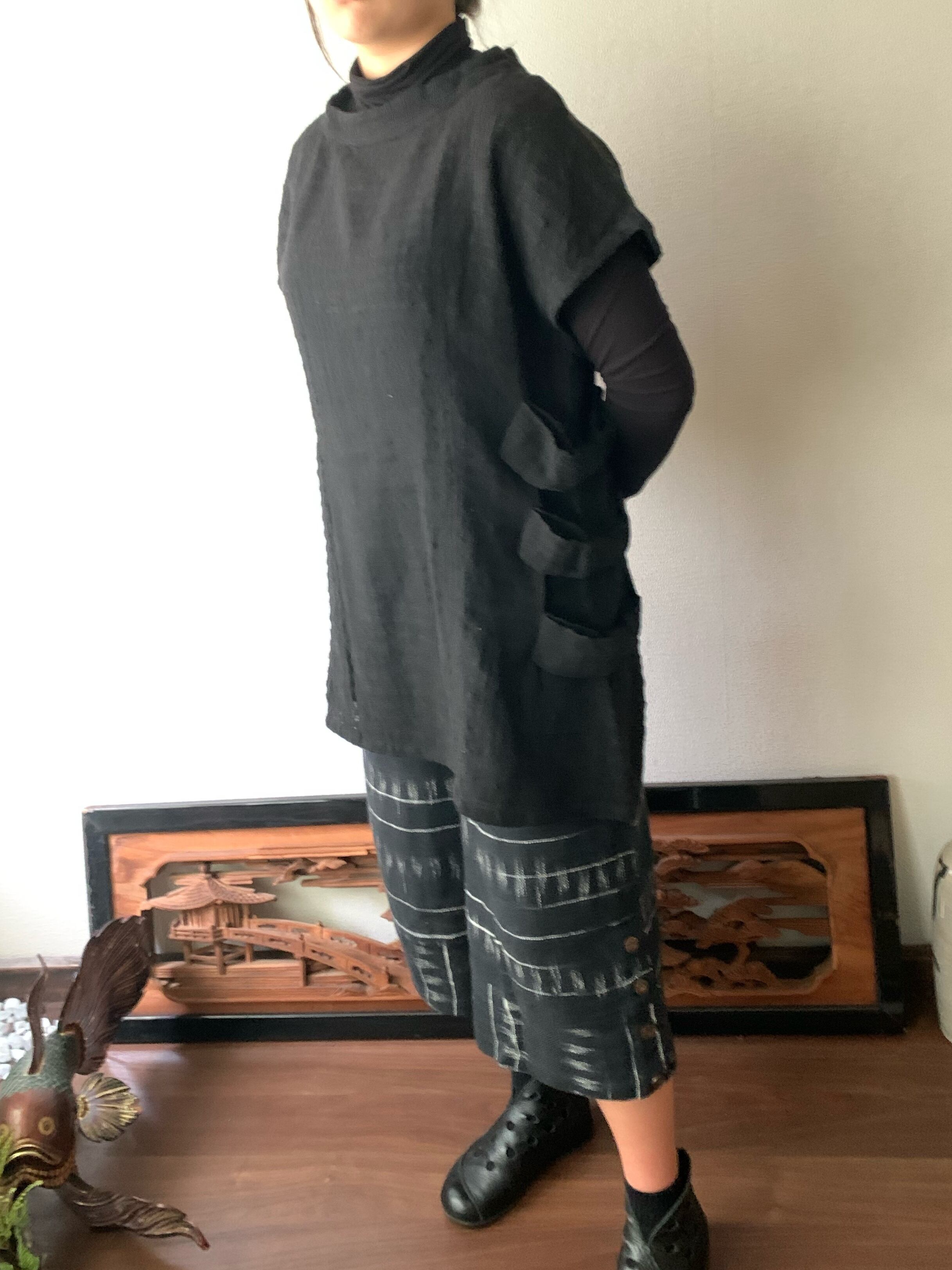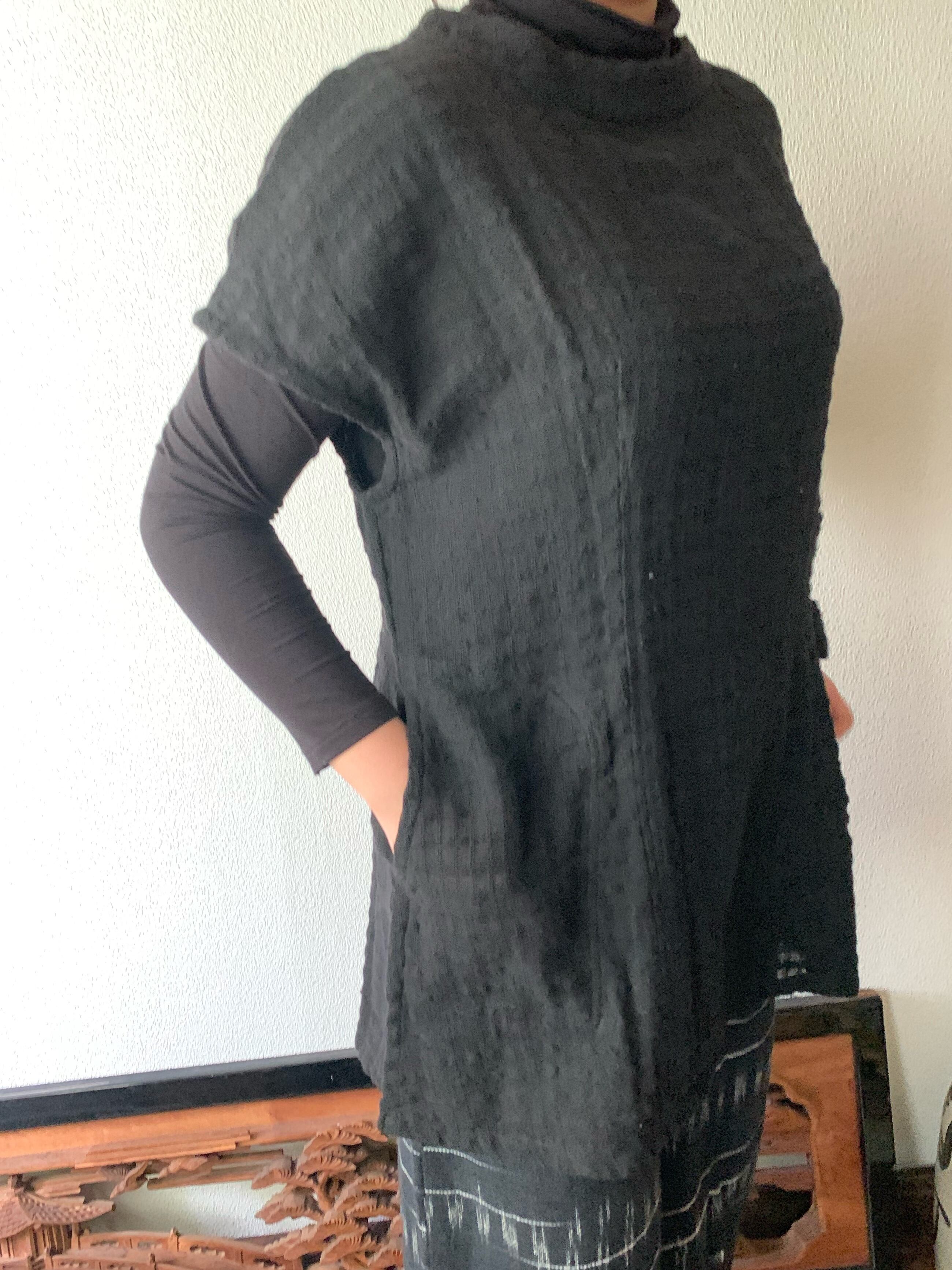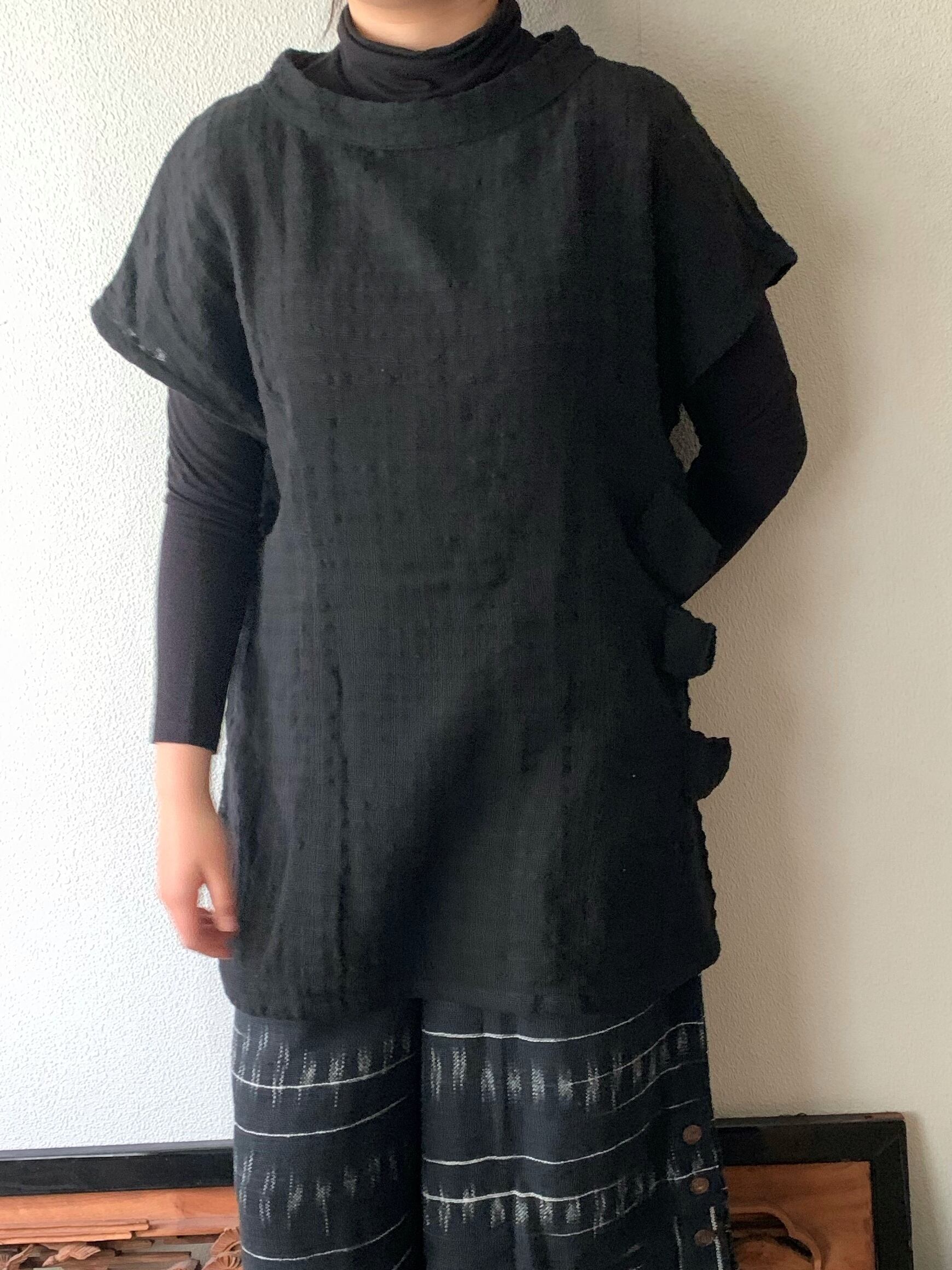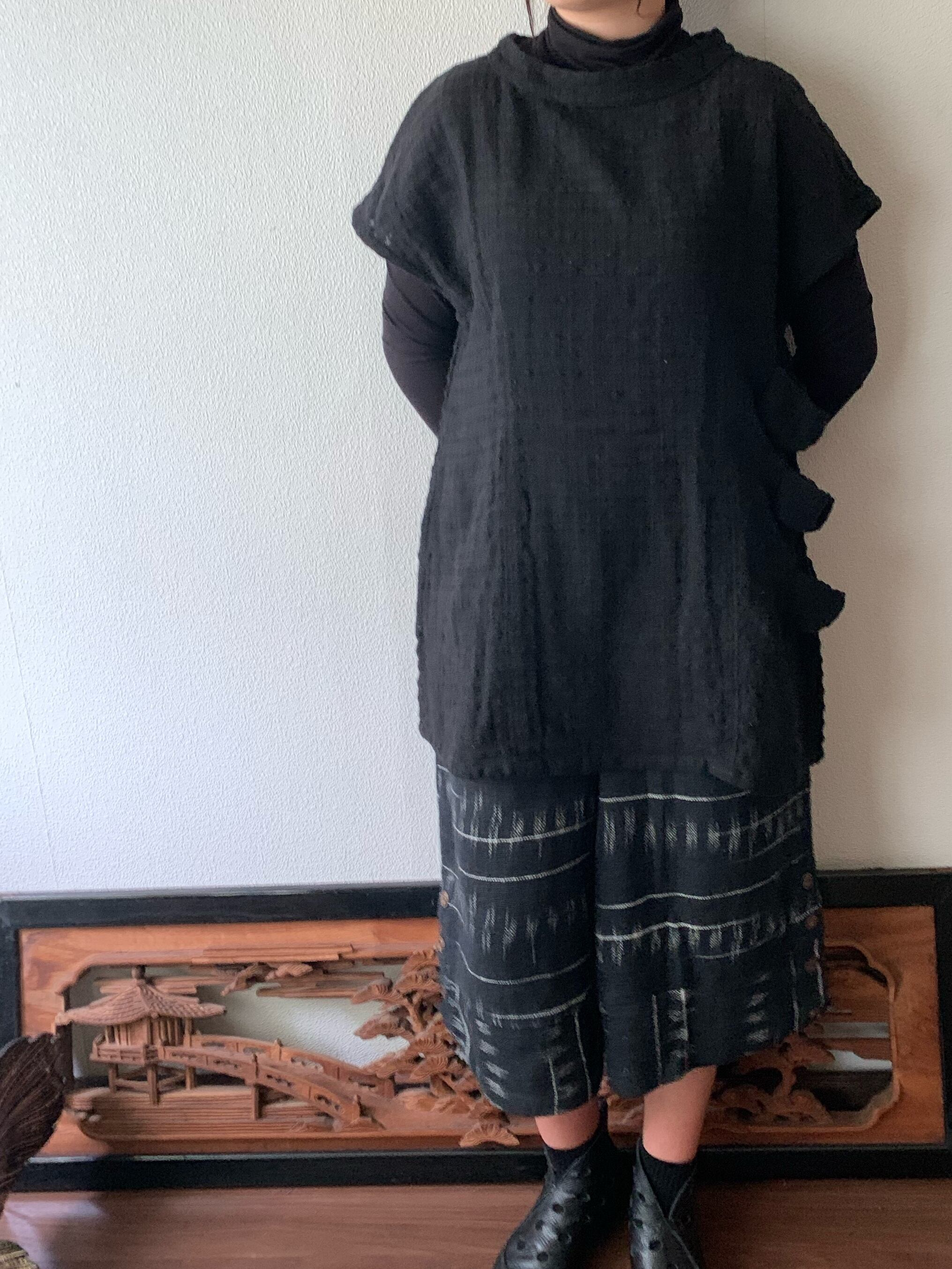 『手織り綿のアシンメトリーチュニック 片サイドリボンで可愛くエレガントに 黒無地』