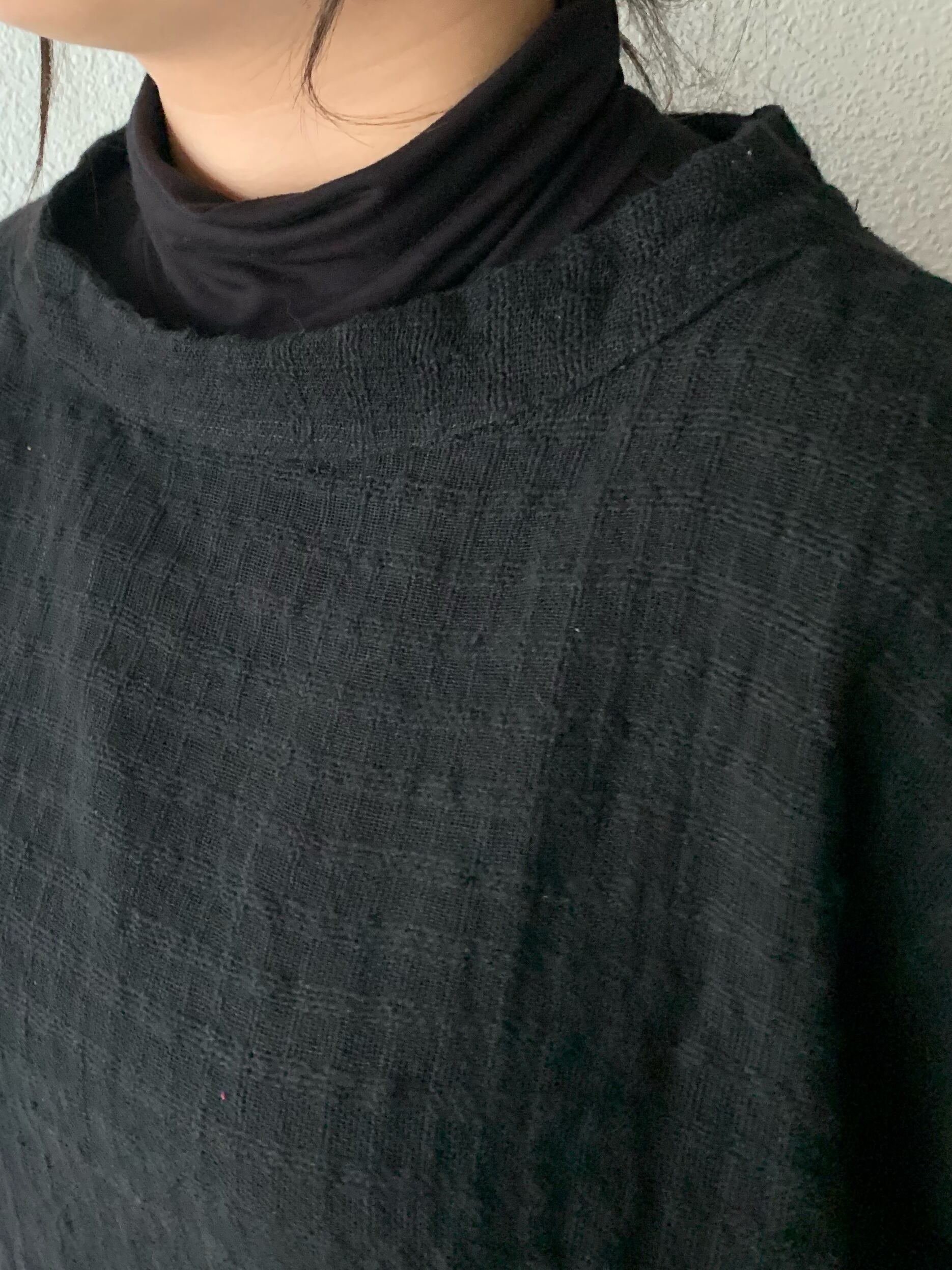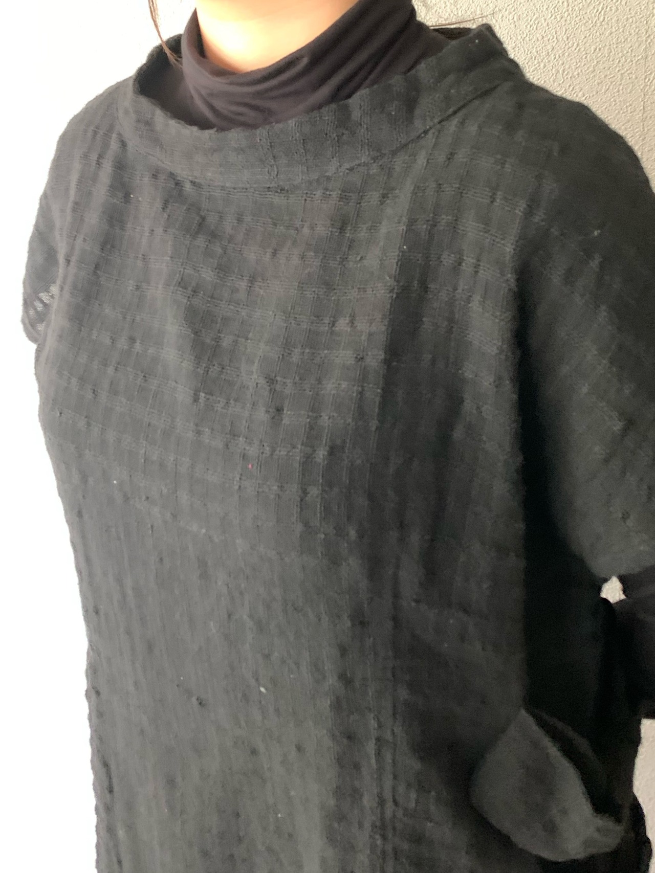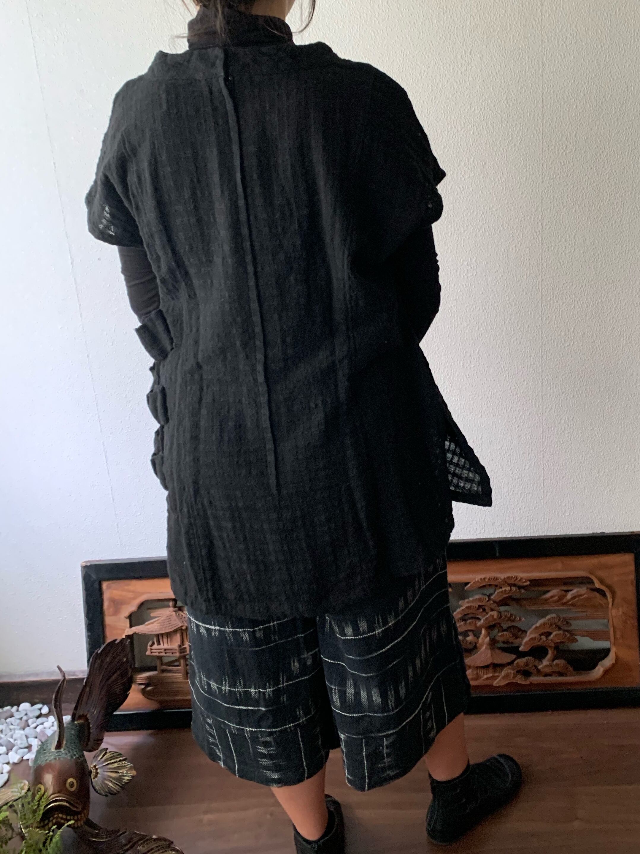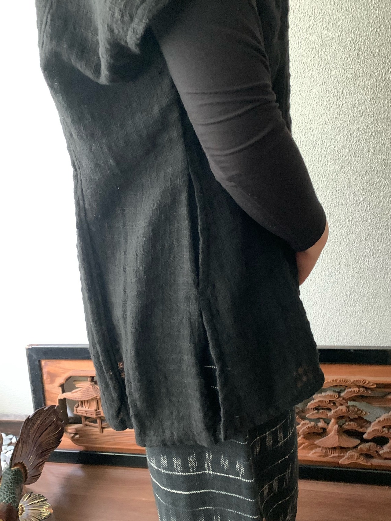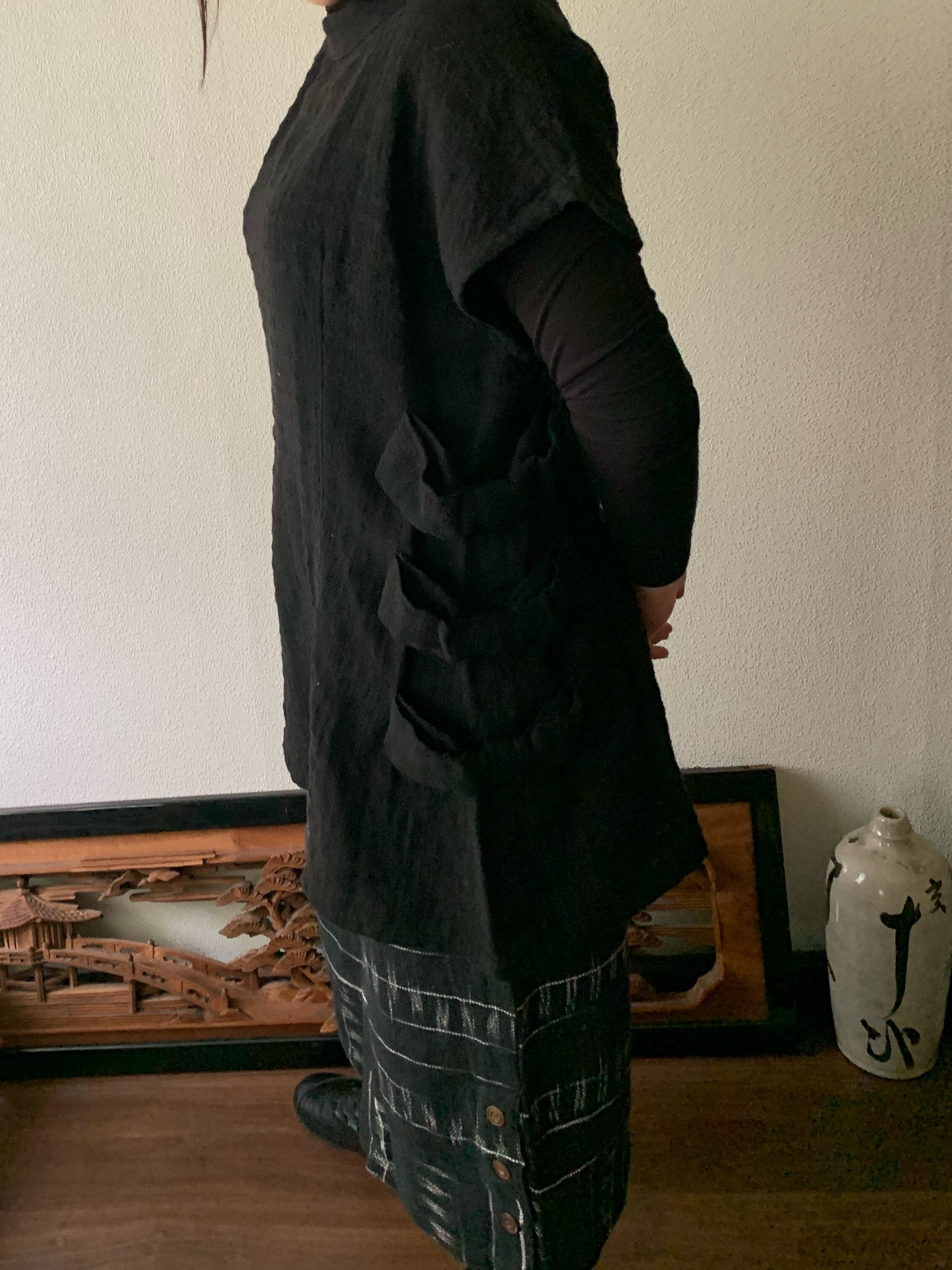 『手織り綿のアシンメトリーチュニック 片サイドリボンで可愛くエレガントに 黒無地』