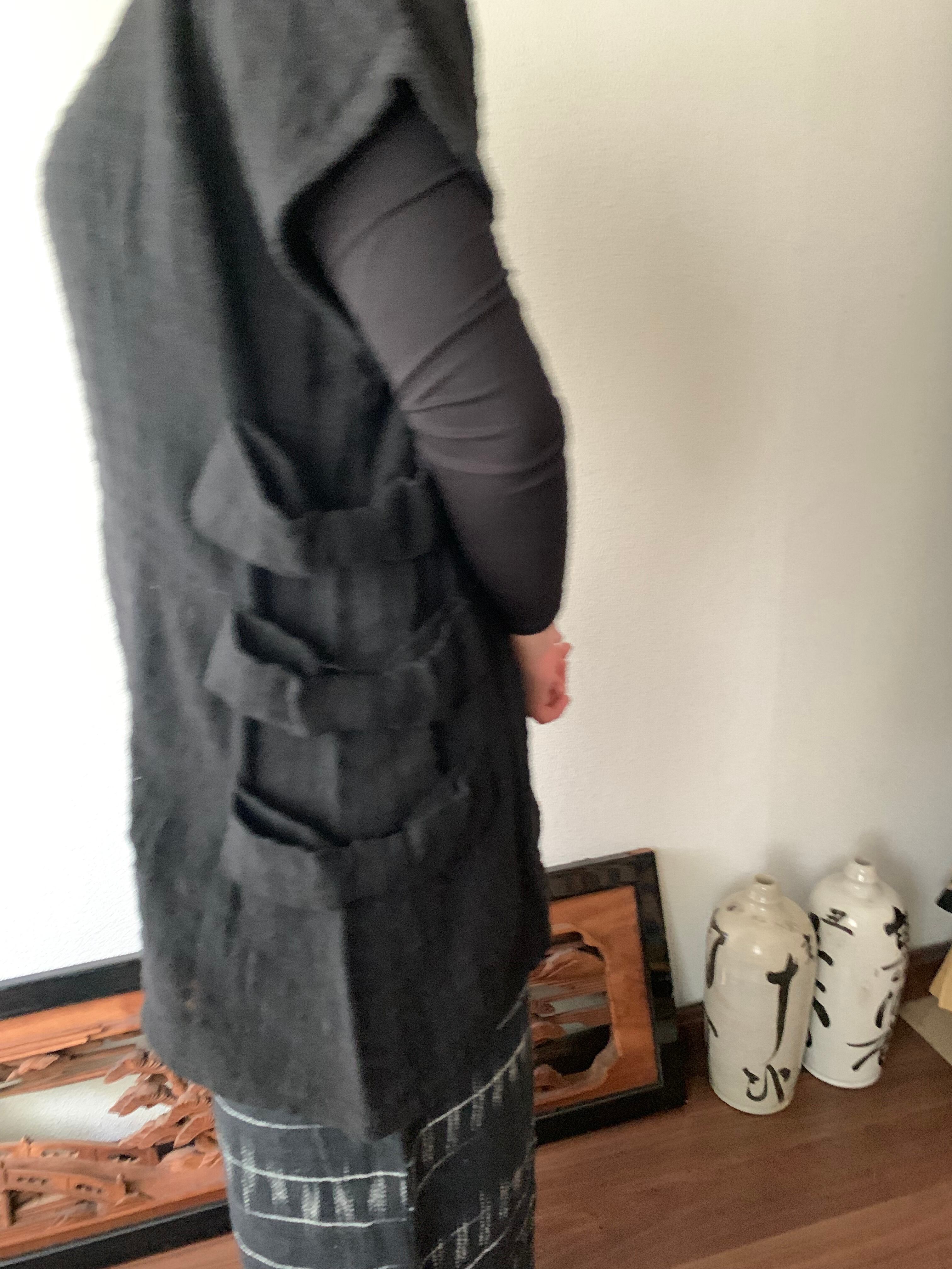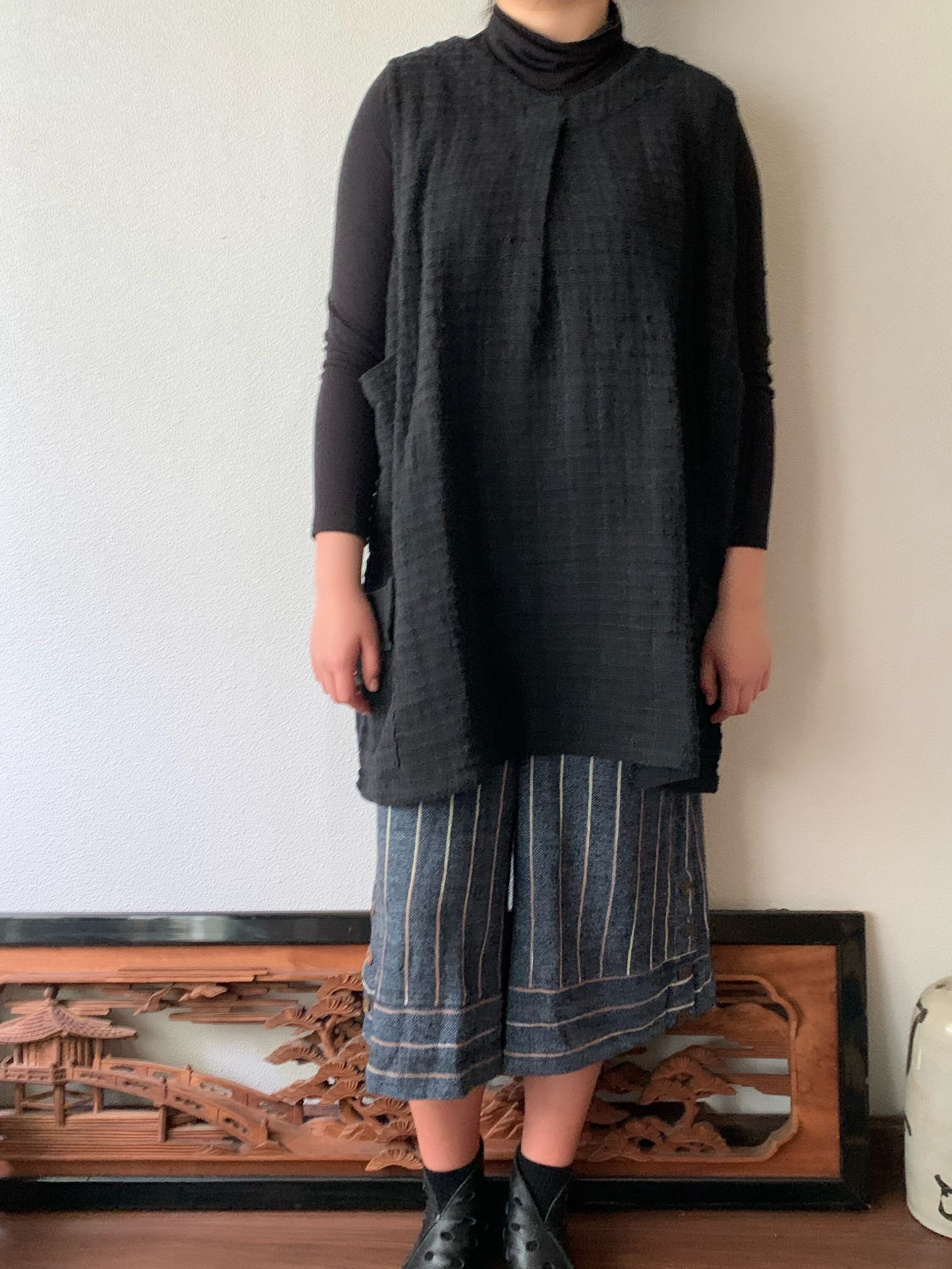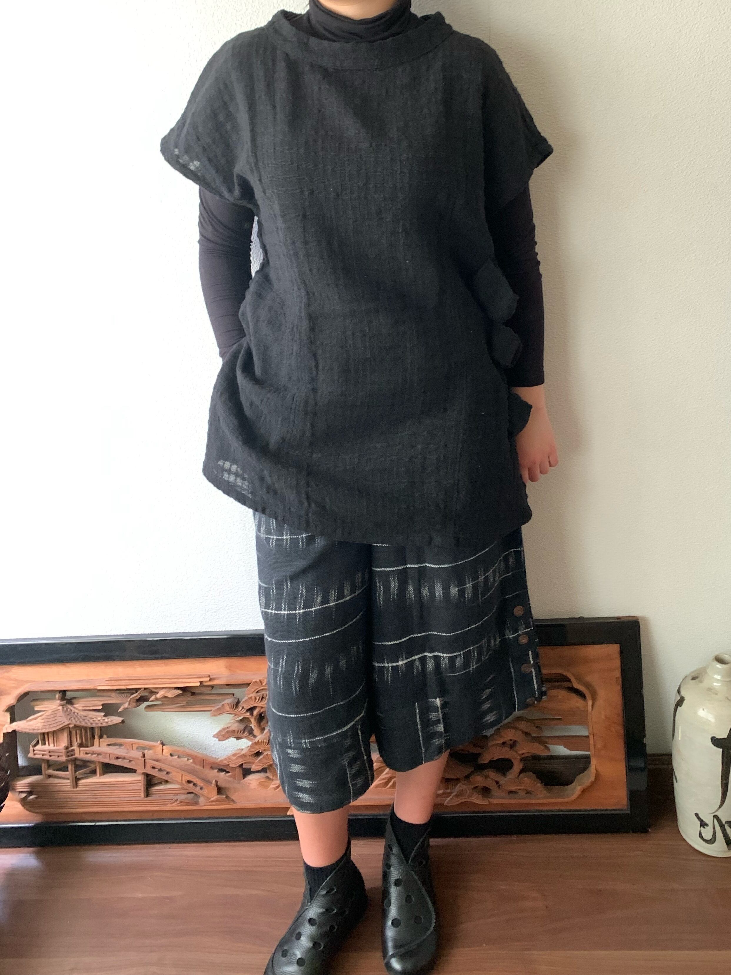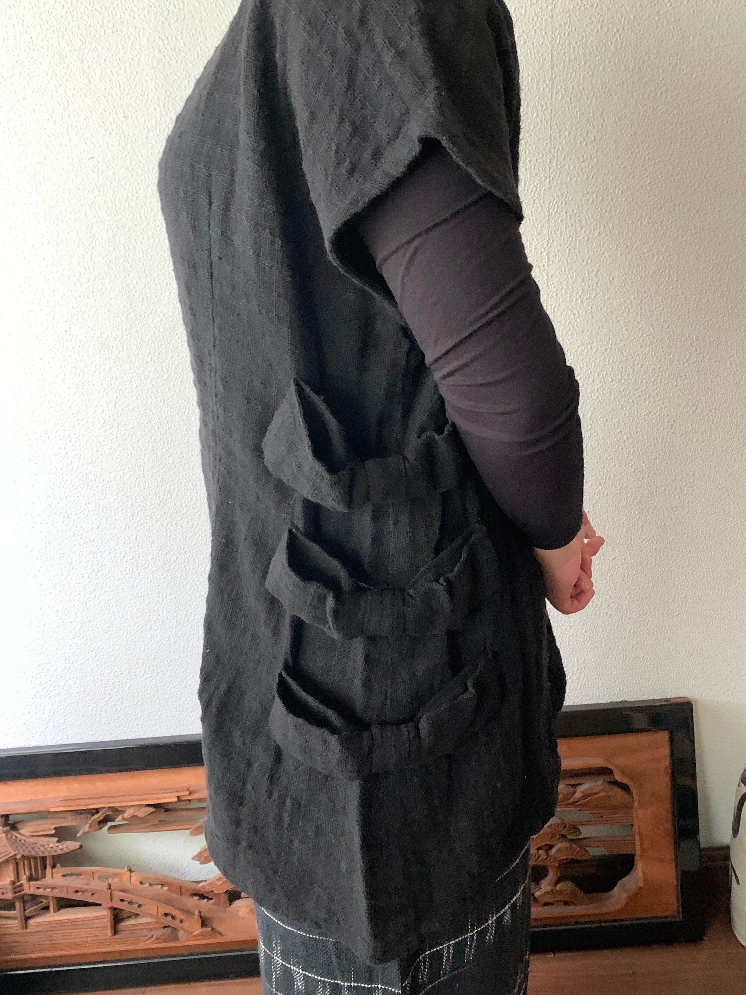 『手織り綿のアシンメトリーチュニック 片サイドリボンで可愛くエレガントに 黒無地』
