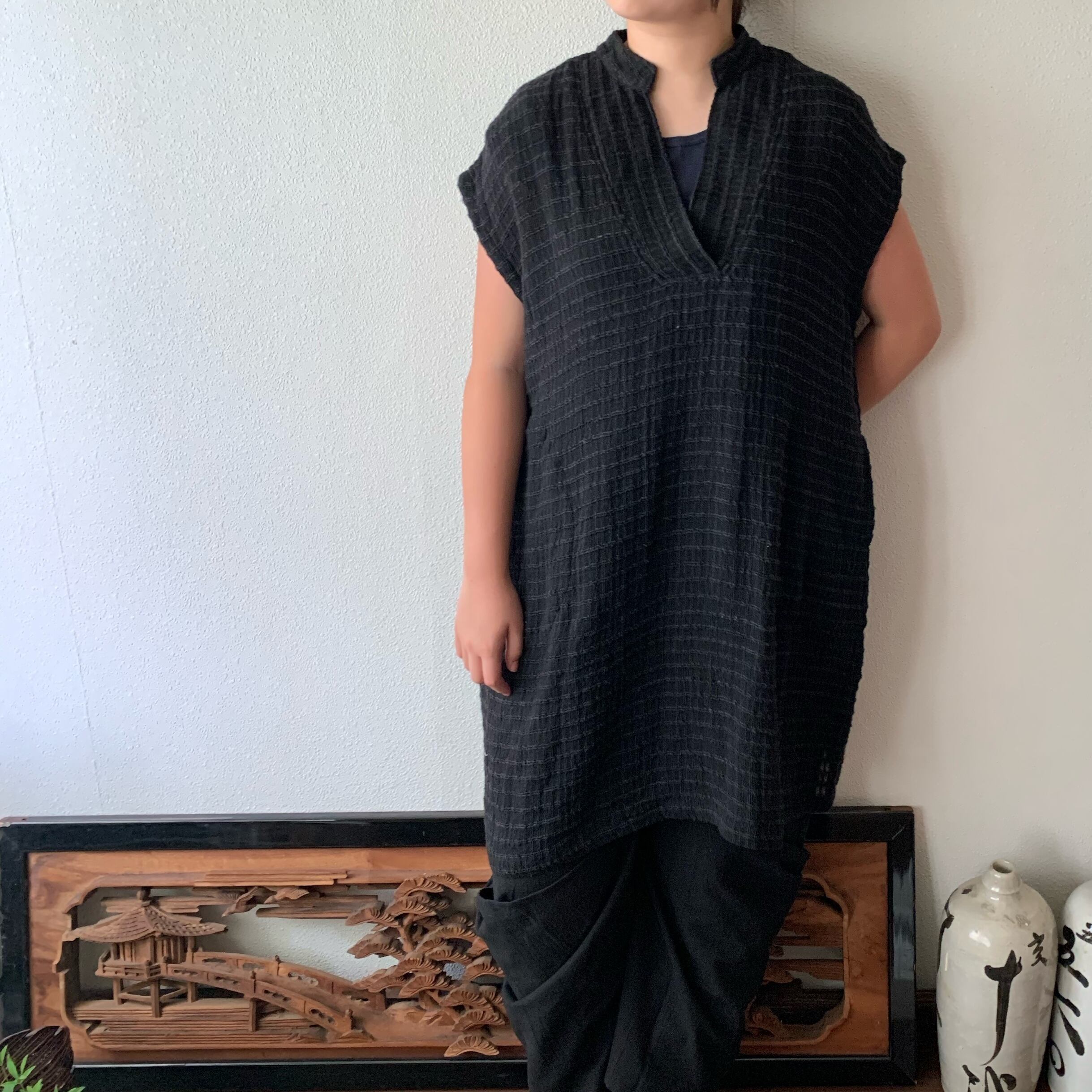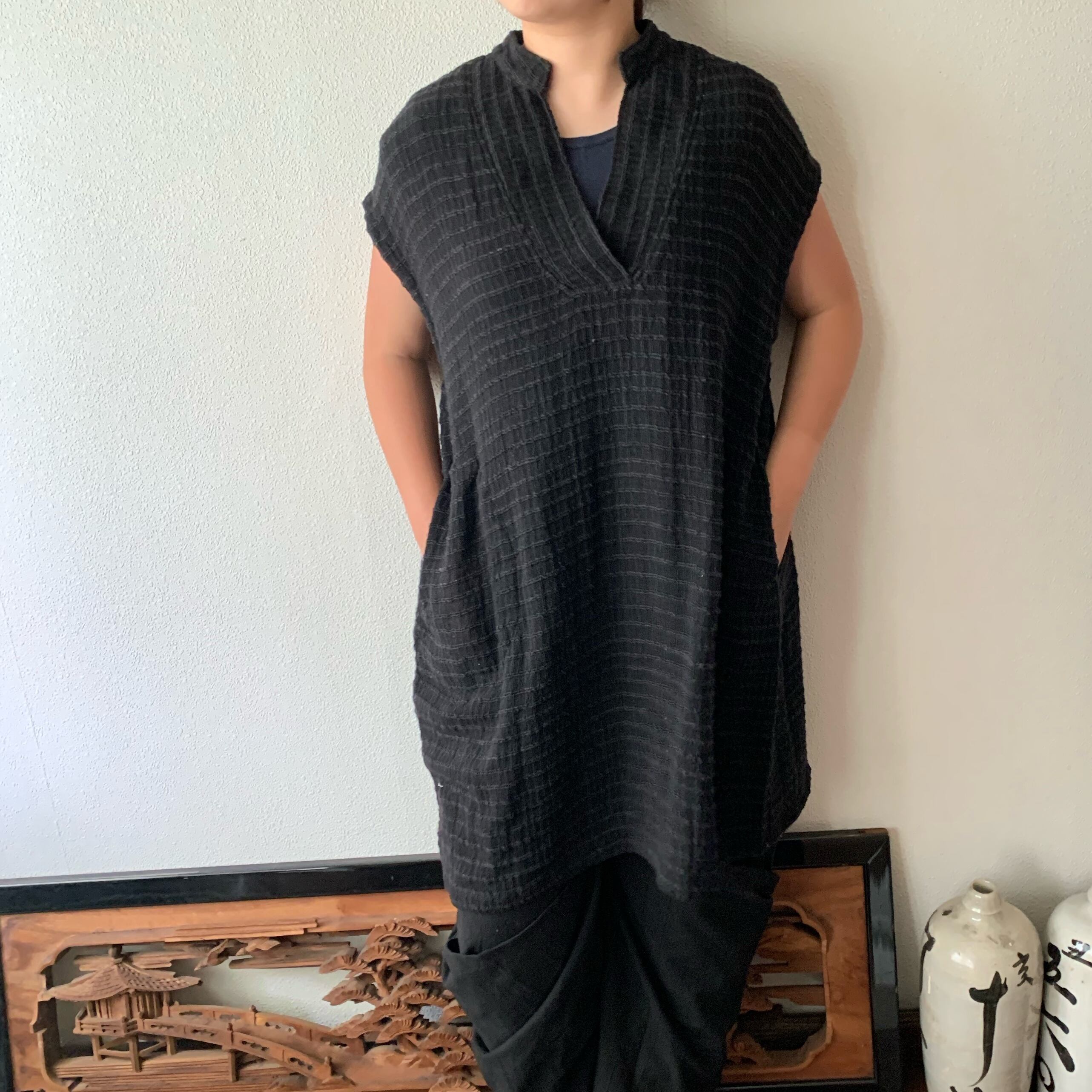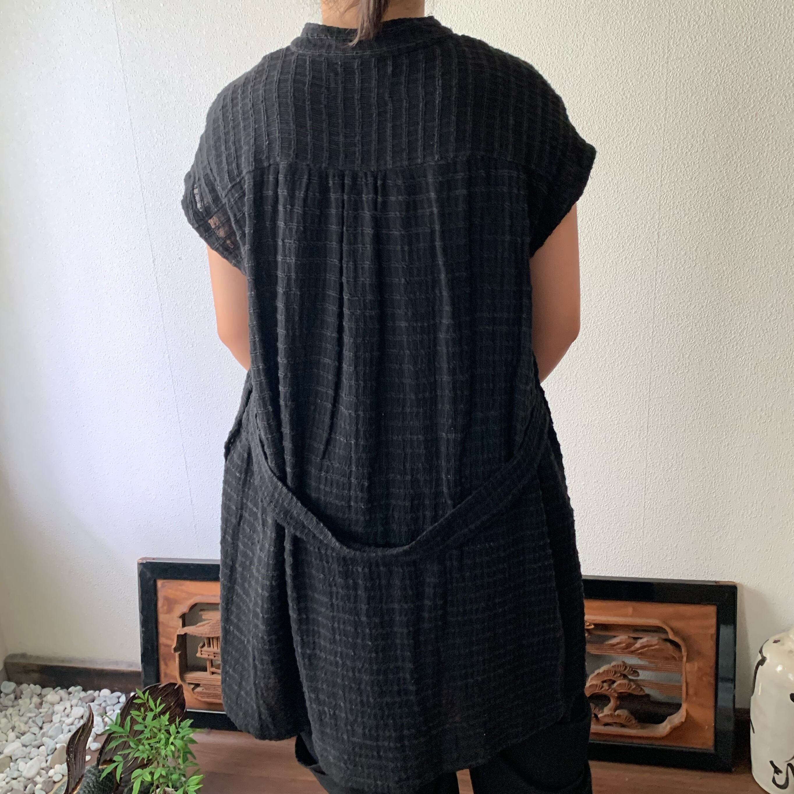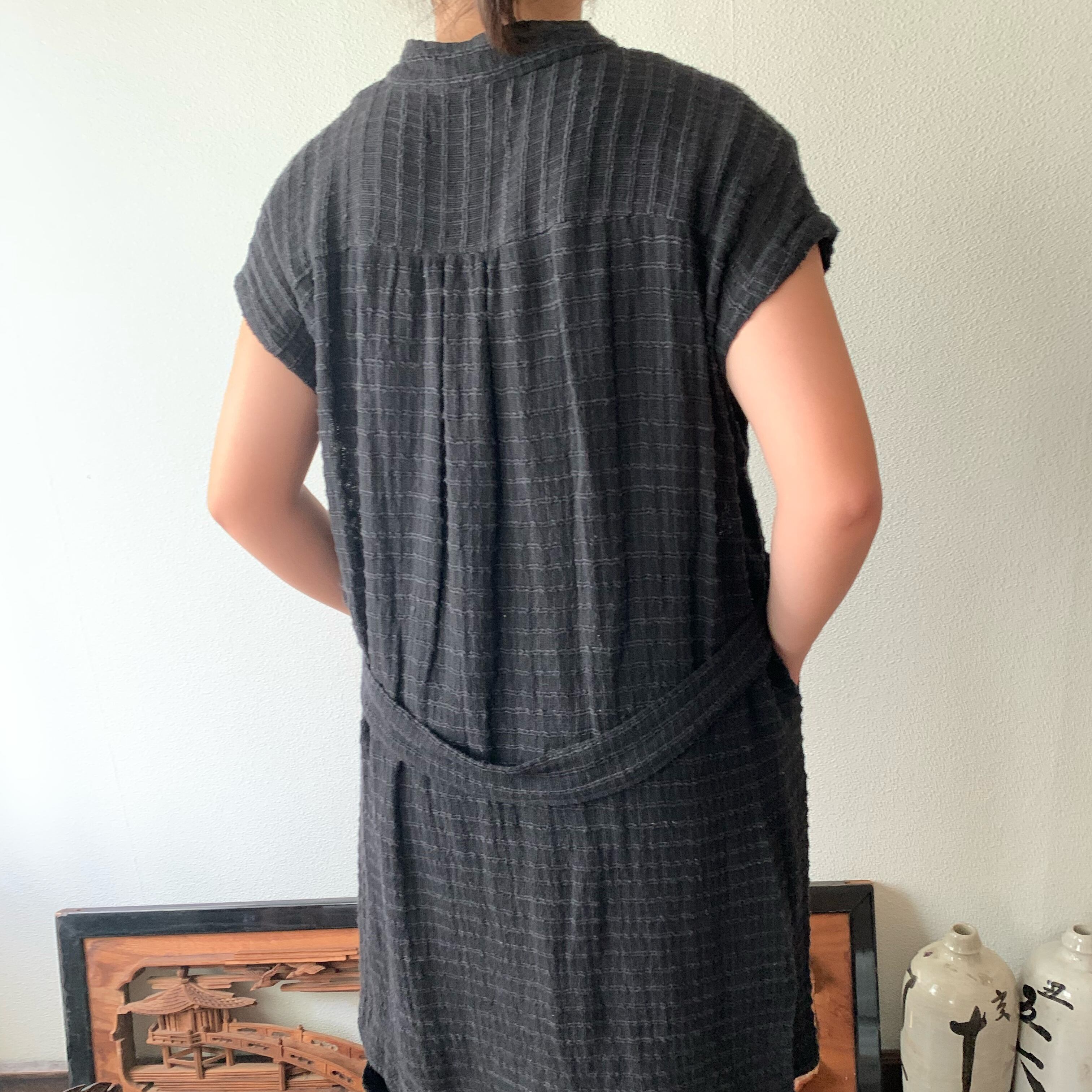 『ロング丈手織り綿チュニック 襟元と後ろベルトでよりかっこいい』