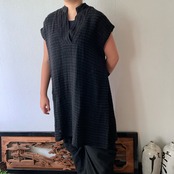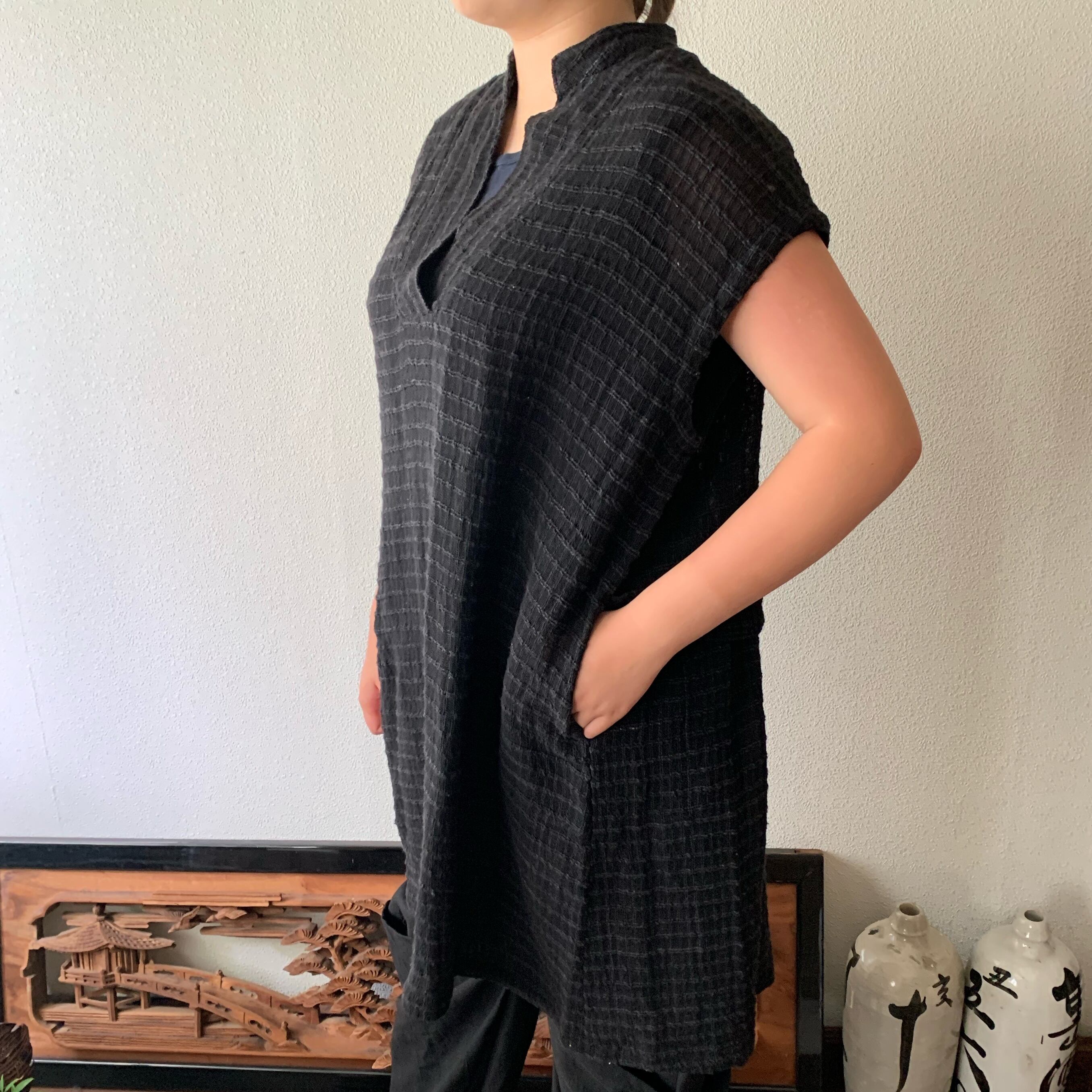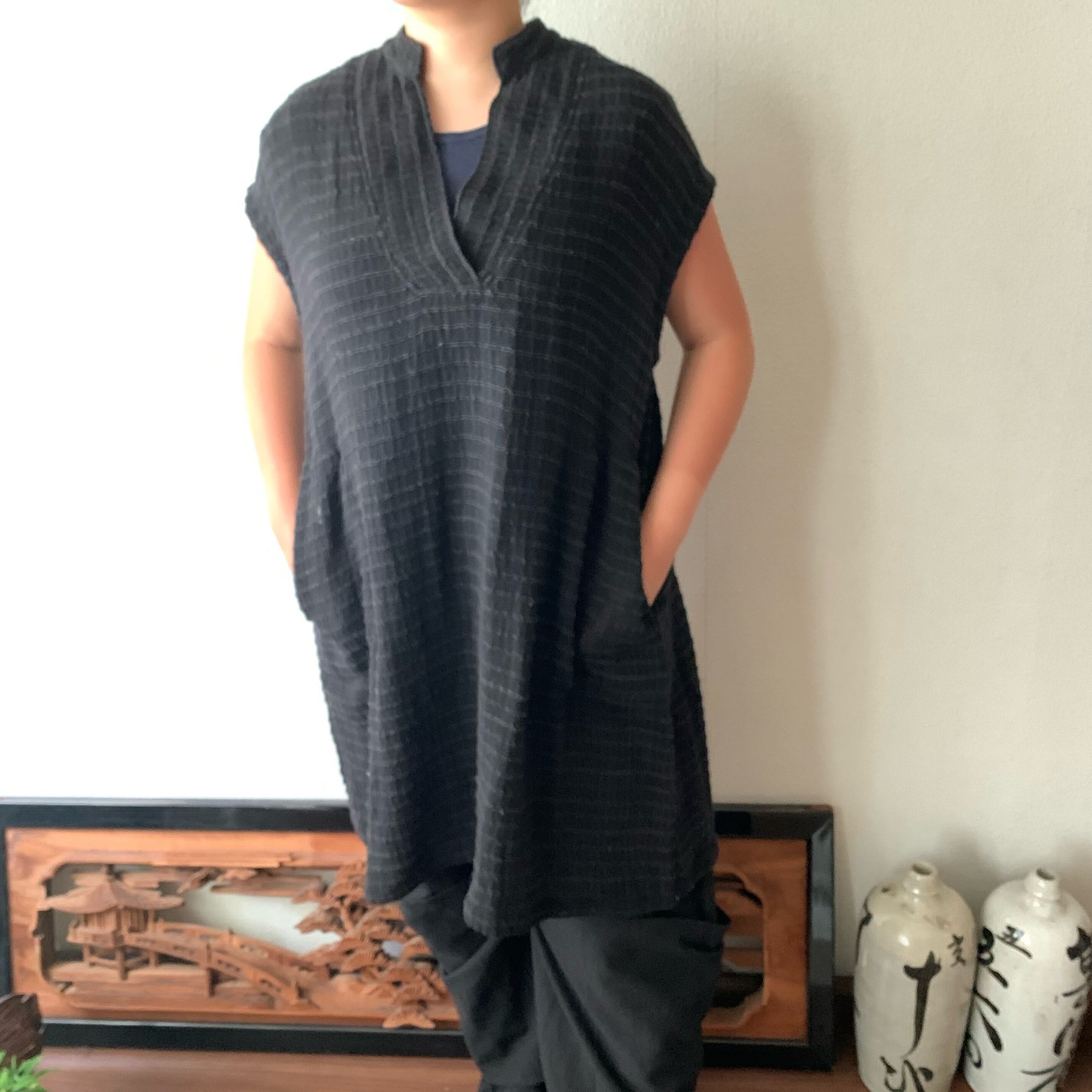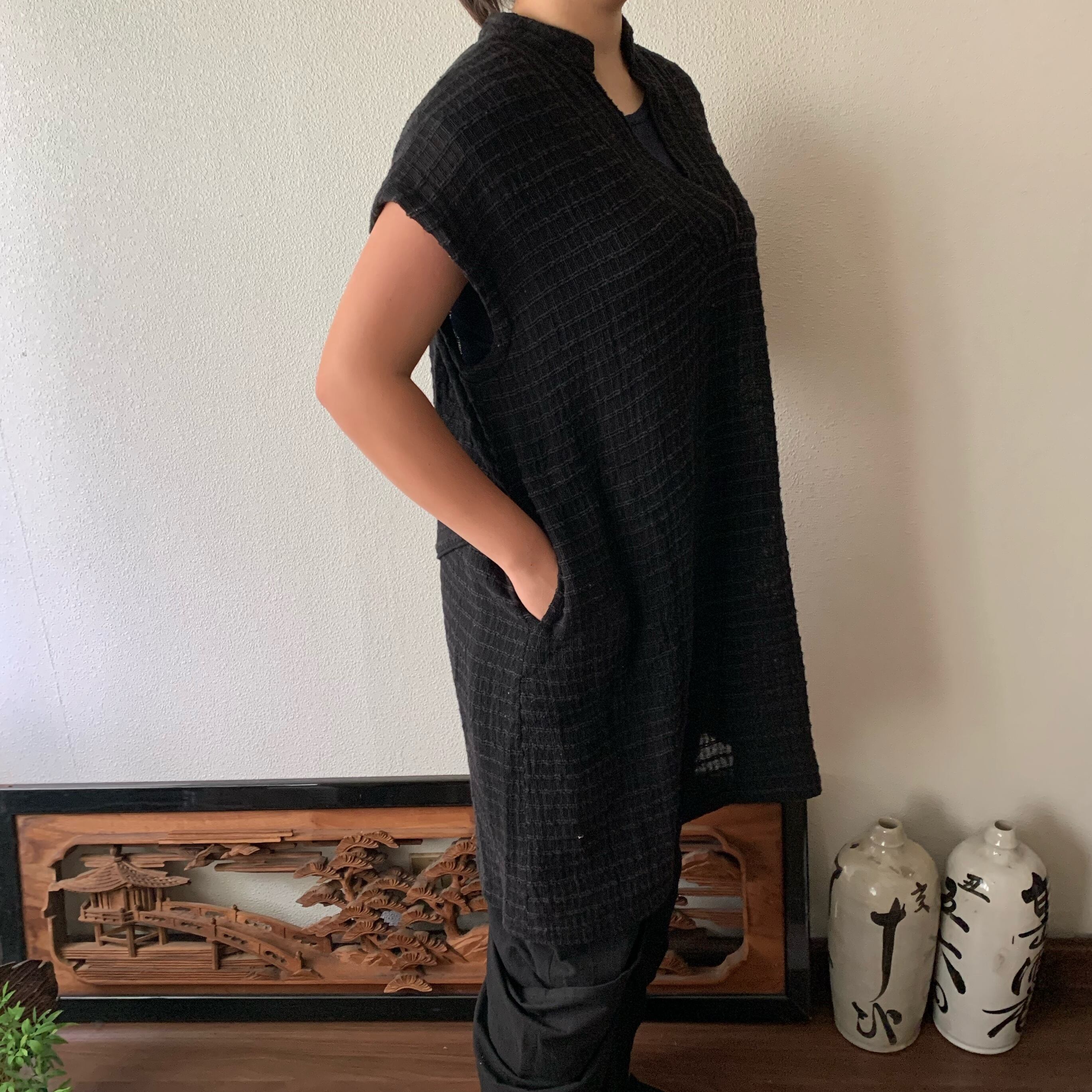 『ロング丈手織り綿チュニック 襟元と後ろベルトでよりかっこいい』