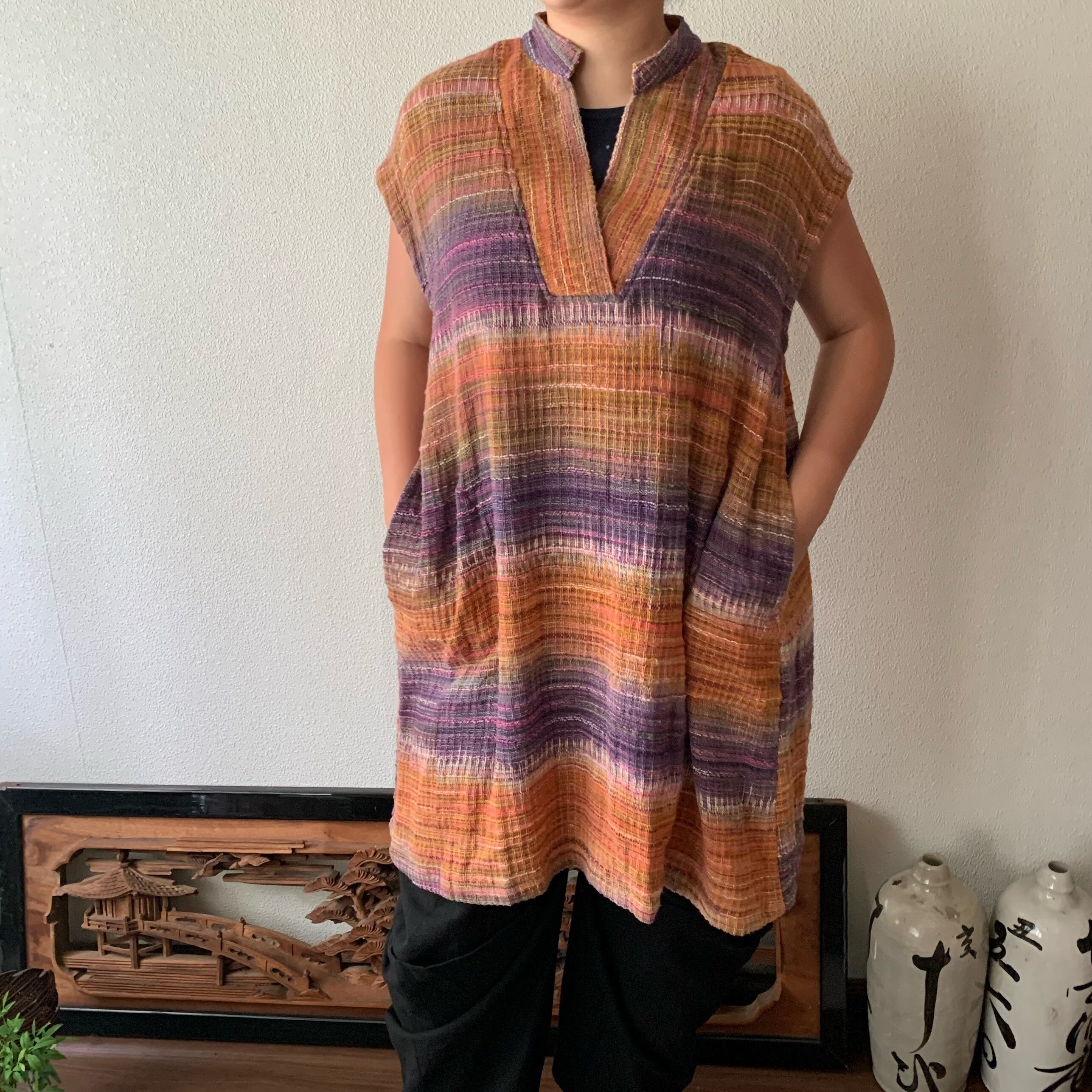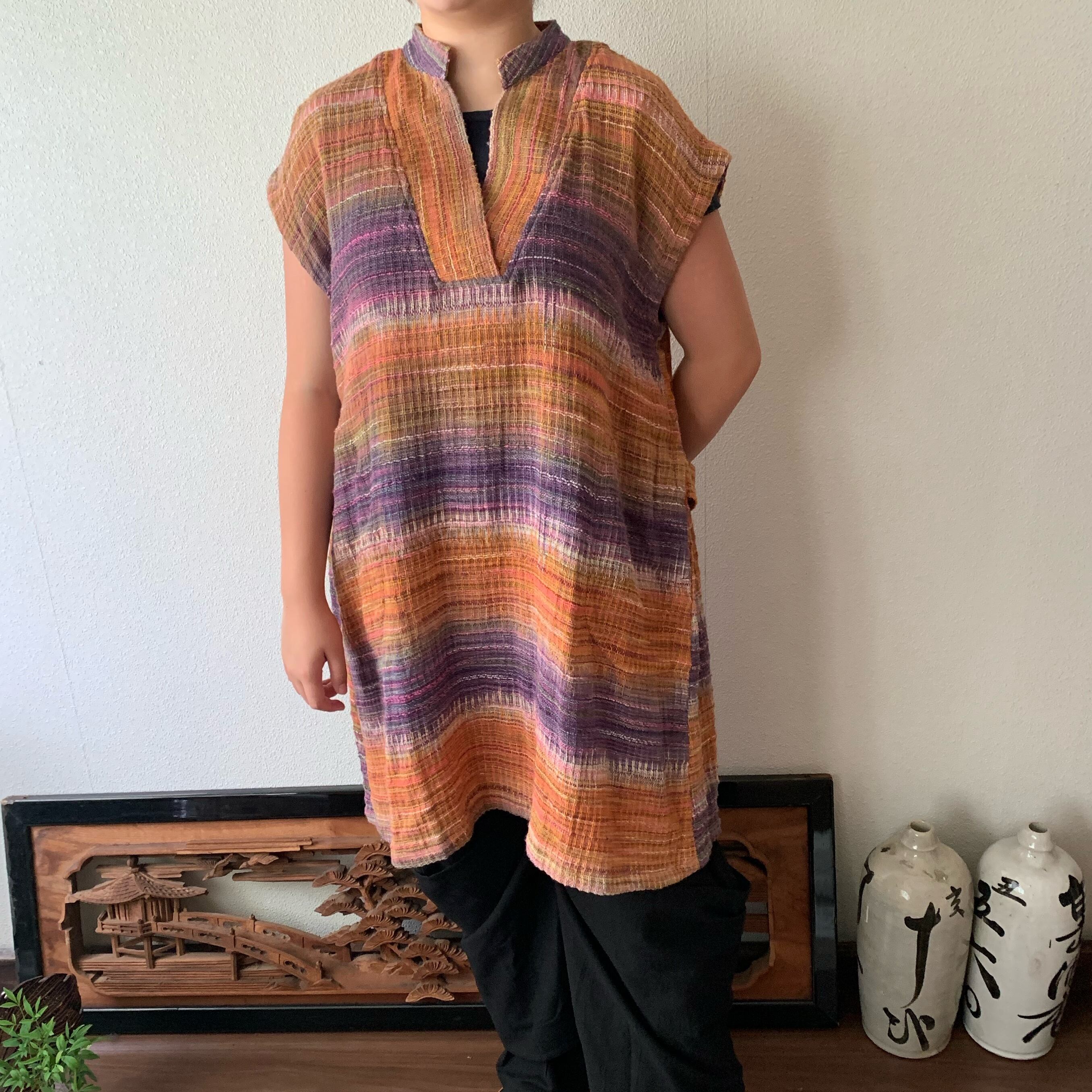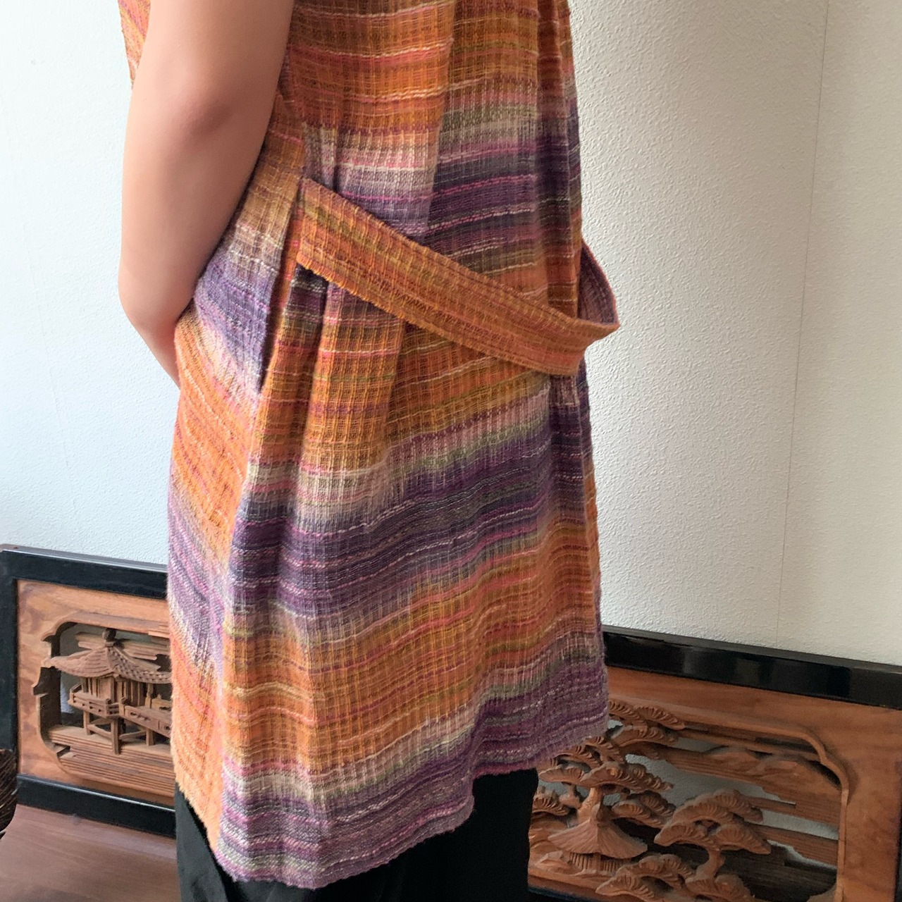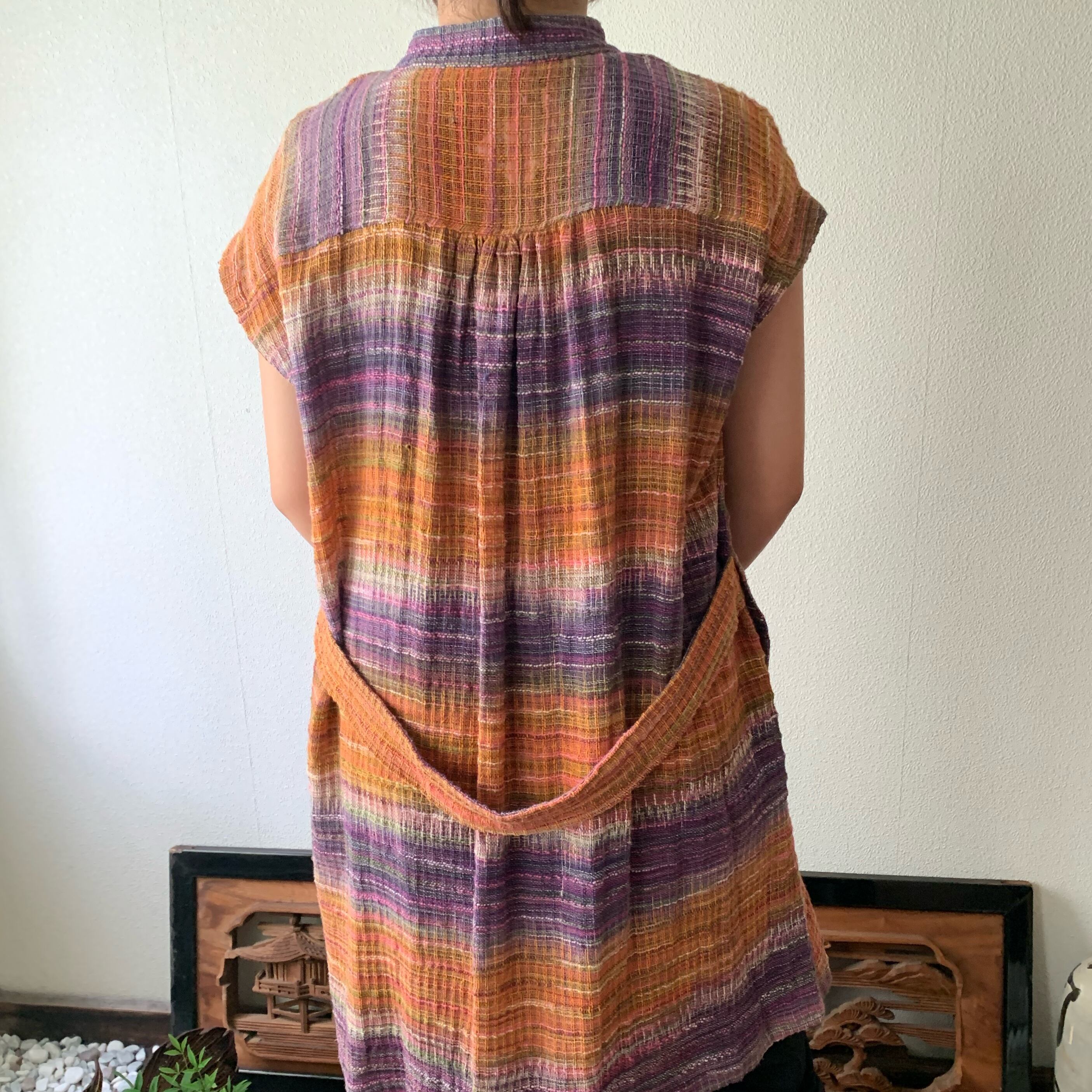 ロング丈手織り綿チュニック 襟元と後ろベルトでよりかっこいい オレンジ紫絣
