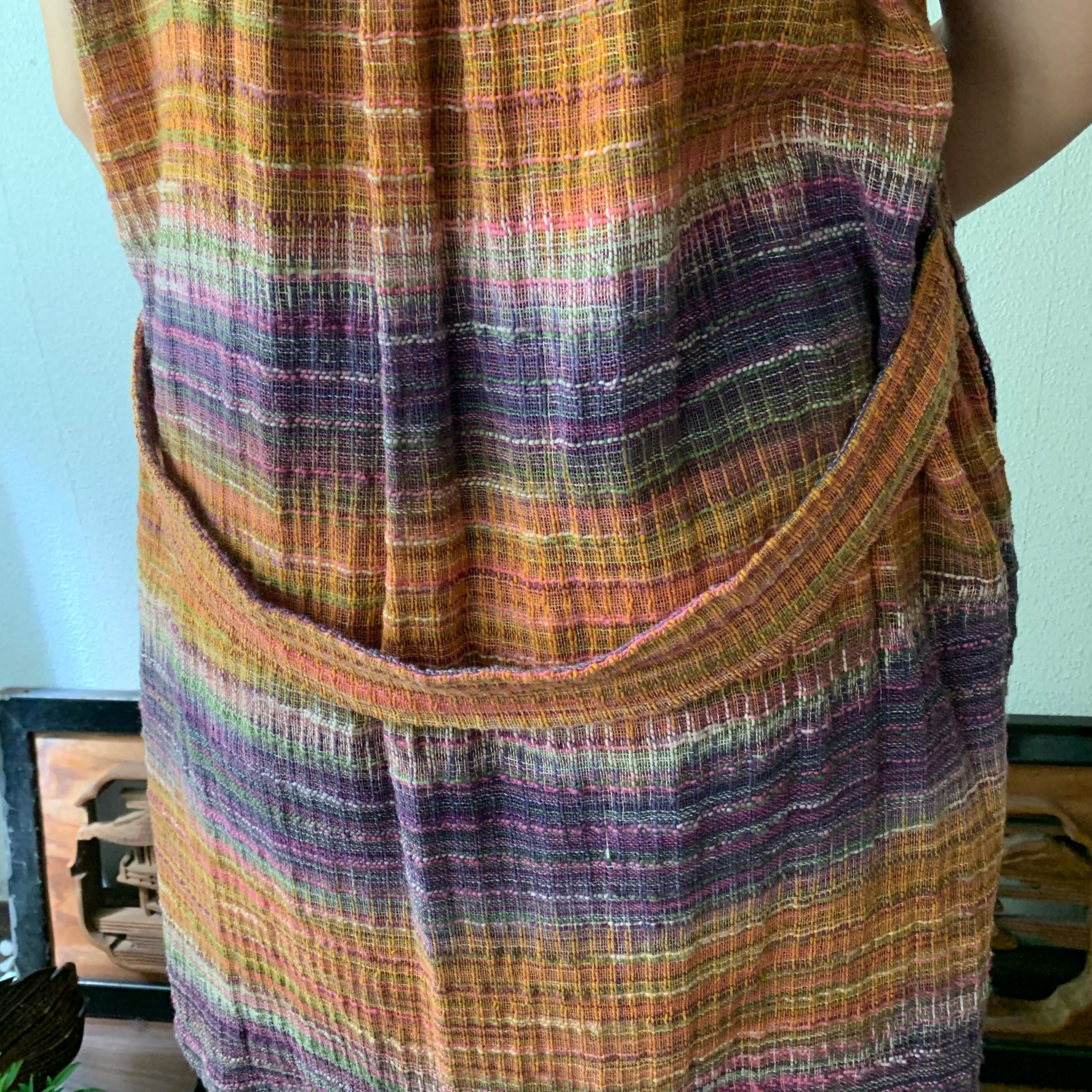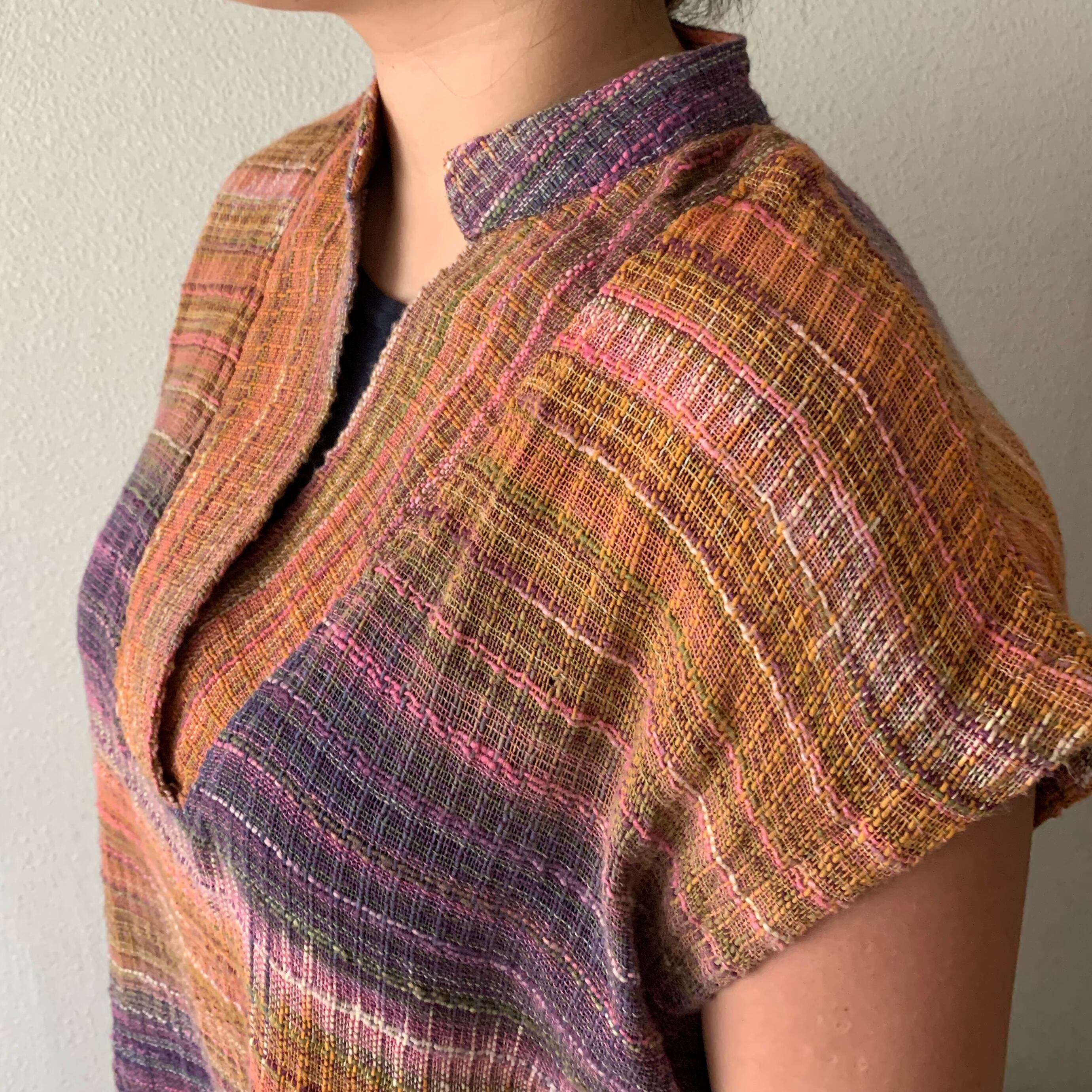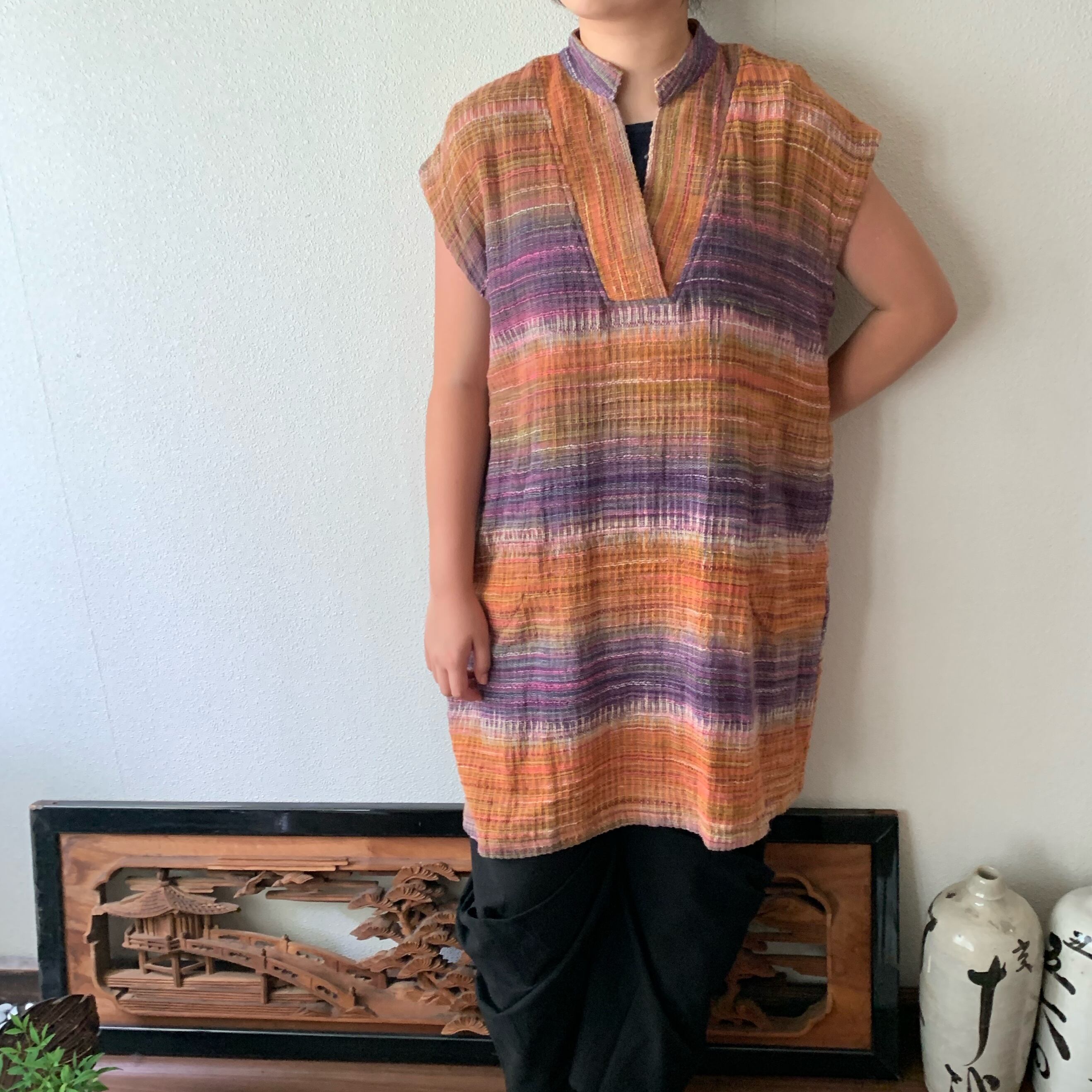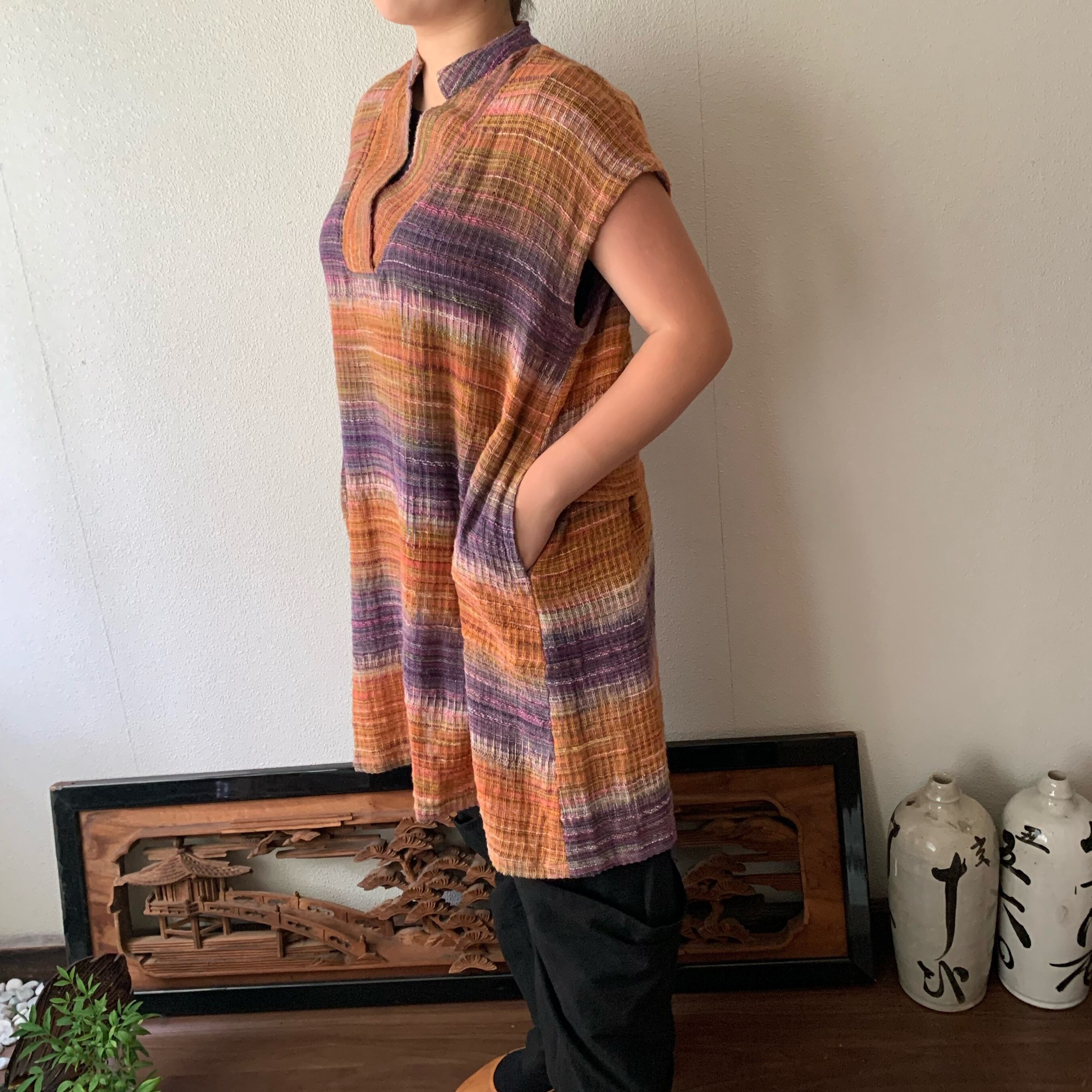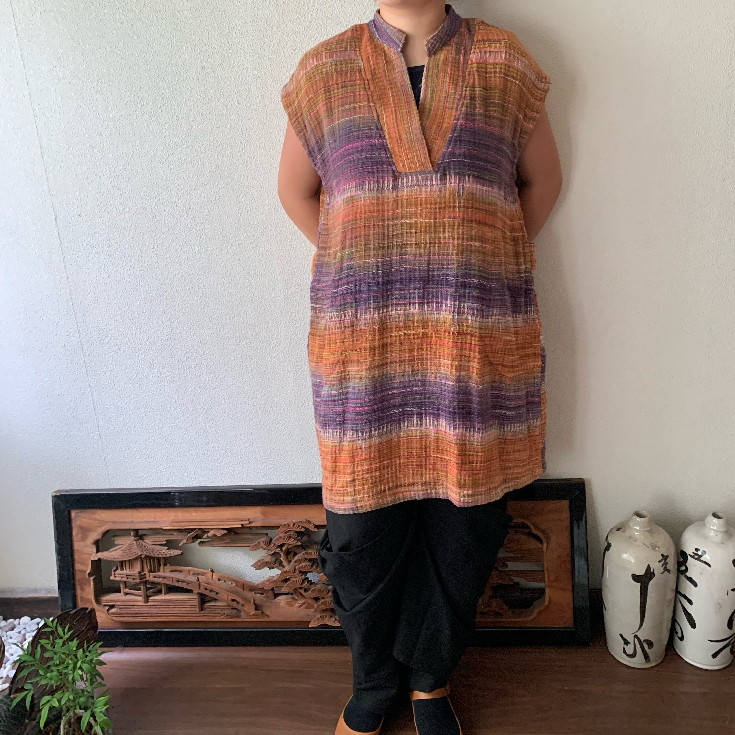 ロング丈手織り綿チュニック 襟元と後ろベルトでよりかっこいい オレンジ紫絣