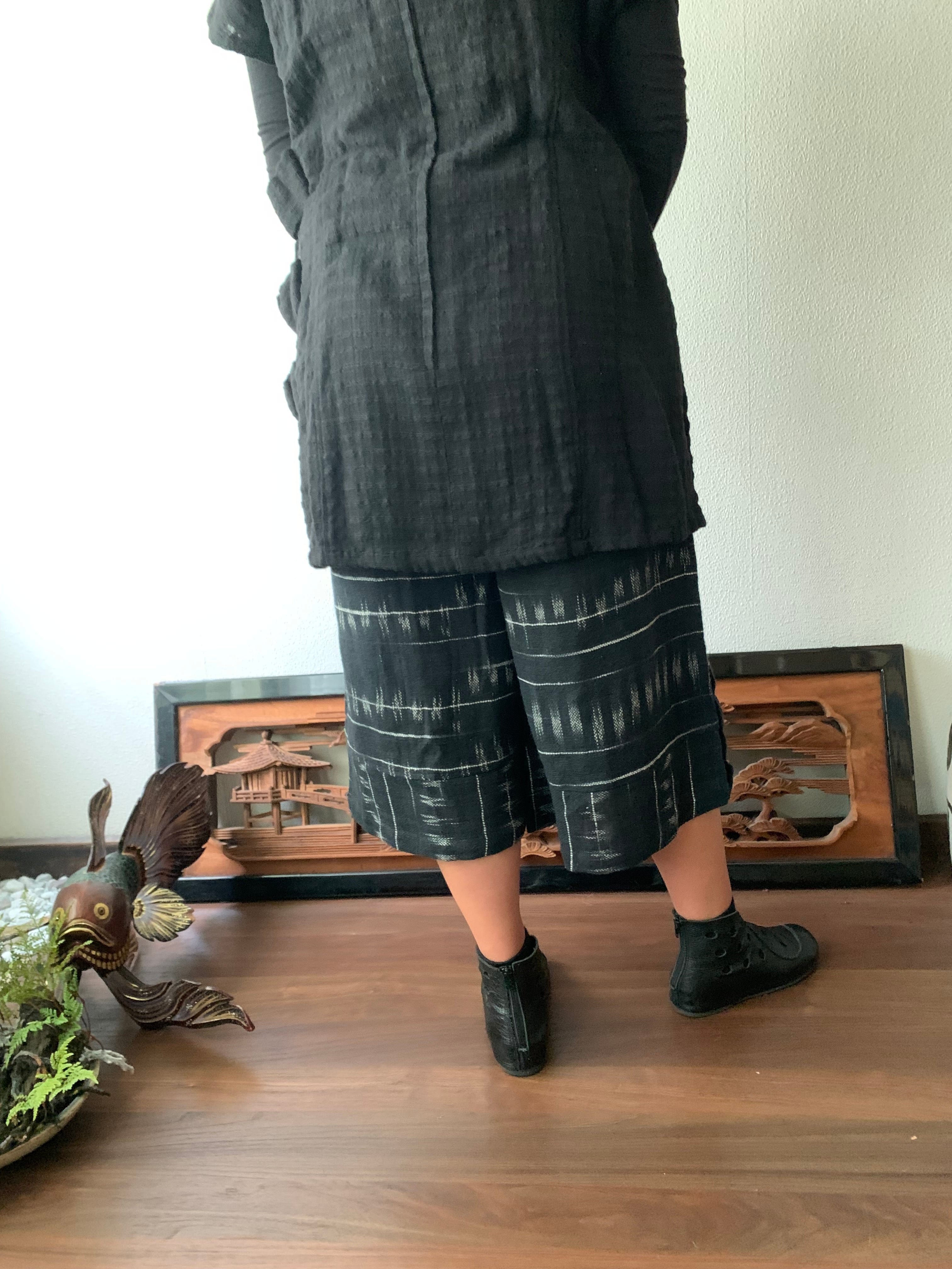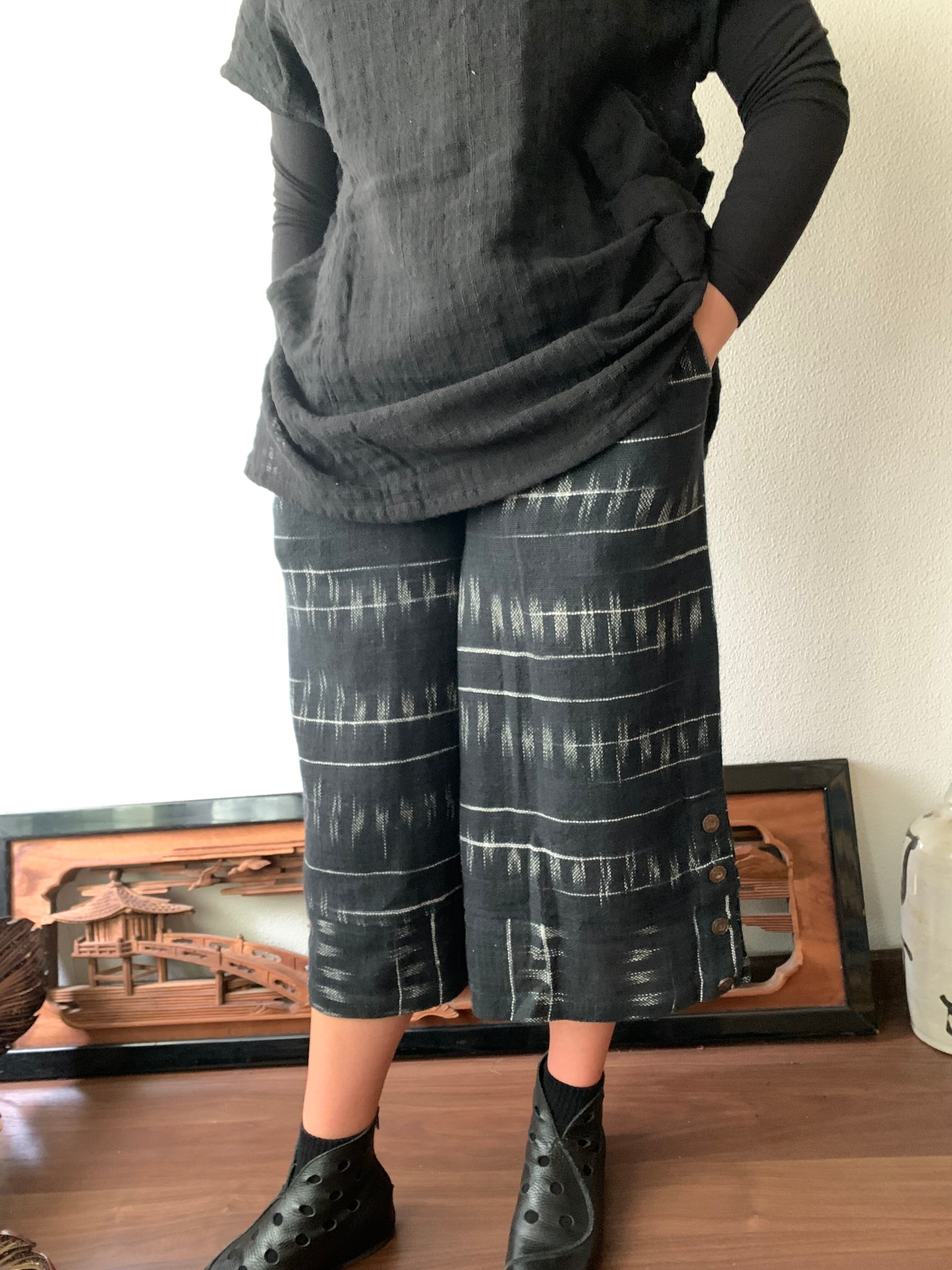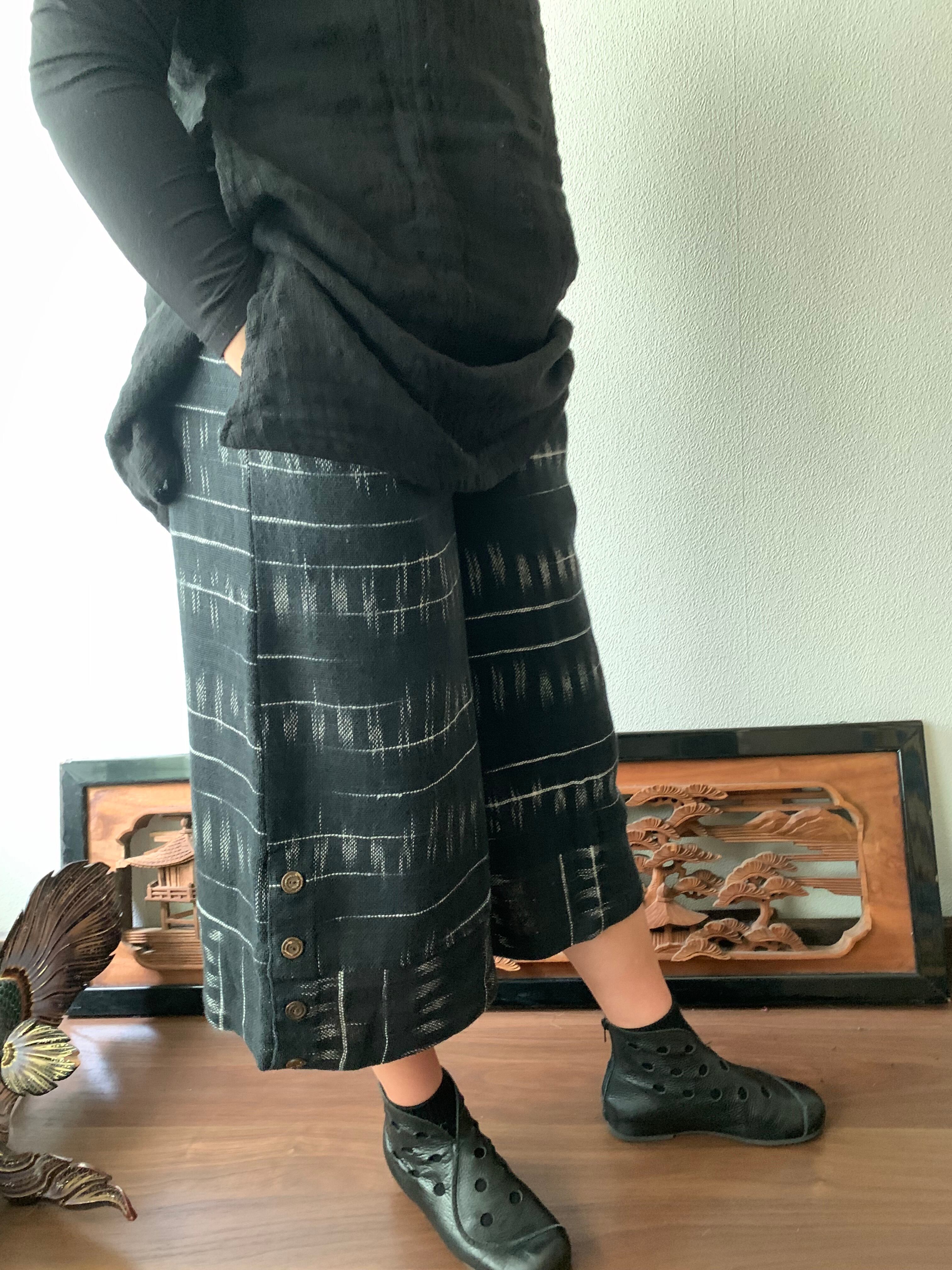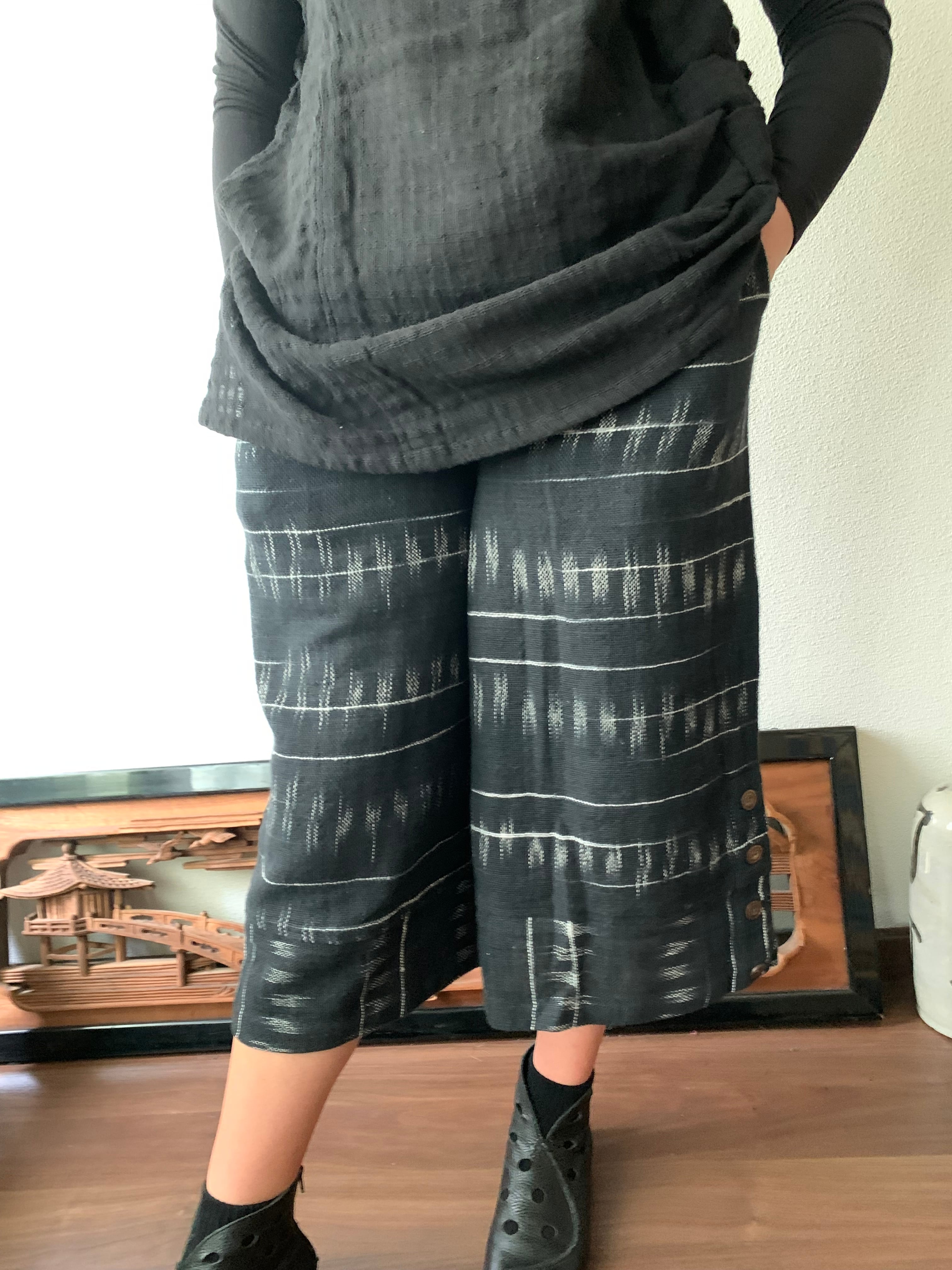 生地厚め手織り綿裾ワイドのガウチョパンツ すとんと落ちるシンプルラインでどんな体型もすっきり、でも裾横ボタンで遊んでます もちろんロングセラー 黒絣