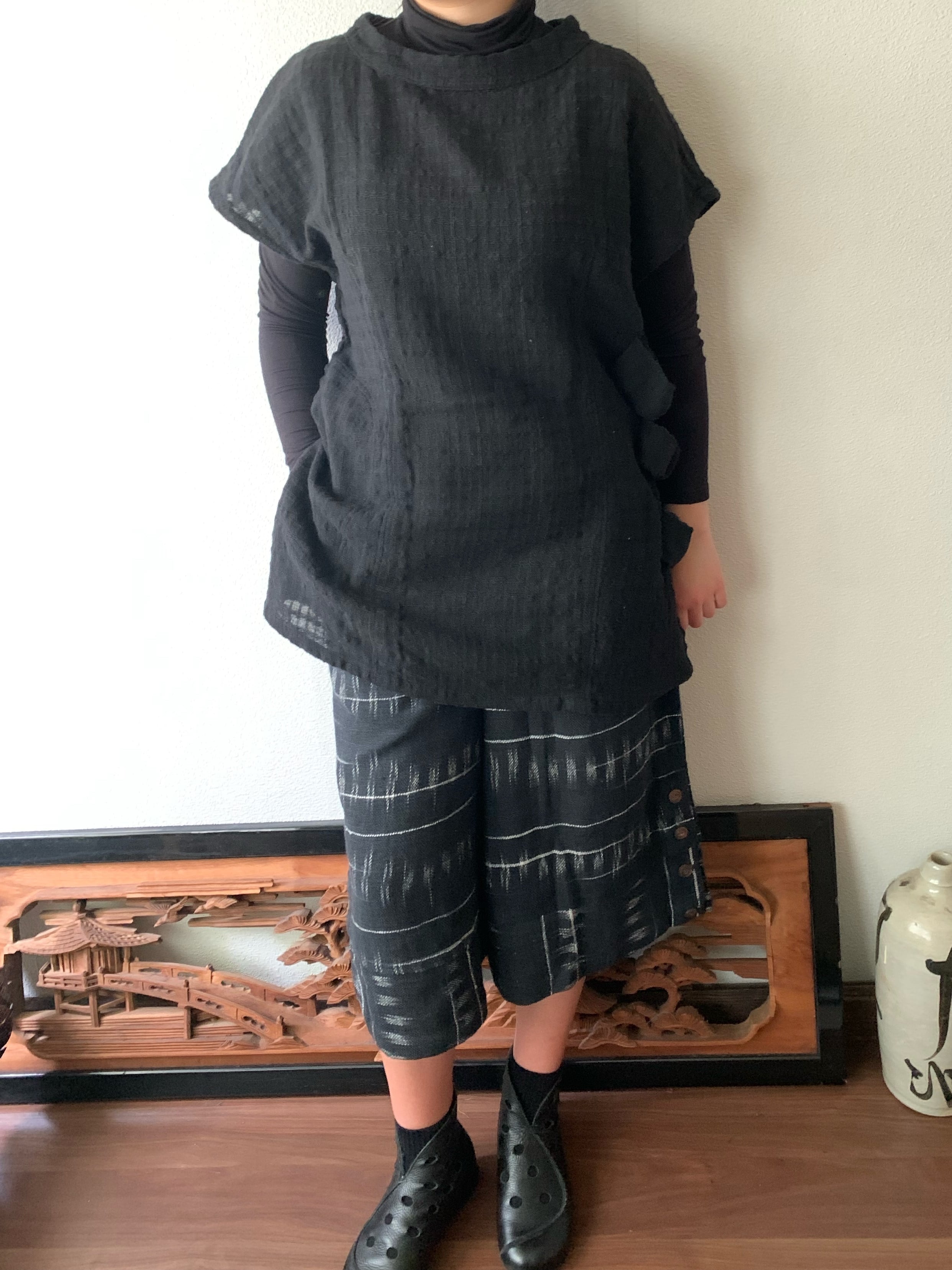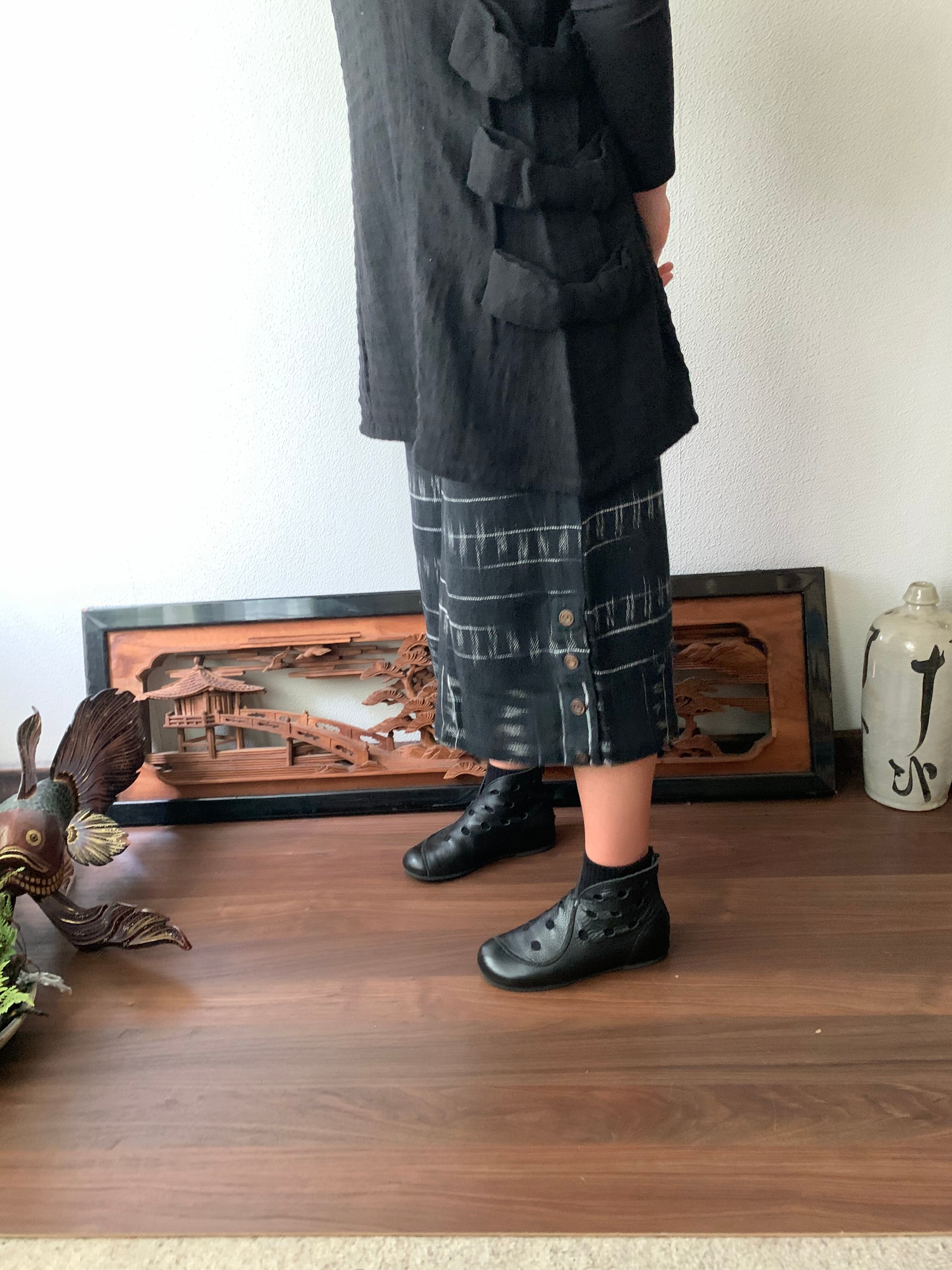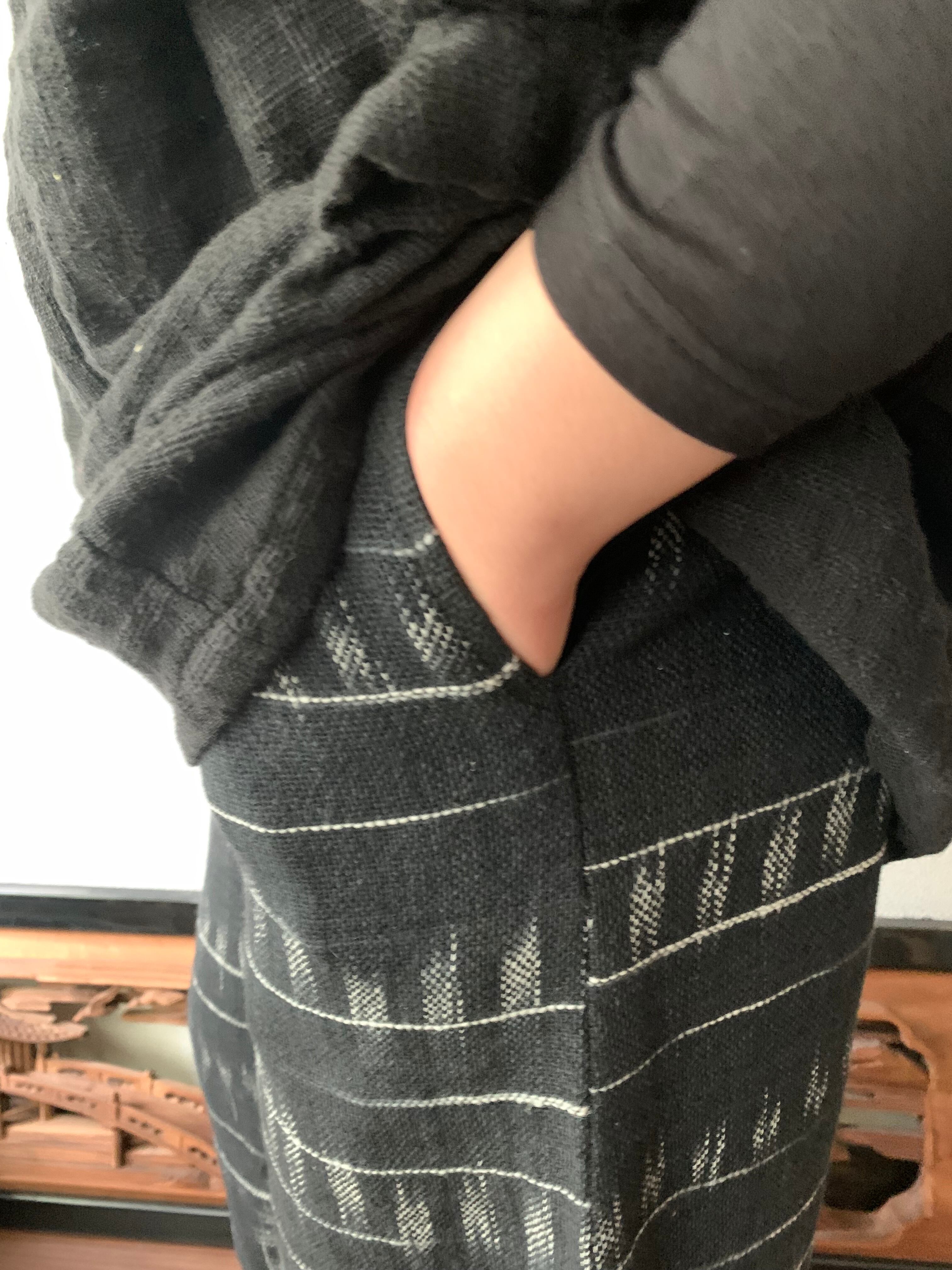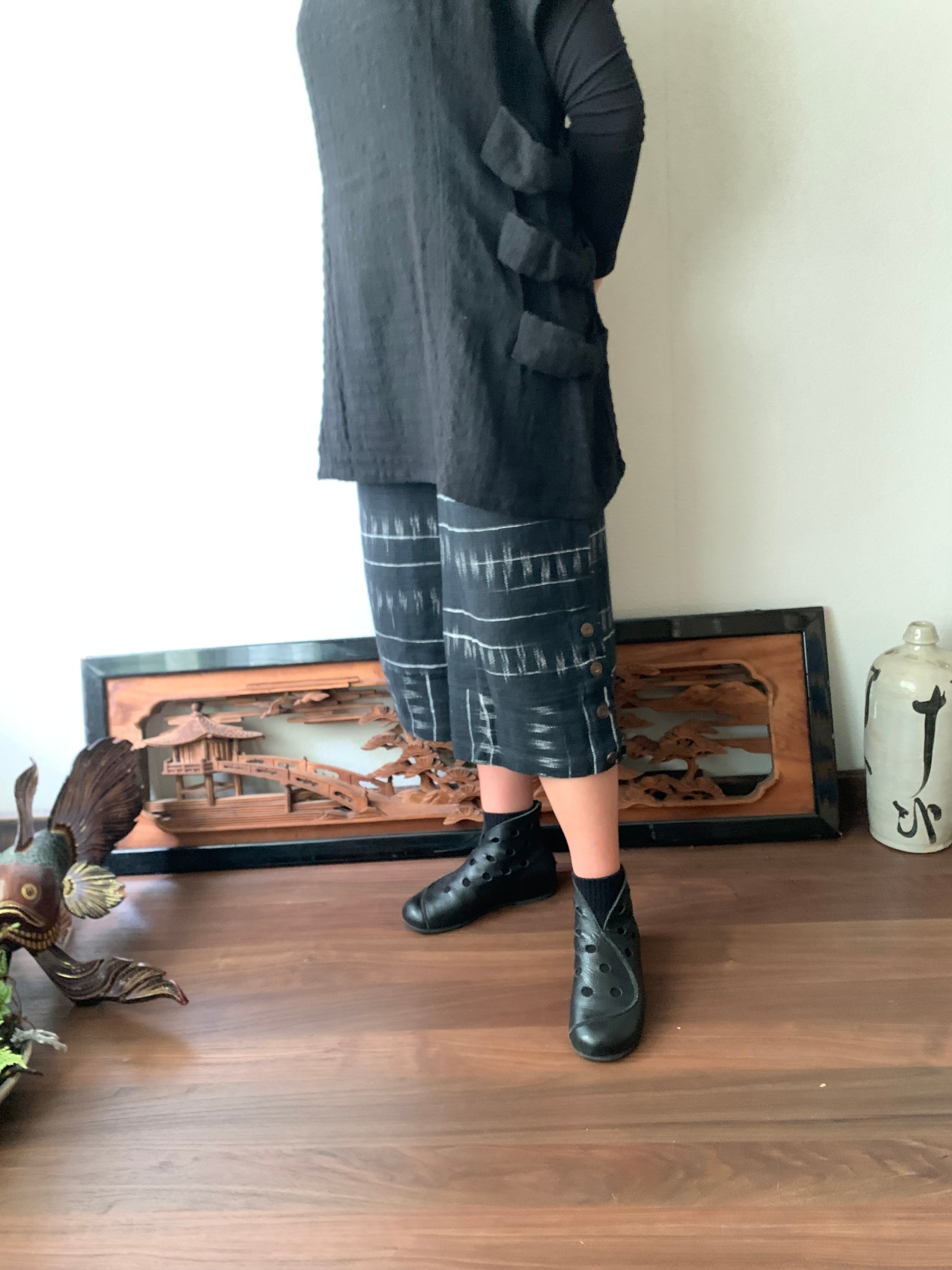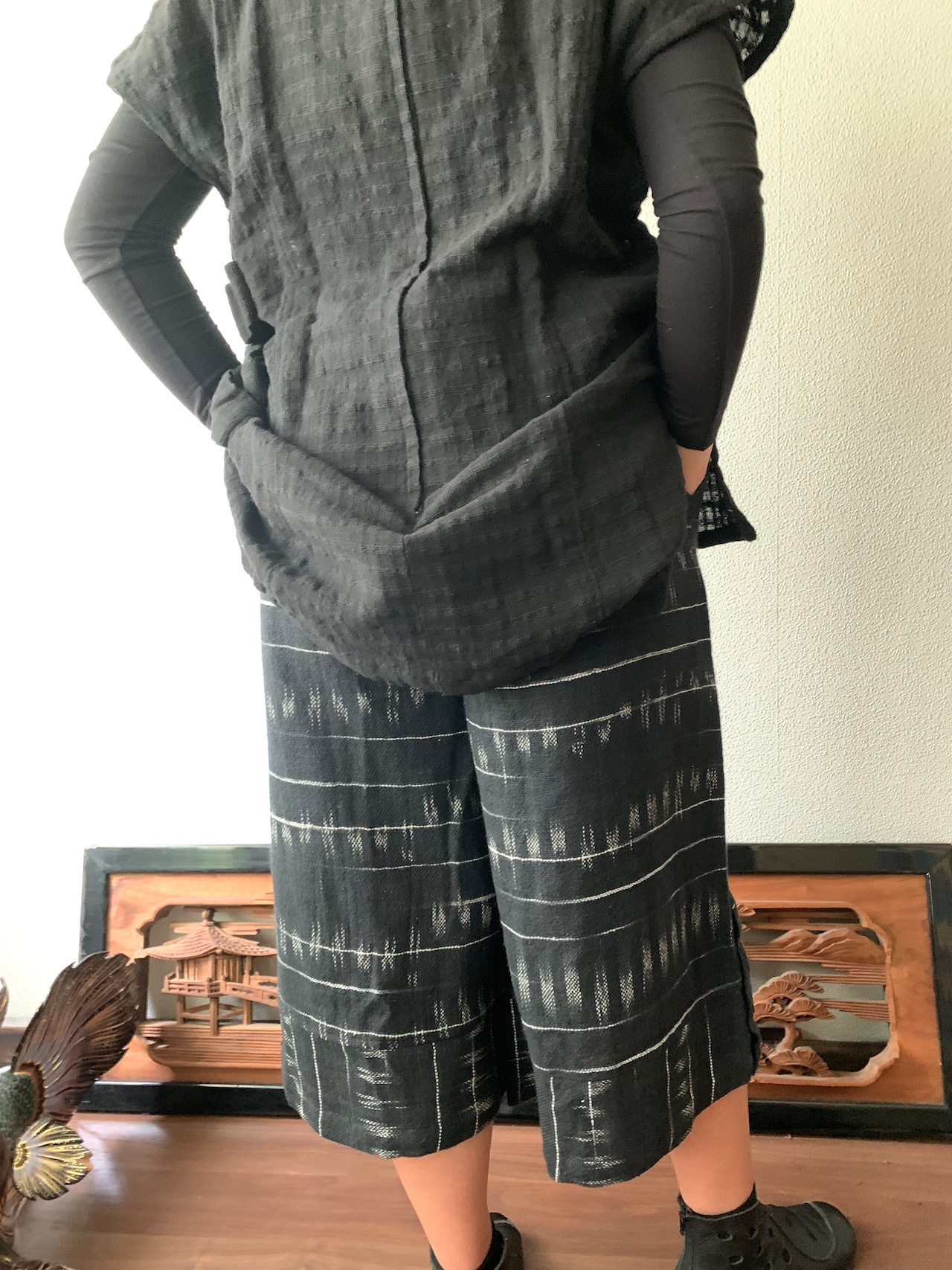 生地厚め手織り綿裾ワイドのガウチョパンツ すとんと落ちるシンプルラインでどんな体型もすっきり、でも裾横ボタンで遊んでます もちろんロングセラー 黒絣