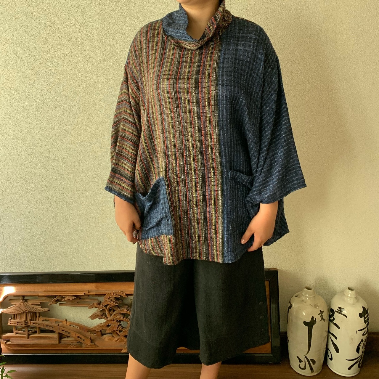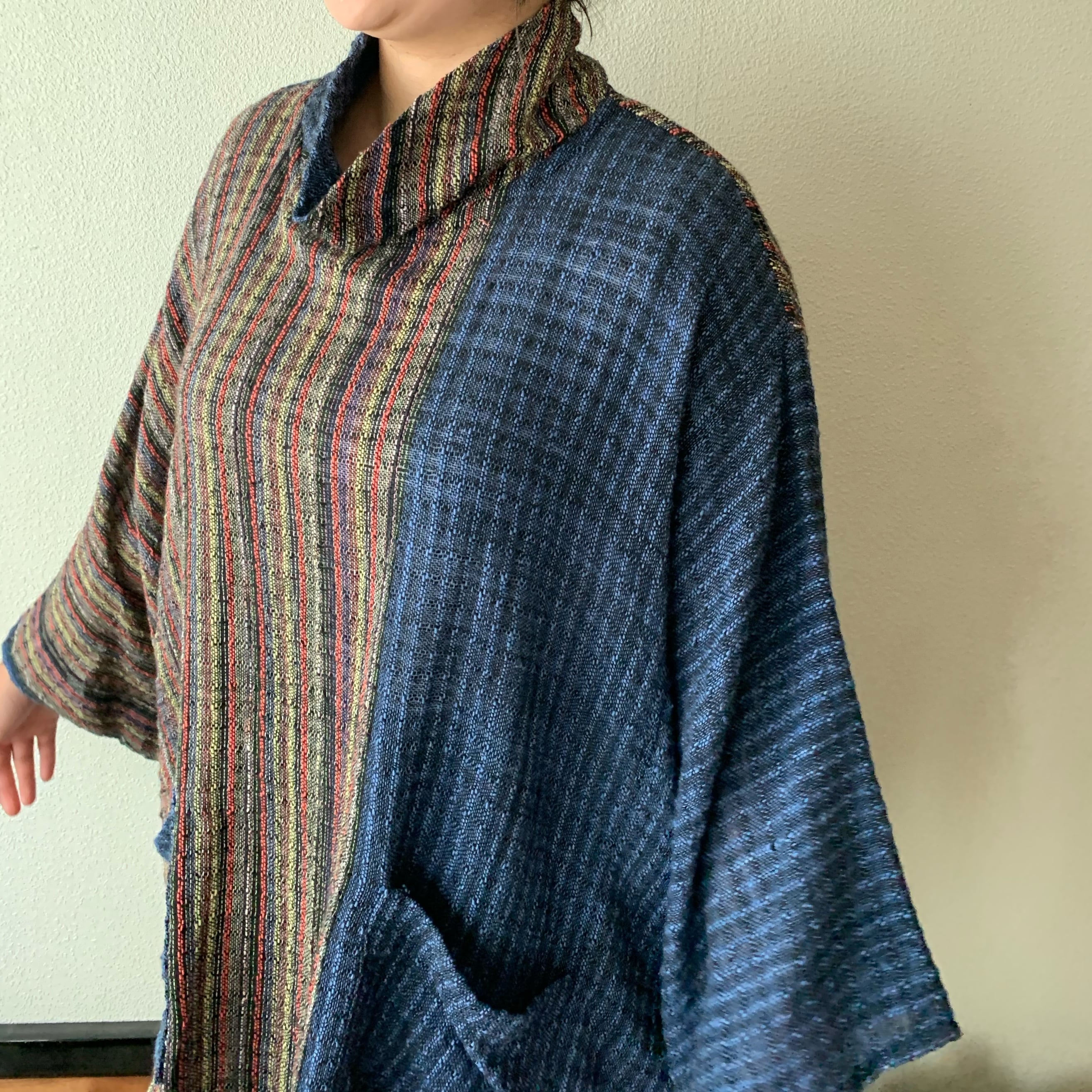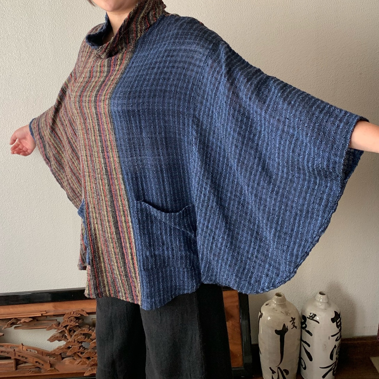 『手織り綿ポンチョ シンプルポンチョだけど襟高バイヤスで遊んでます』