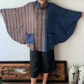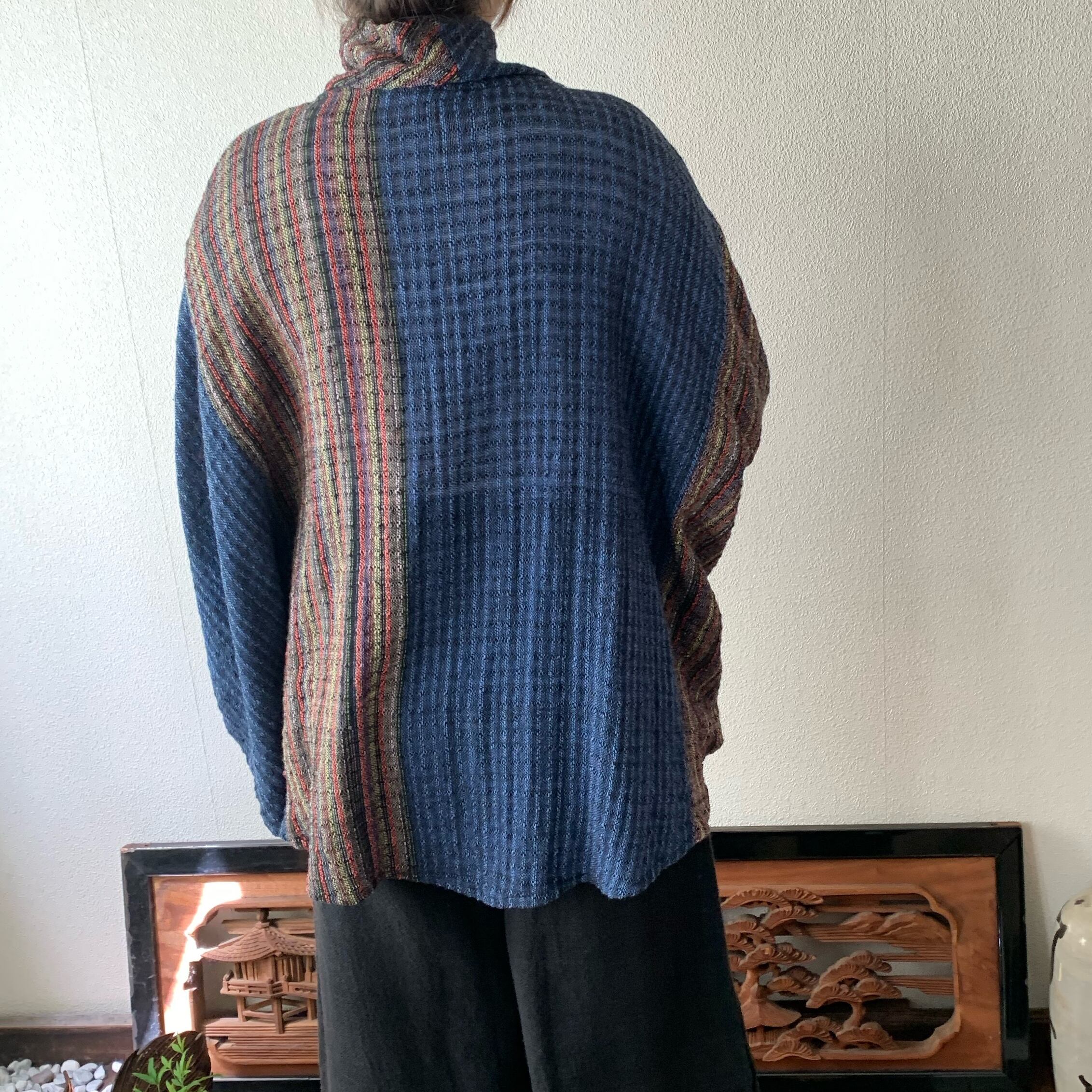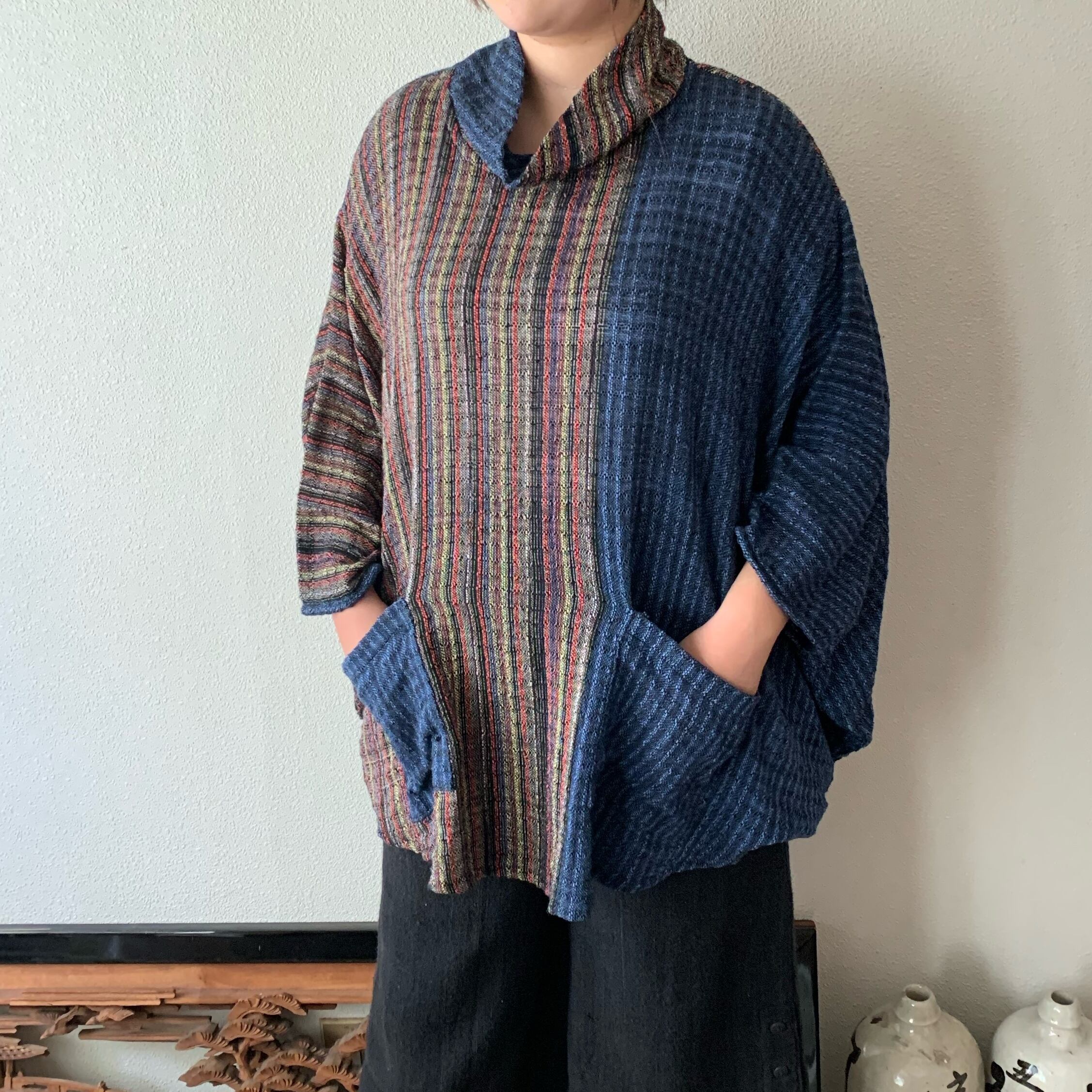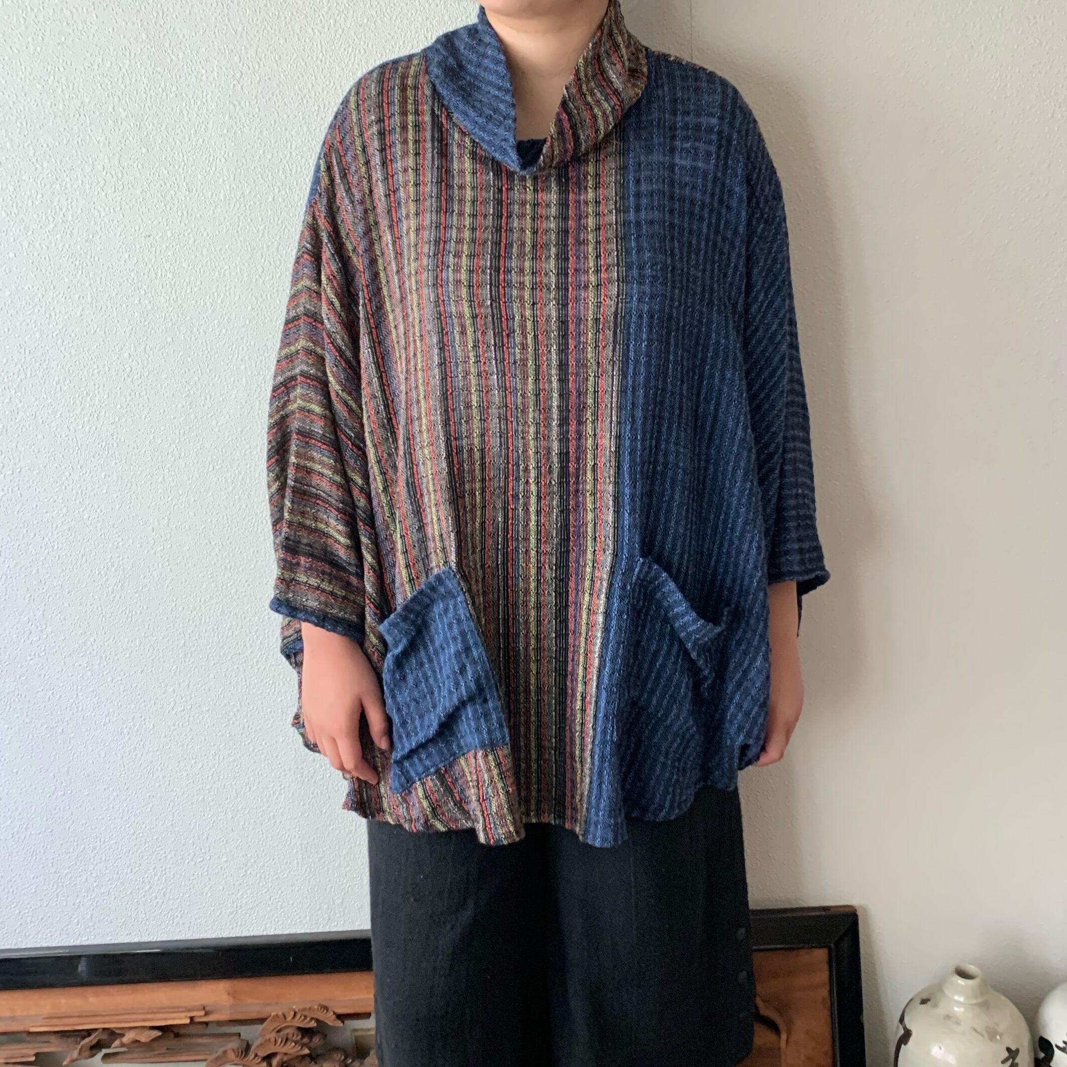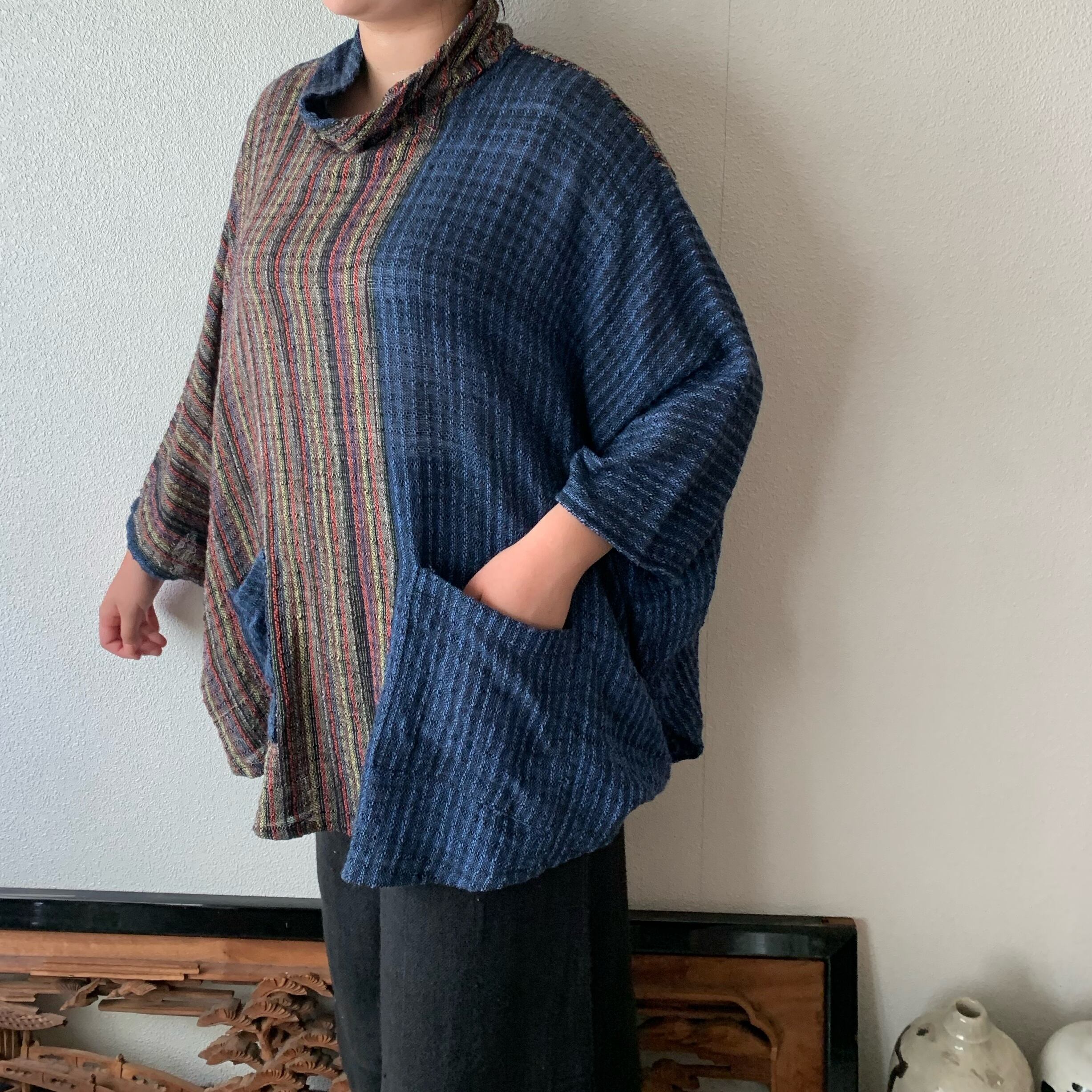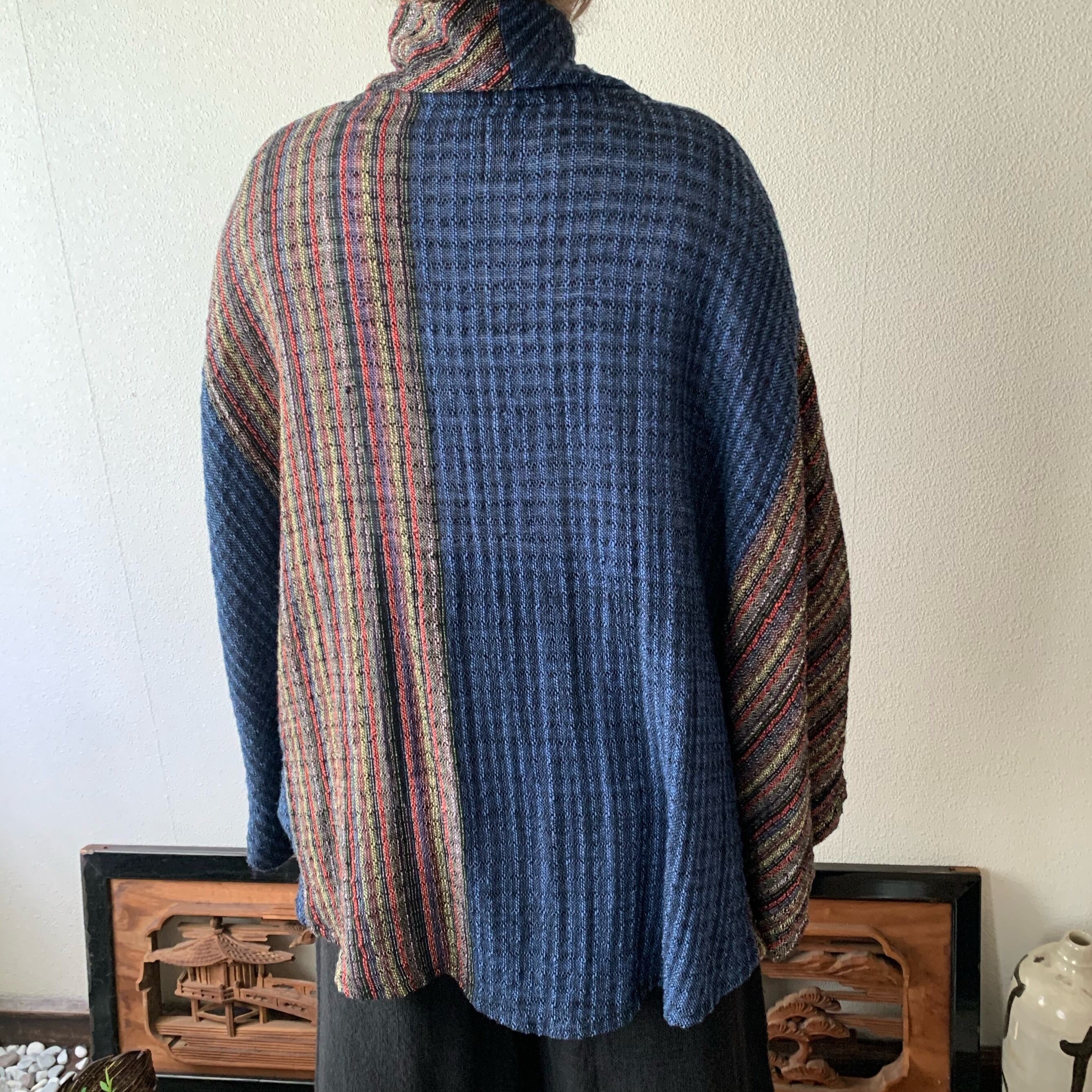 手織り綿ポンチョ シンプルポンチョだけど襟高バイヤスで遊んでます 青ミックス絣