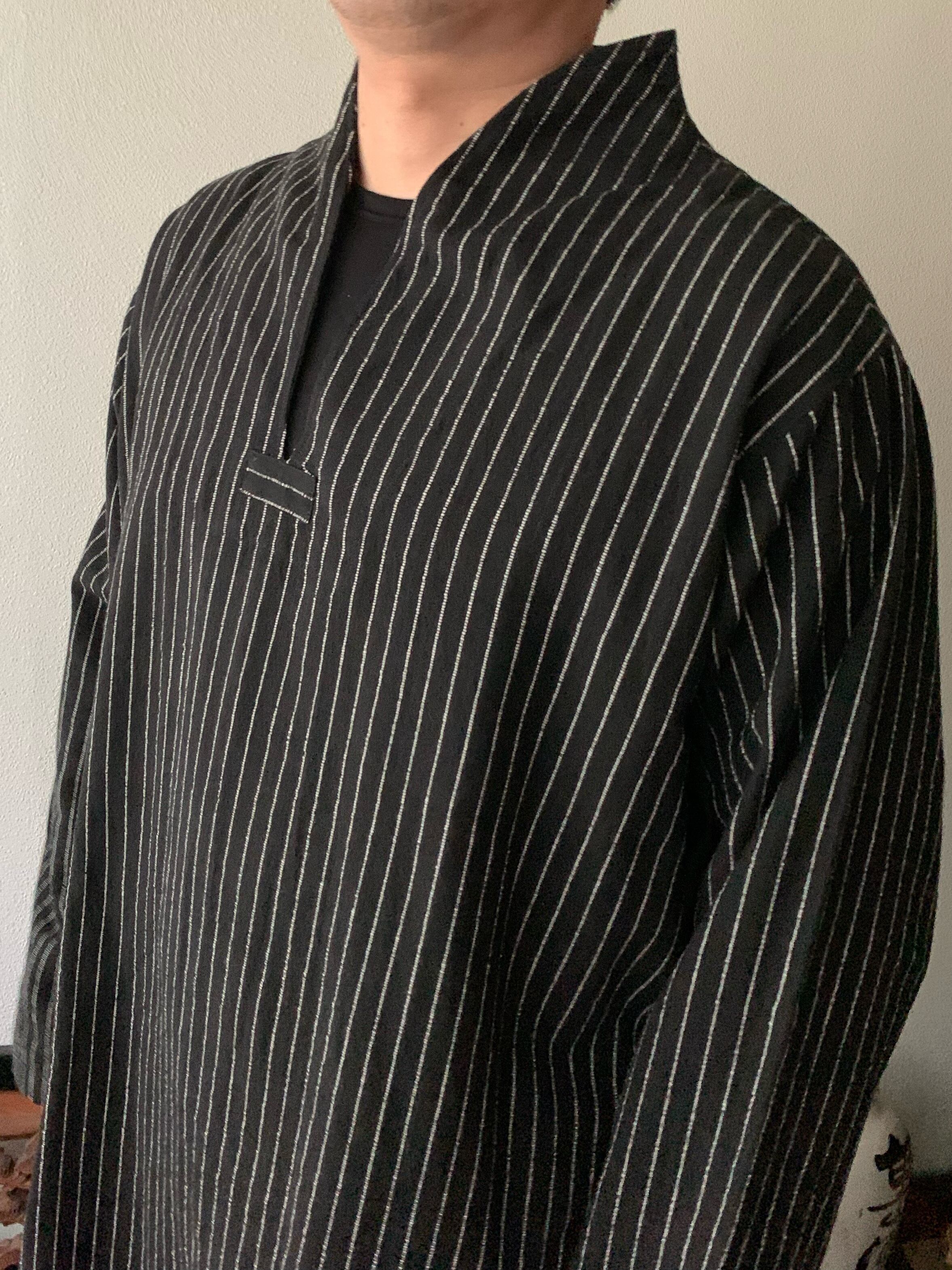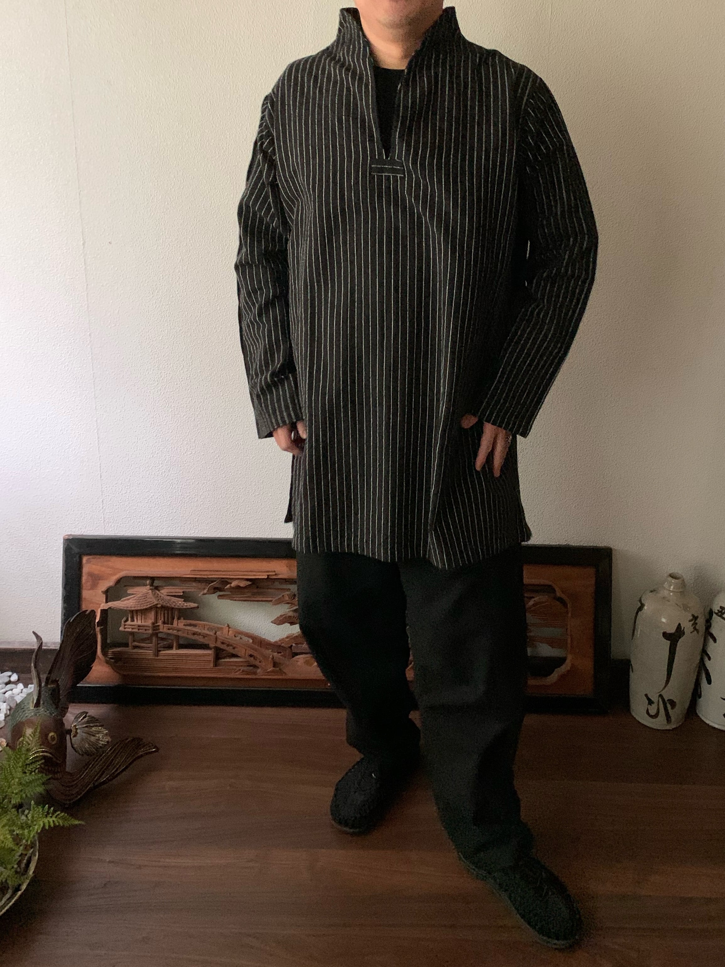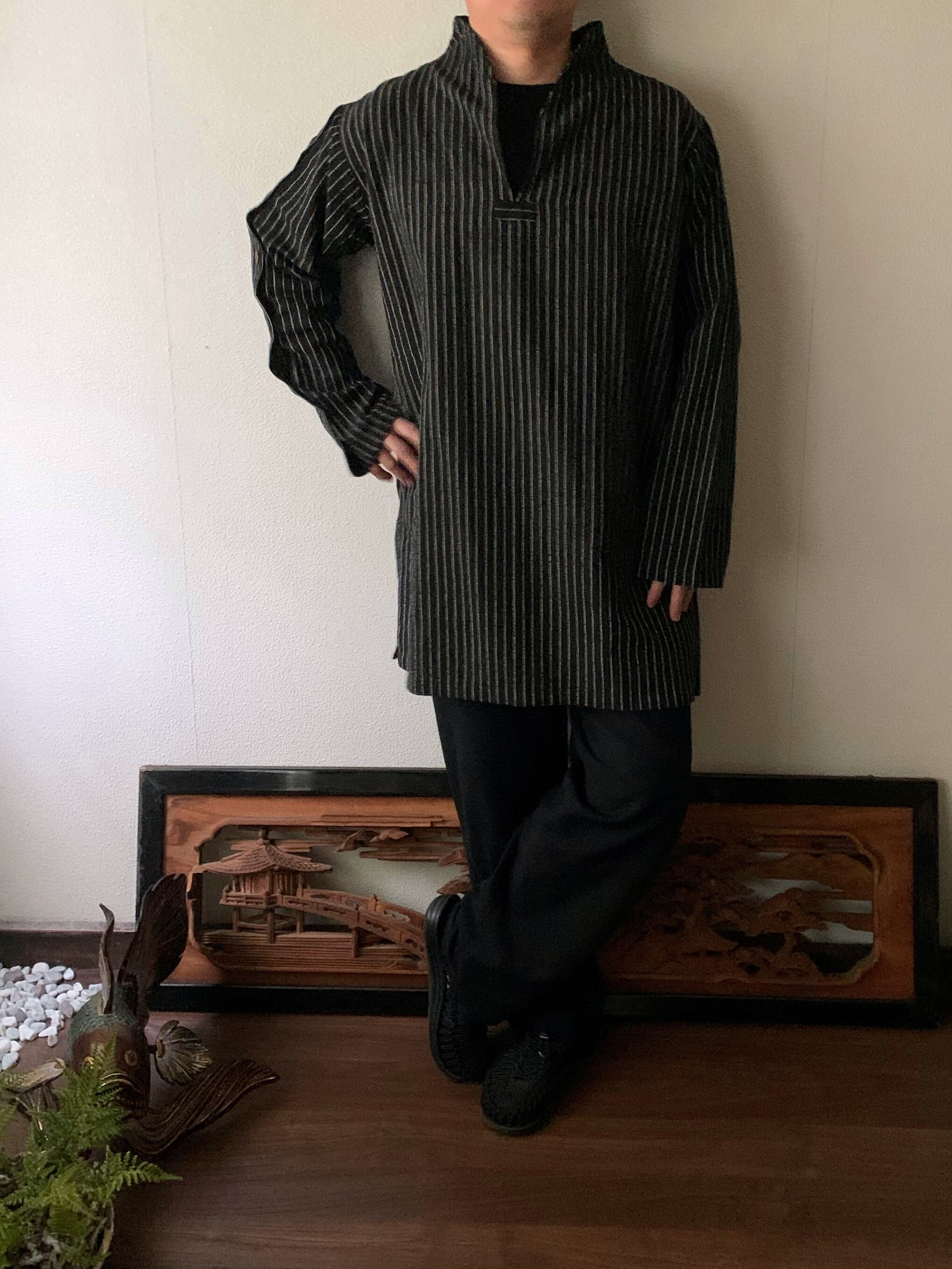 ゆったり身巾と高い襟の手織り綿ブラウス 袖と身頃のサイドボタンでゆったりしているのにすっきりと 黒絣