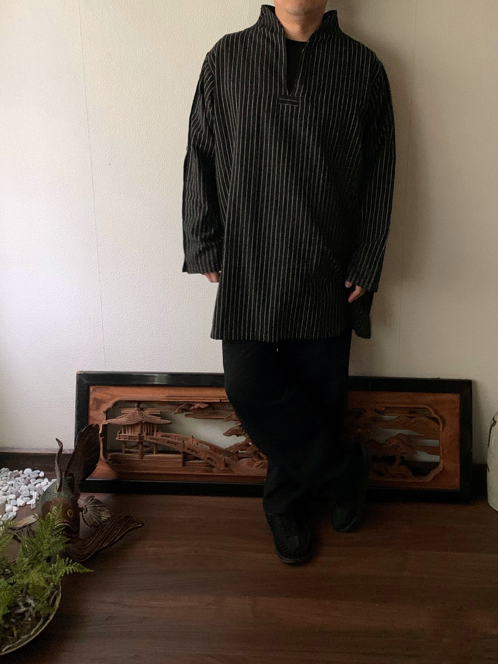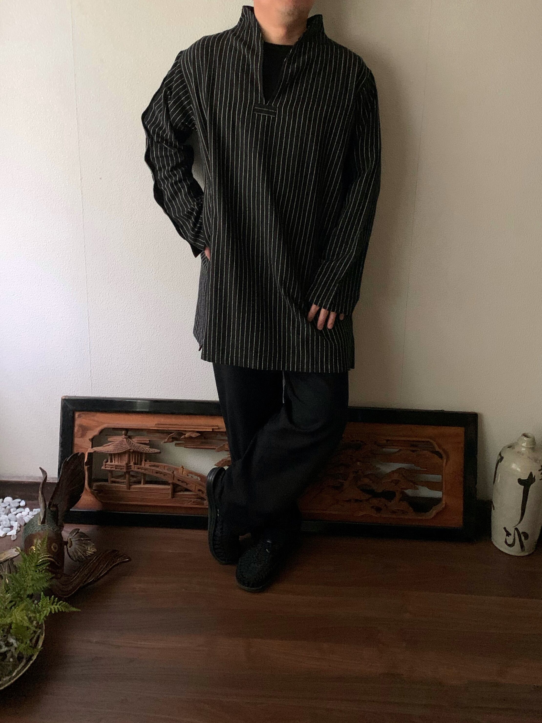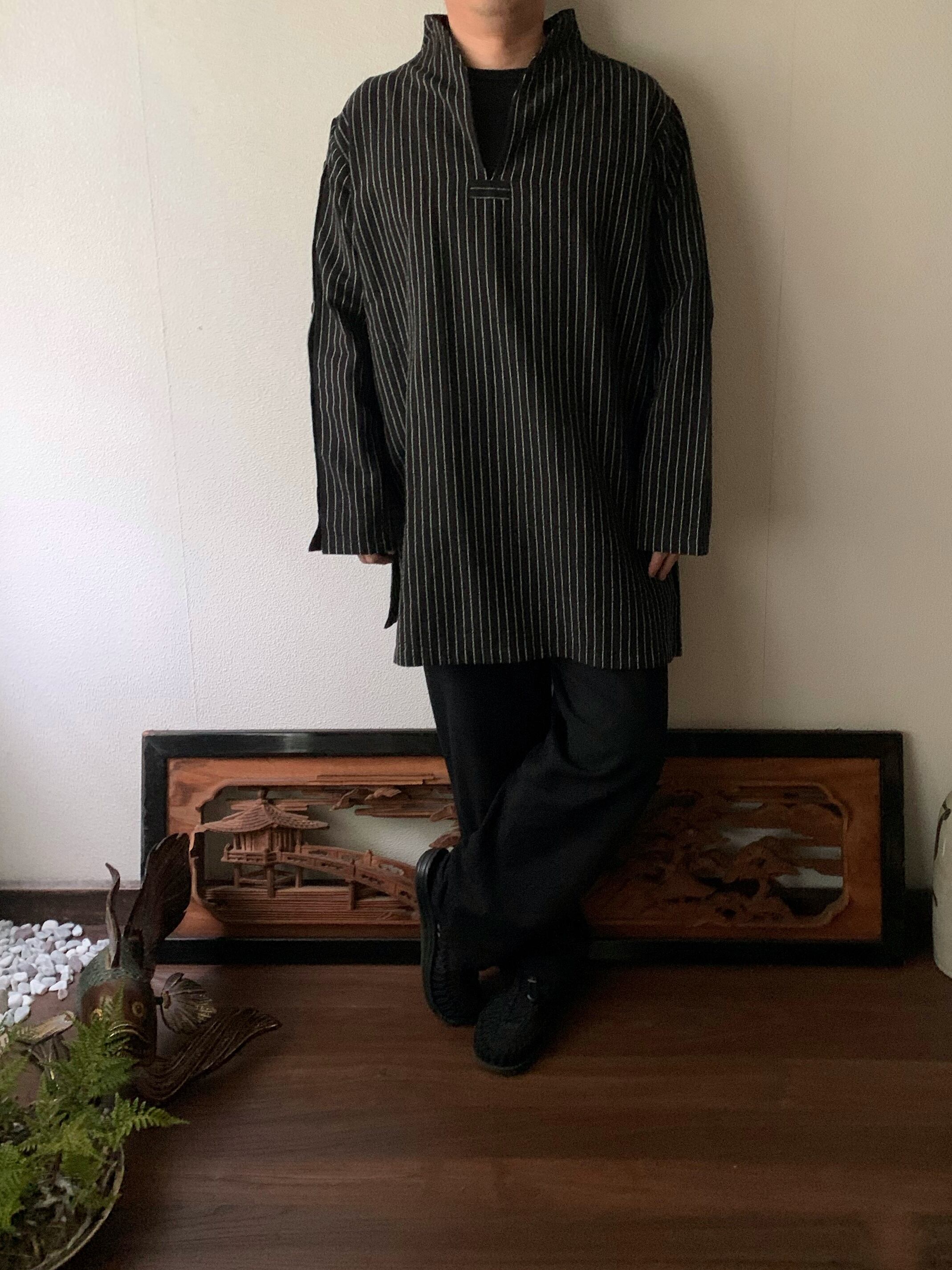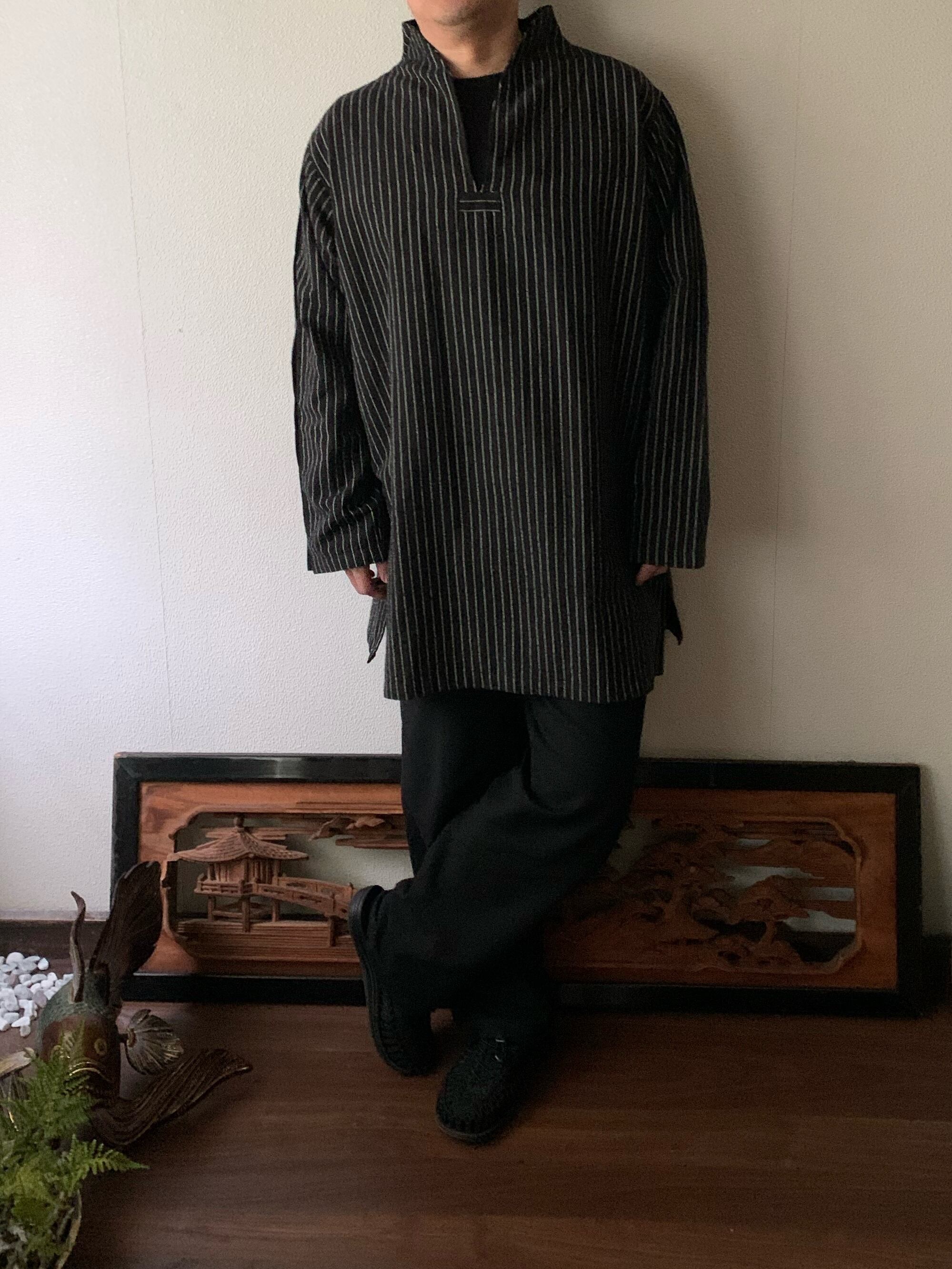 ゆったり身巾と高い襟の手織り綿ブラウス 袖と身頃のサイドボタンでゆったりしているのにすっきりと 黒絣