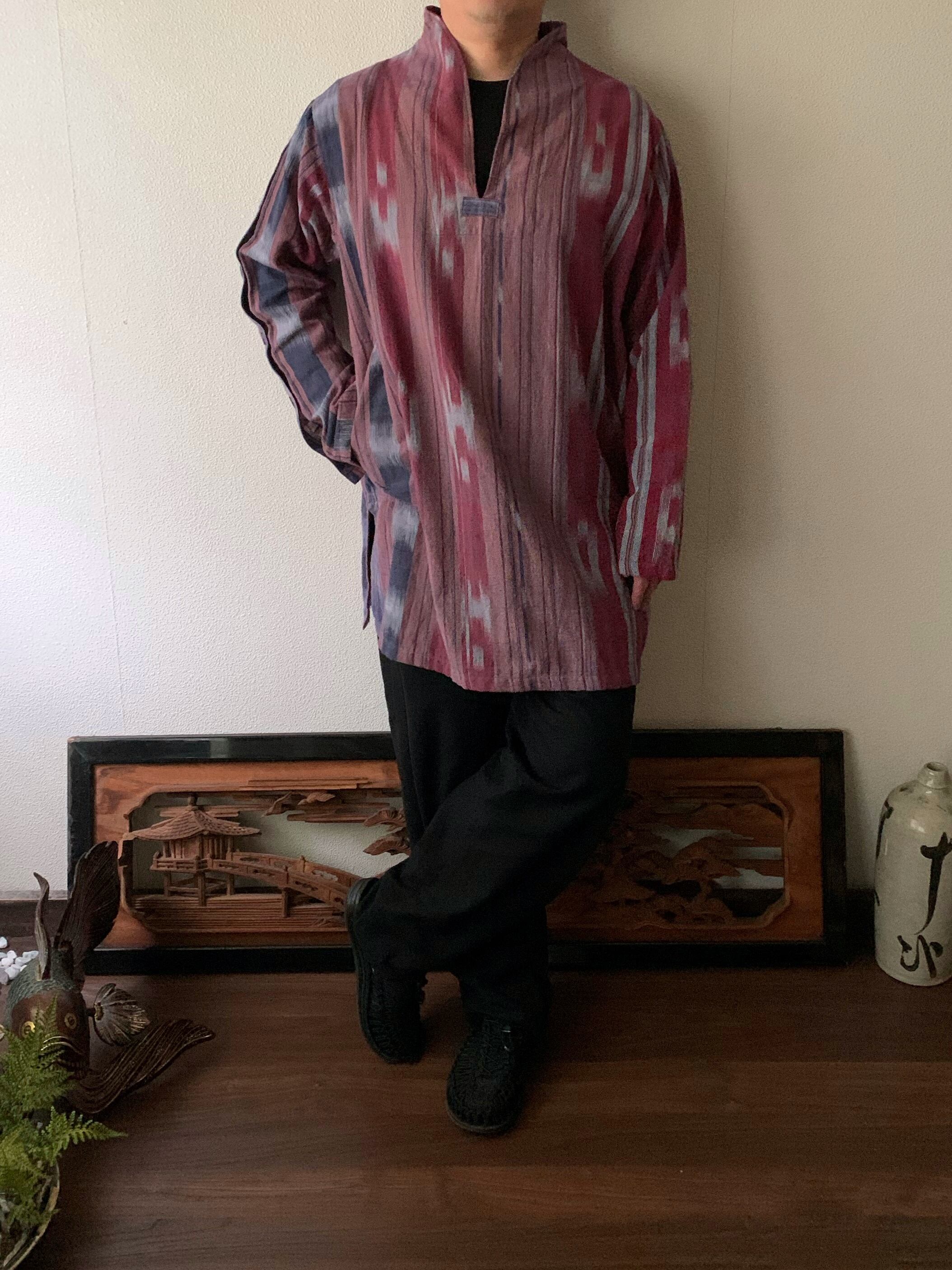 『ゆったり身巾と高い襟の手織り綿ブラウス 袖と身頃のサイドボタンでゆったりしているのにすっきりと』