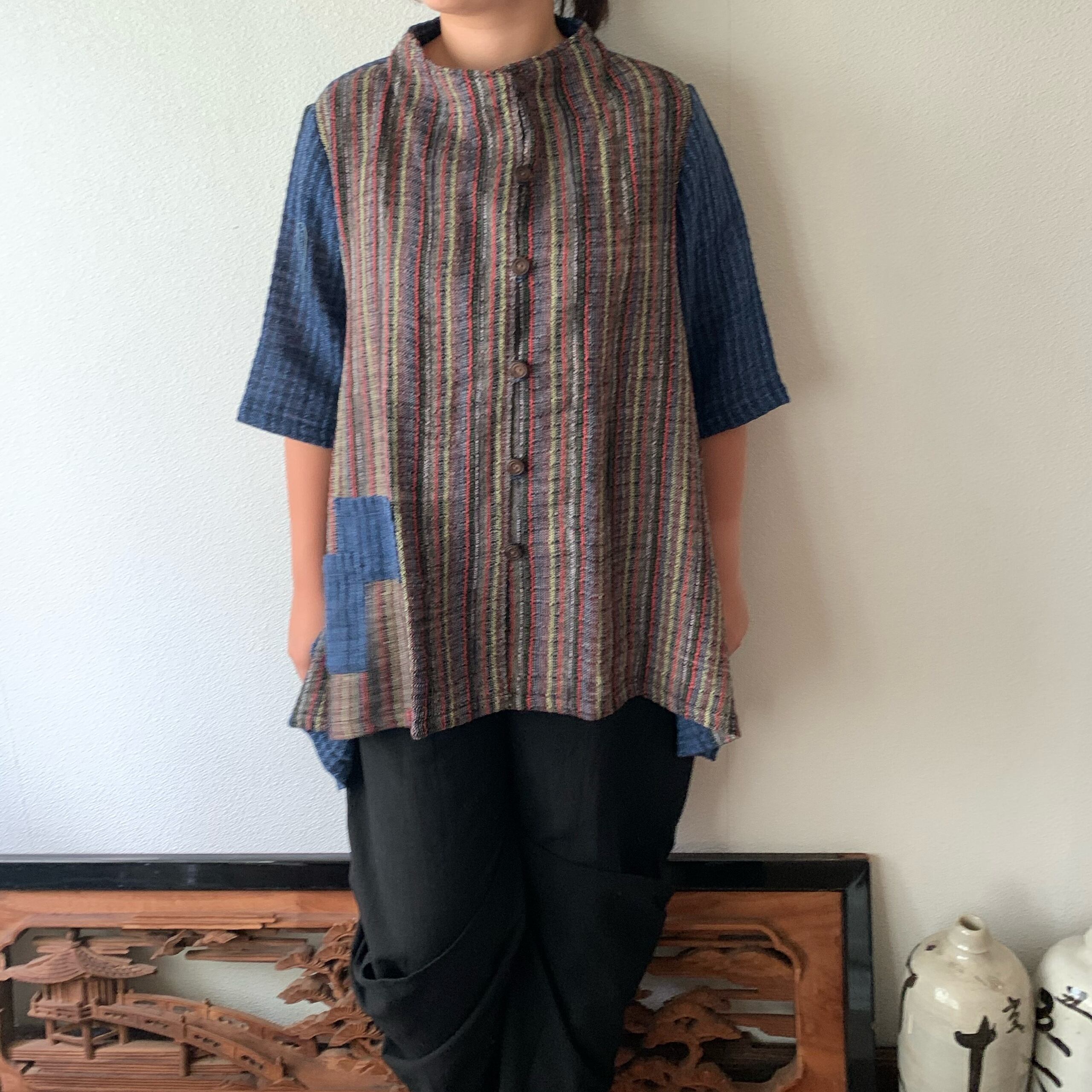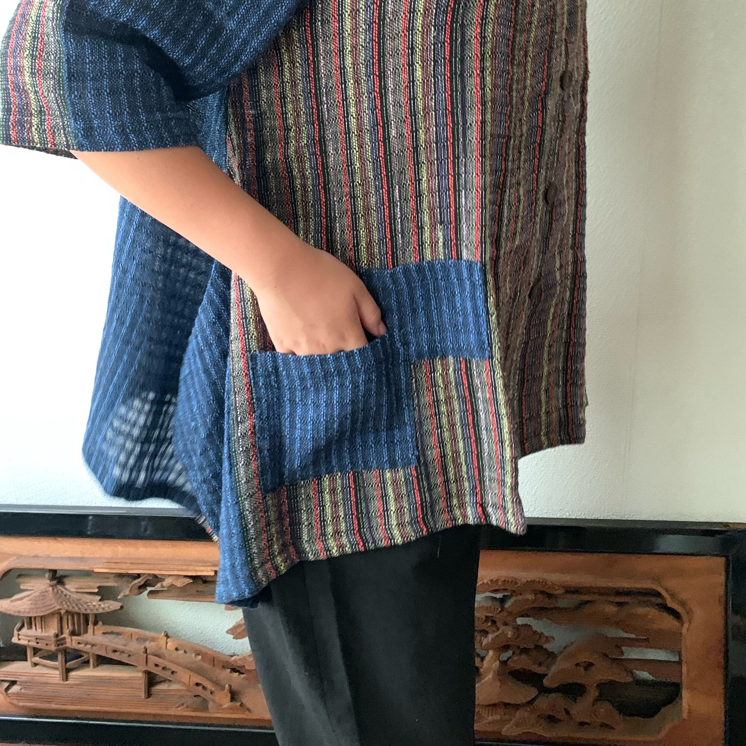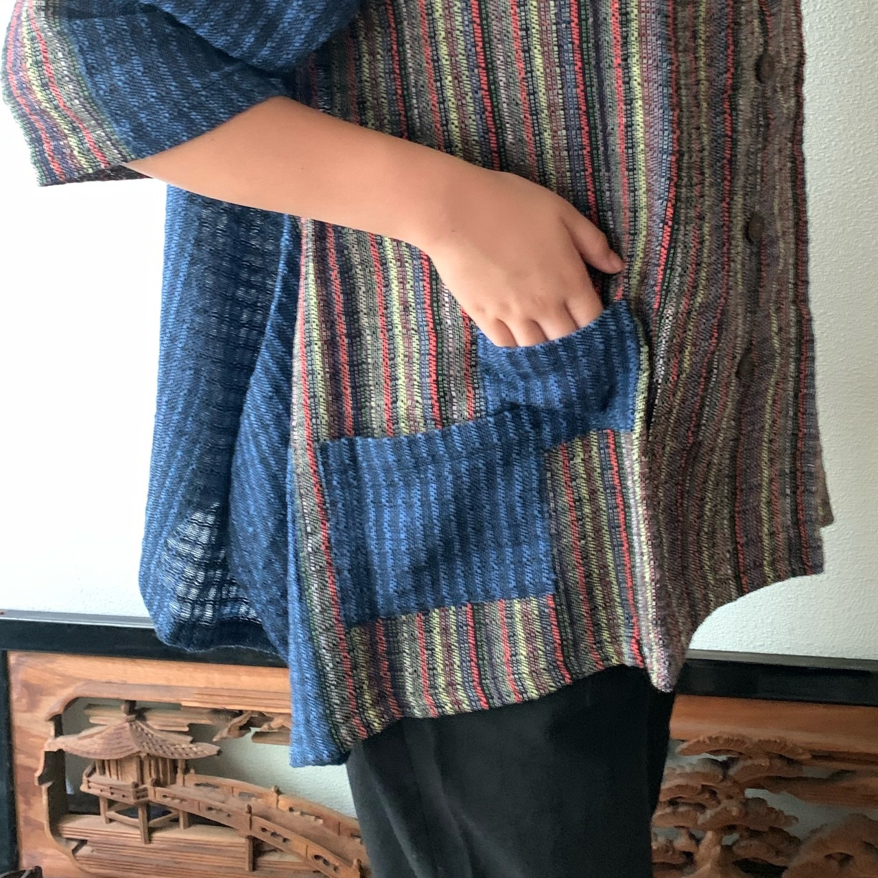 『センターもサイドも裾もポケットもアシンメトリーの手織り綿7分袖ブラウス 裾サイドのスリットで躍動感のあるデザインで』
