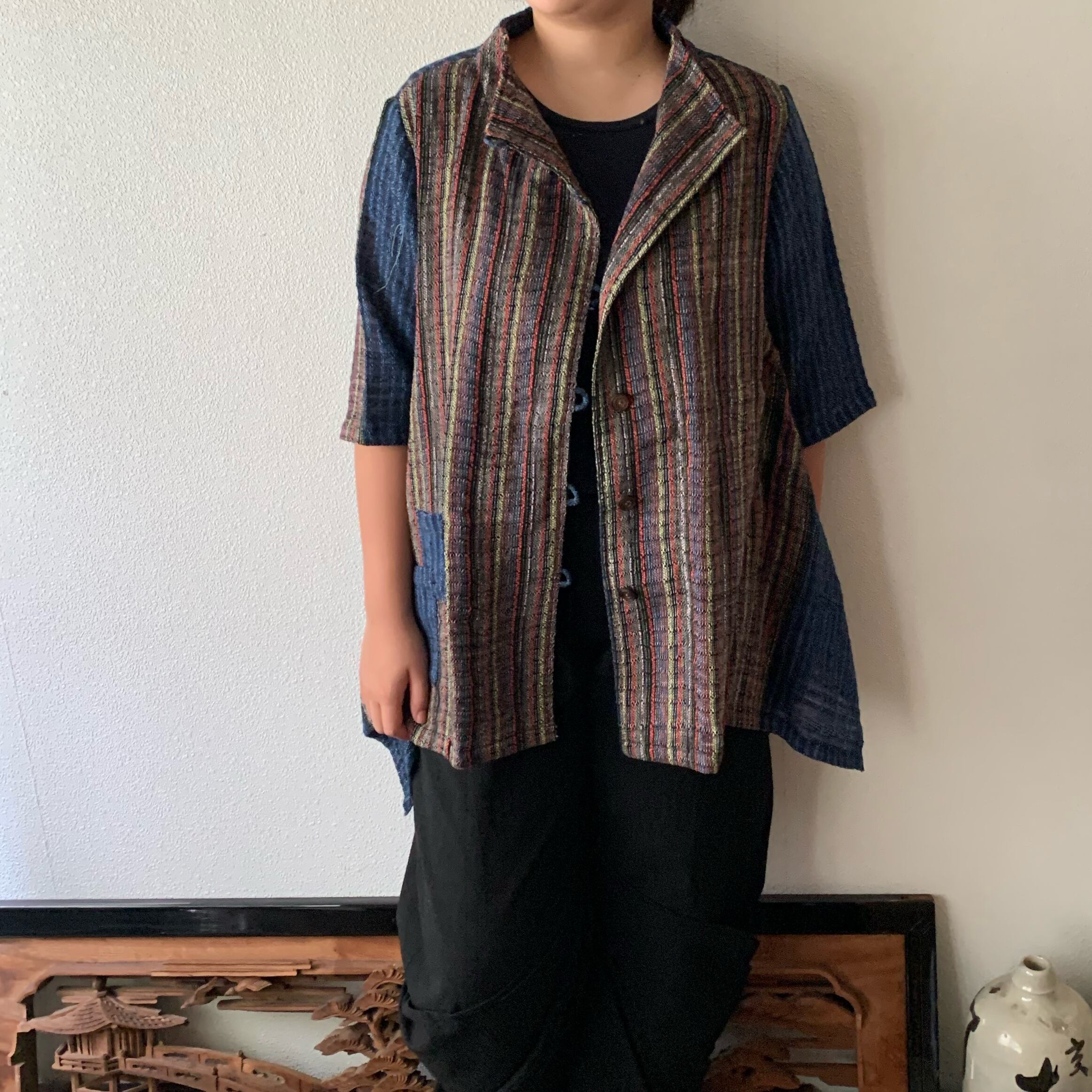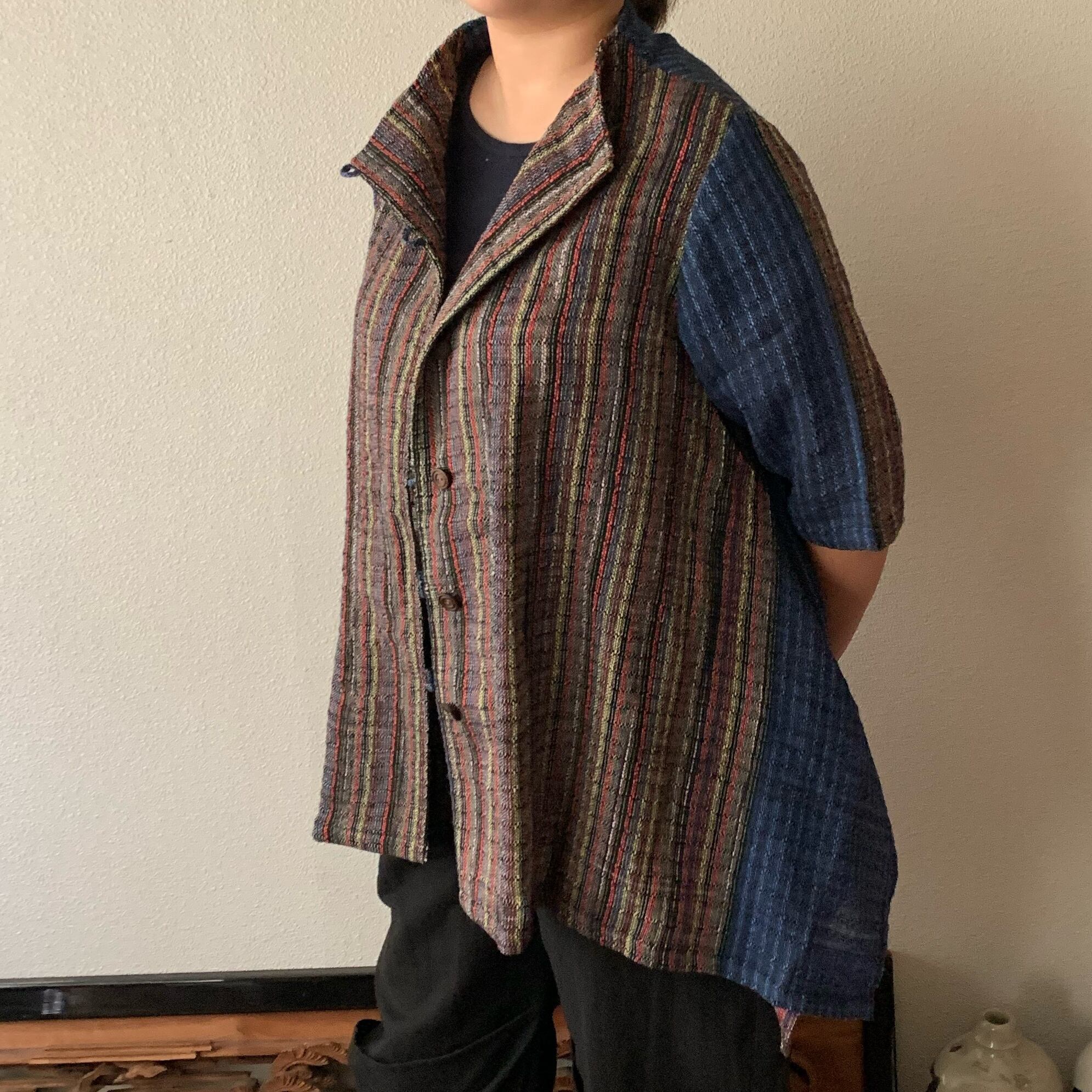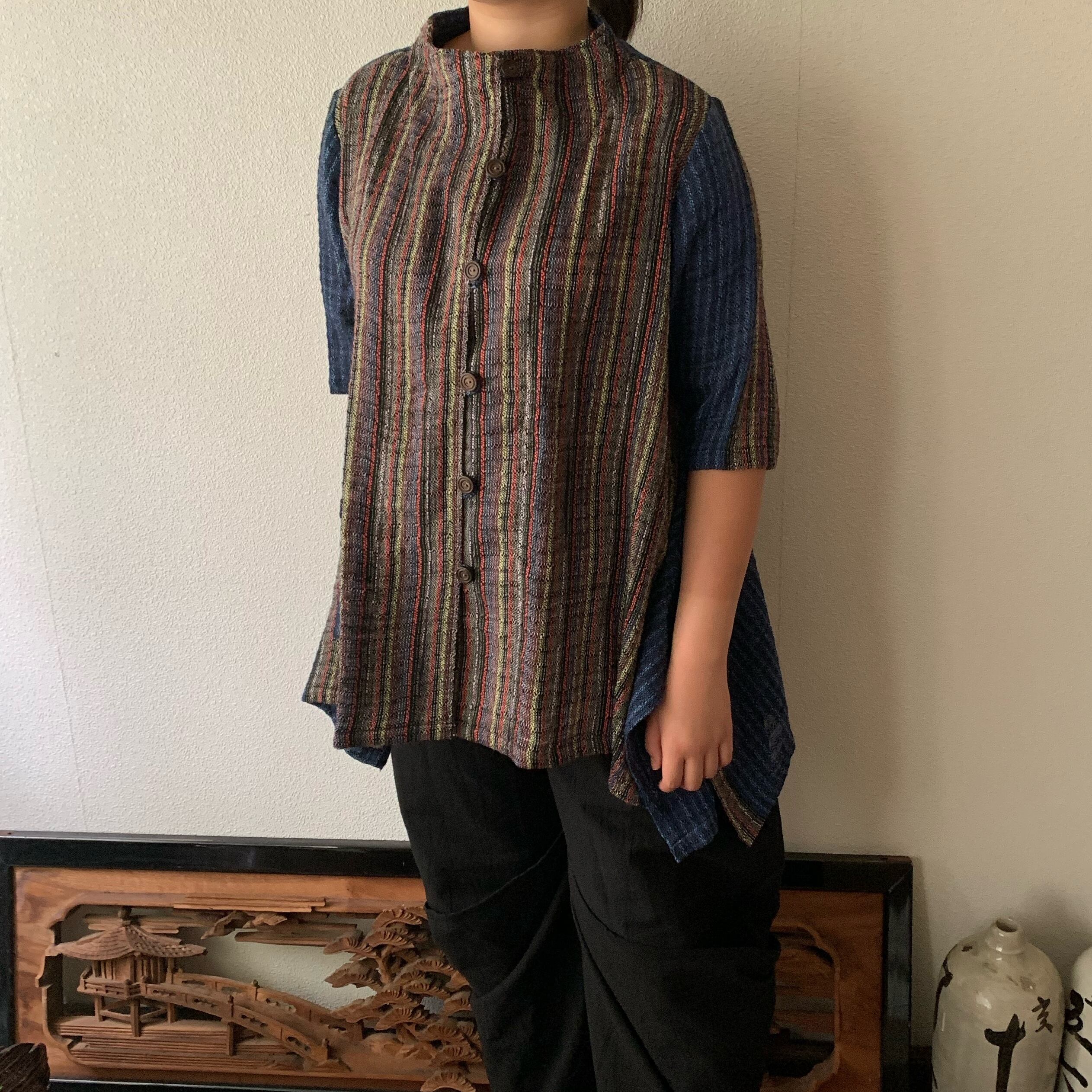 『センターもサイドも裾もポケットもアシンメトリーの手織り綿7分袖ブラウス 裾サイドのスリットで躍動感のあるデザインで』