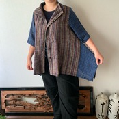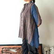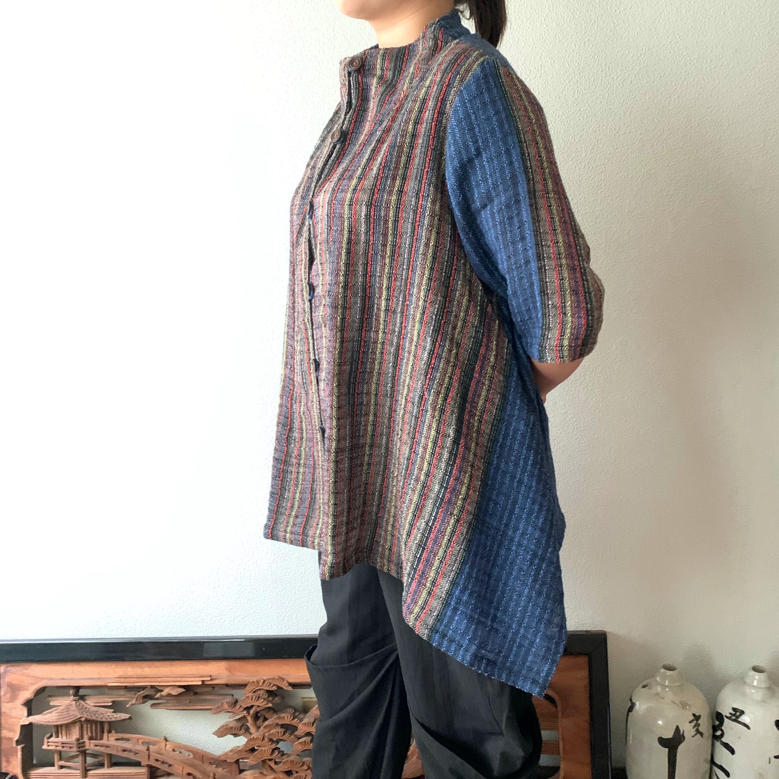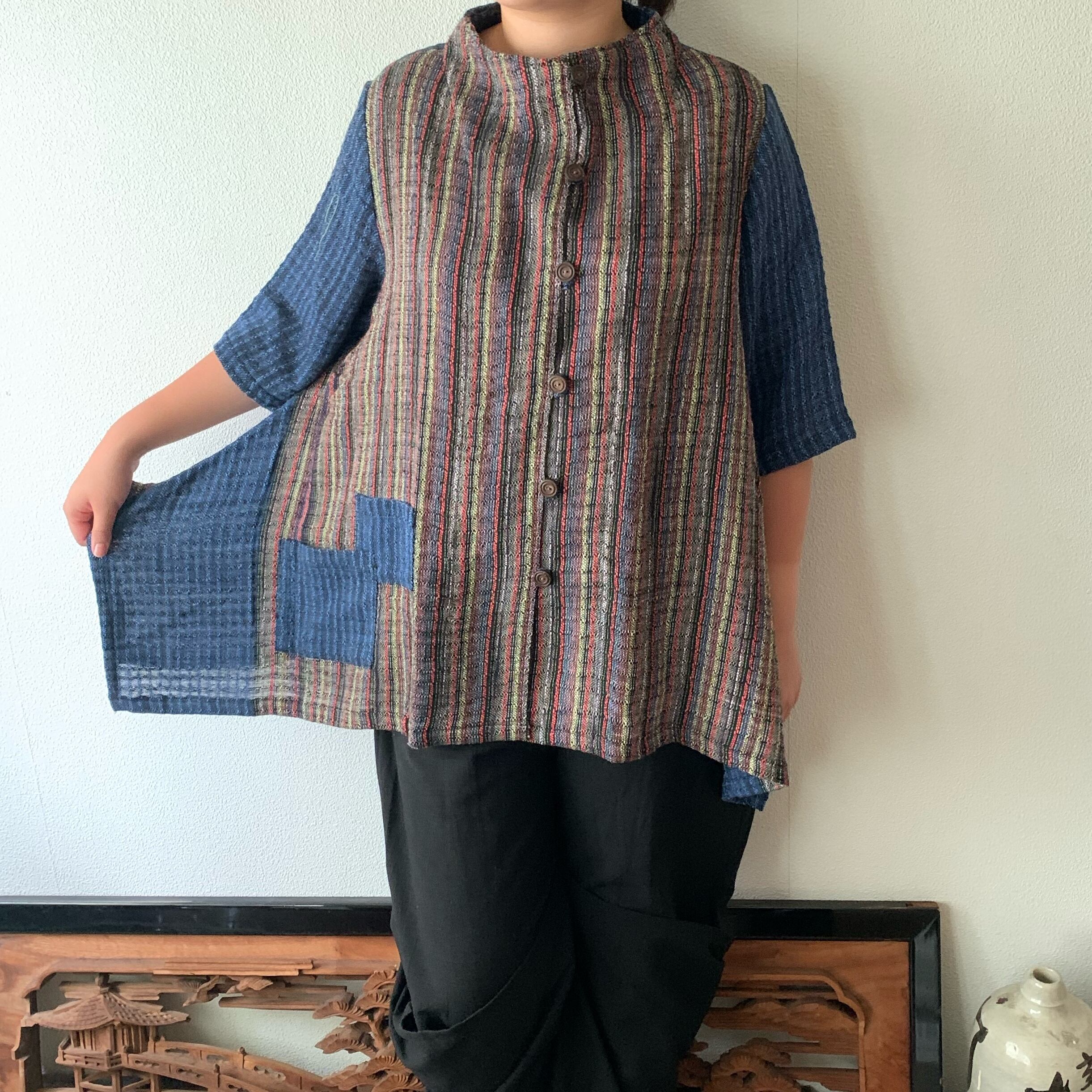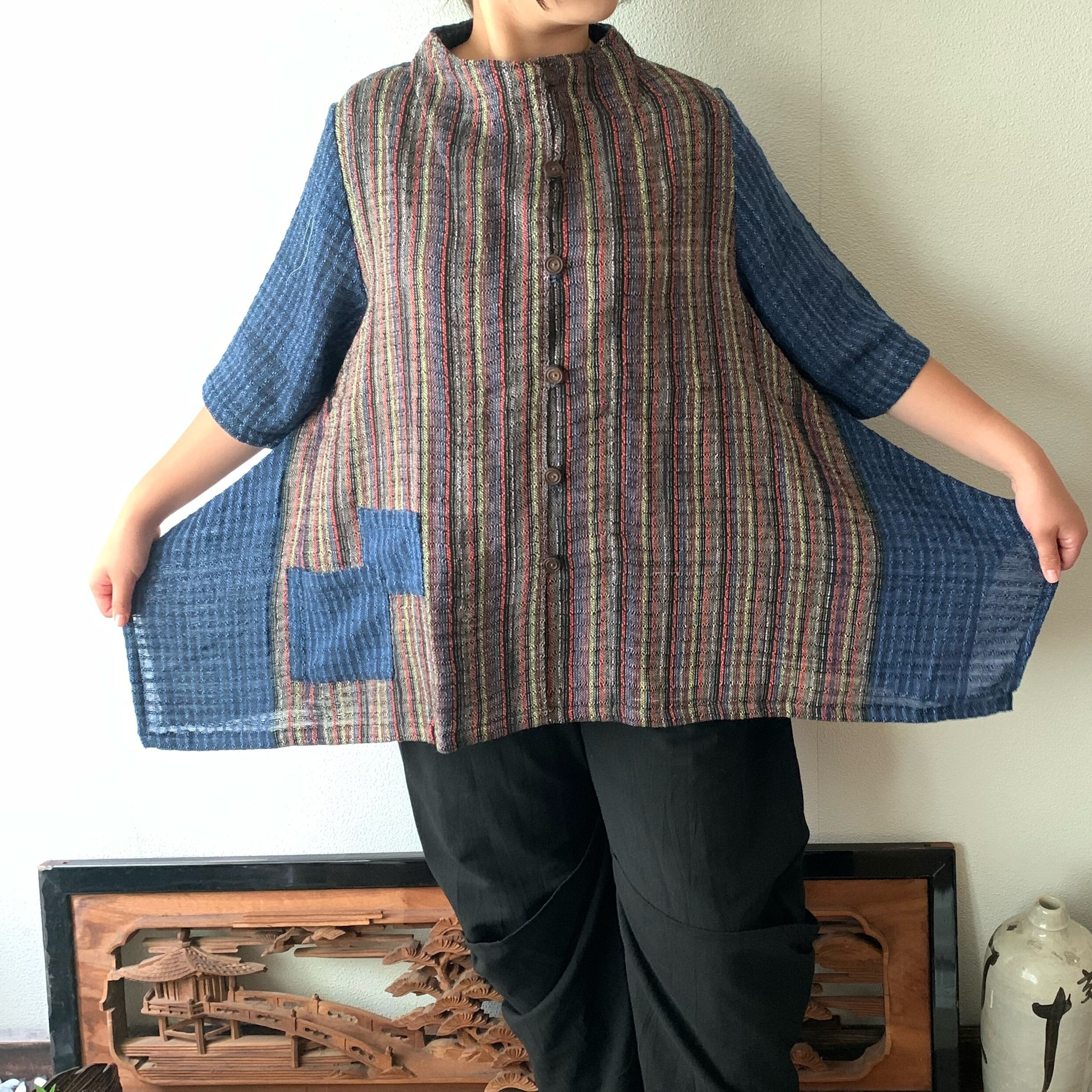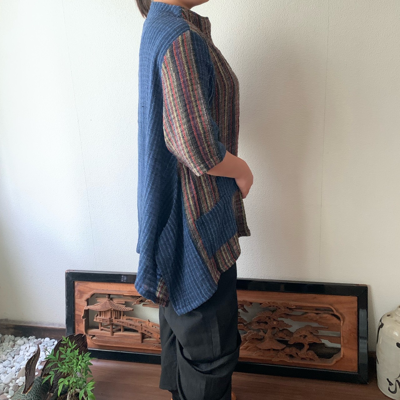 センターもサイドも裾もポケットもアシンメトリーの手織り綿7分袖ブラウス 裾サイドのスリットで躍動感のあるデザインで 青ミックス絣