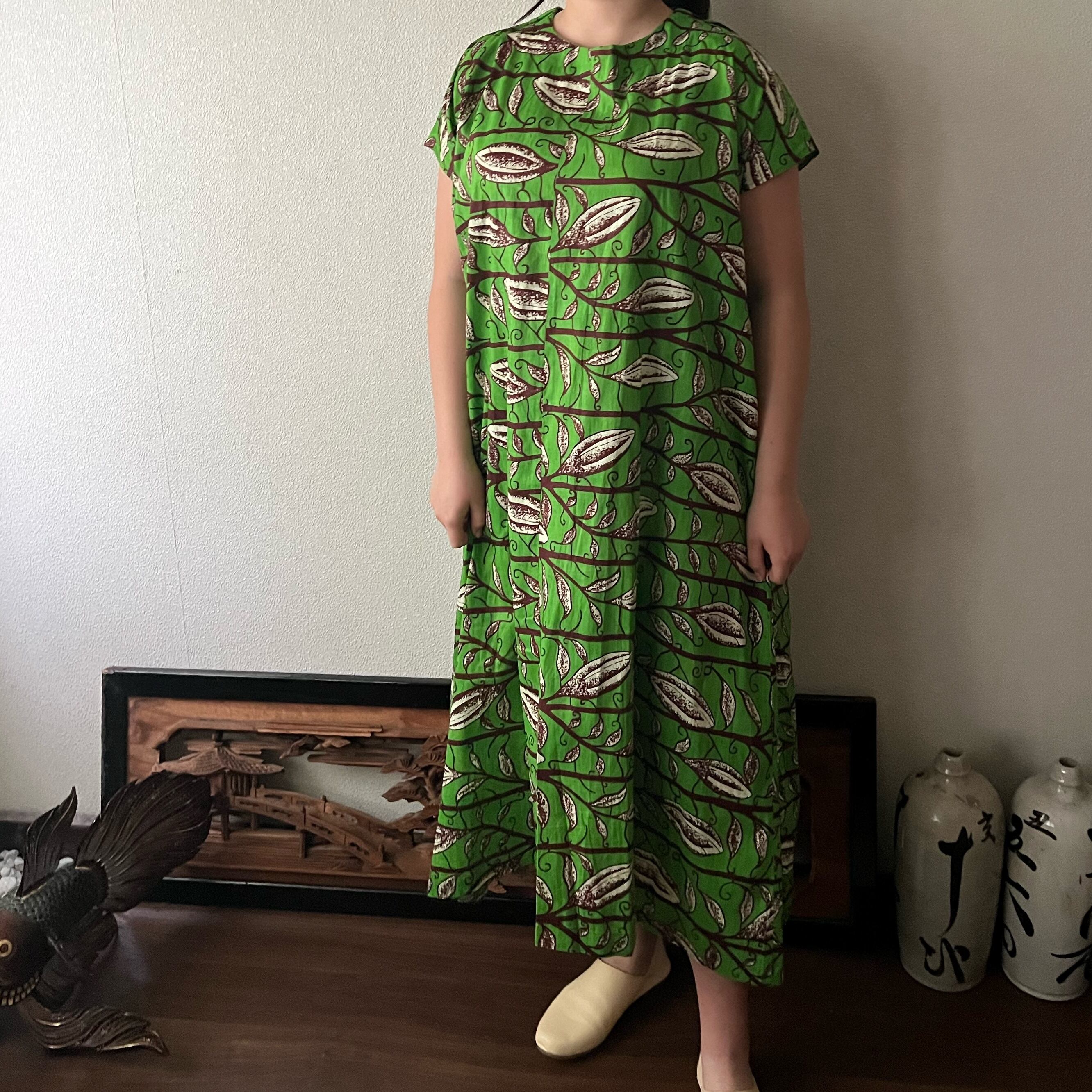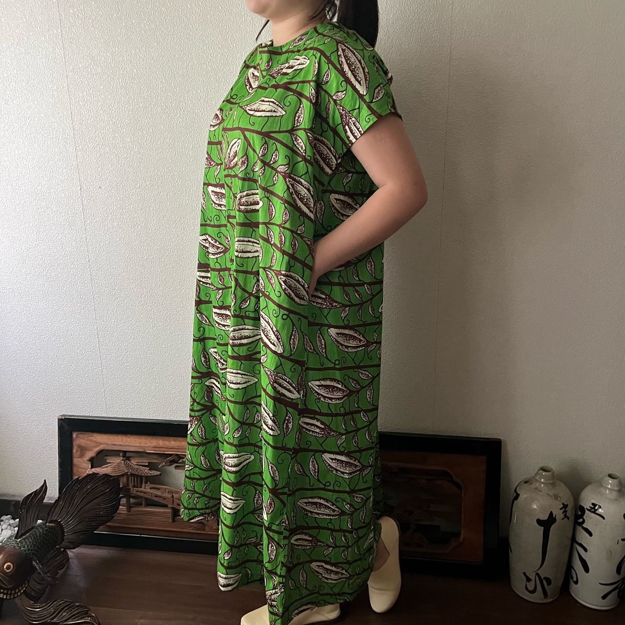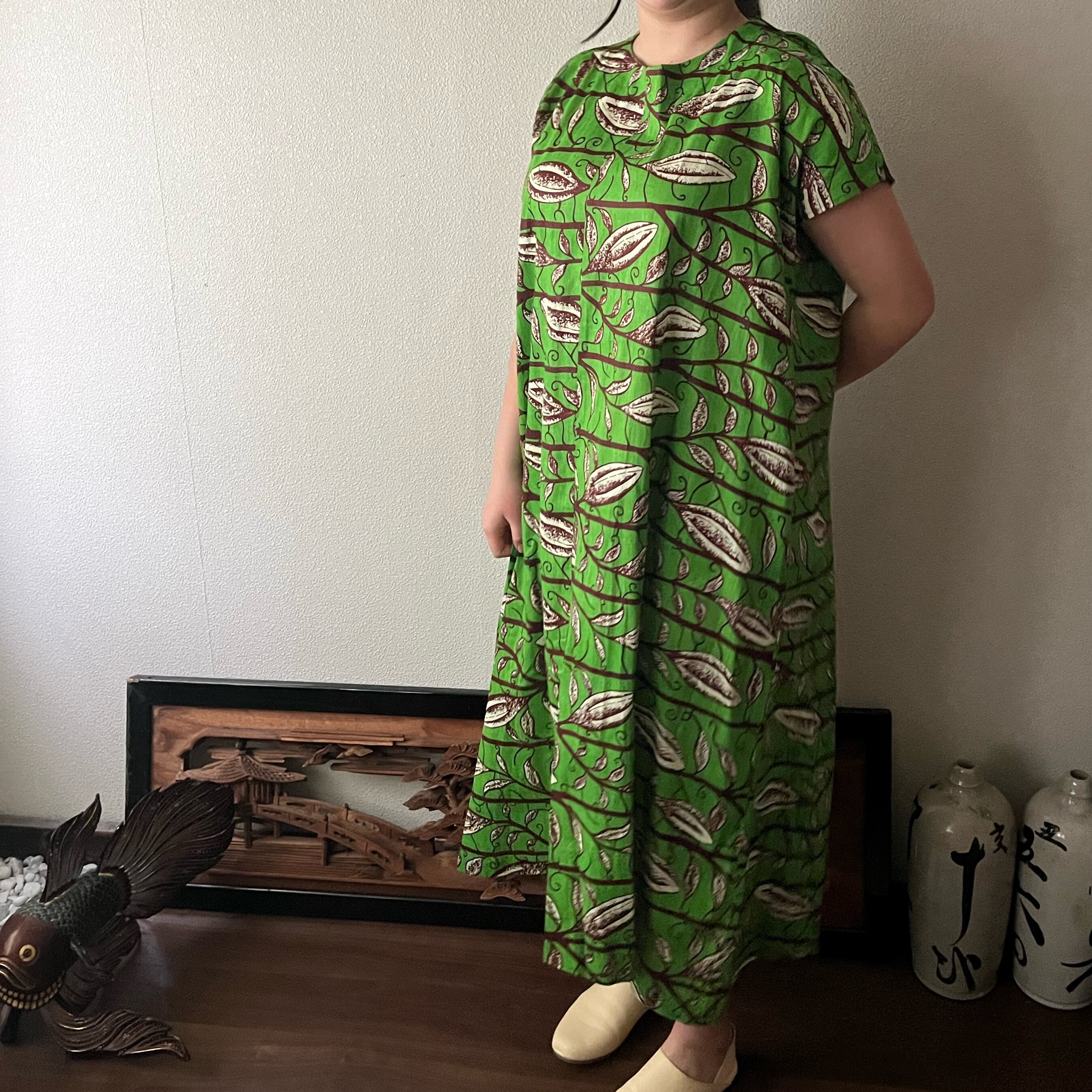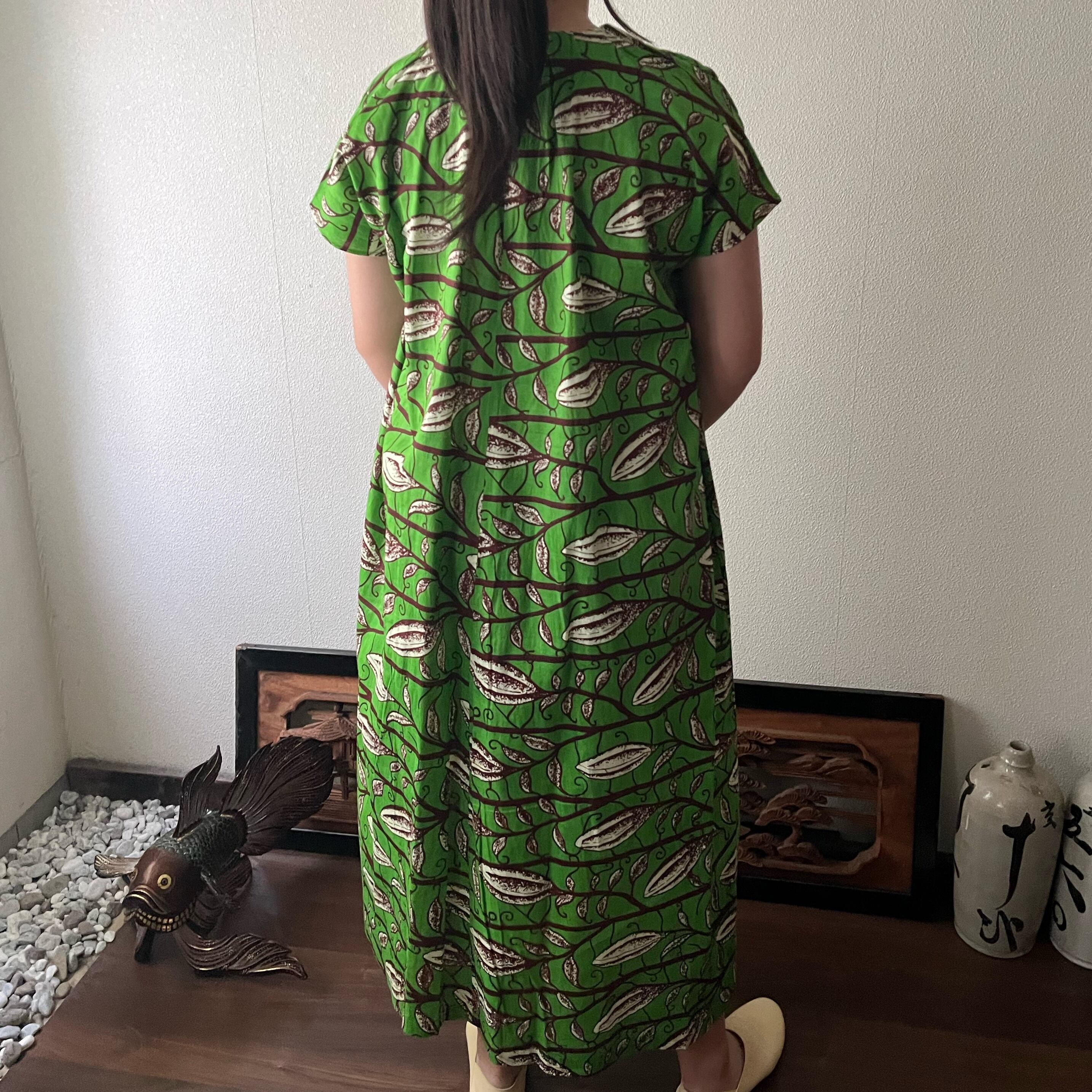 アフリカンバティック柄ネック後ろゴムで着やすいゆったりワンピース ふわっとした着こなしで柄を楽しむ 植物柄緑