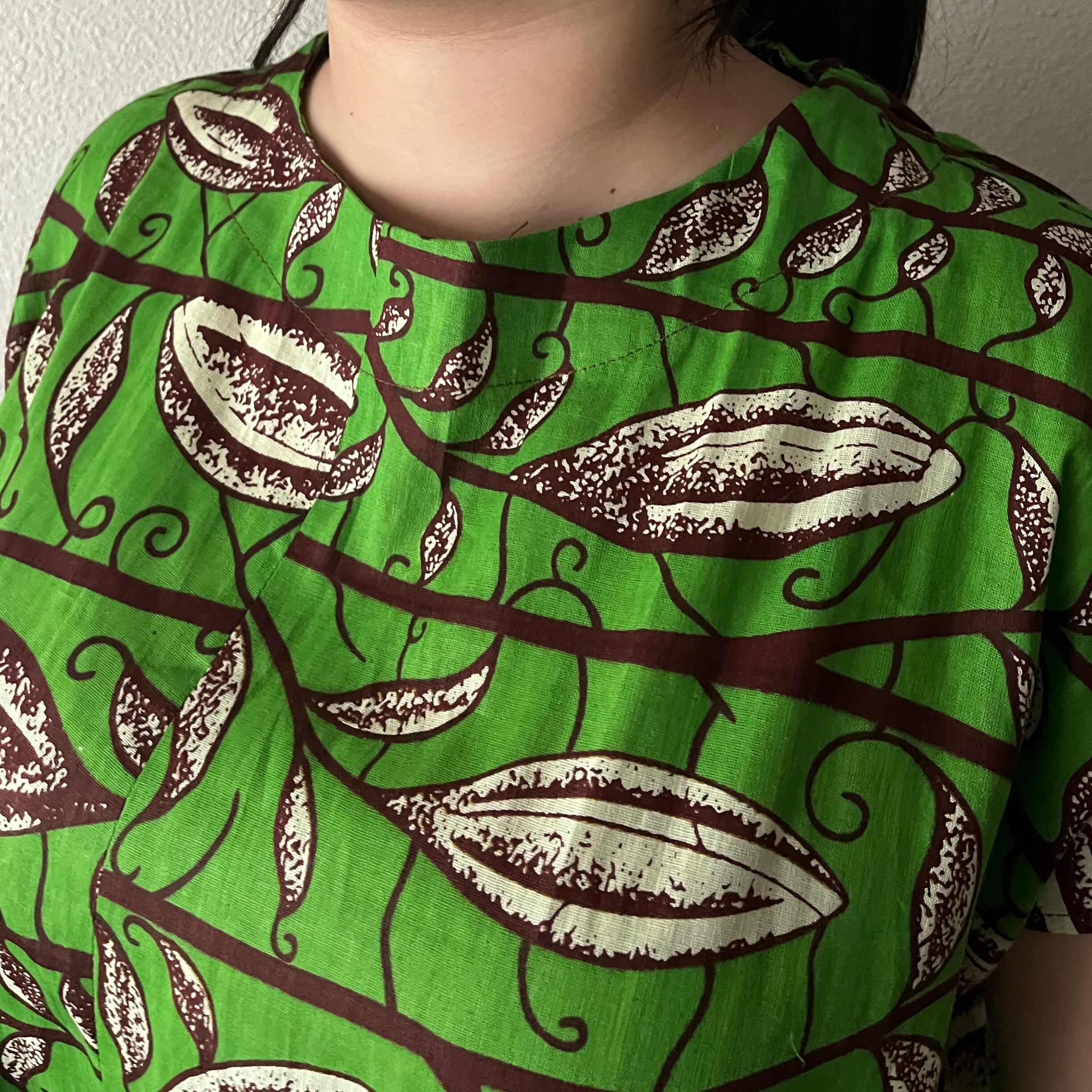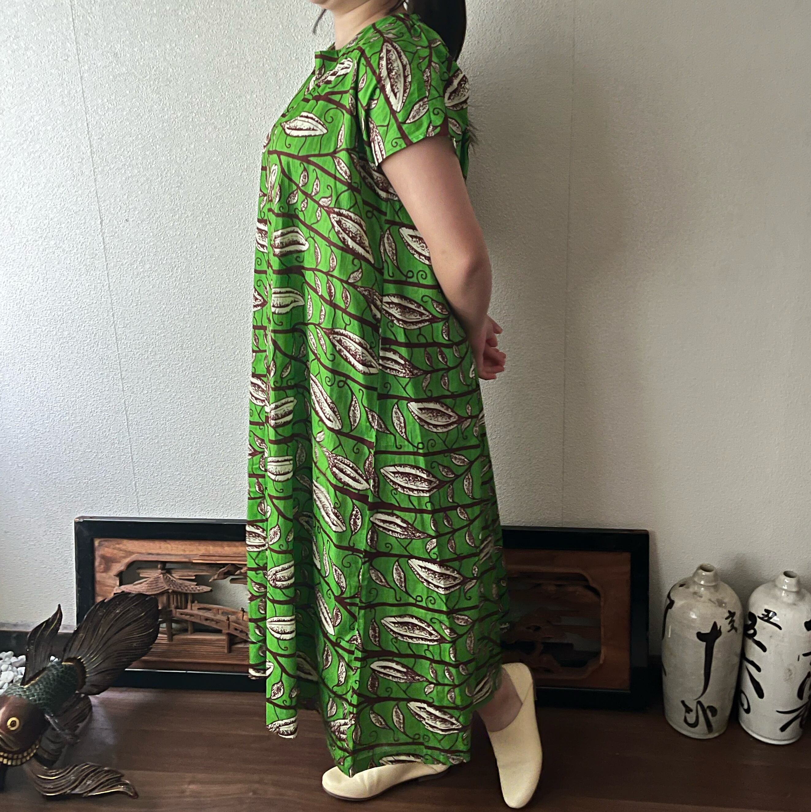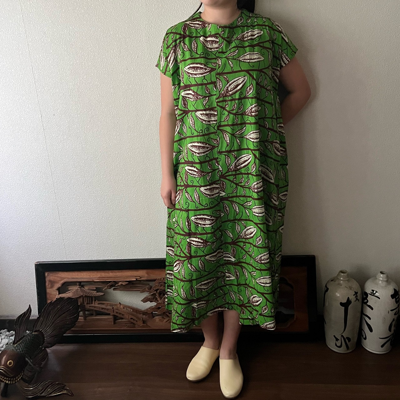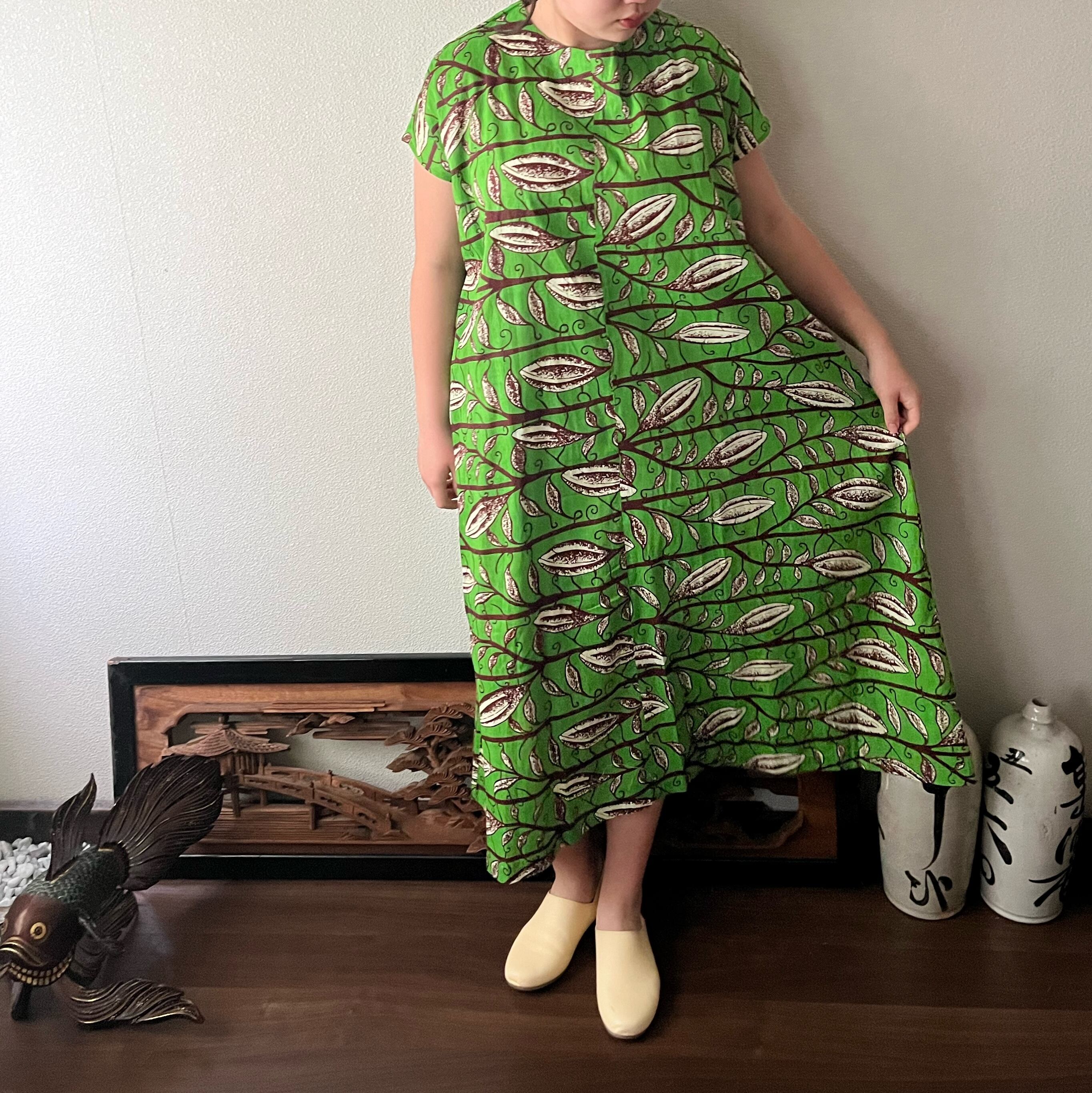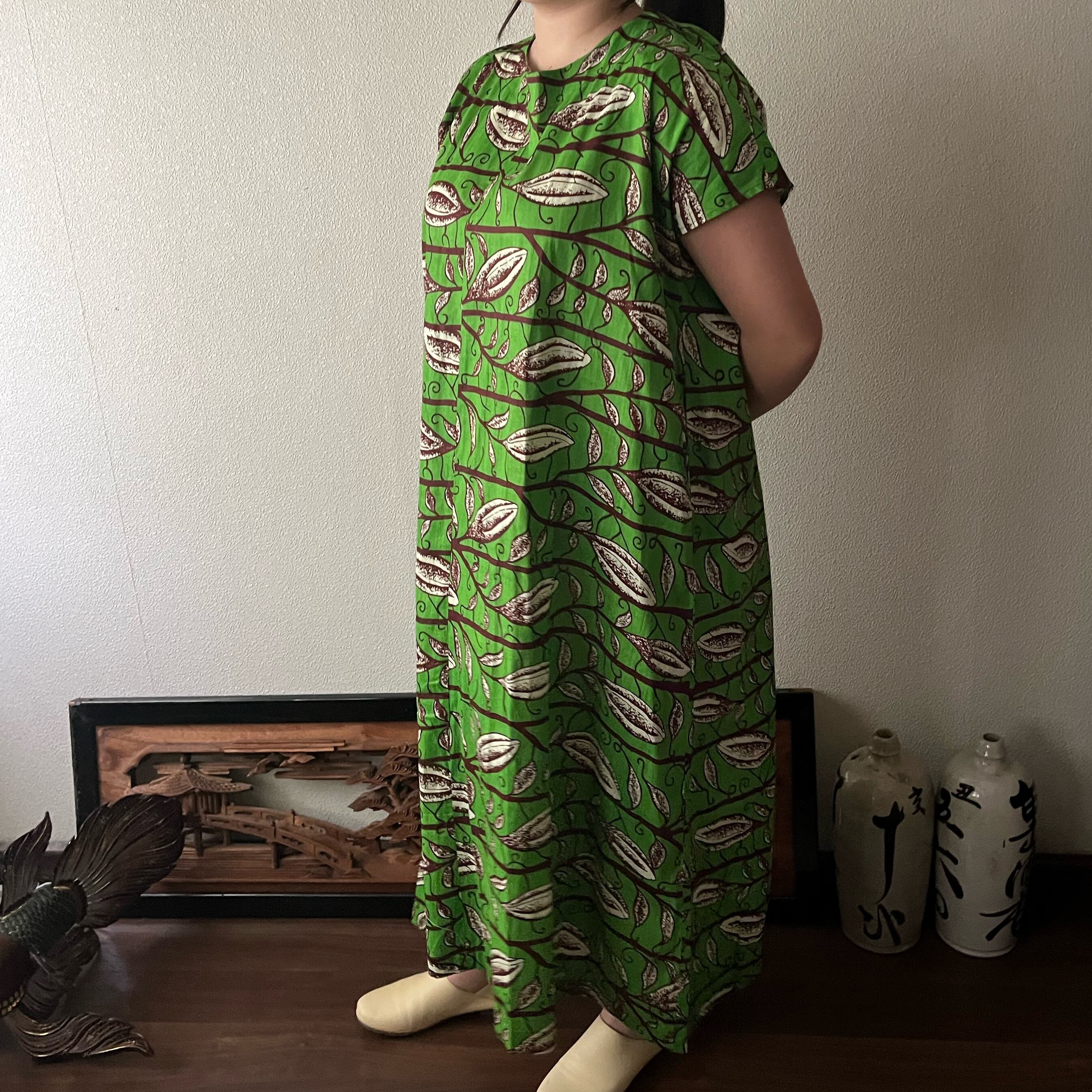 アフリカンバティック柄ネック後ろゴムで着やすいゆったりワンピース ふわっとした着こなしで柄を楽しむ 植物柄緑