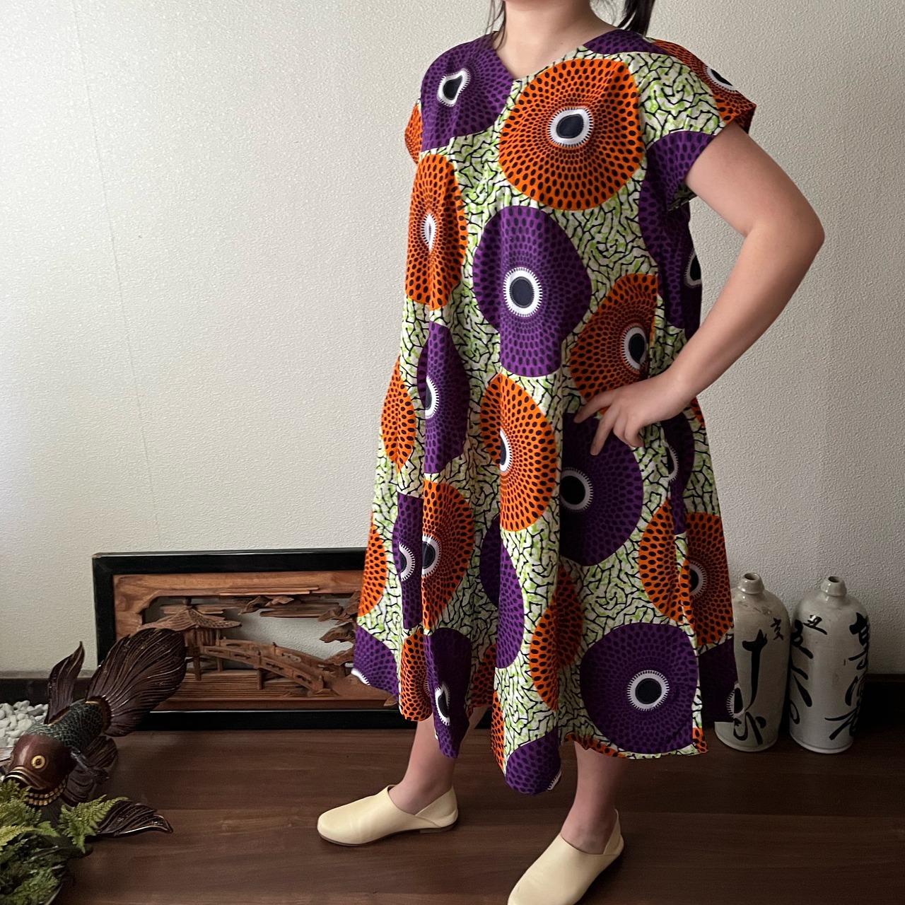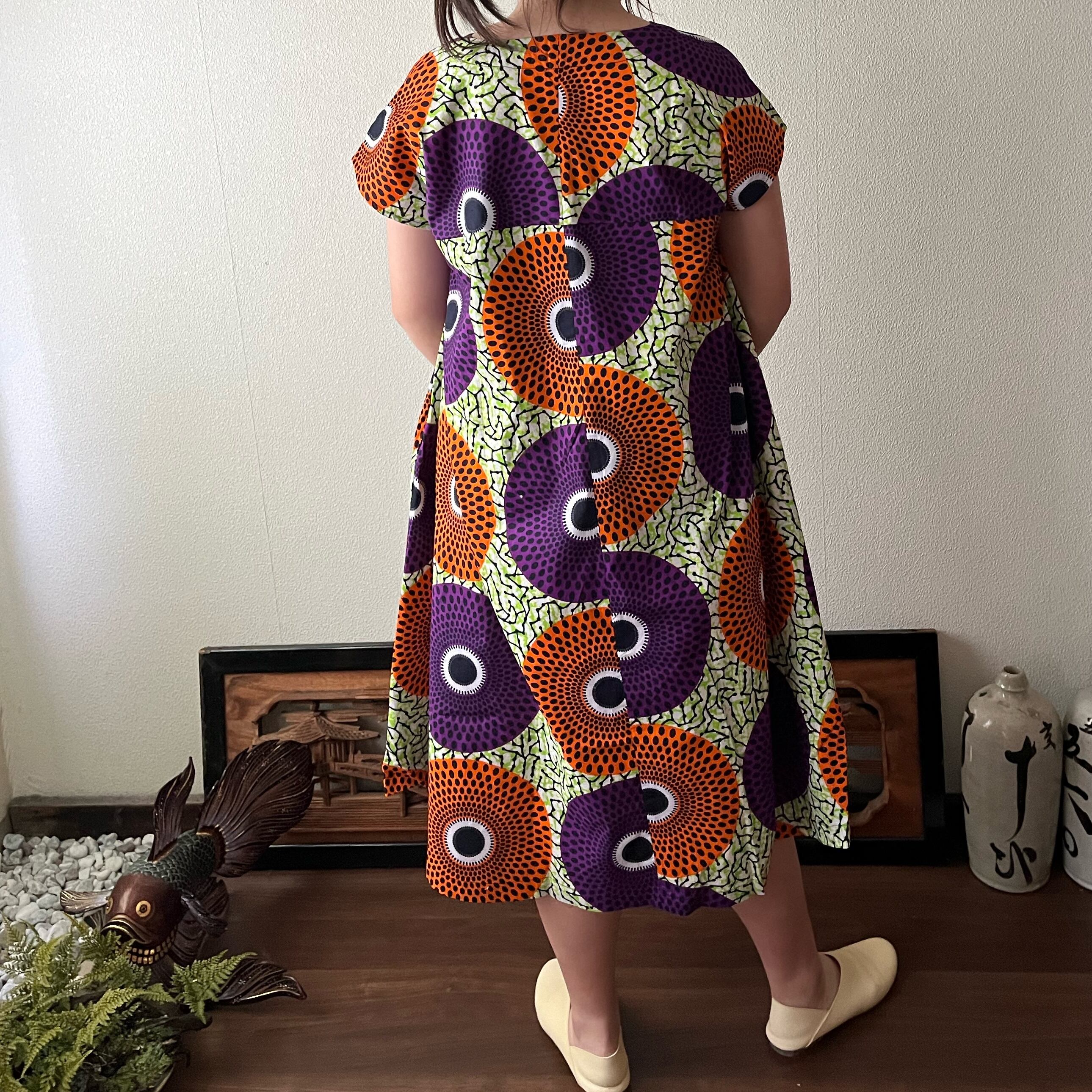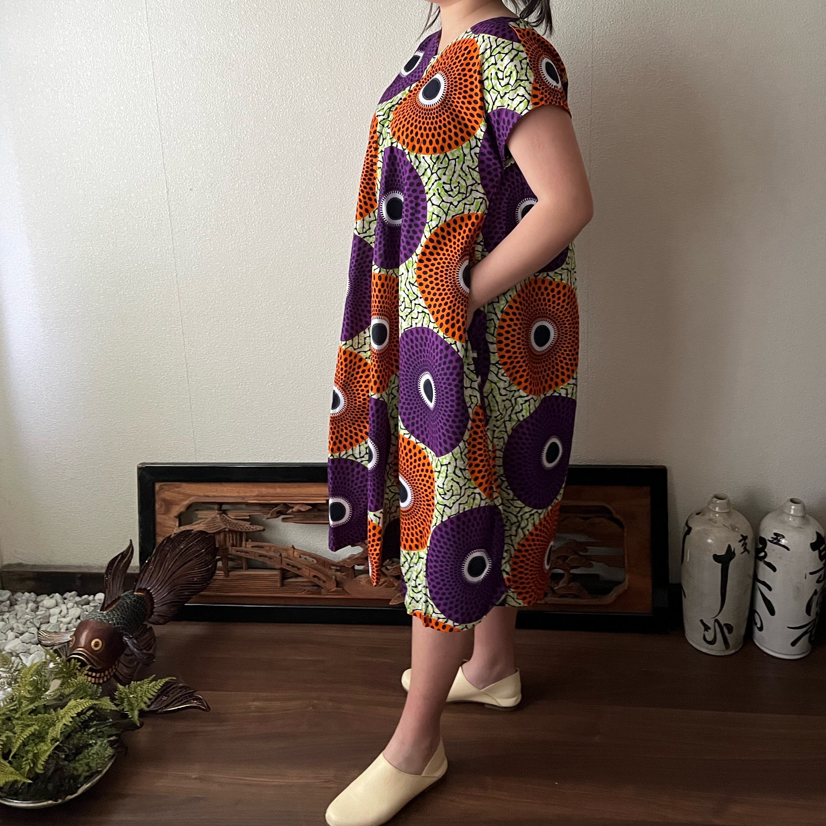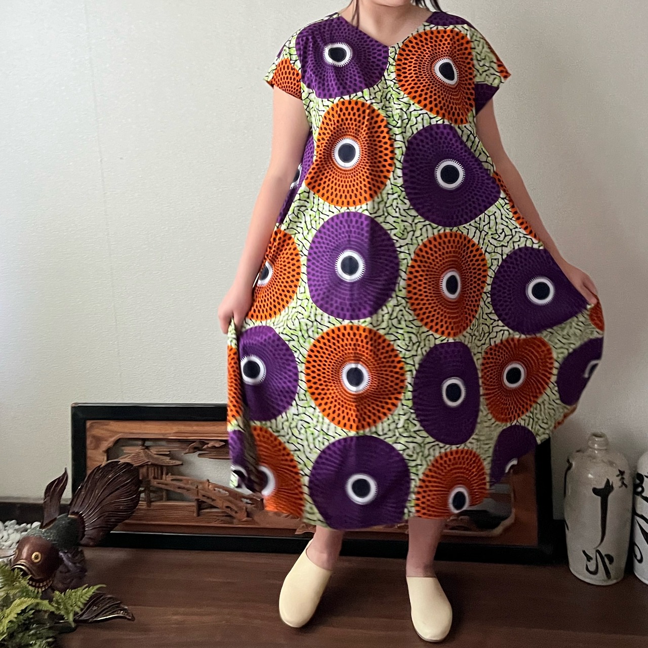 アフリカンバティック柄VネックのAラインワンピース シンプルな形で柄を楽しむ 波紋柄紫オレンジ