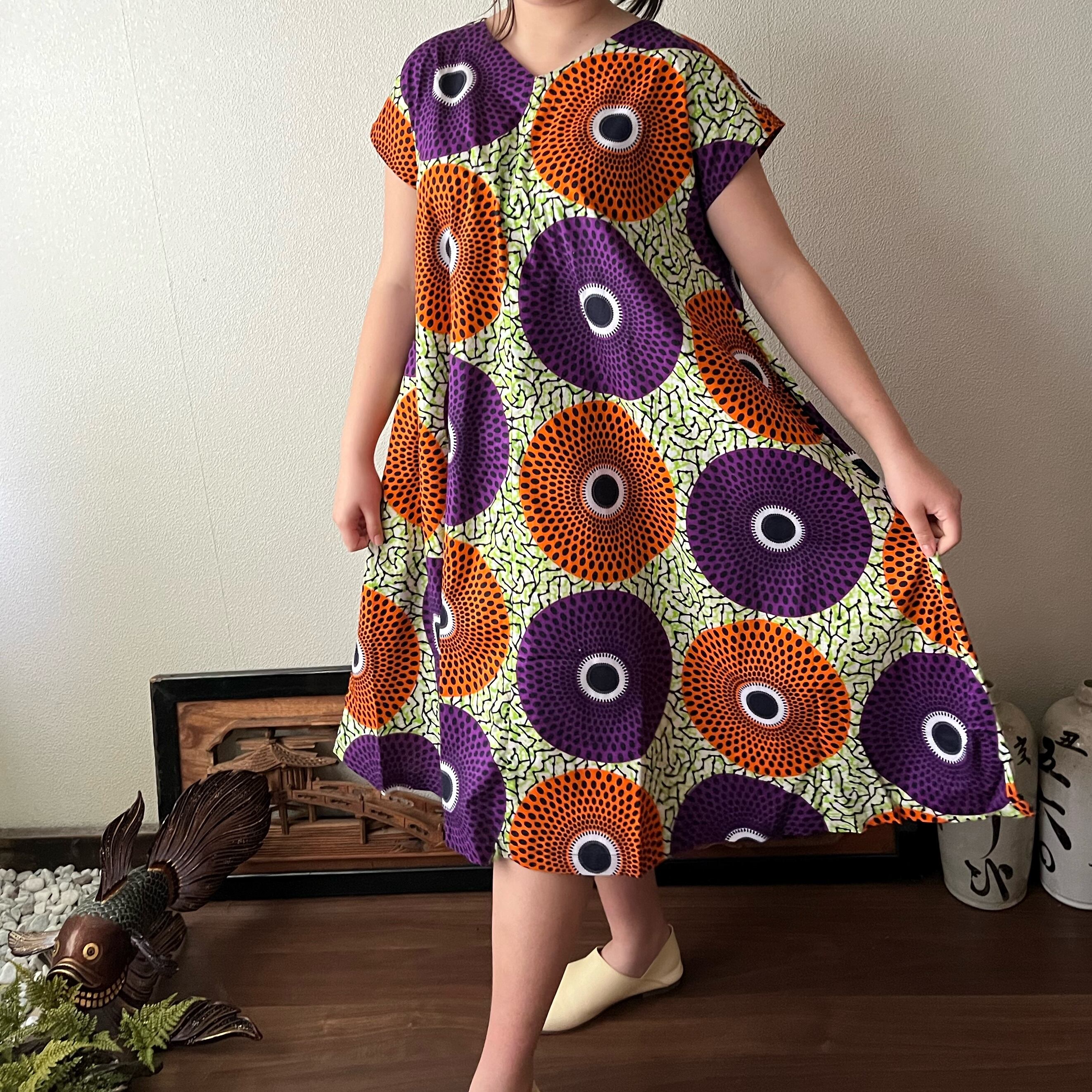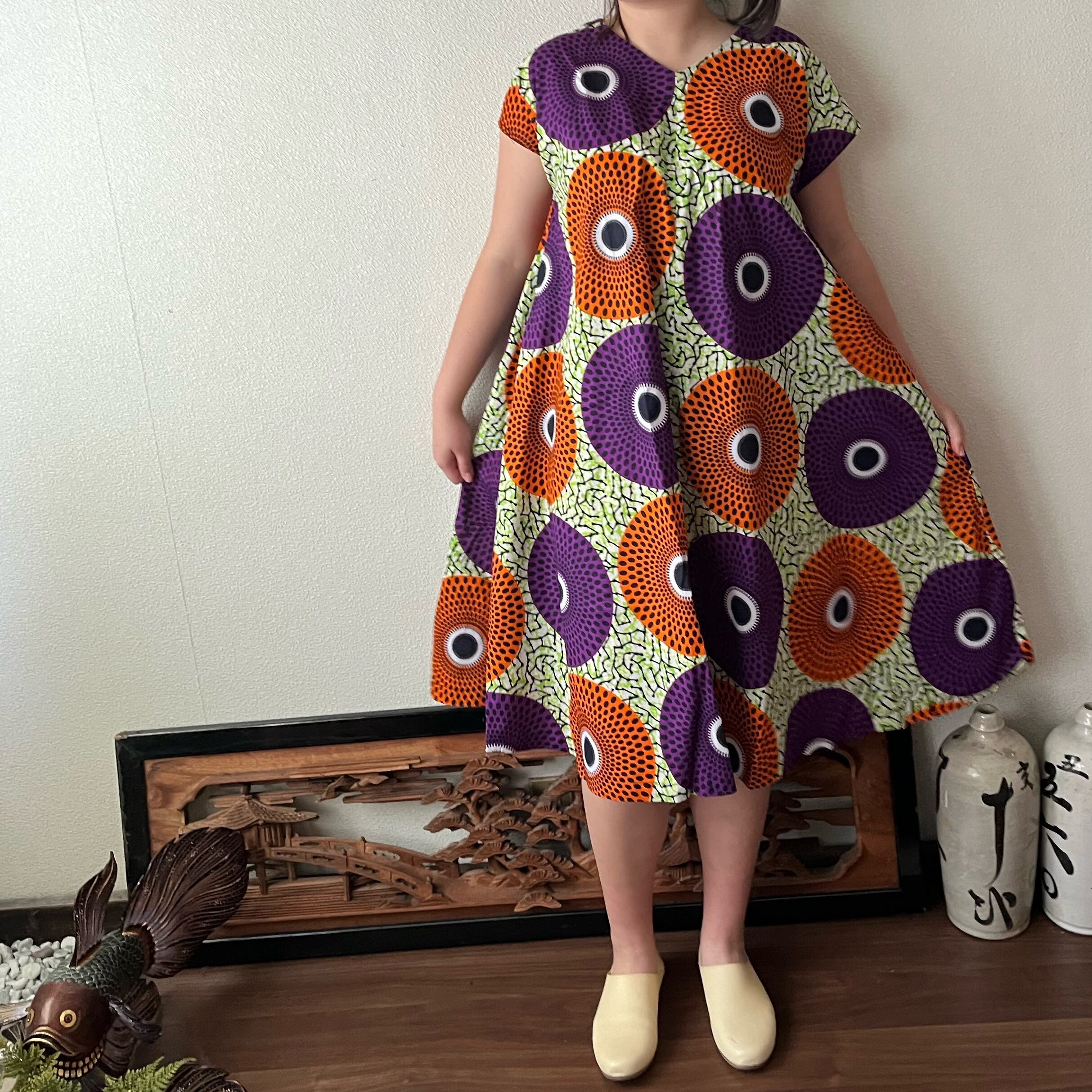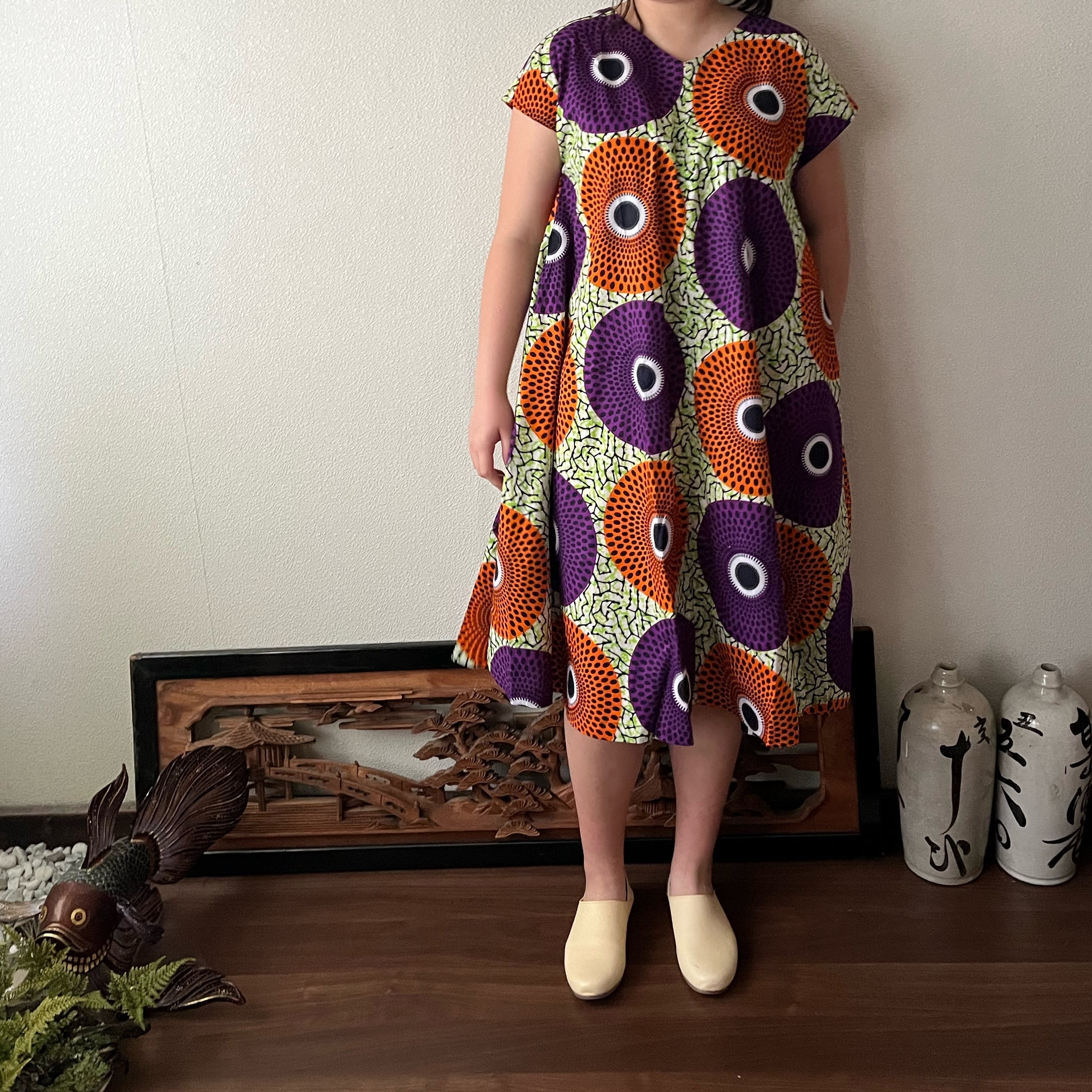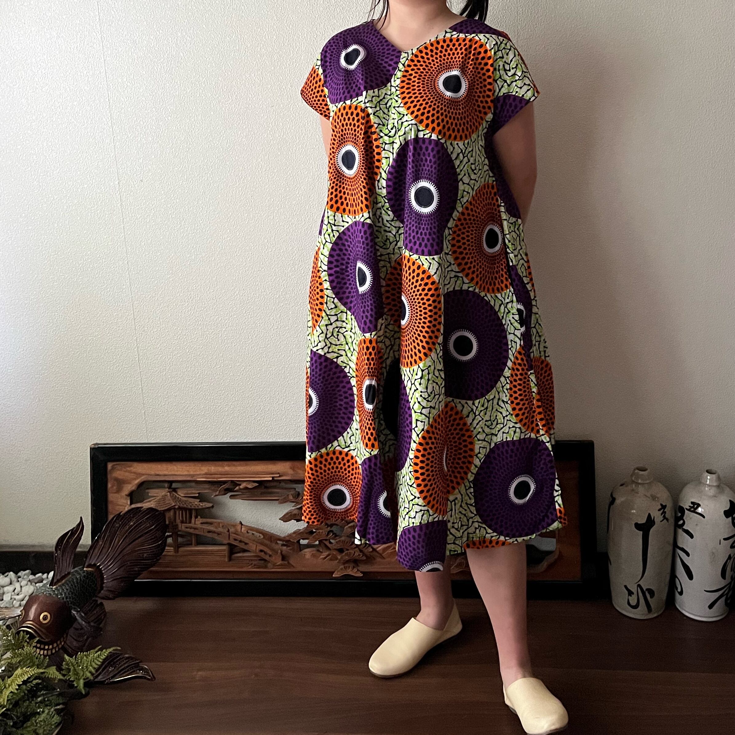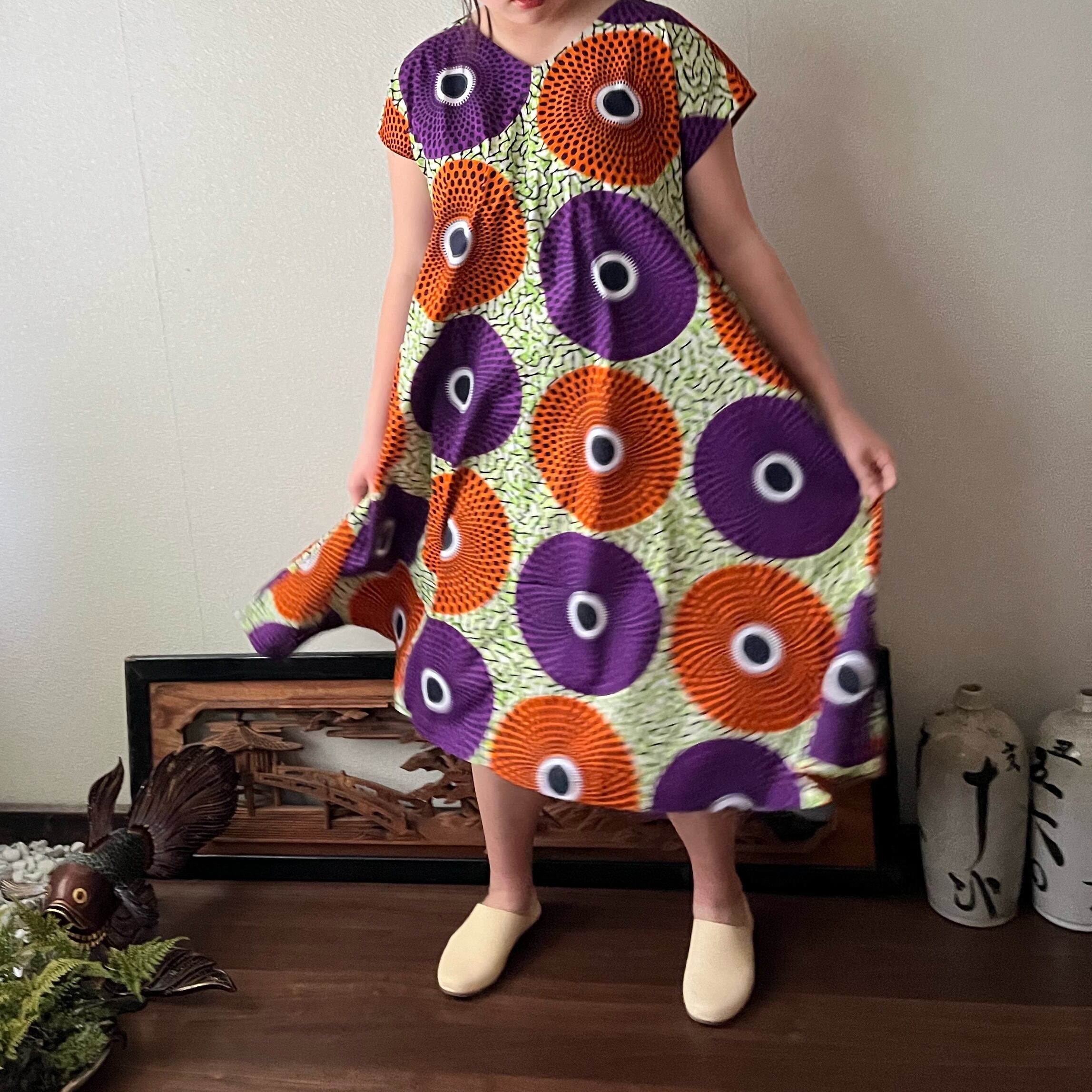 アフリカンバティック柄VネックのAラインワンピース シンプルな形で柄を楽しむ 波紋柄紫オレンジ