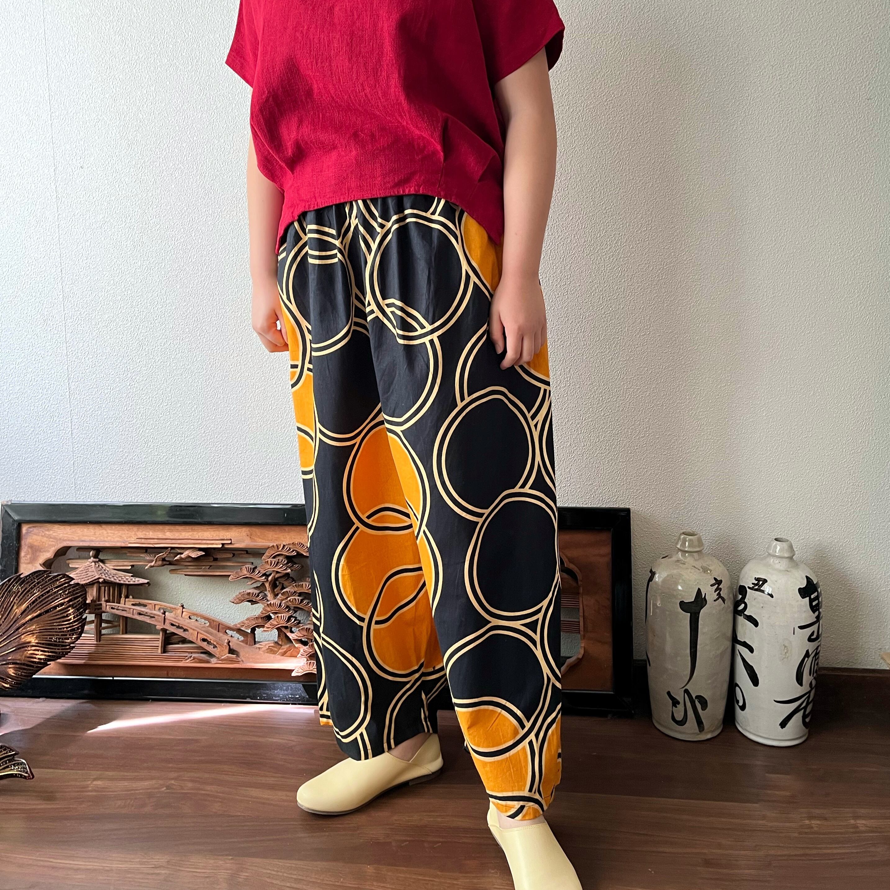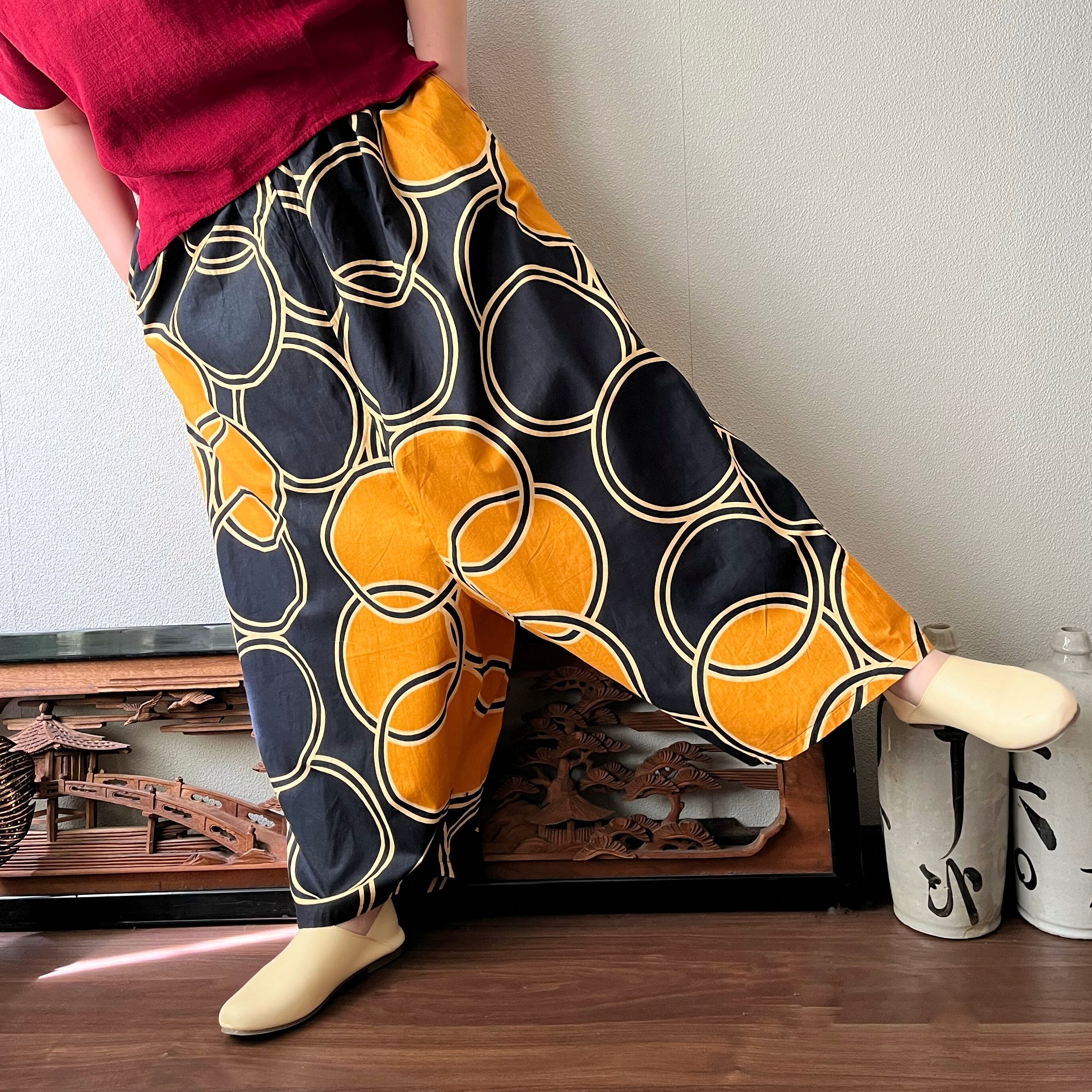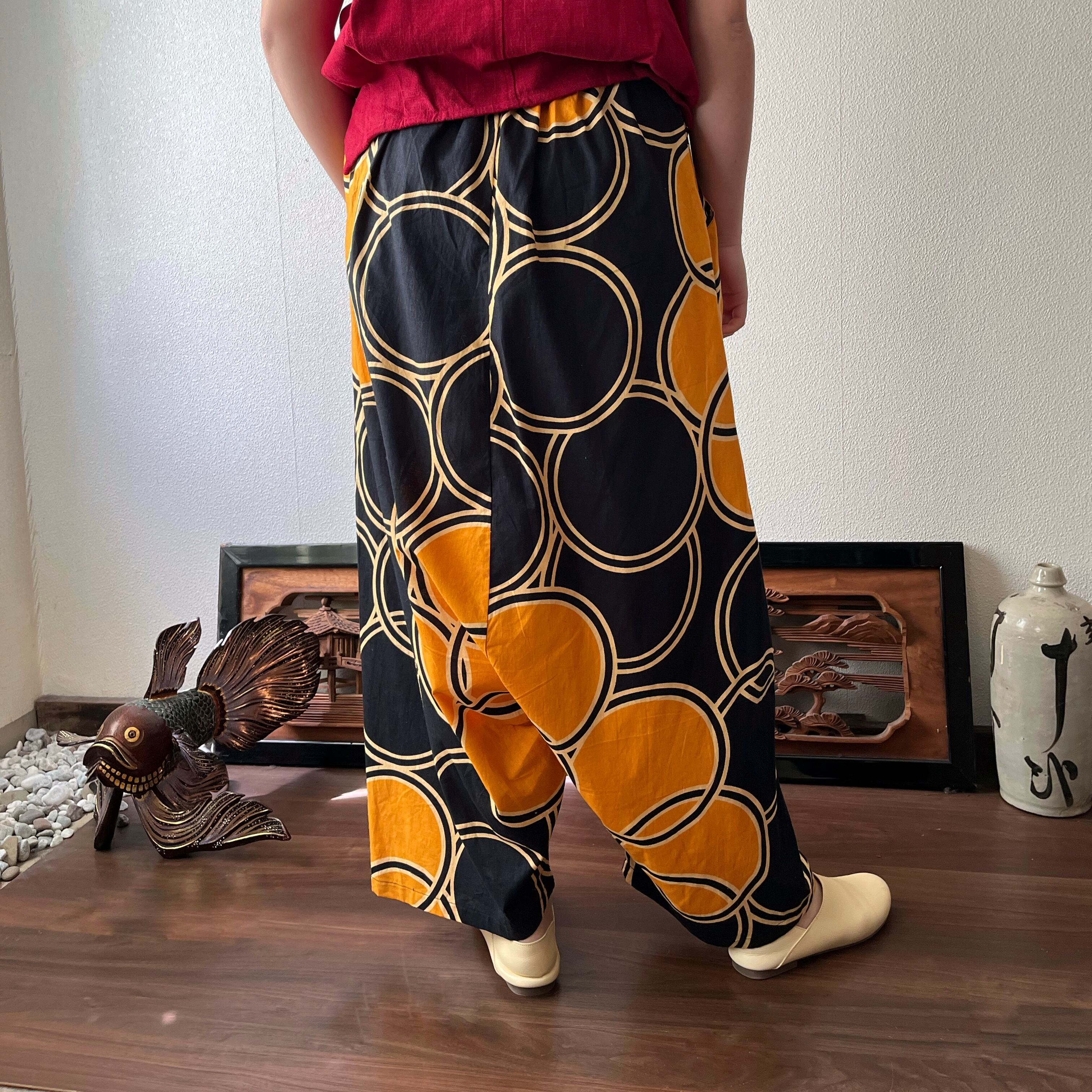 あくびちゃん?アラジン?アフリカンバティックパンツ 動きがよく出る素材だからシルエットが楽しい ドット柄黄色黒