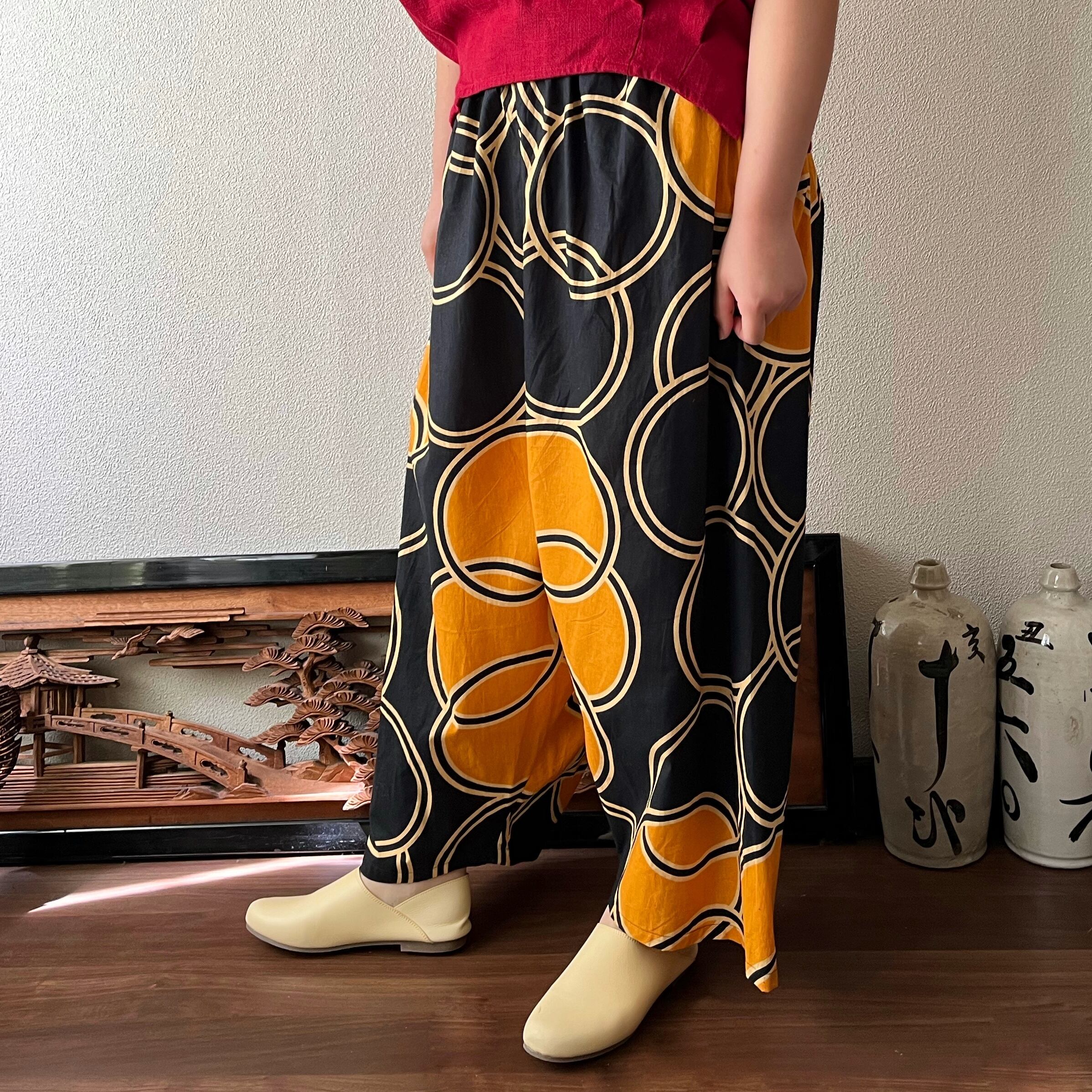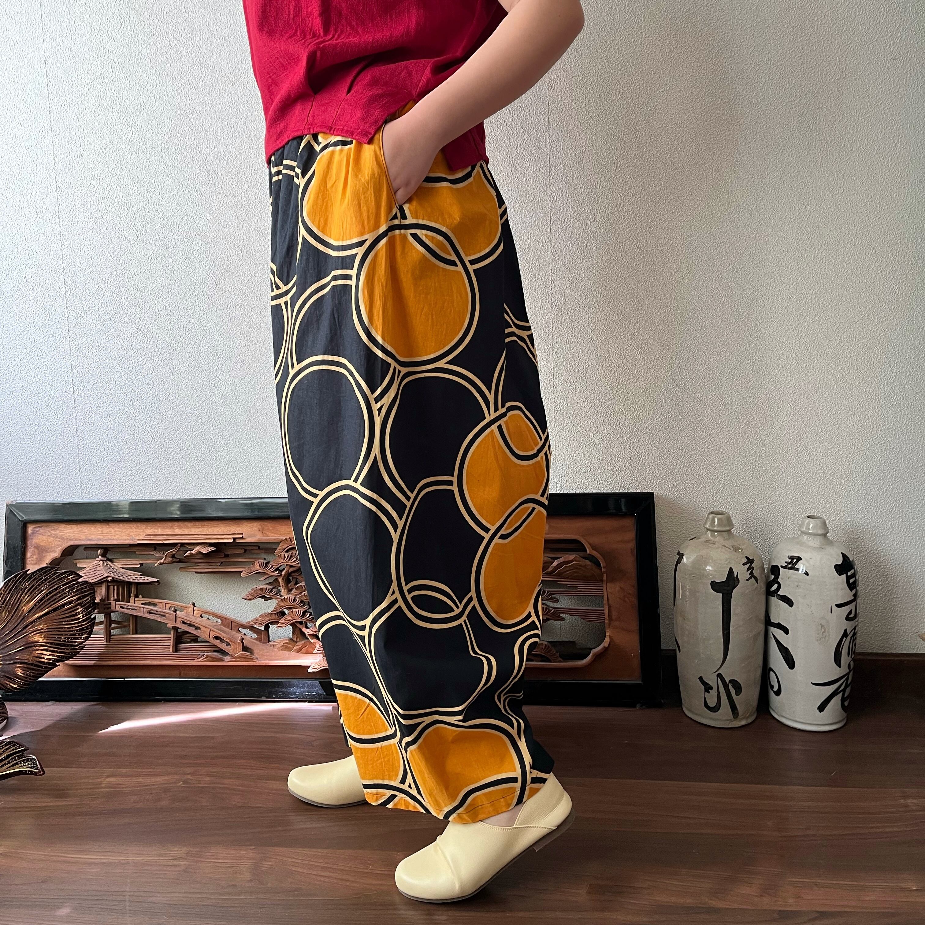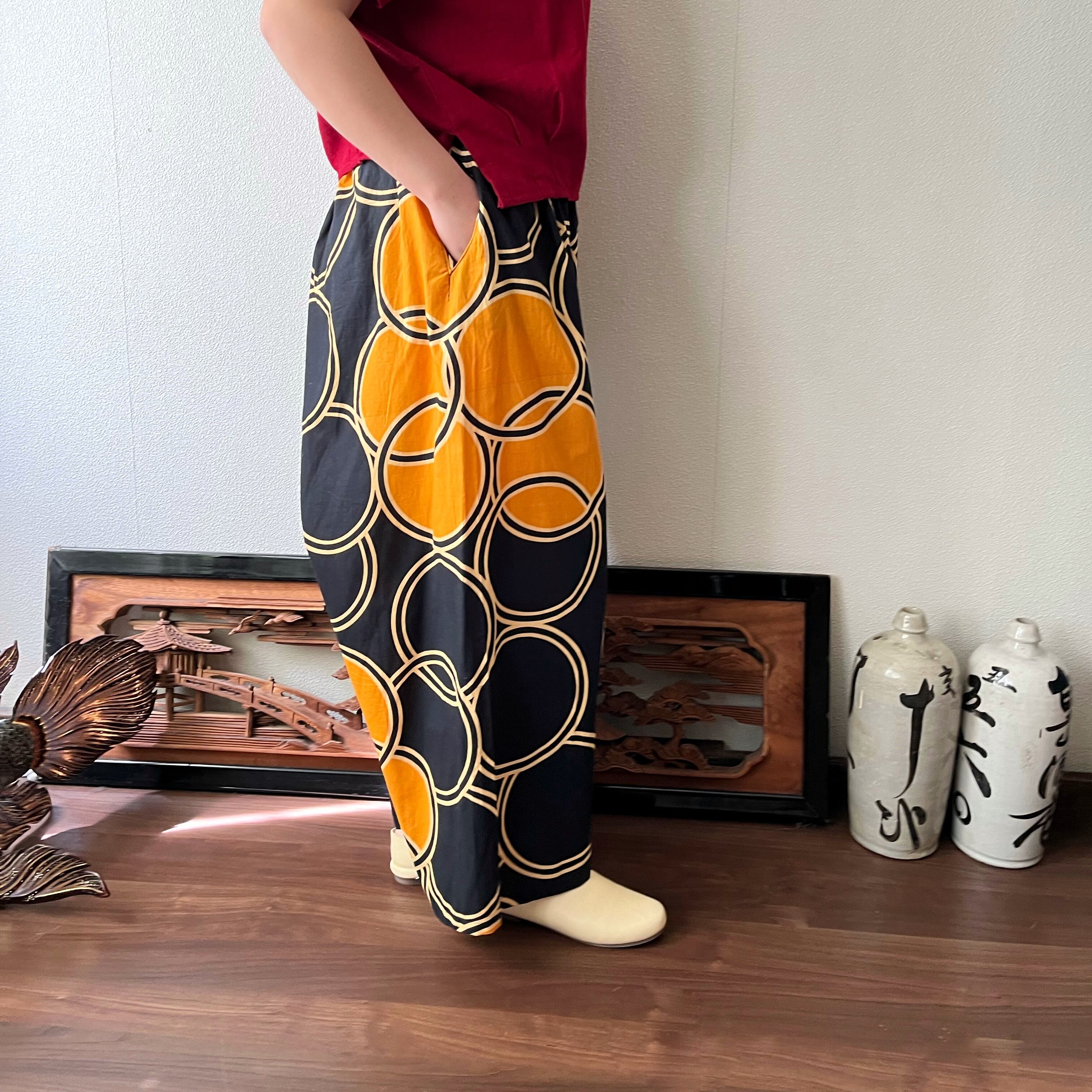 あくびちゃん?アラジン?アフリカンバティックパンツ 動きがよく出る素材だからシルエットが楽しい ドット柄黄色黒