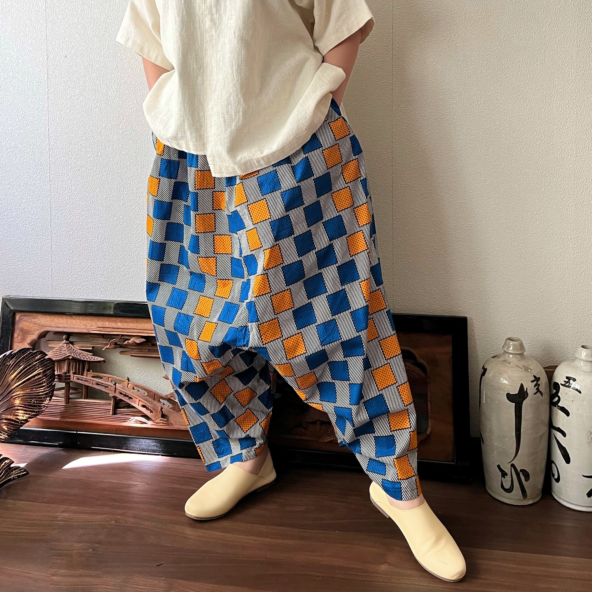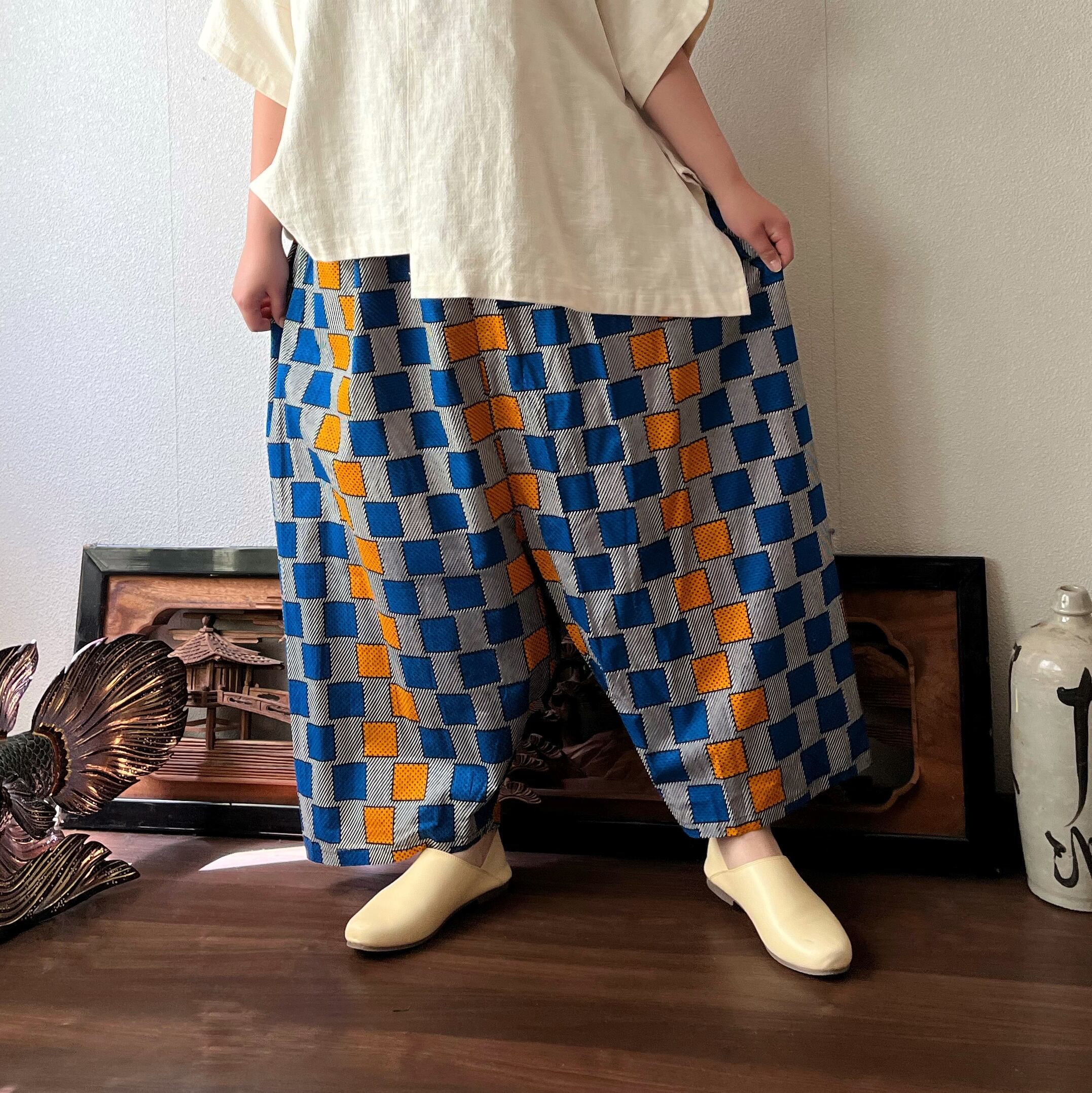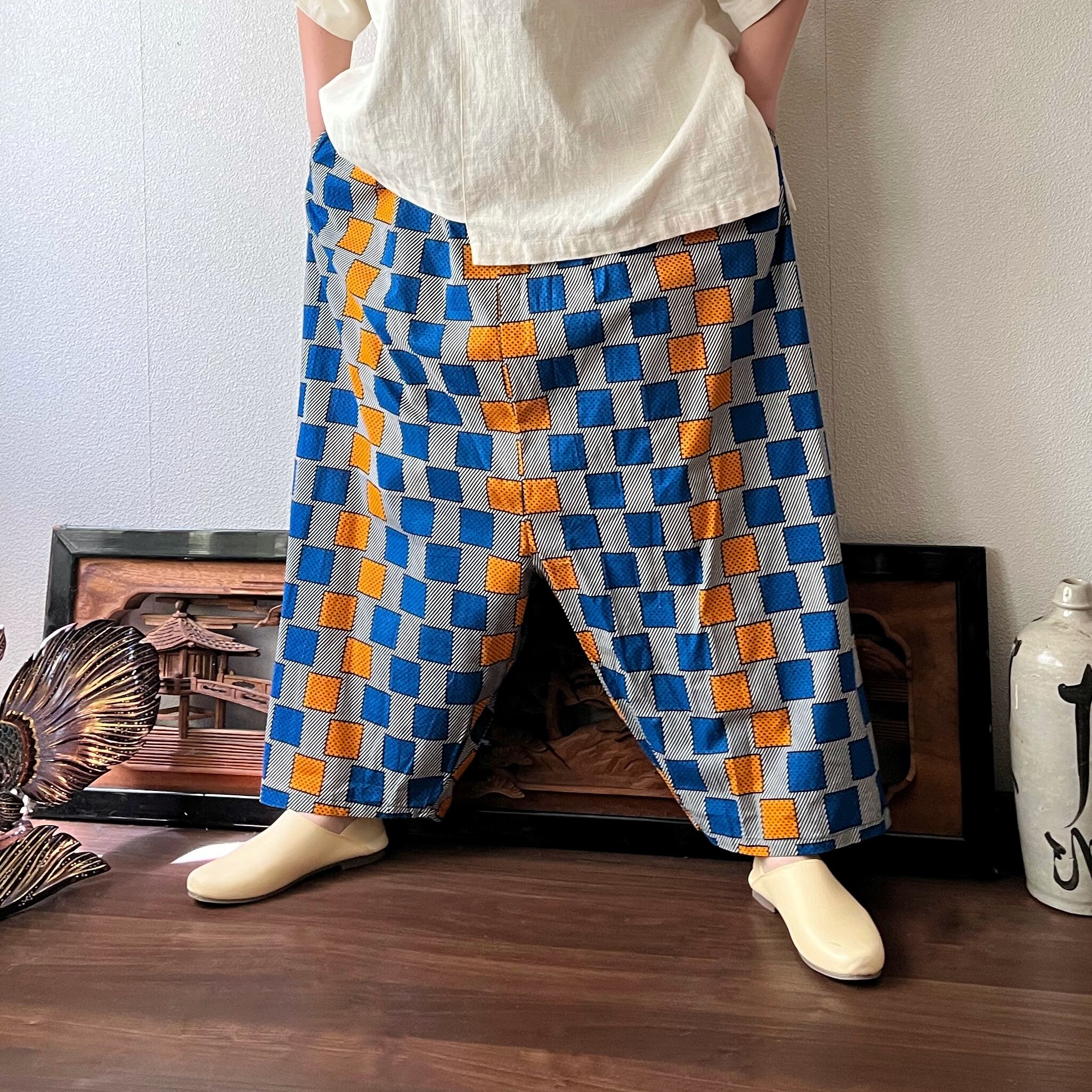 あくびちゃん?アラジン?アフリカンバティックパンツ 動きがよく出る素材だからシルエットが楽しい 格子柄青オレンジ