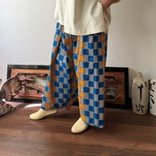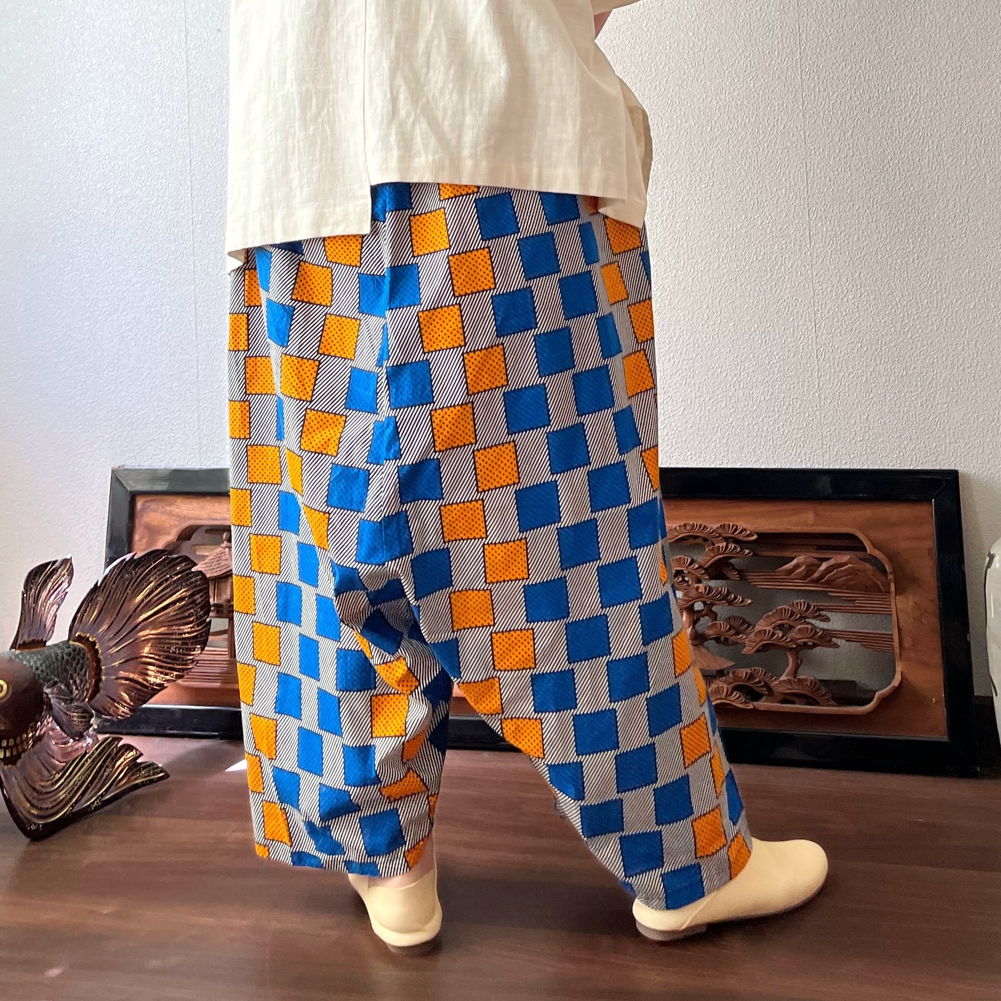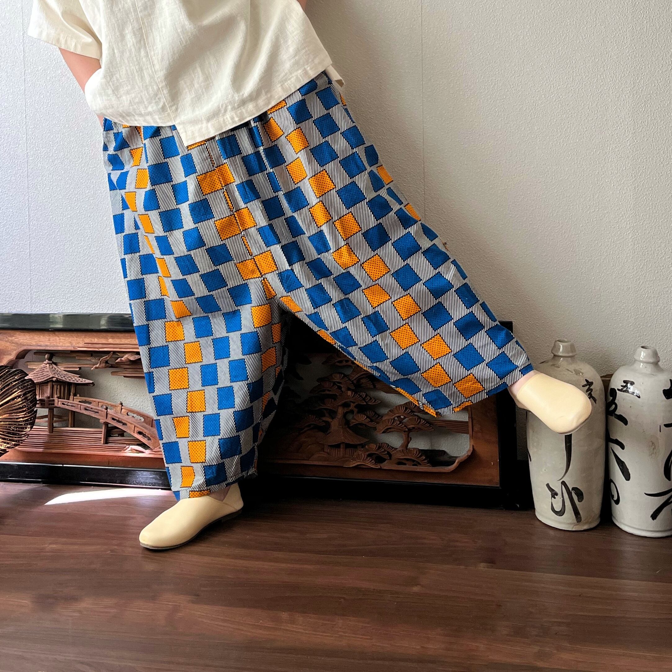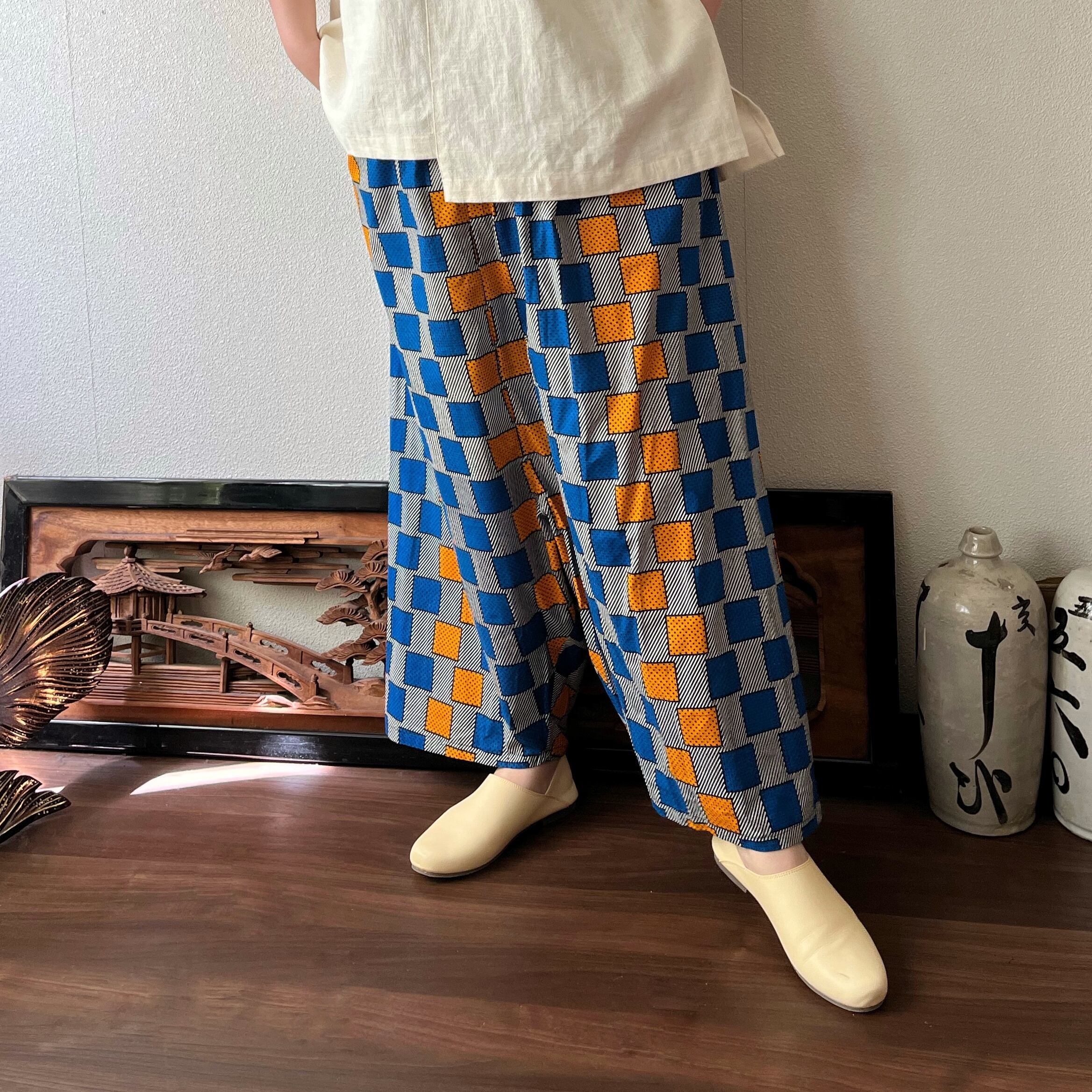 あくびちゃん?アラジン?アフリカンバティックパンツ 動きがよく出る素材だからシルエットが楽しい 格子柄青オレンジ