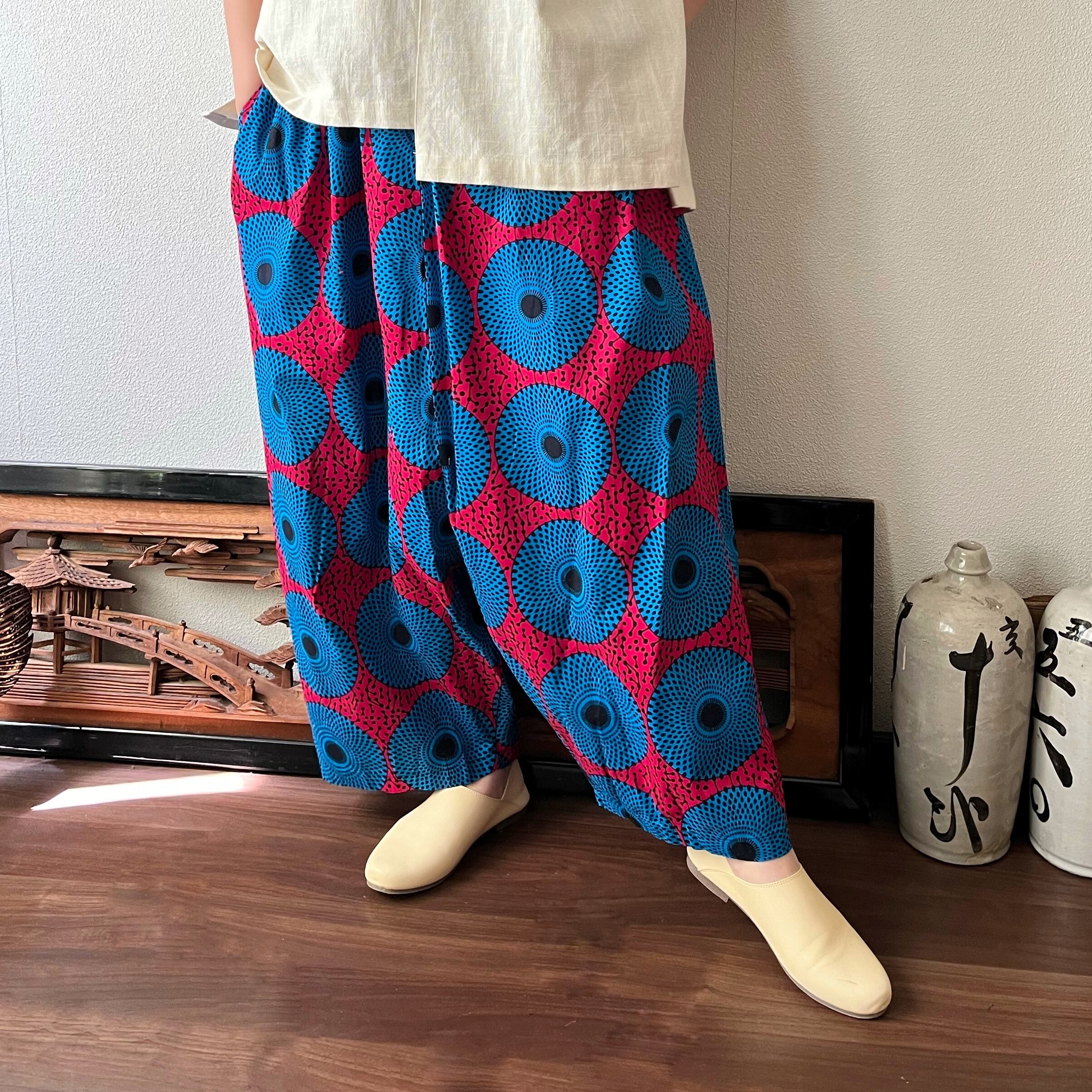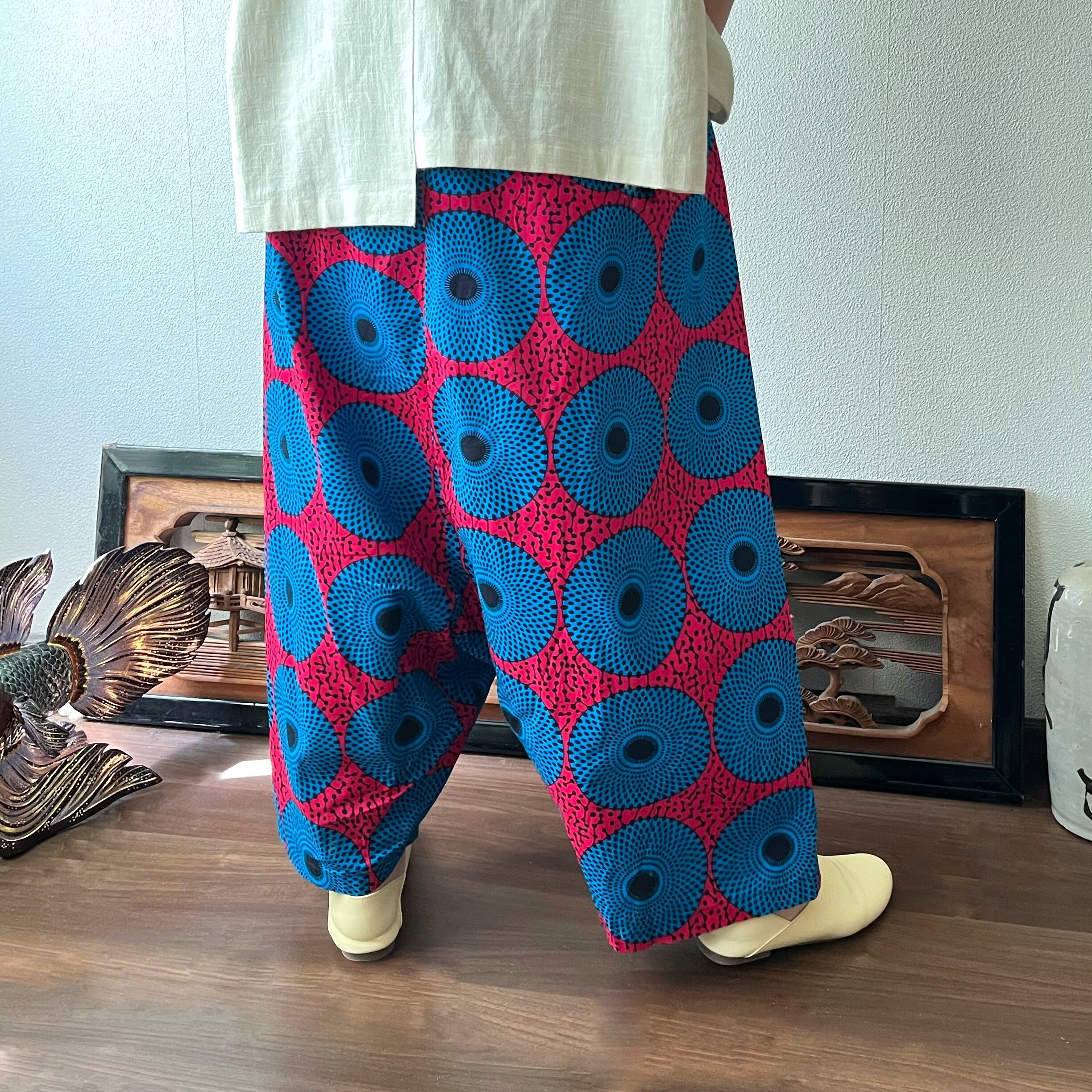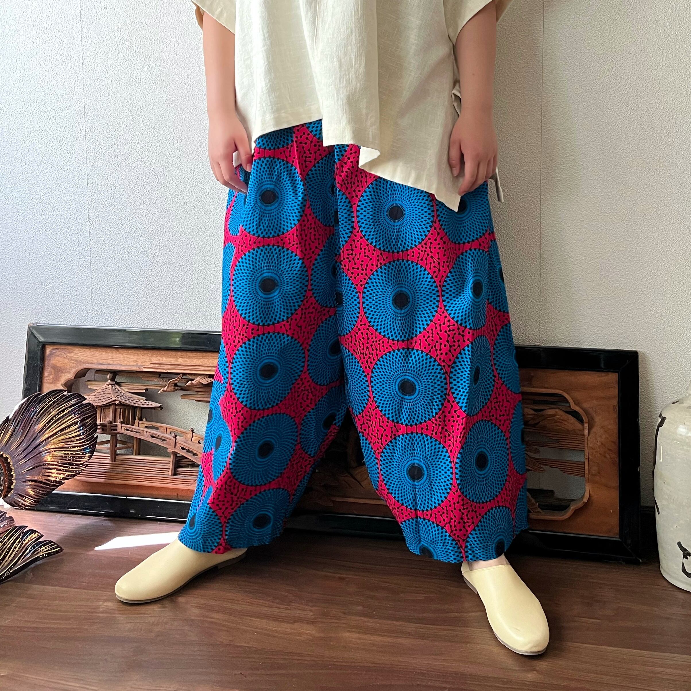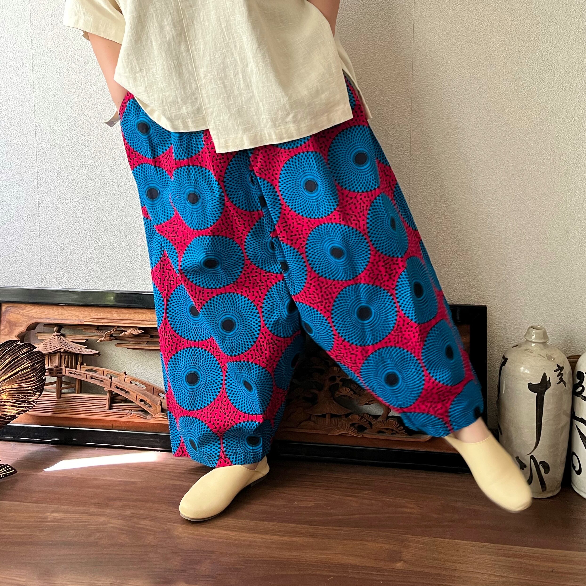 あくびちゃん?アラジン?アフリカンバティックパンツ 動きがよく出る素材だからシルエットが楽しい ドット柄ミックス 波紋柄青赤