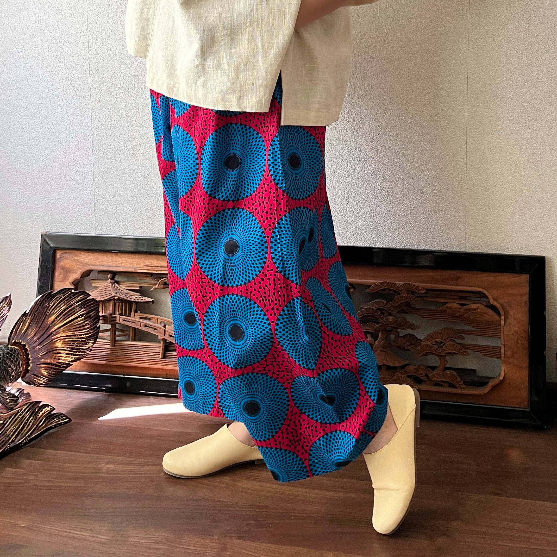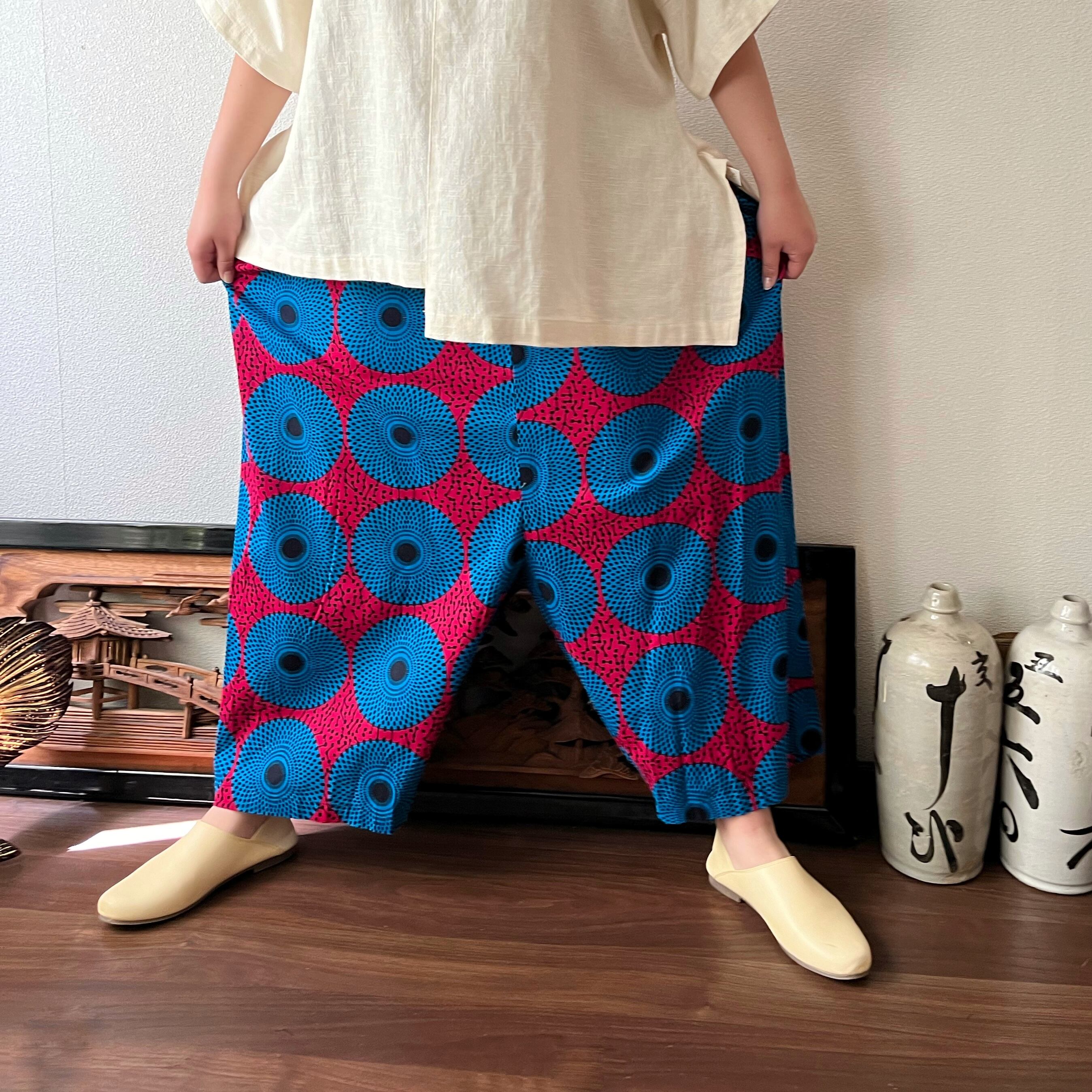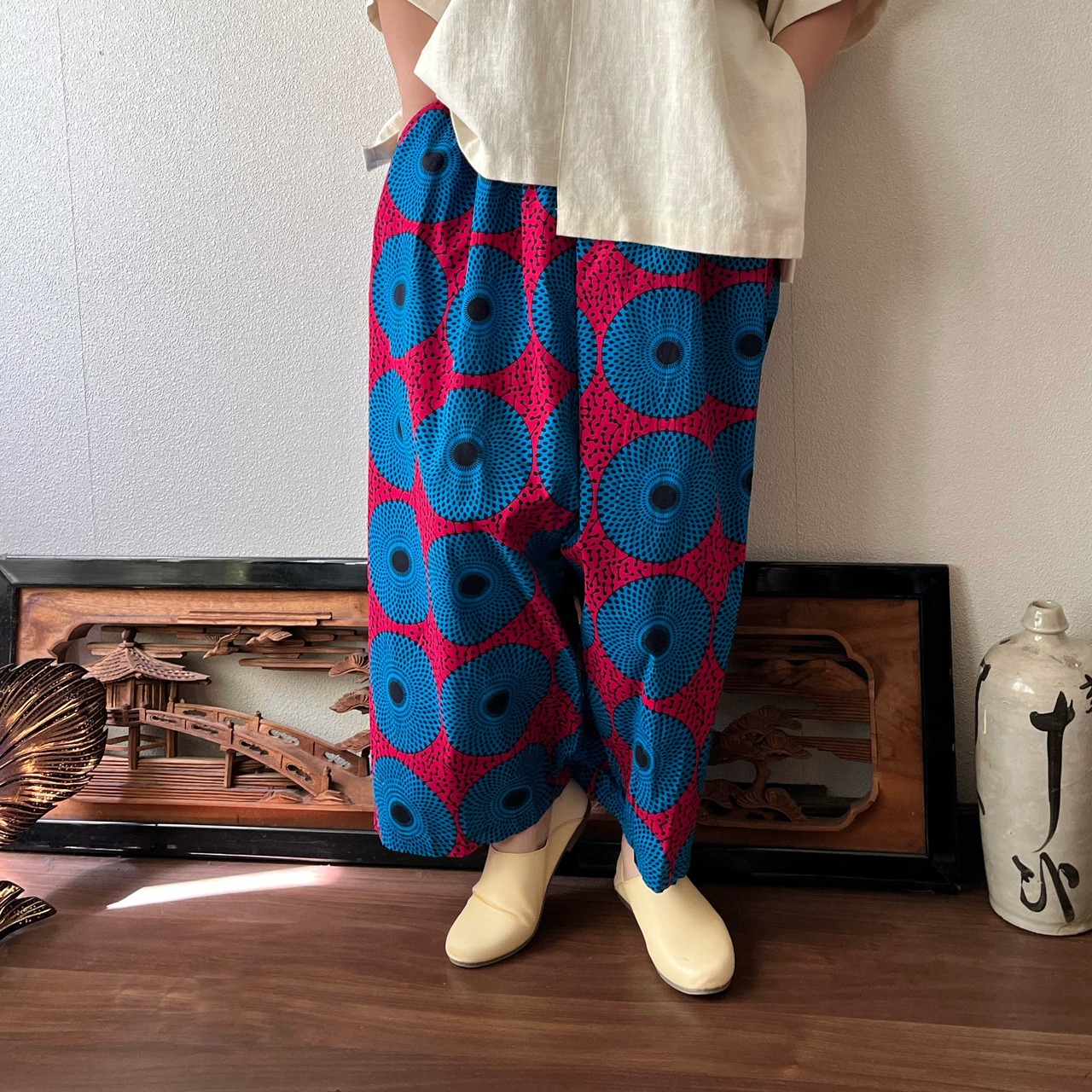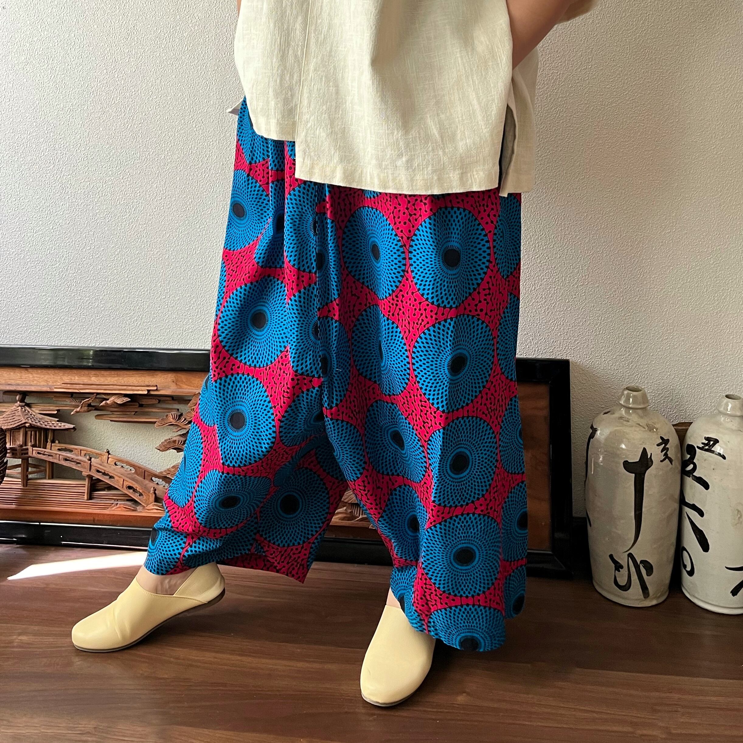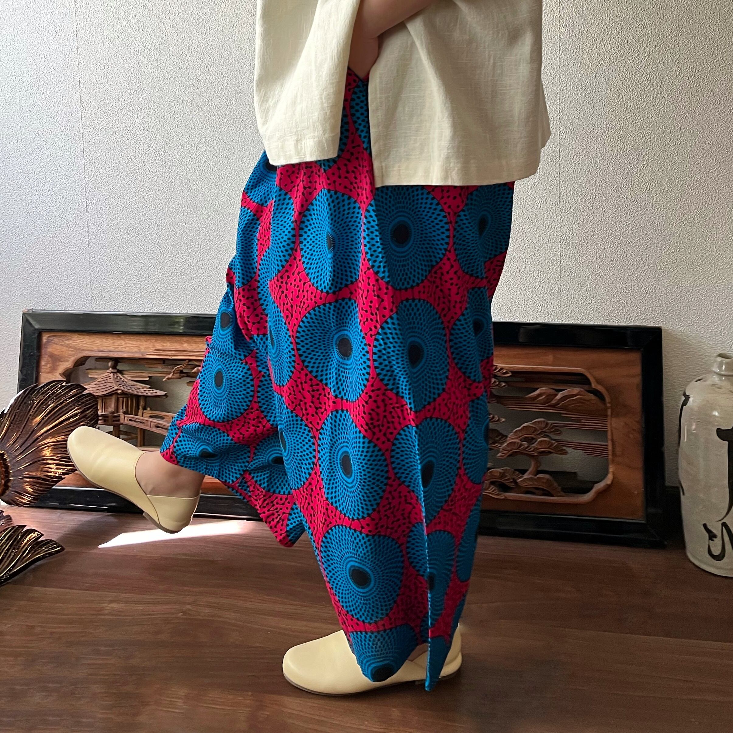 あくびちゃん?アラジン?アフリカンバティックパンツ 動きがよく出る素材だからシルエットが楽しい ドット柄ミックス 波紋柄青赤