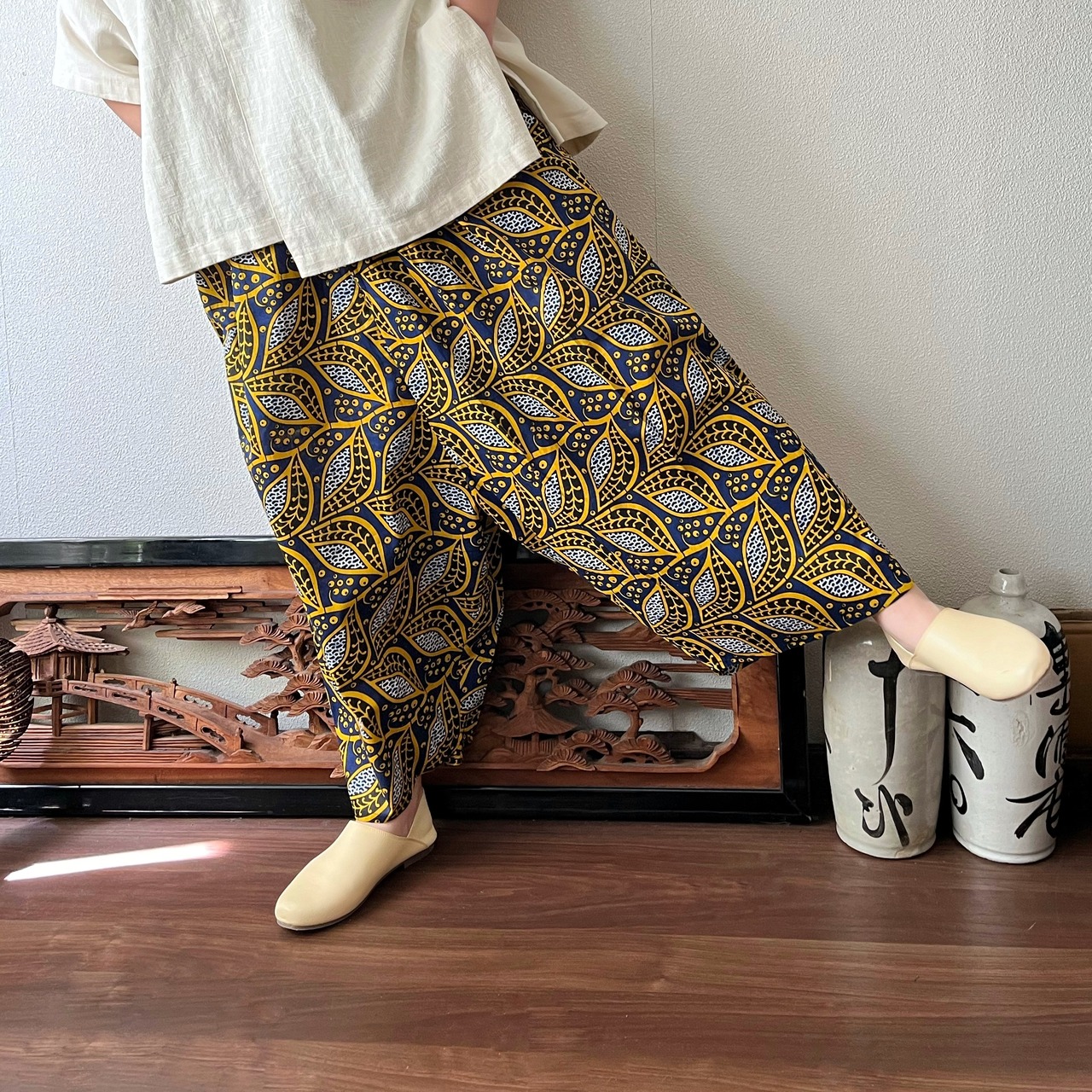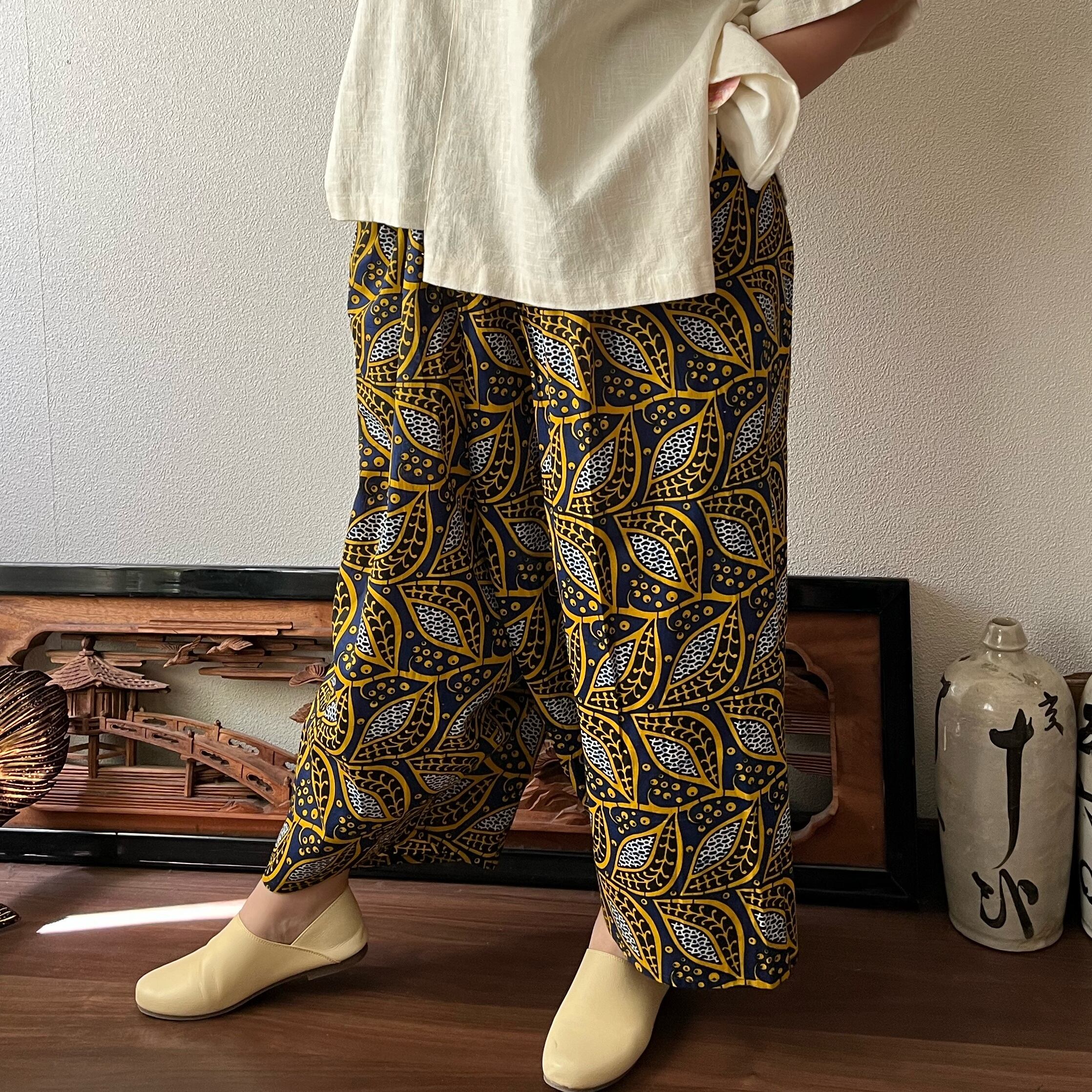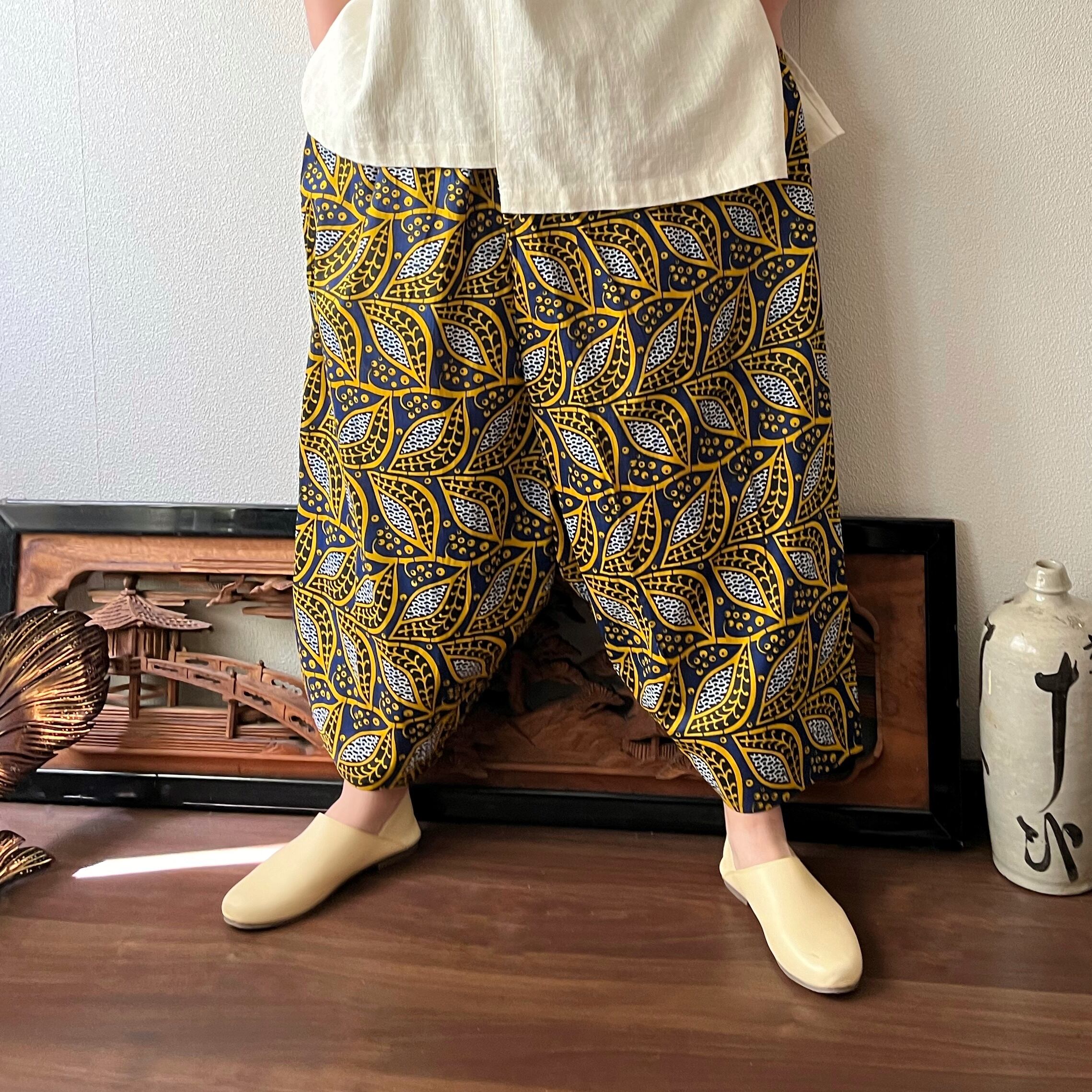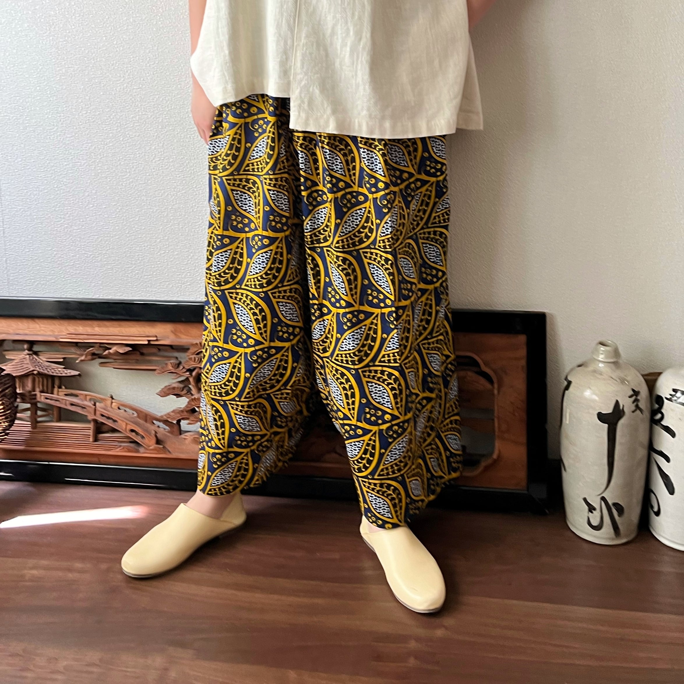 あくびちゃん?アラジン?アフリカンバティックパンツ 動きがよく出る素材だからシルエットが楽しい 植物柄ブルーイエロー