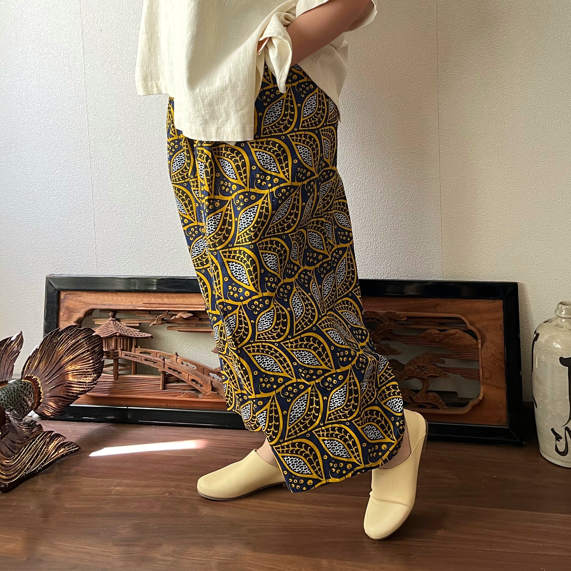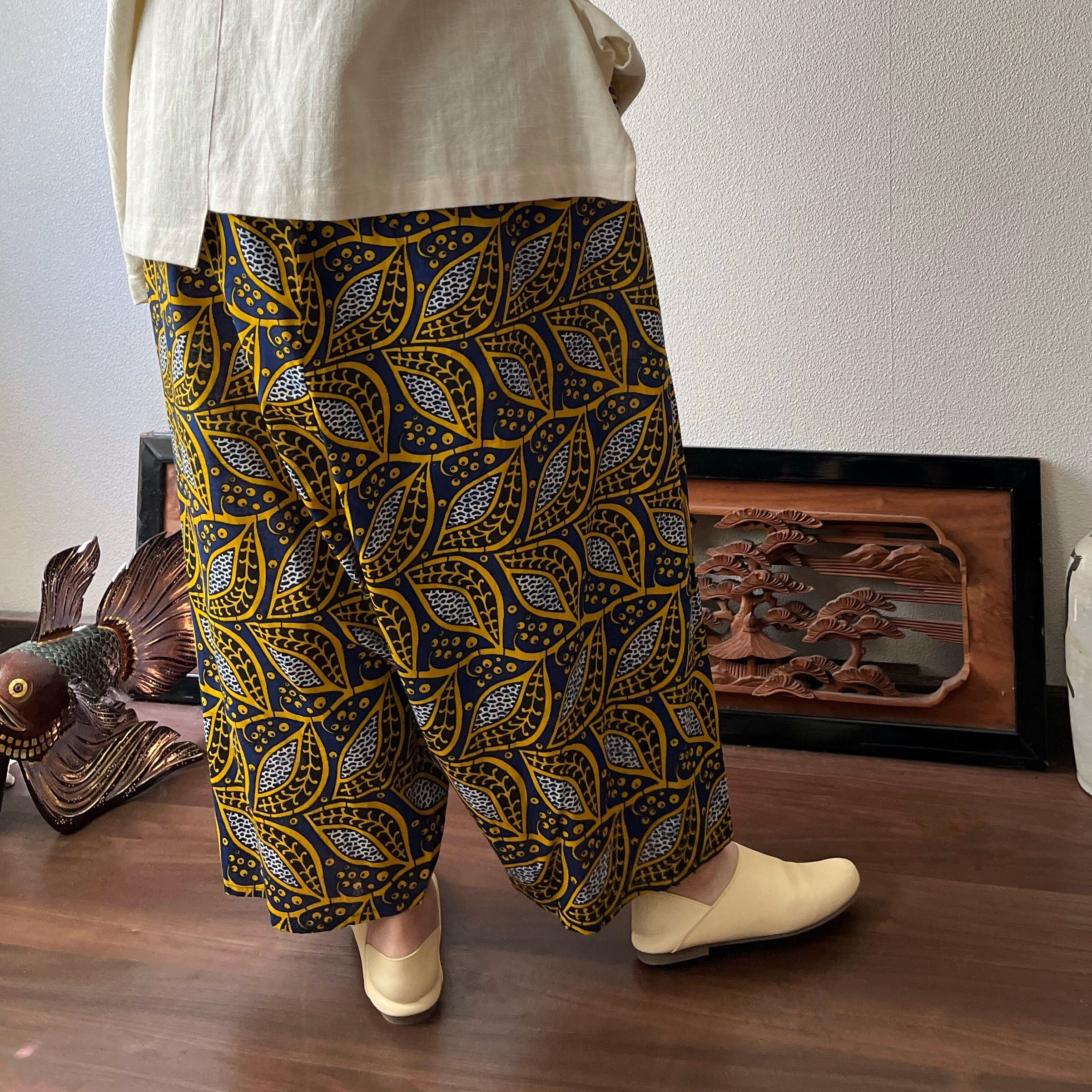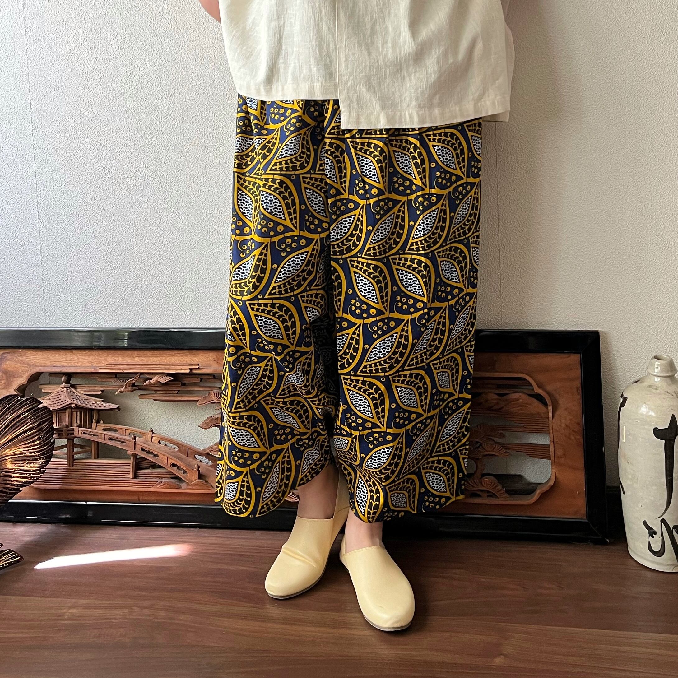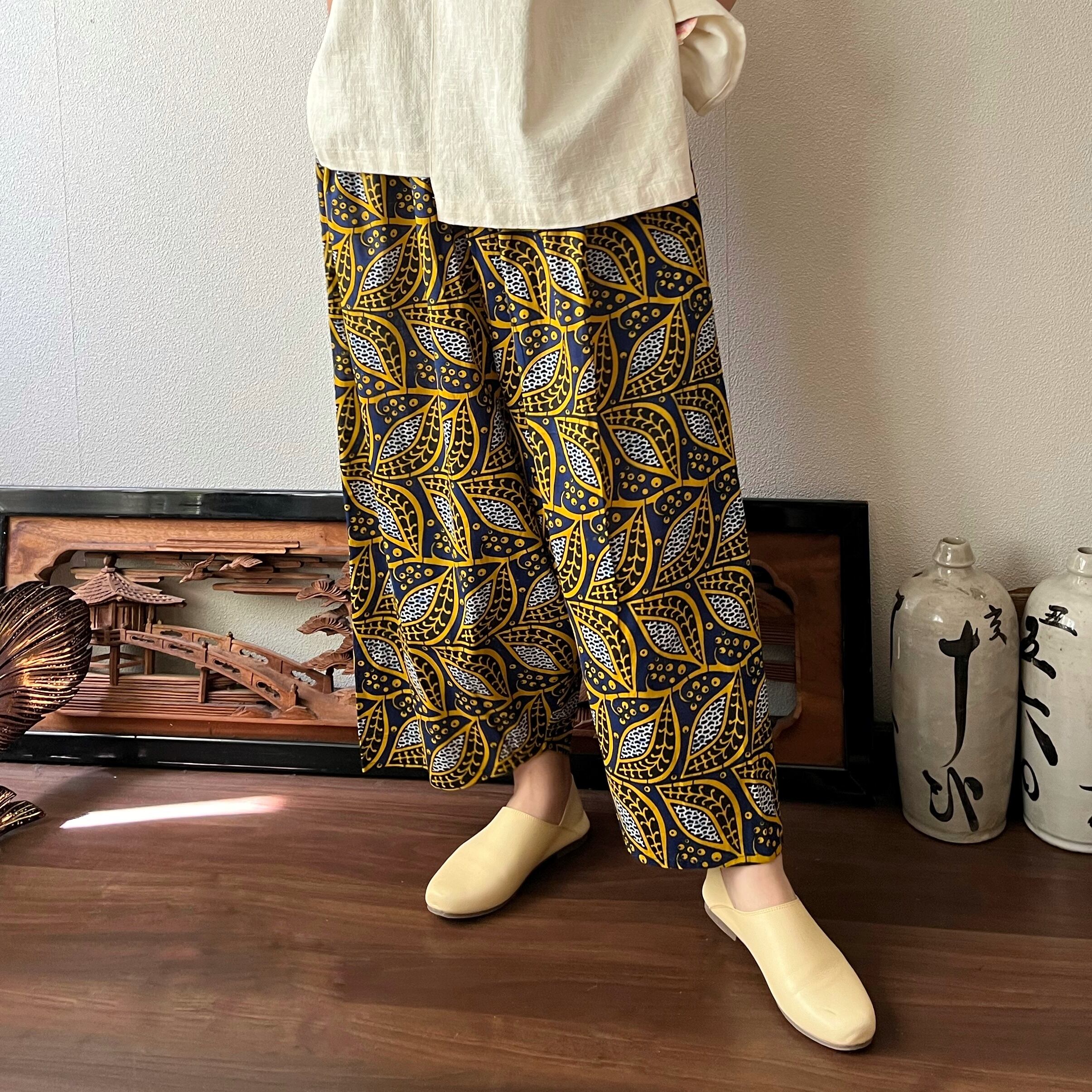 あくびちゃん?アラジン?アフリカンバティックパンツ 動きがよく出る素材だからシルエットが楽しい 植物柄ブルーイエロー