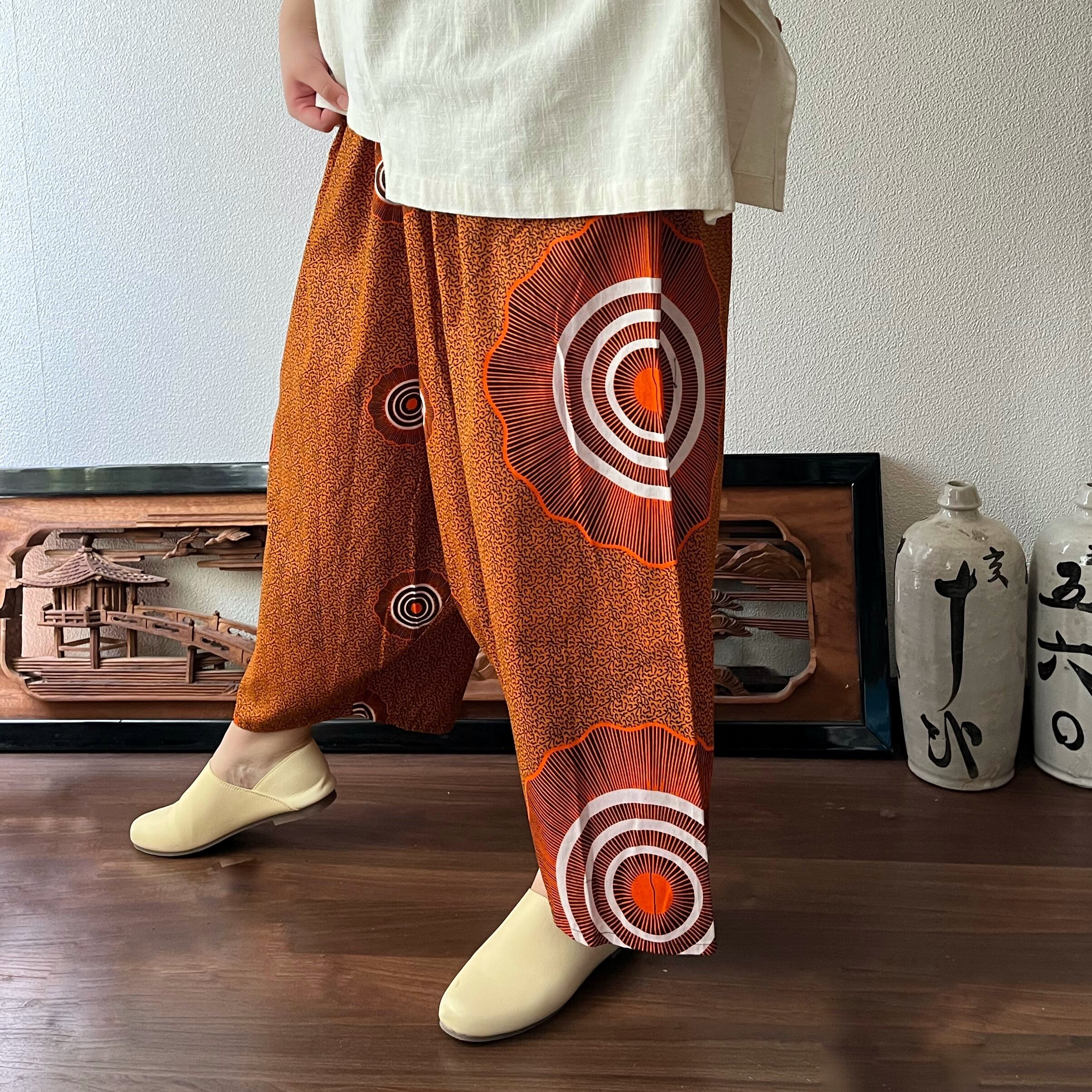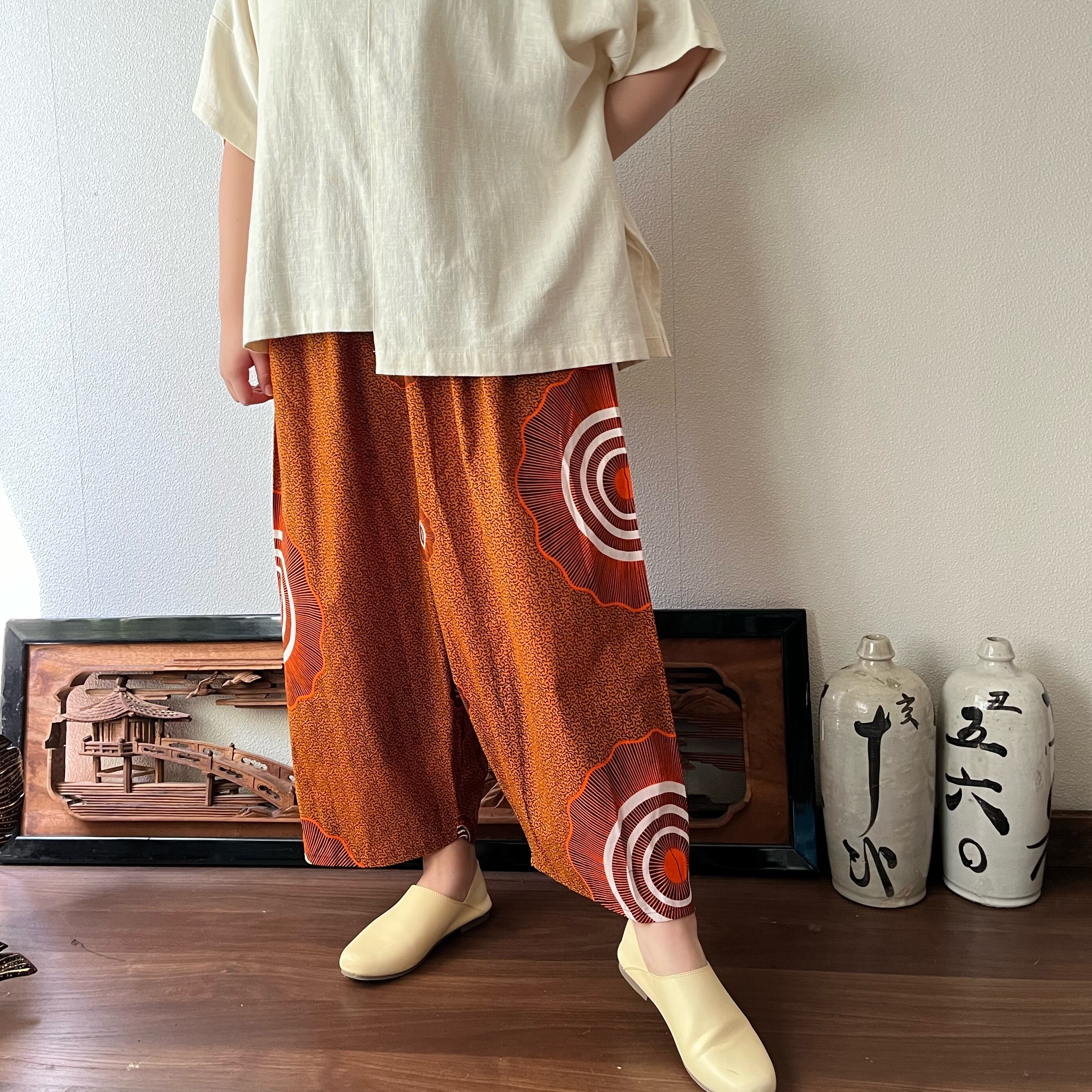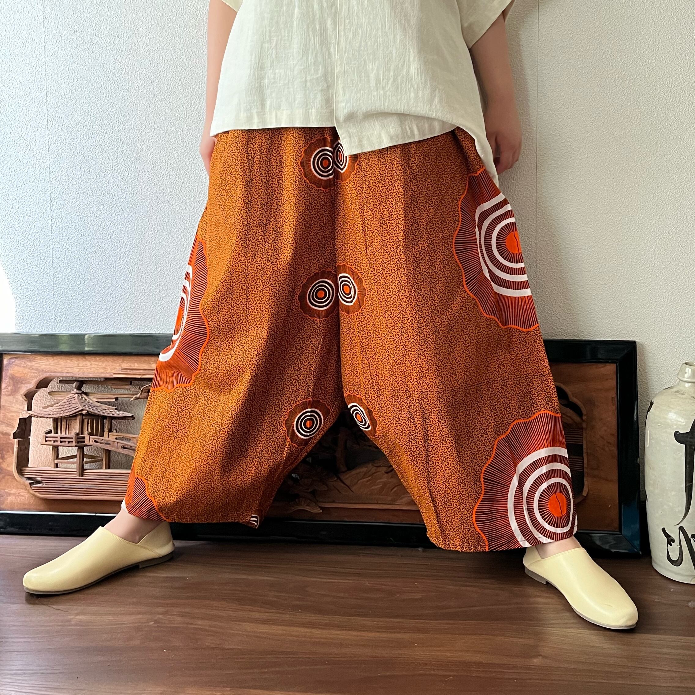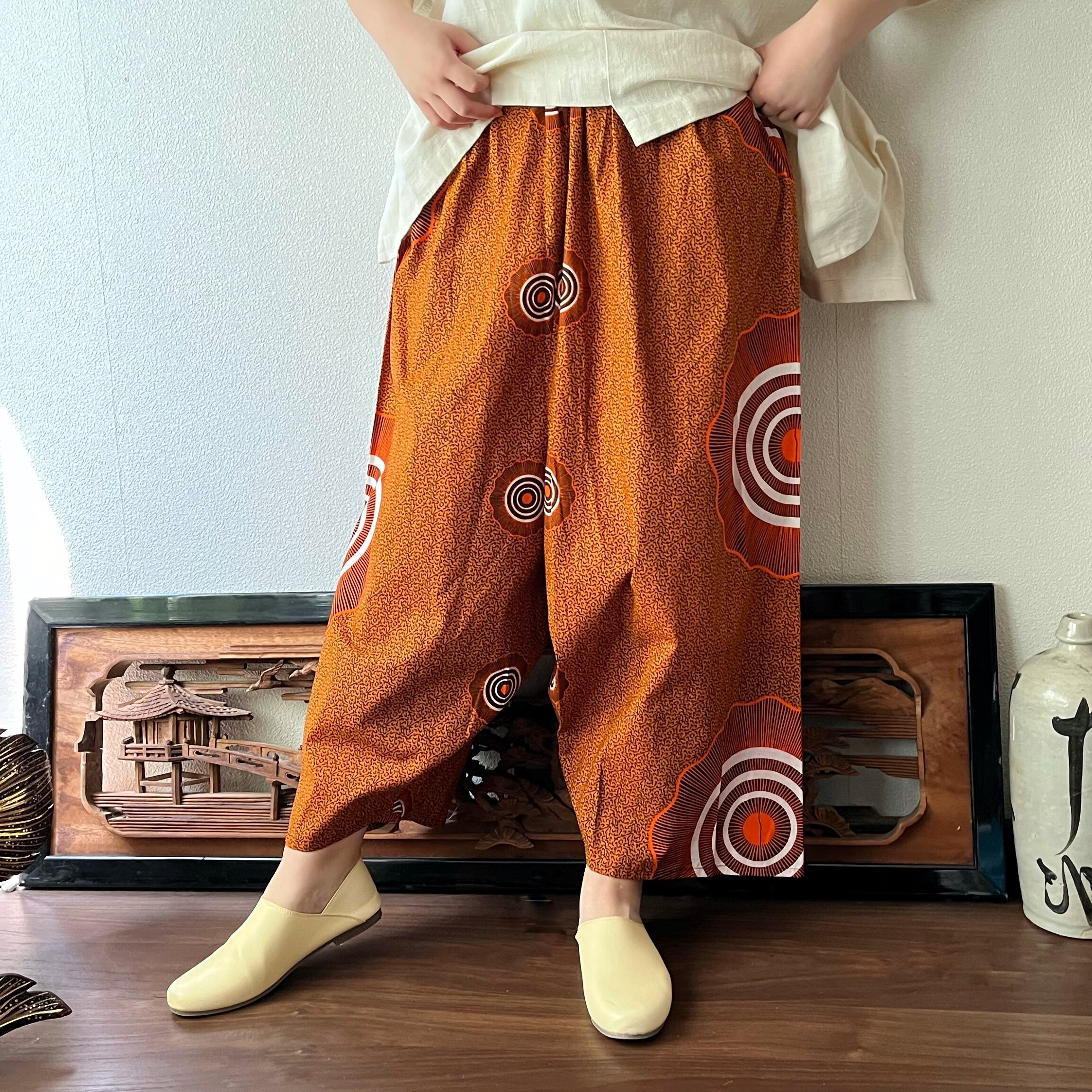 あくびちゃん?アラジン?アフリカンバティックパンツ 動きがよく出る素材だからシルエットが楽しい 波紋柄茶
