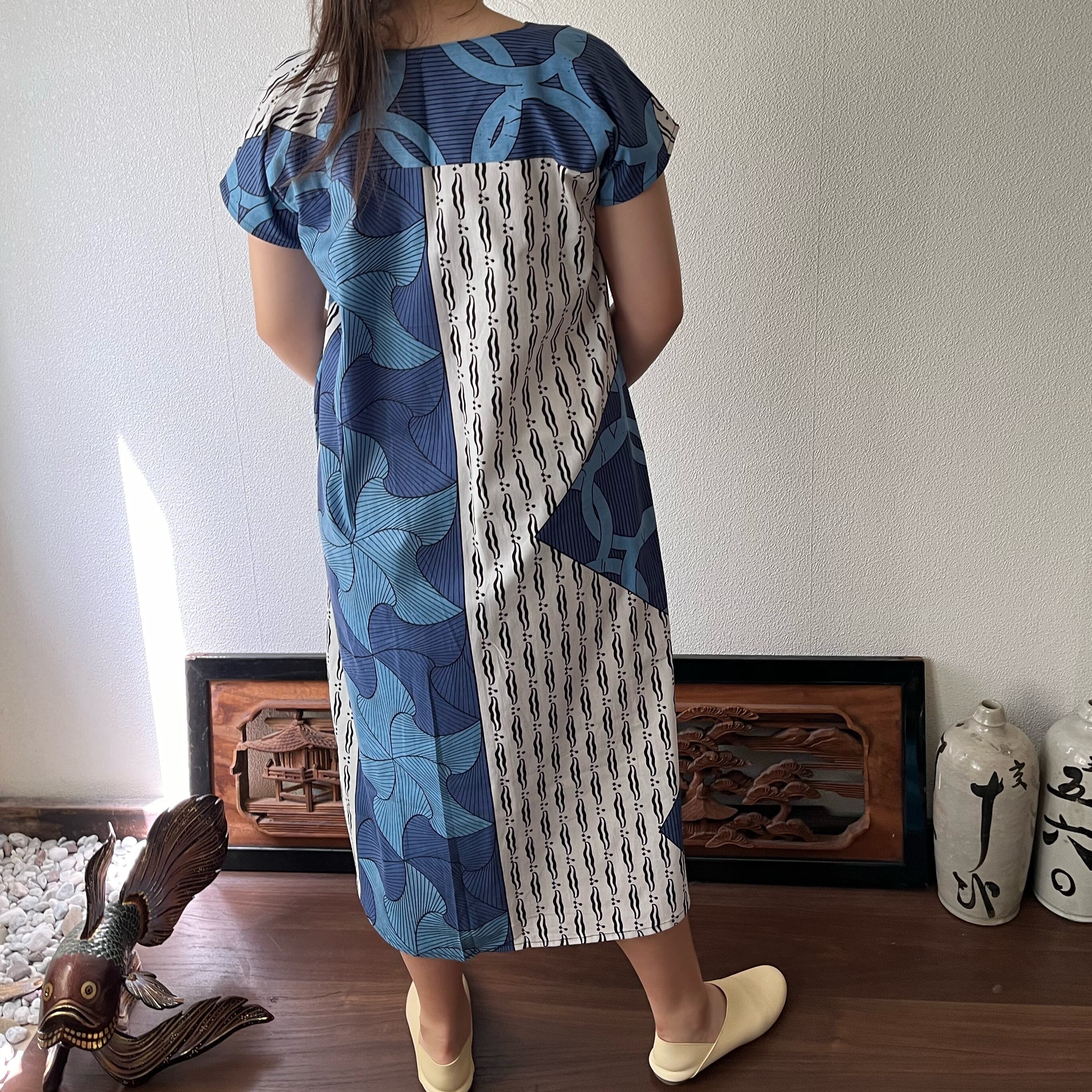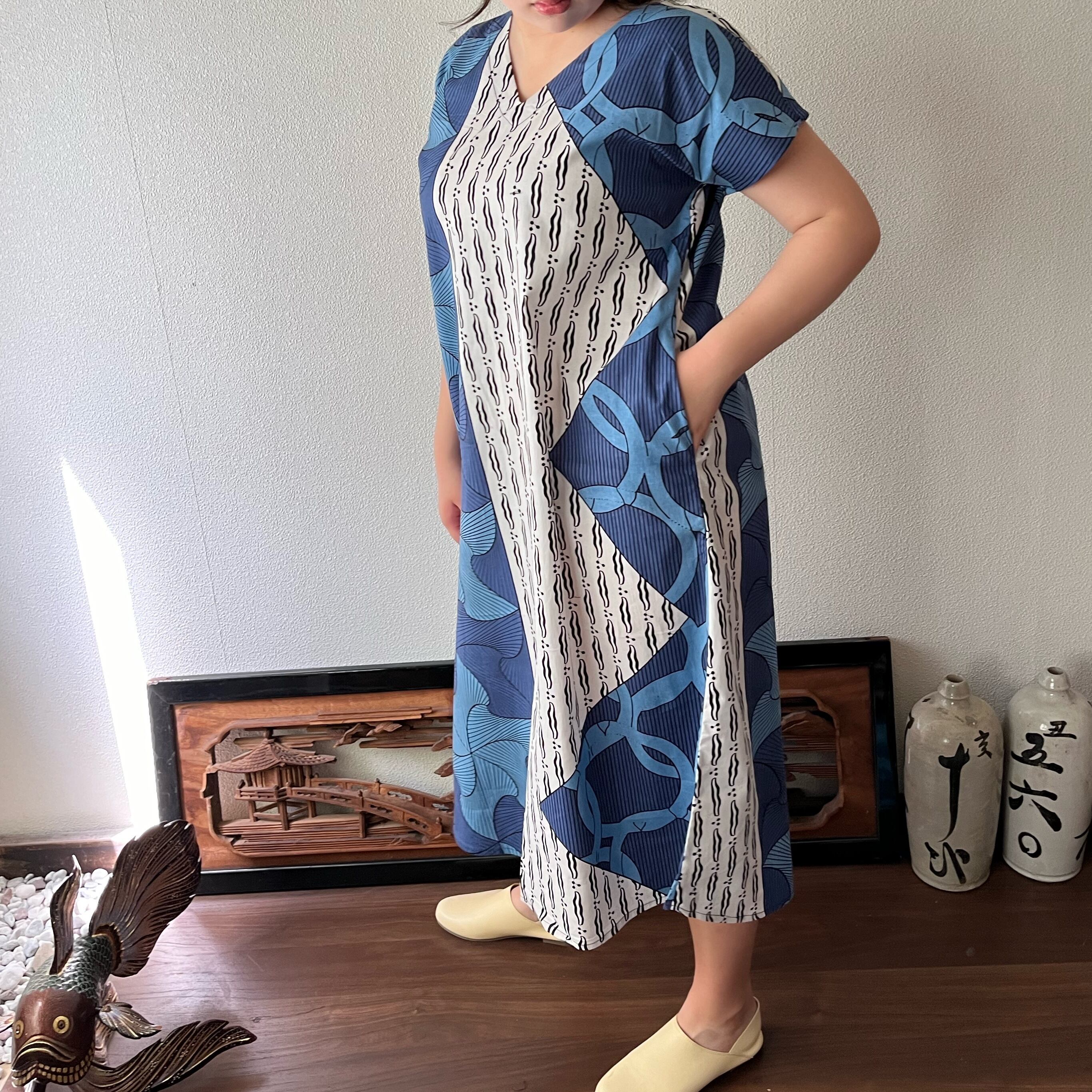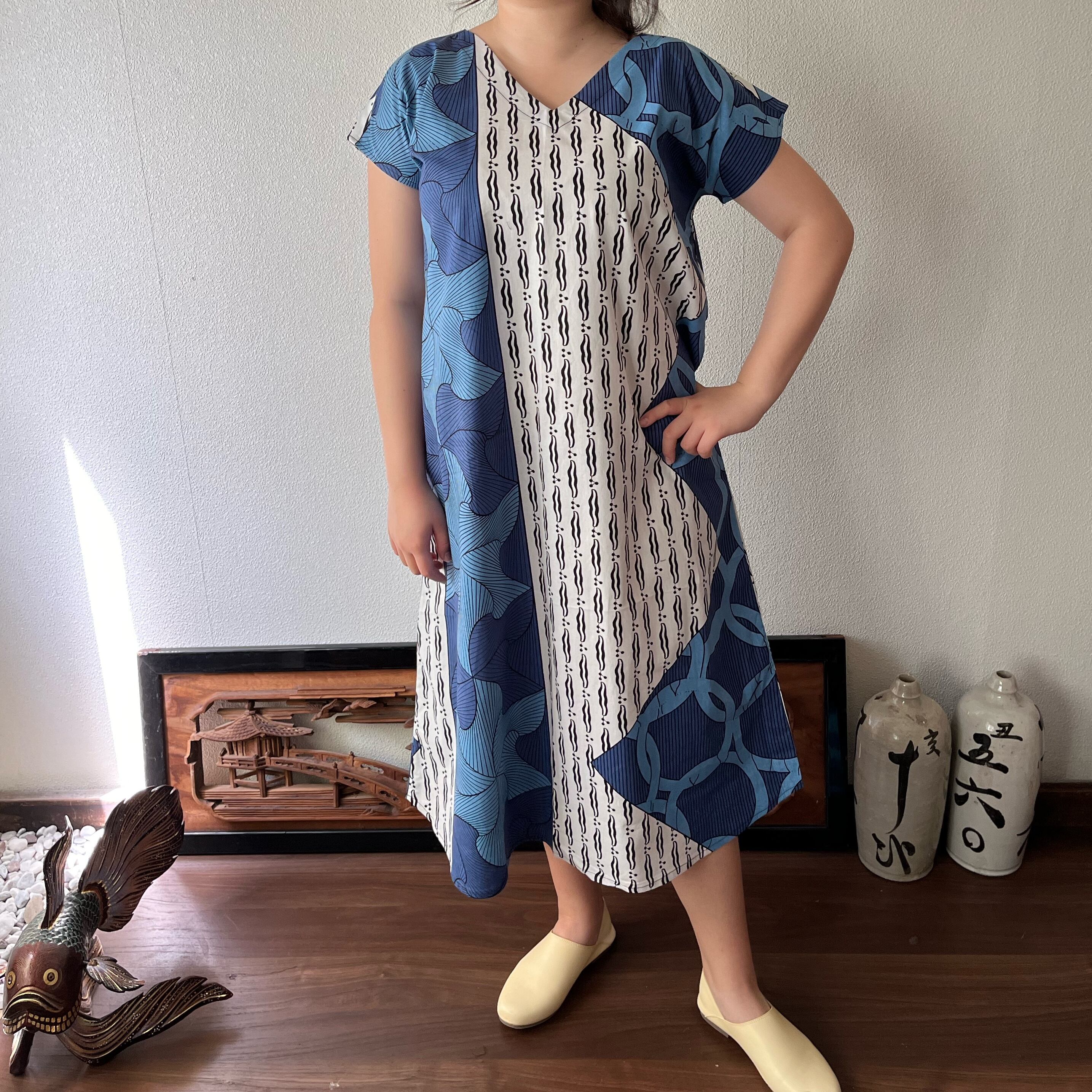 『アフリカンバティック柄Vネックのシンプルワンピース シンプルな形で柄を楽しむ』